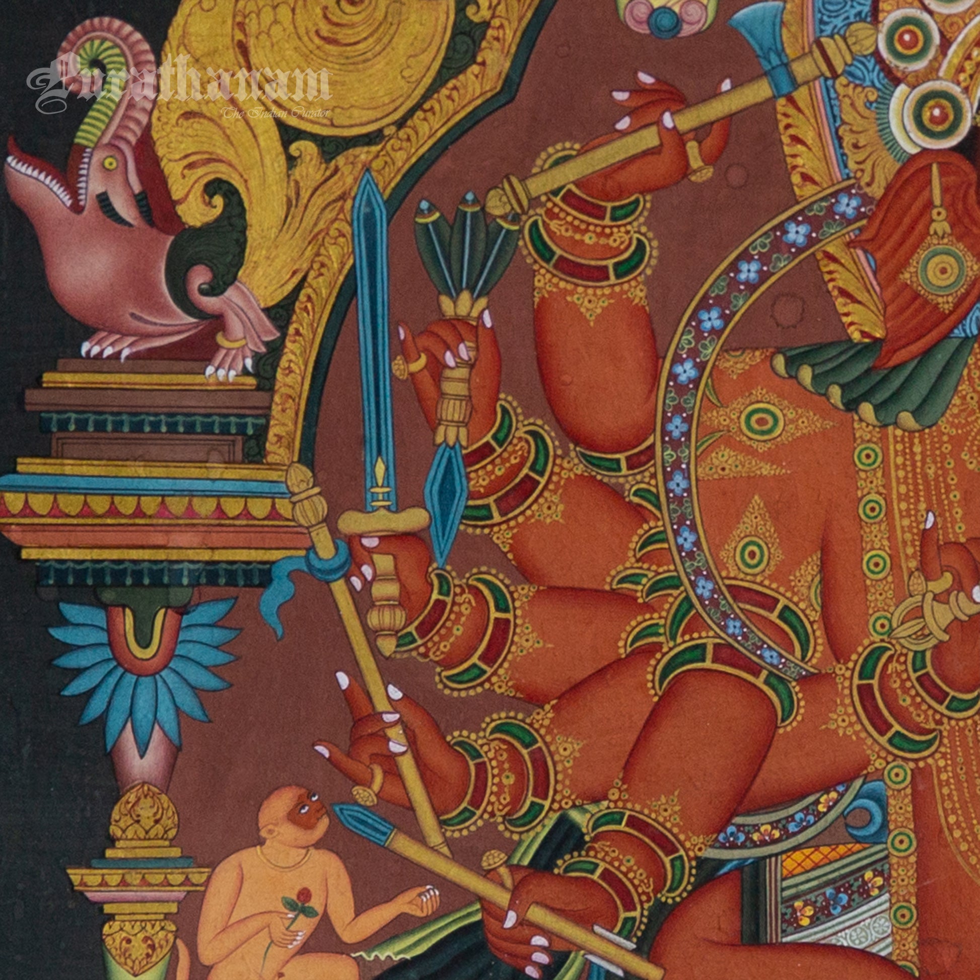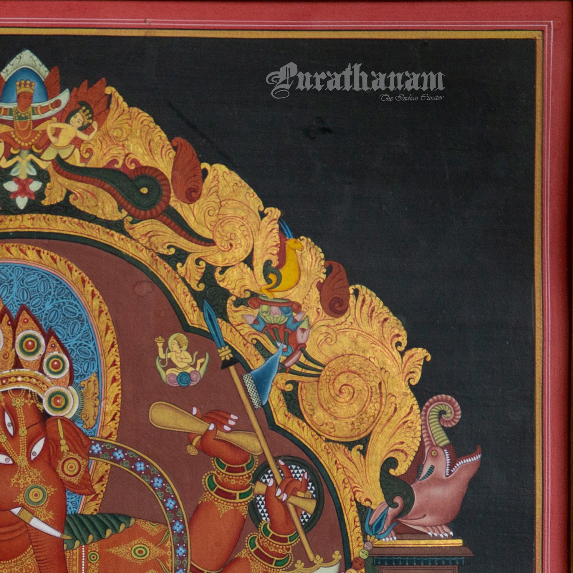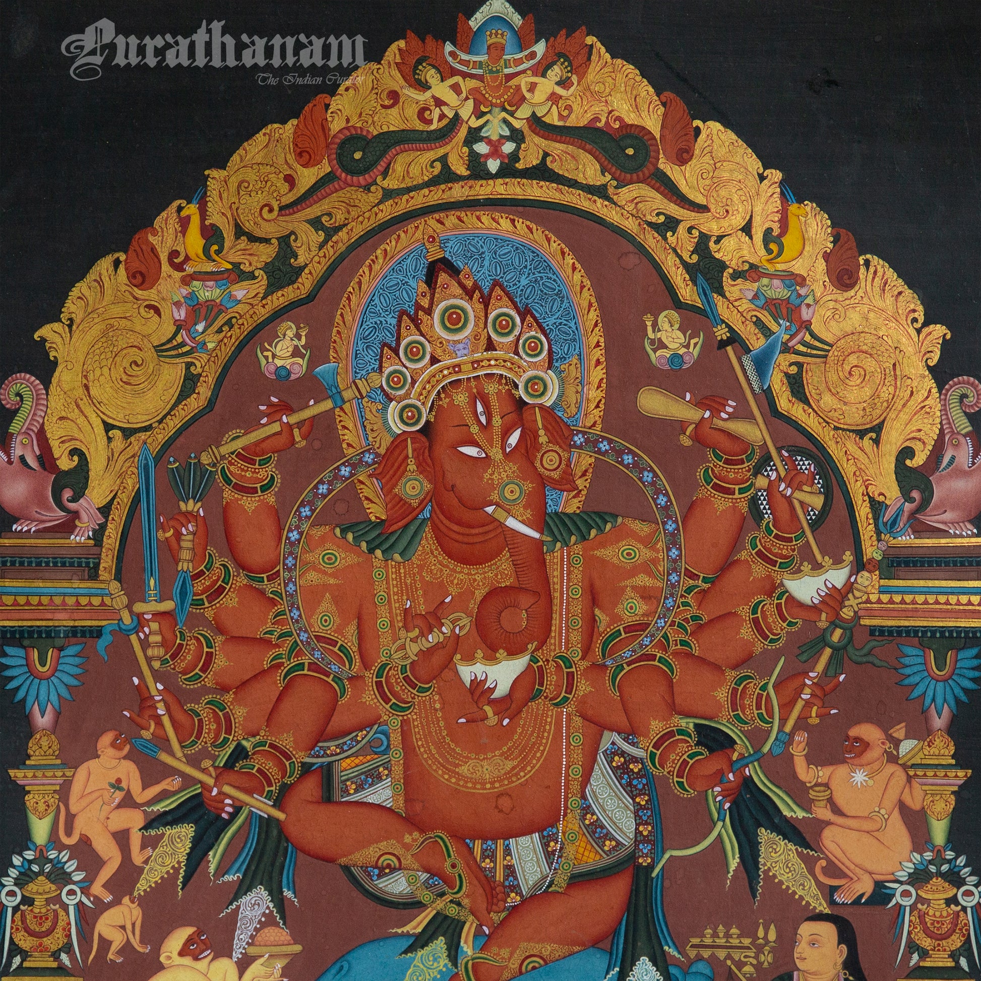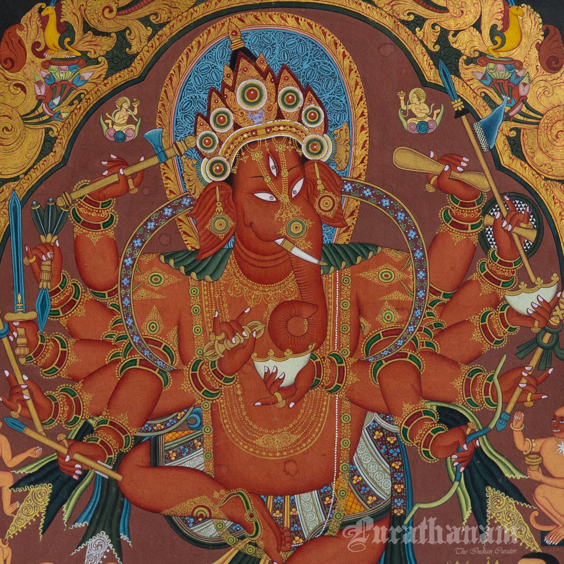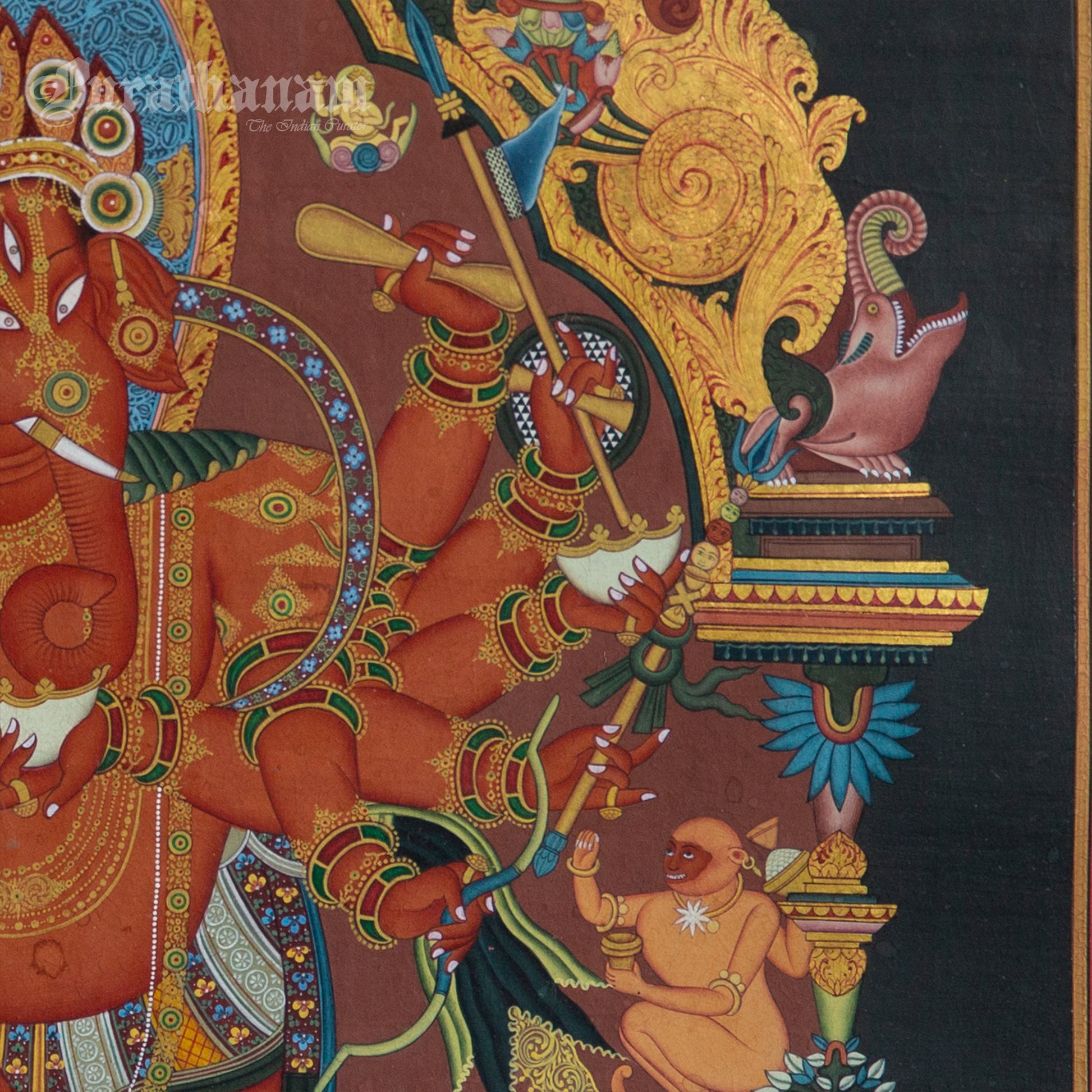 This particular painting of the 12-Armed Maha Rakta Ganapati is done on paper, in watercolor medium, with real gold used in select areas as highlights.