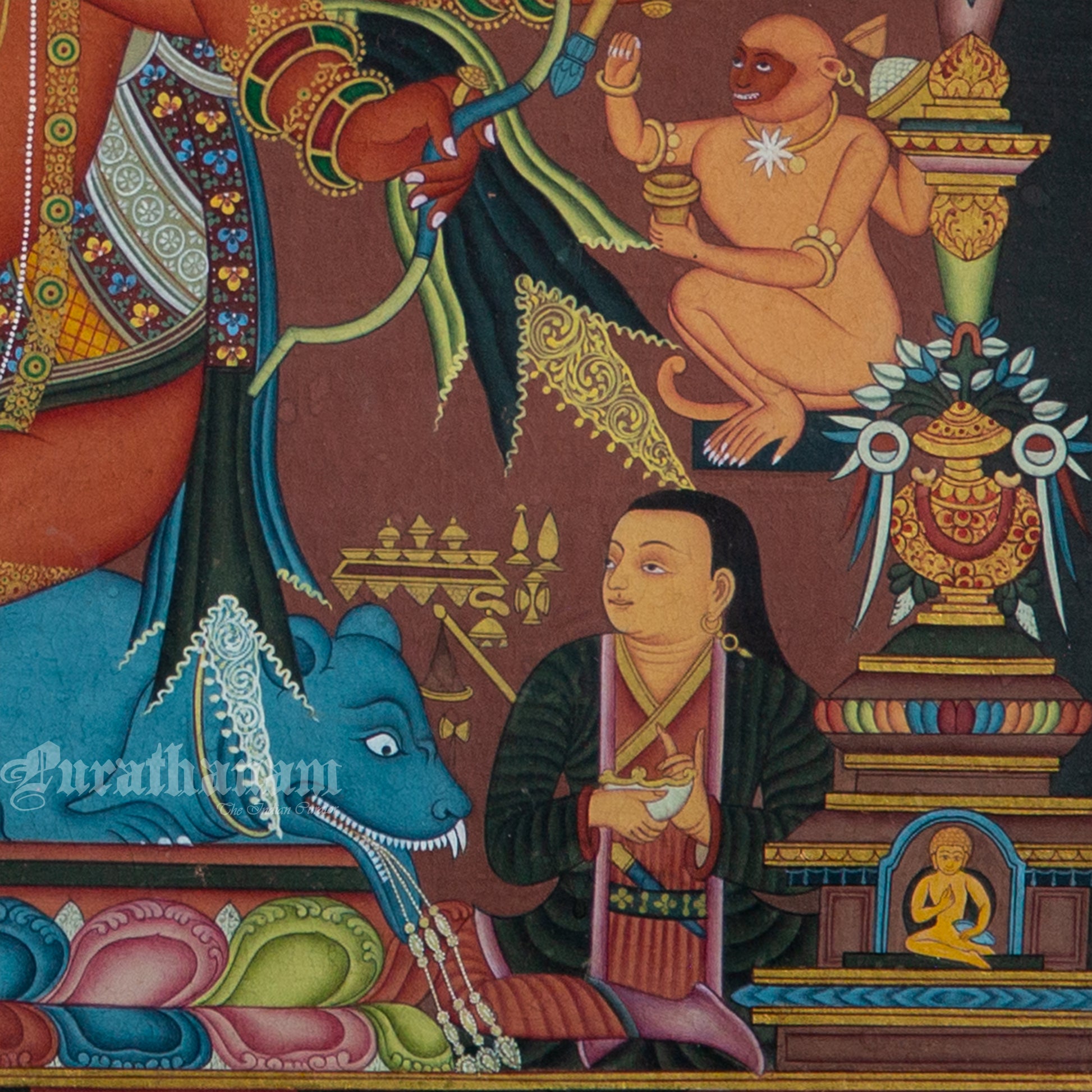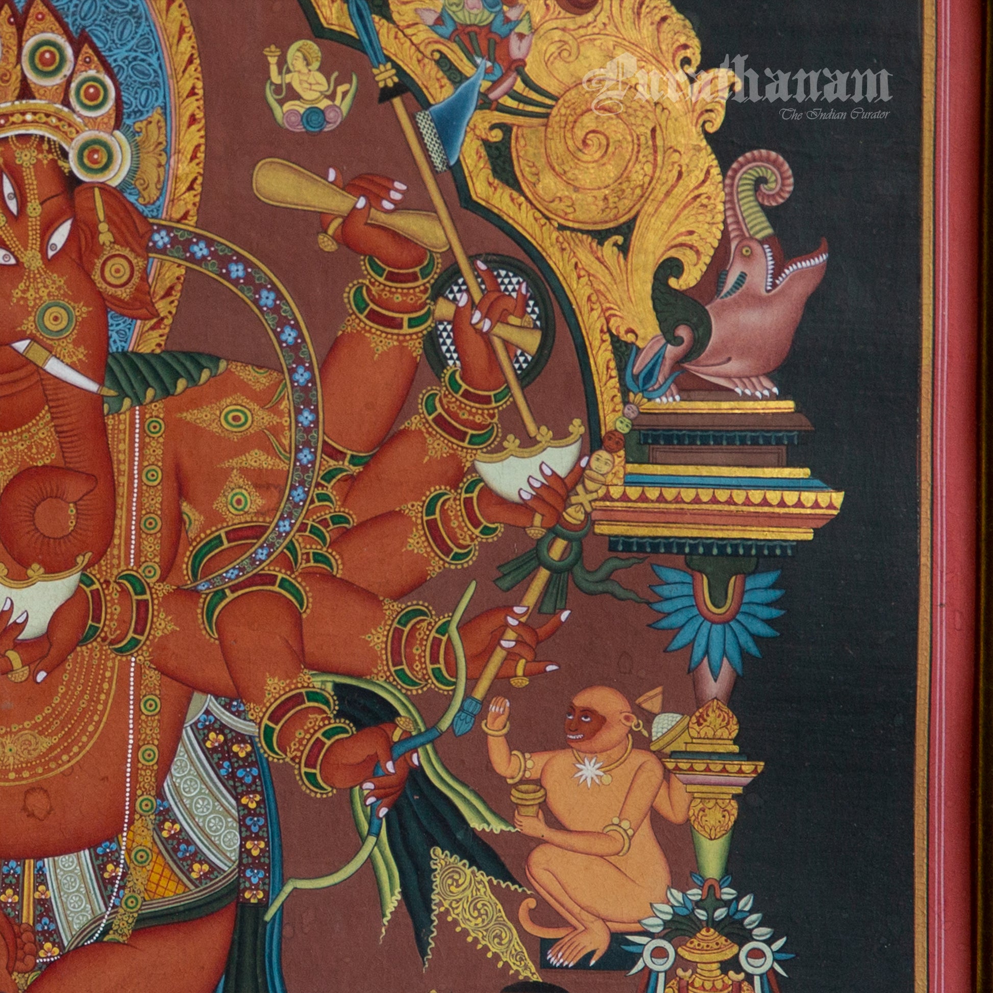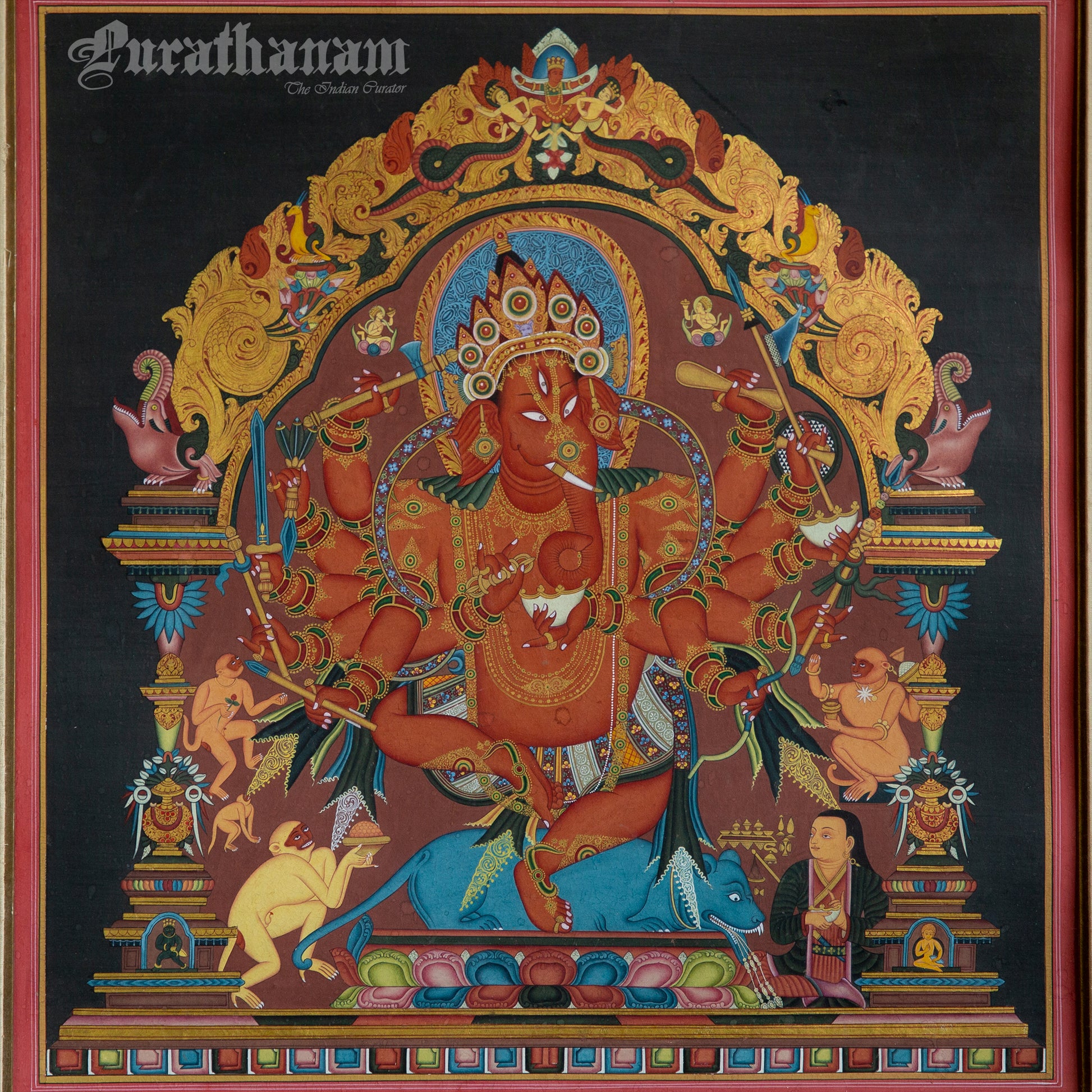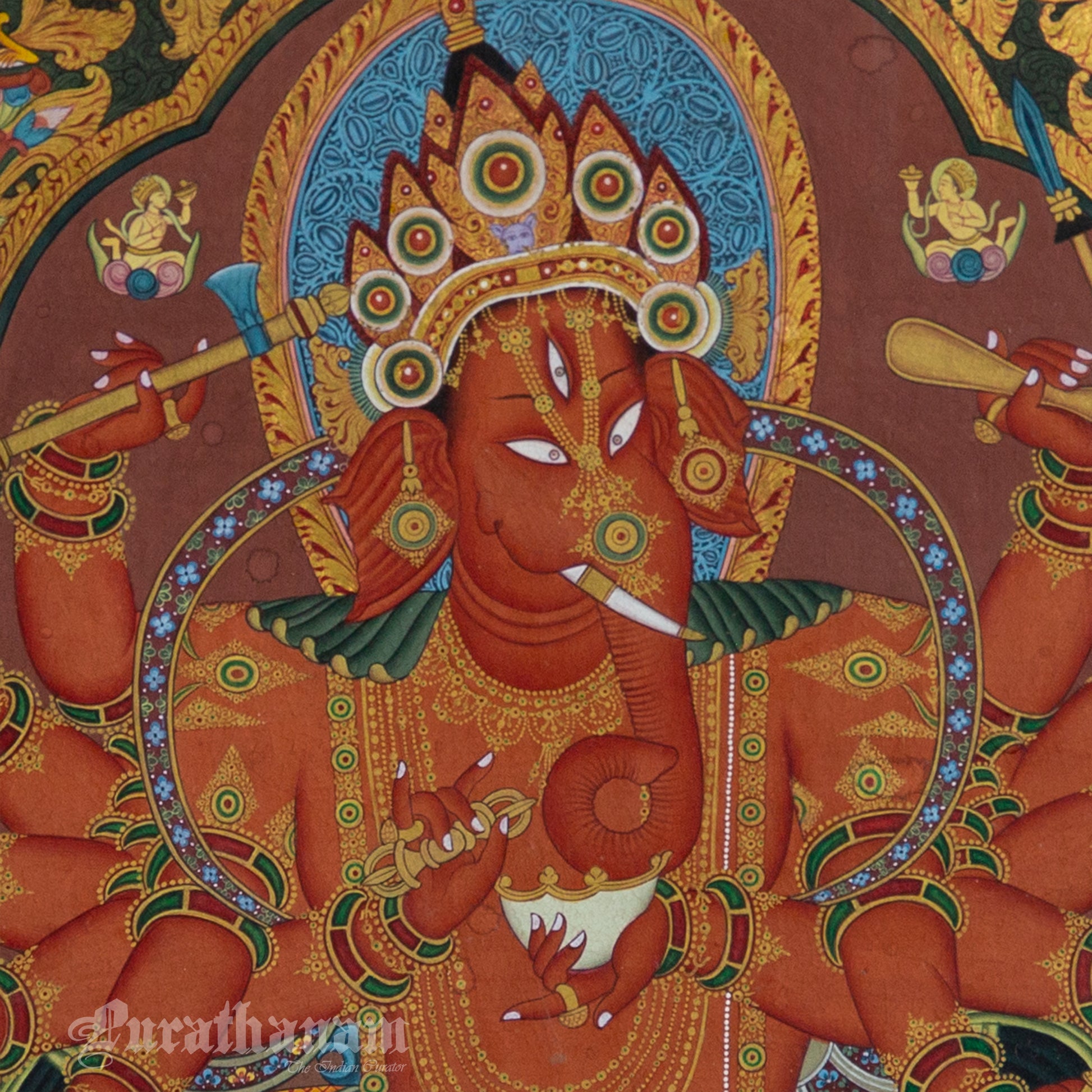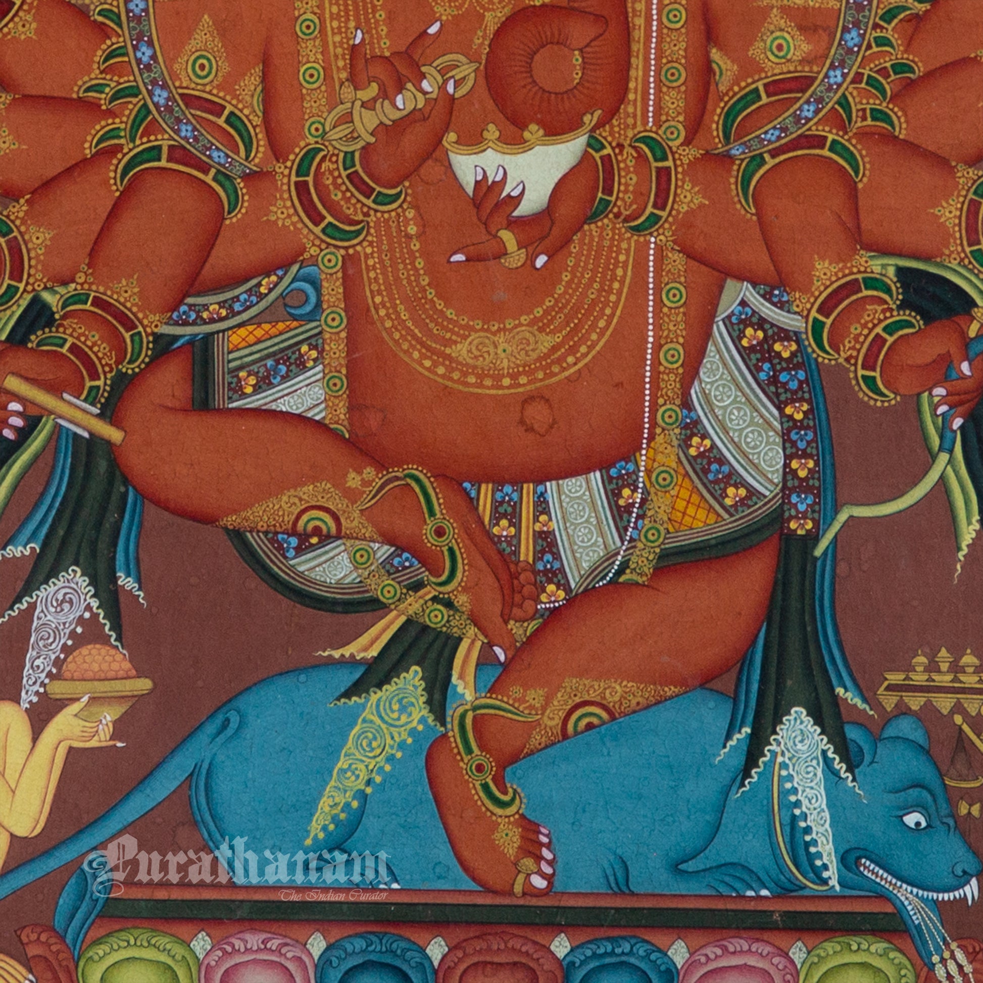 Here we present a beautiful depiction of the 12-Armed Maha Rakta Ganapati, painted in the traditional Tibetan thangka style rooted in the Vajrayana Buddhist tradition. The artwork features meticulous line work and vibrant colors, along with motifs of mythical beings, ritual offerings, and animals, all rich in tantric symbolism.