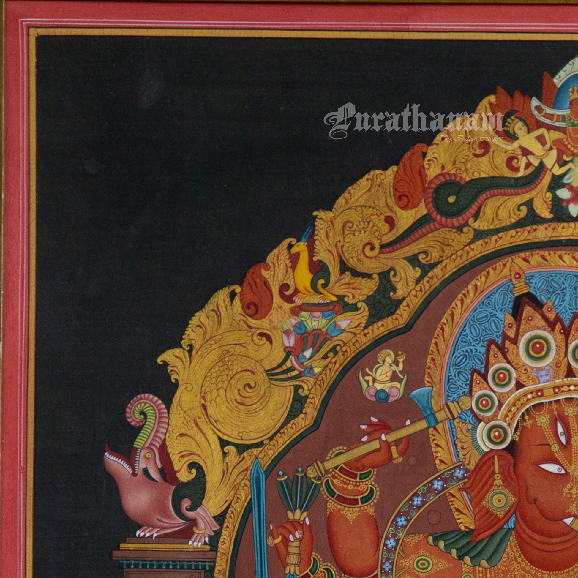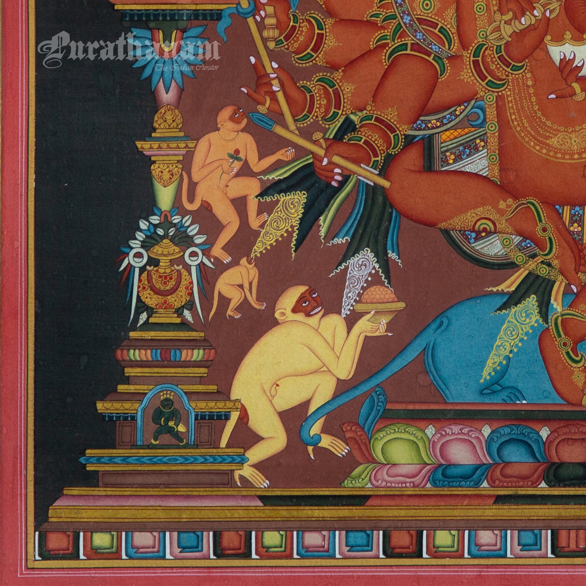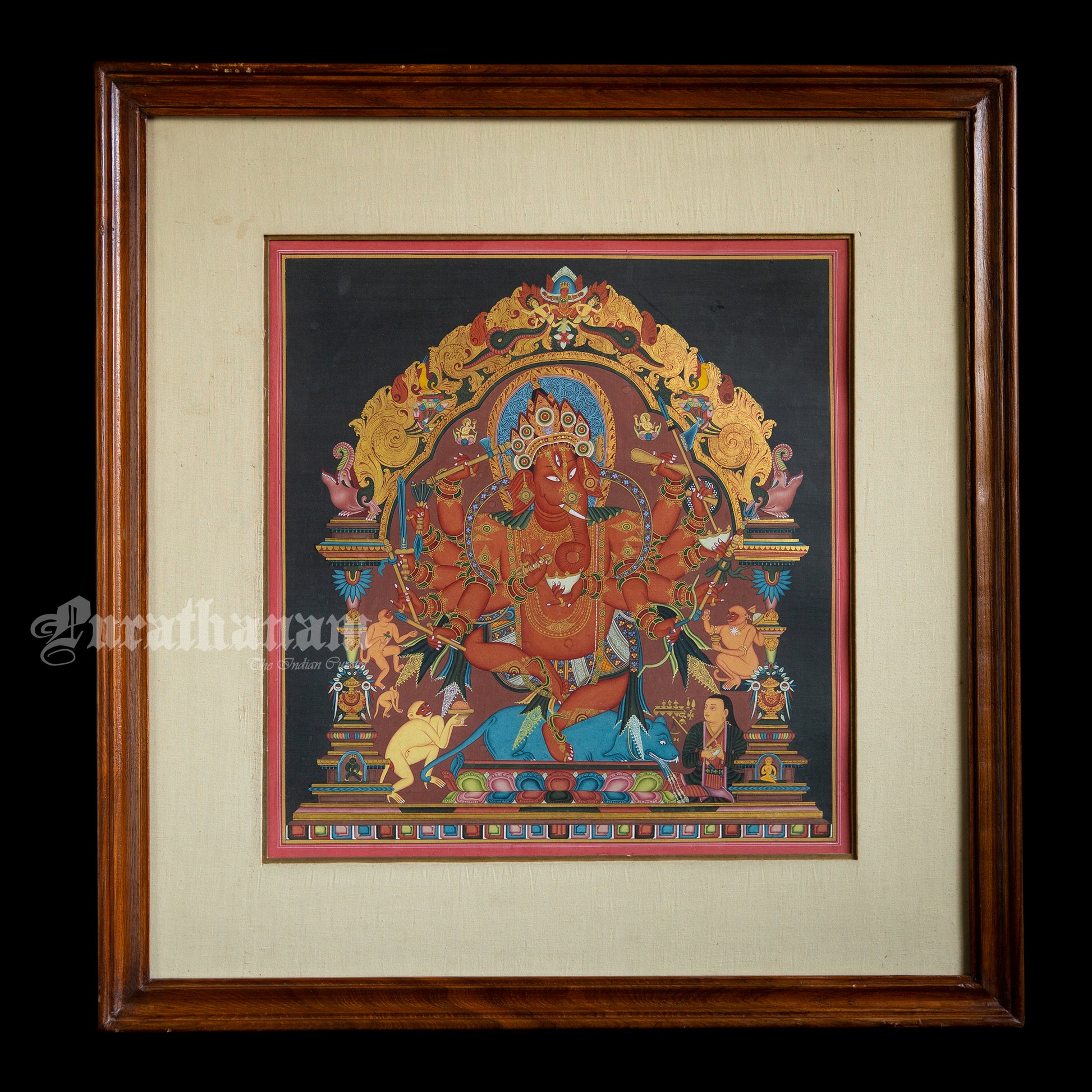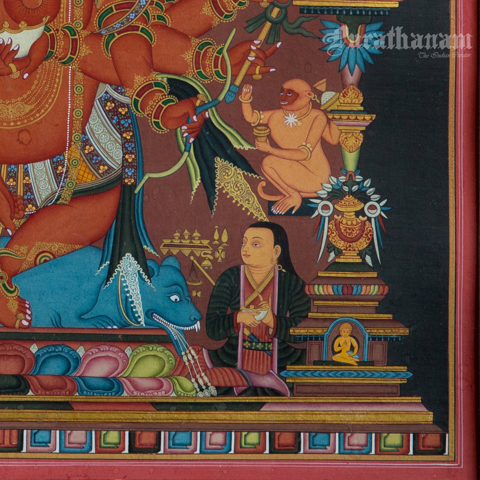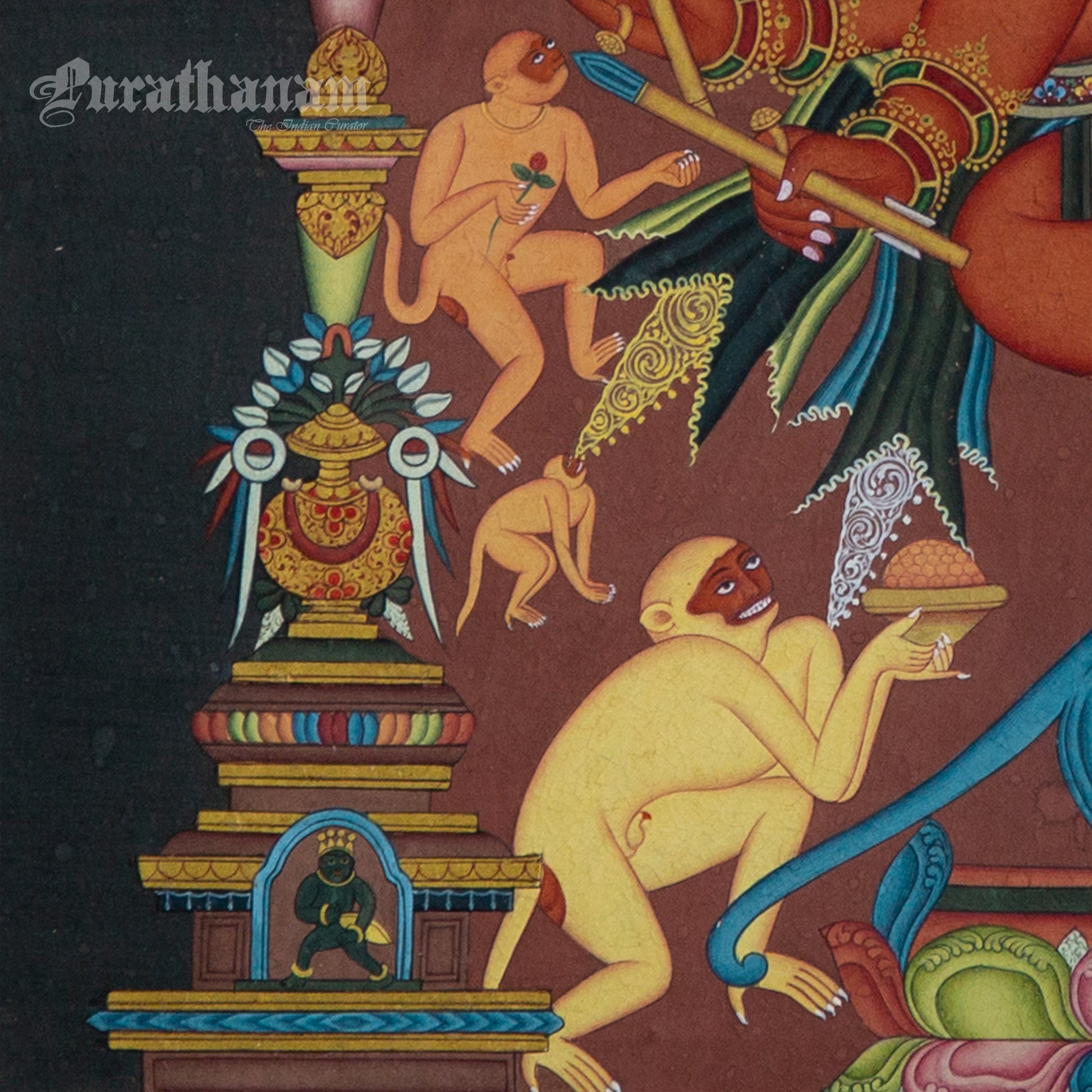 Here we present a beautiful depiction of the 12-Armed Maha Rakta Ganapati, painted in the traditional Tibetan thangka style rooted in the Vajrayana Buddhist tradition. The artwork features meticulous line work and vibrant colors, along with motifs of mythical beings, ritual offerings, and animals, all rich in tantric symbolism.
