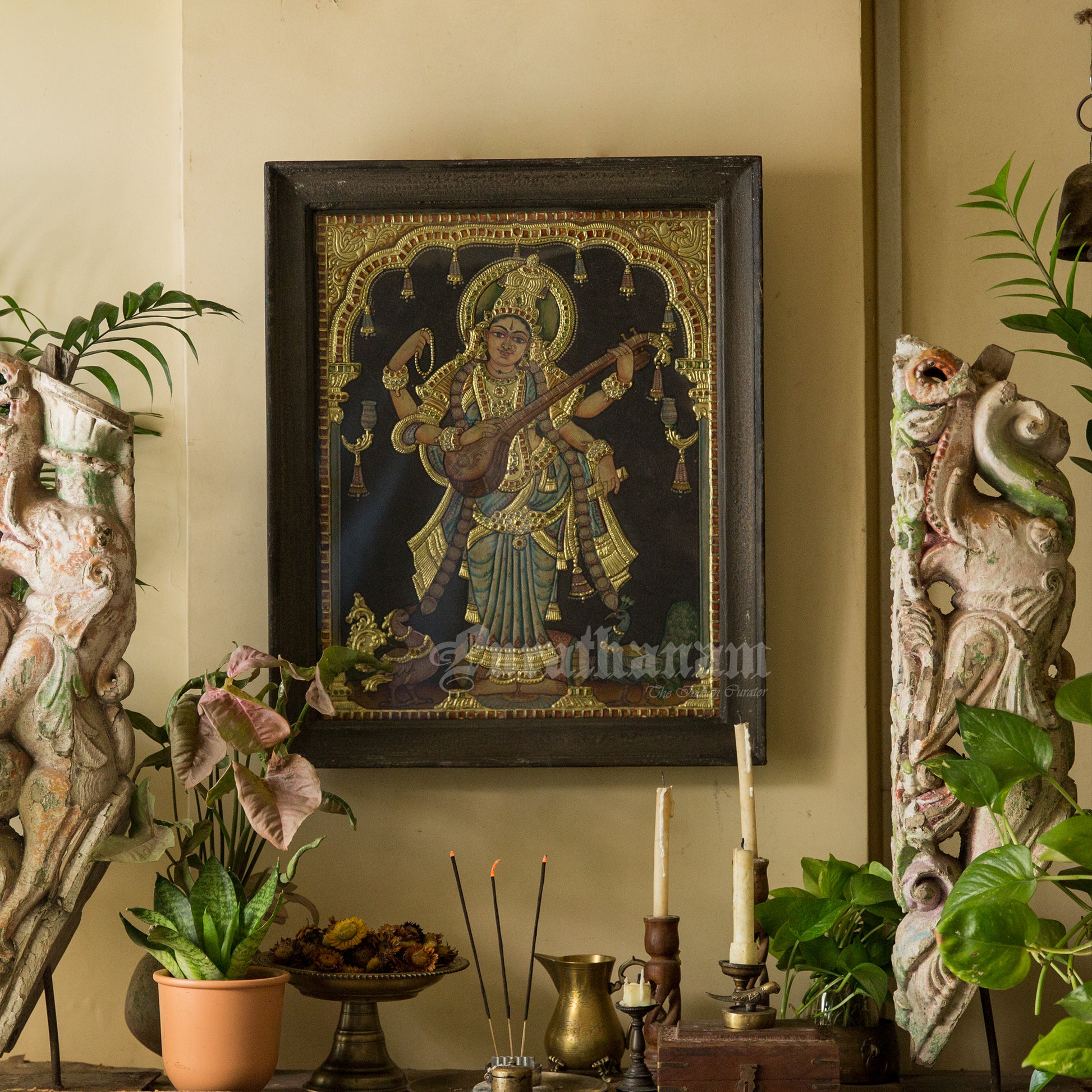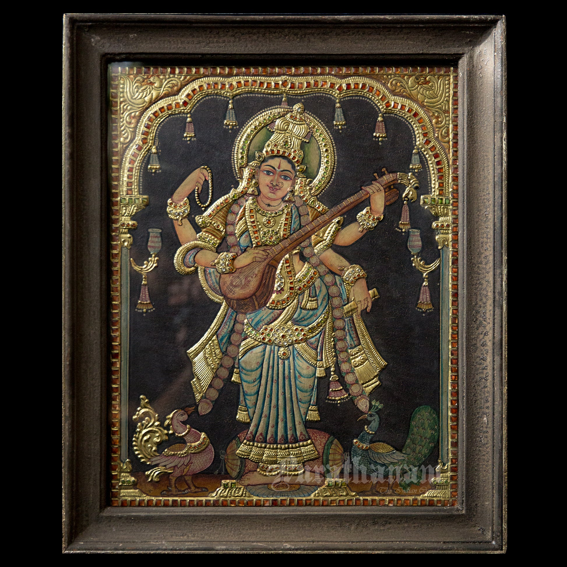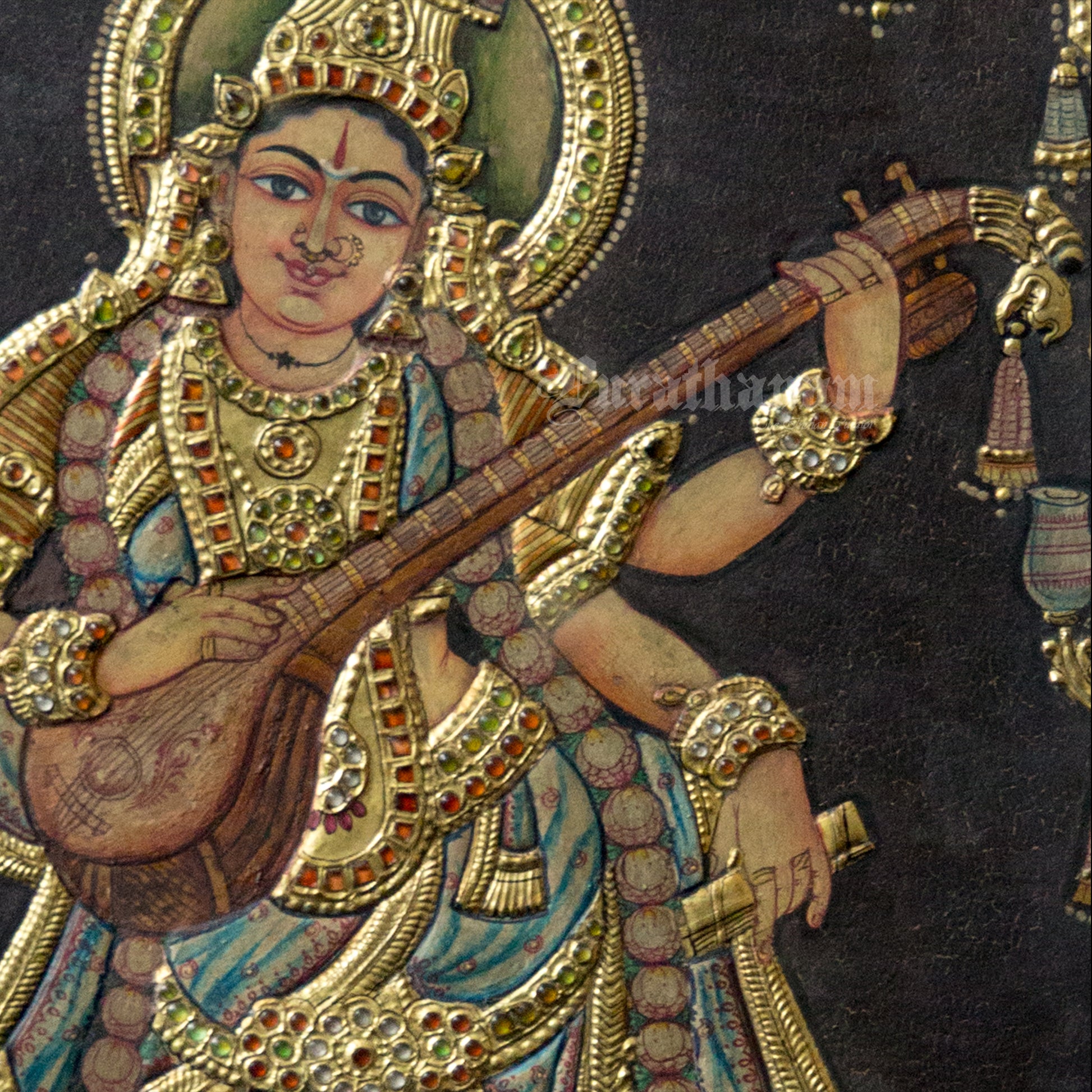 Here is a Tanjore painting of beautiful Saraswati who has has many names like Saraswati, Sharada, Veenapani, Bagdevi and Bani, Chaduvula in Telugu, Sharadamba in Kannada and She is popularly known as Kalaimagal in Tamizh.