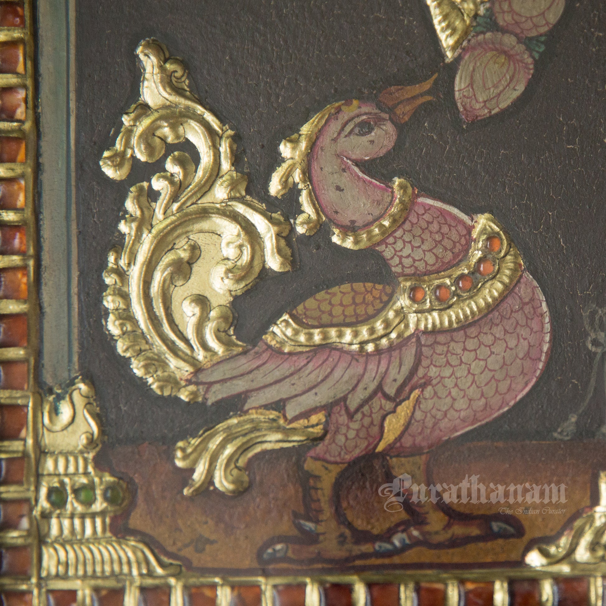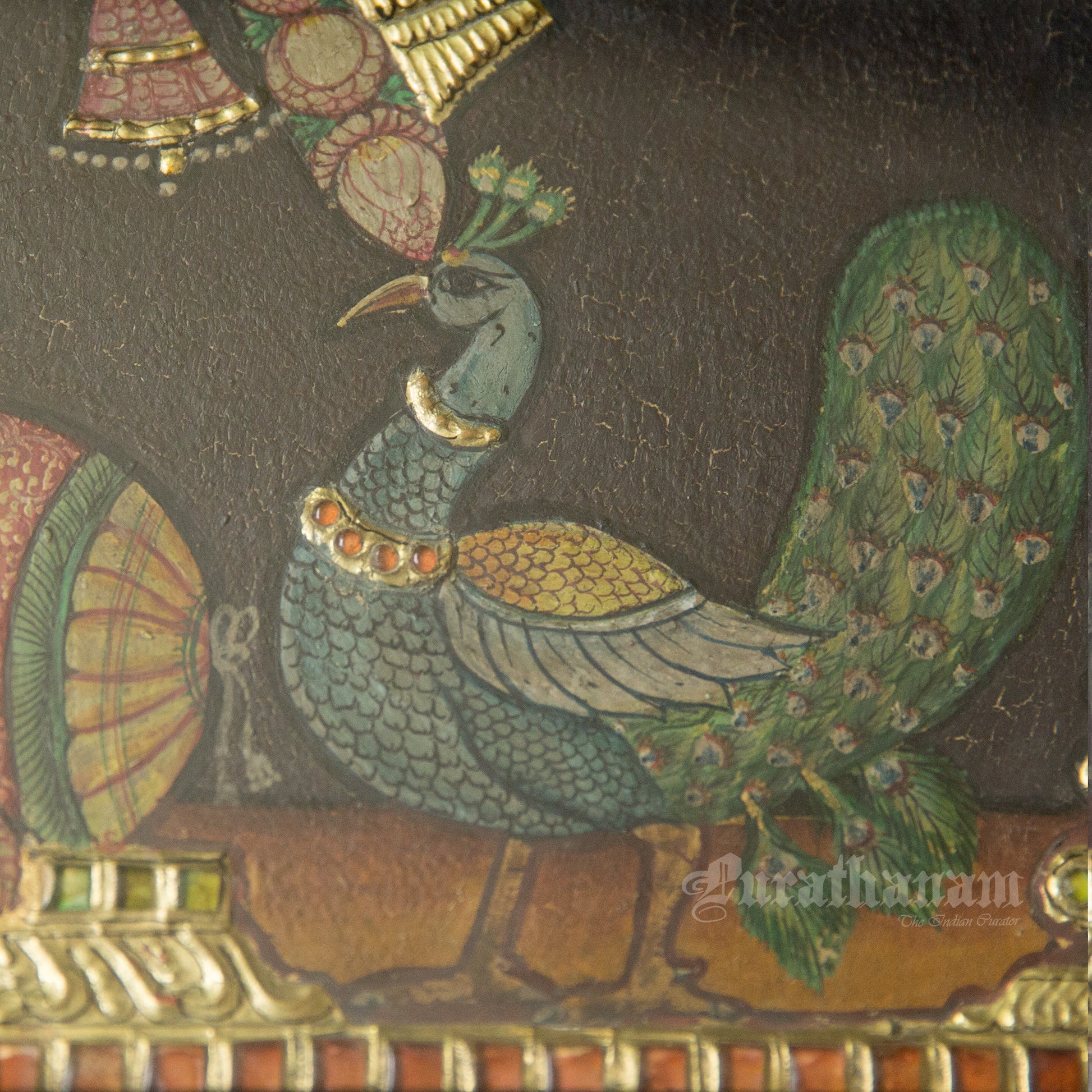 - Natural Colors: The color medium used in early Tanjavur paintings was made from organic vegetable dyes, resulting in lighter shades compared to modern-day Tanjore paintings. These natural colors were not affected by light exposure at the time, as the paintings were mostly kept indoors and lit by dim traditional lamps. However, with the invention of electricity and the use of brighter lighting, it became harder for these colors to survive over time.