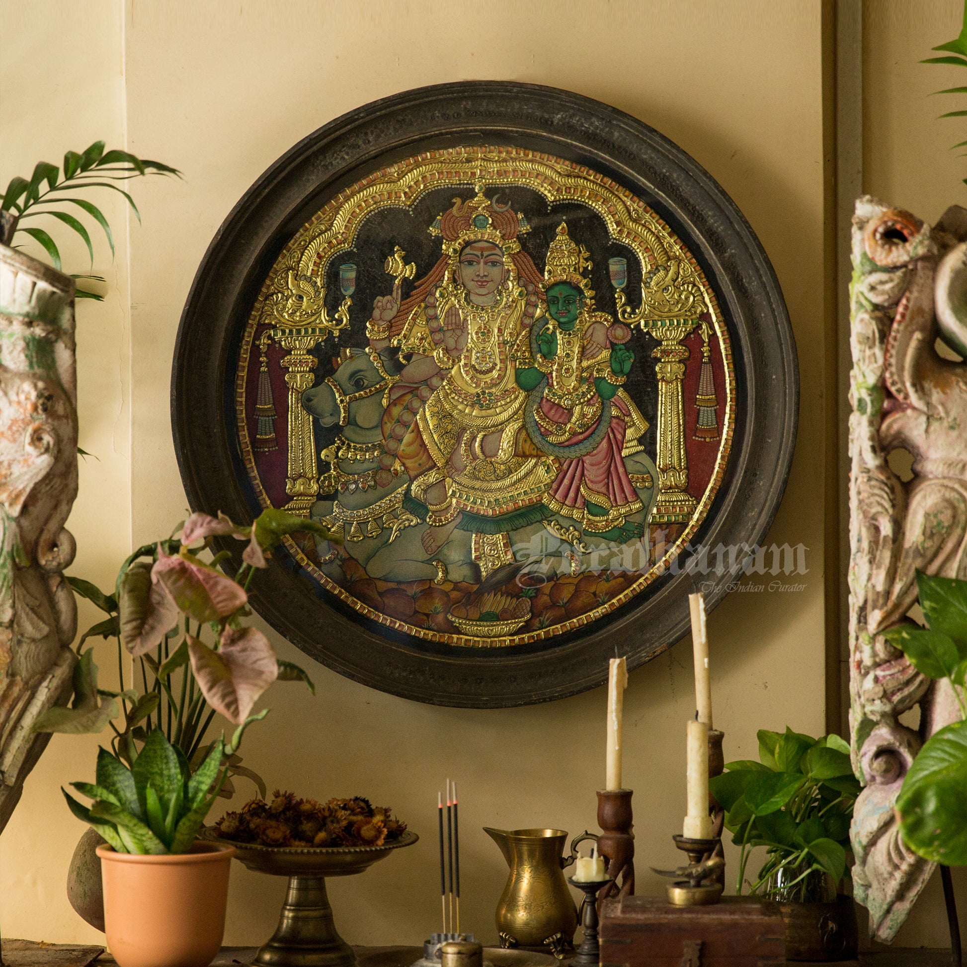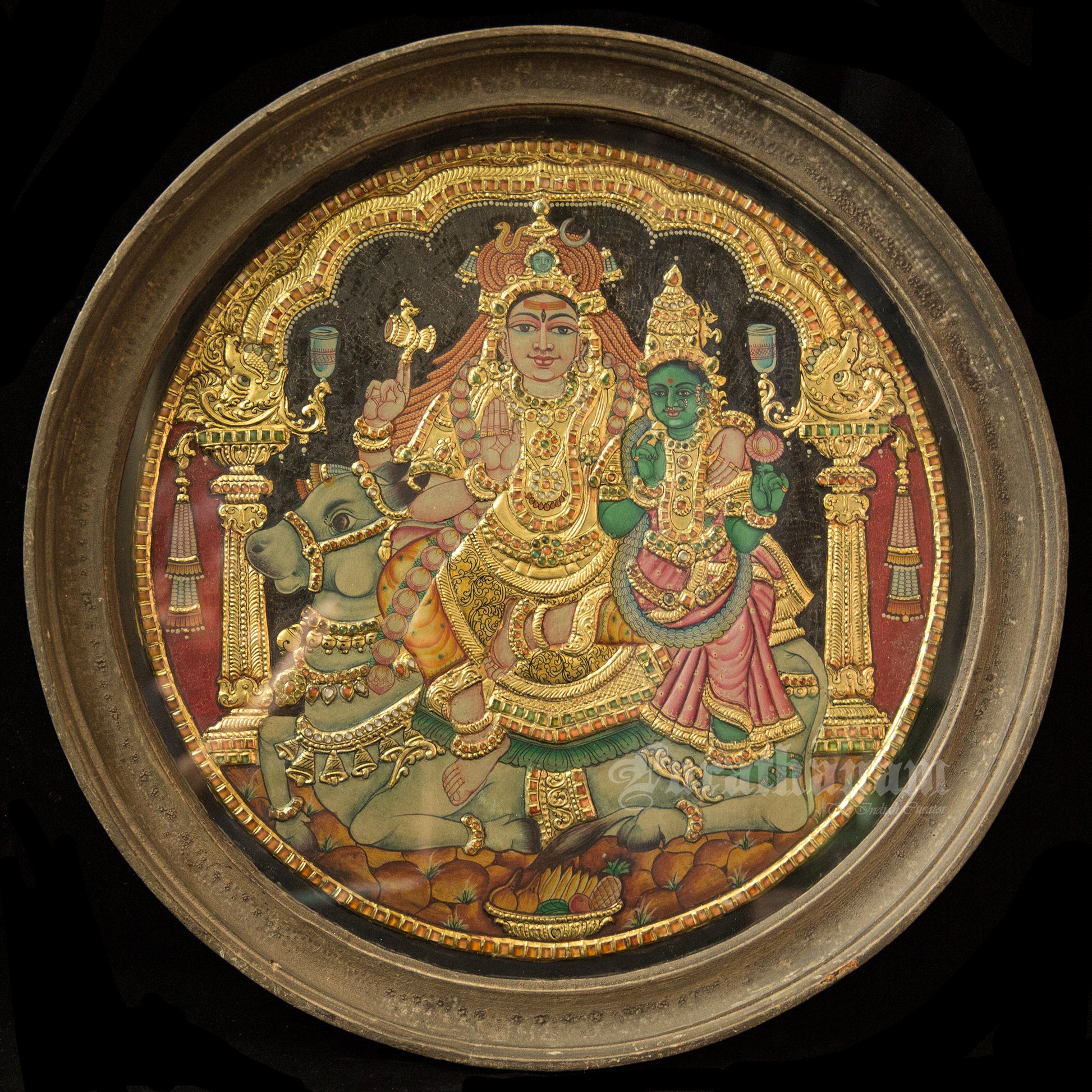 Here is a lovely Tanjore painting of the most beautiful couple, Shivan and Parvati seated on Nandhi which is framed in round. Finding a round shaped frame in Tanjore Painting is very rare.
