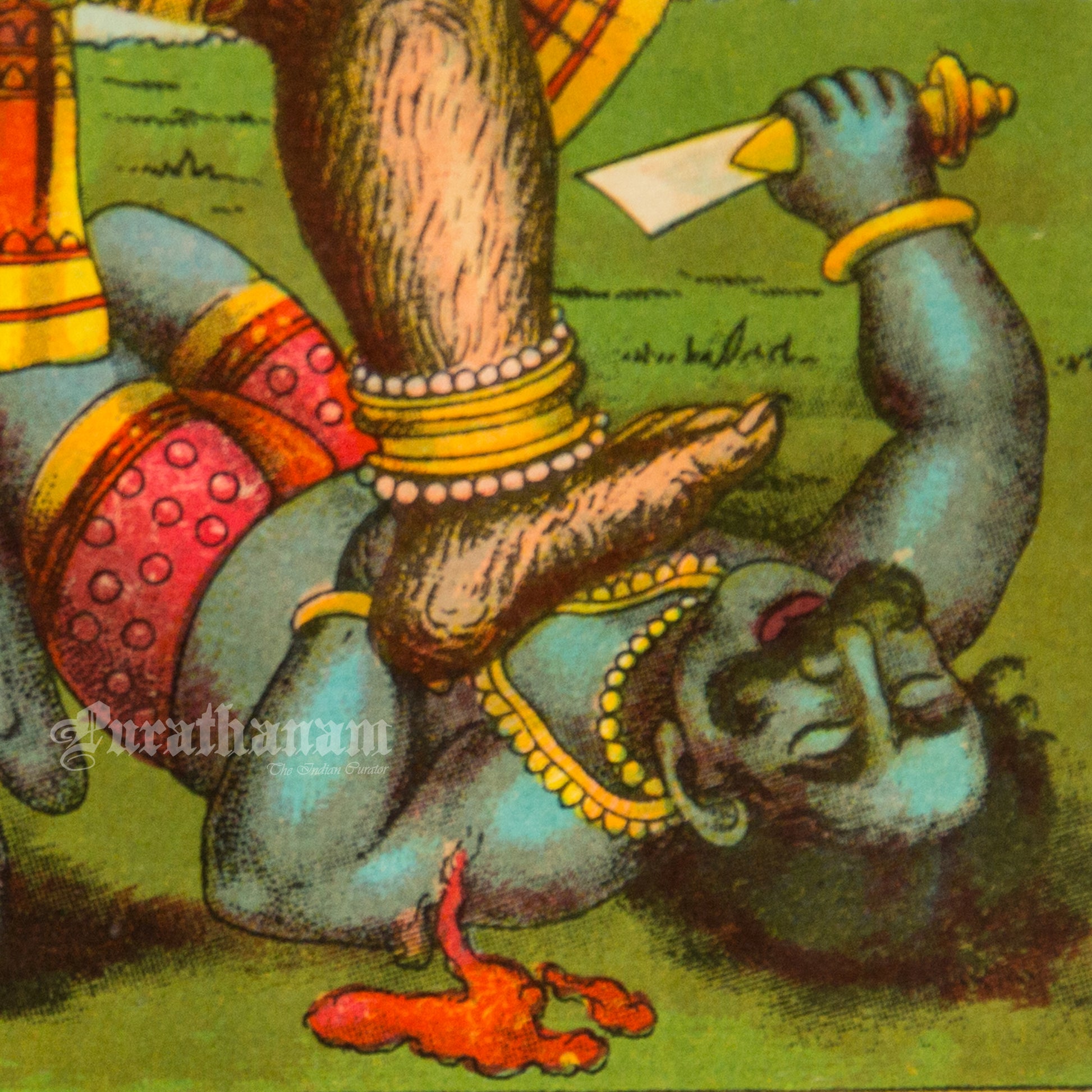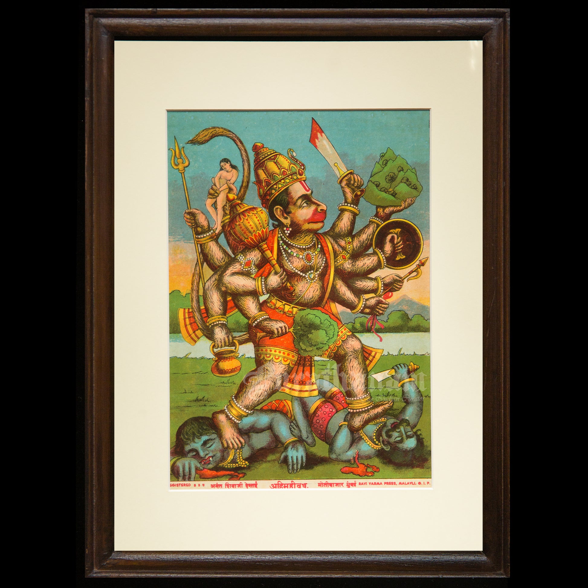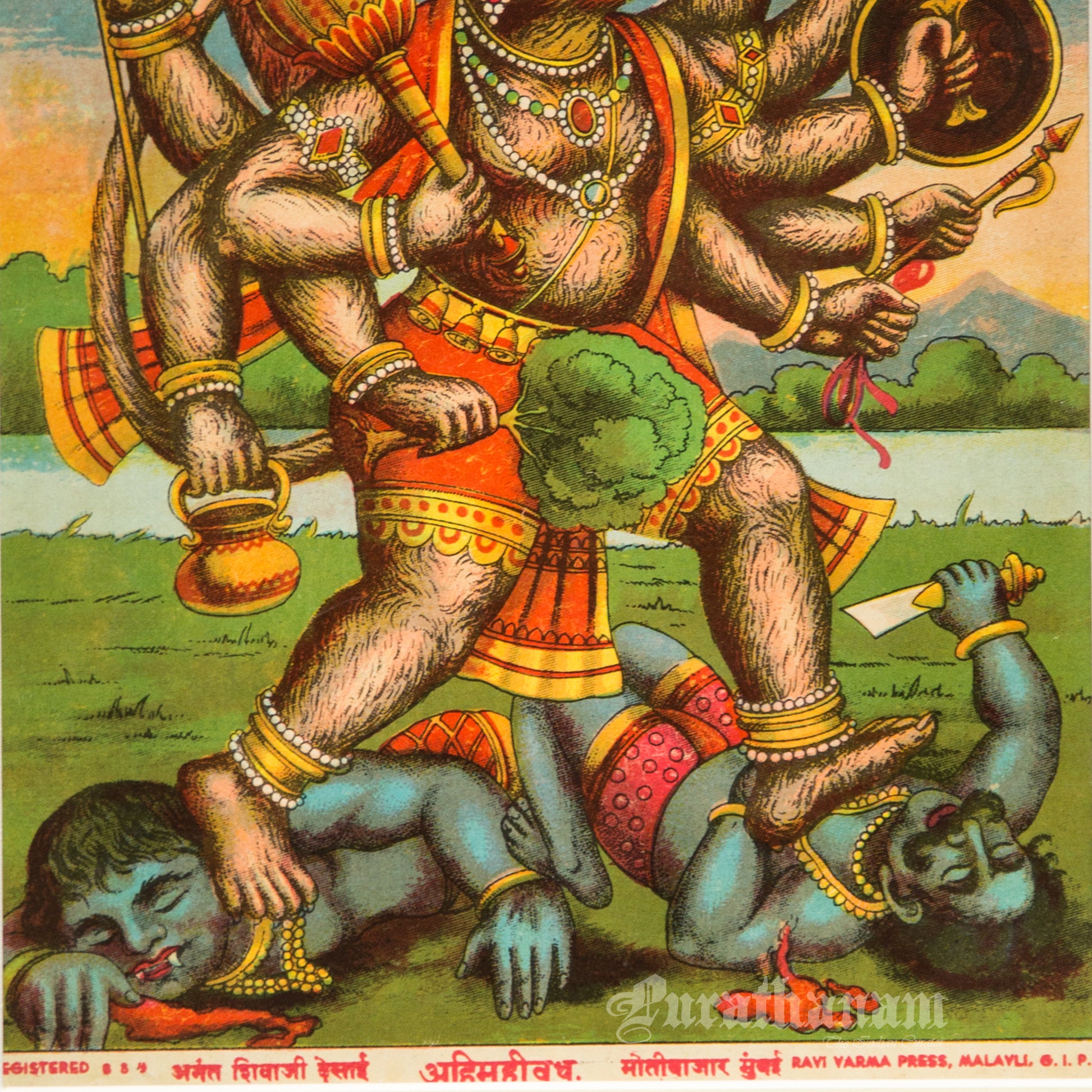 Introducing mini lithograph prints of size 10”x7” from 1920s - 1930s of Ahi Mahi Vadh by Ravi Varma an Indian who achieved recognition for his depiction of scenes from the epics of the Mahabharata and Ramayana.