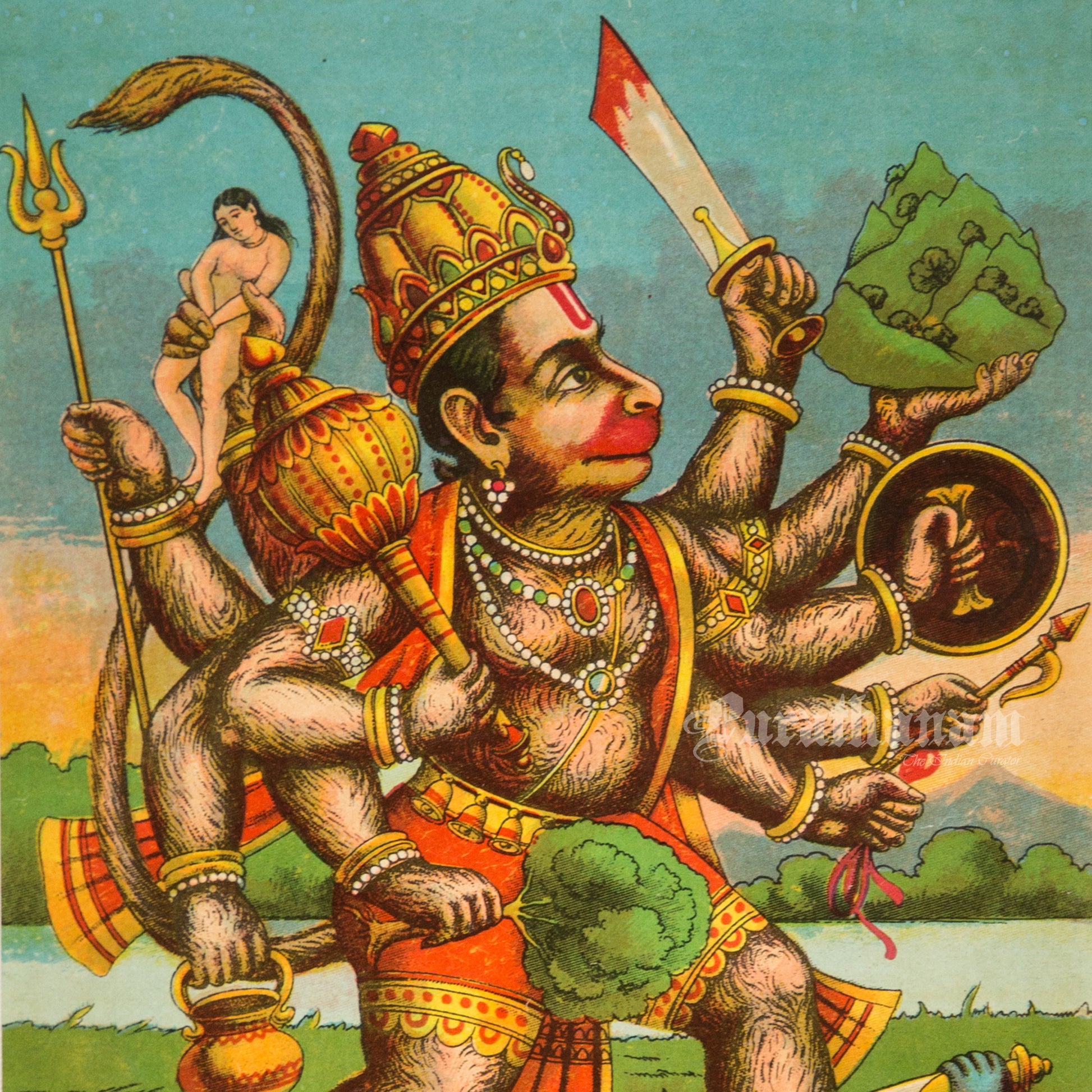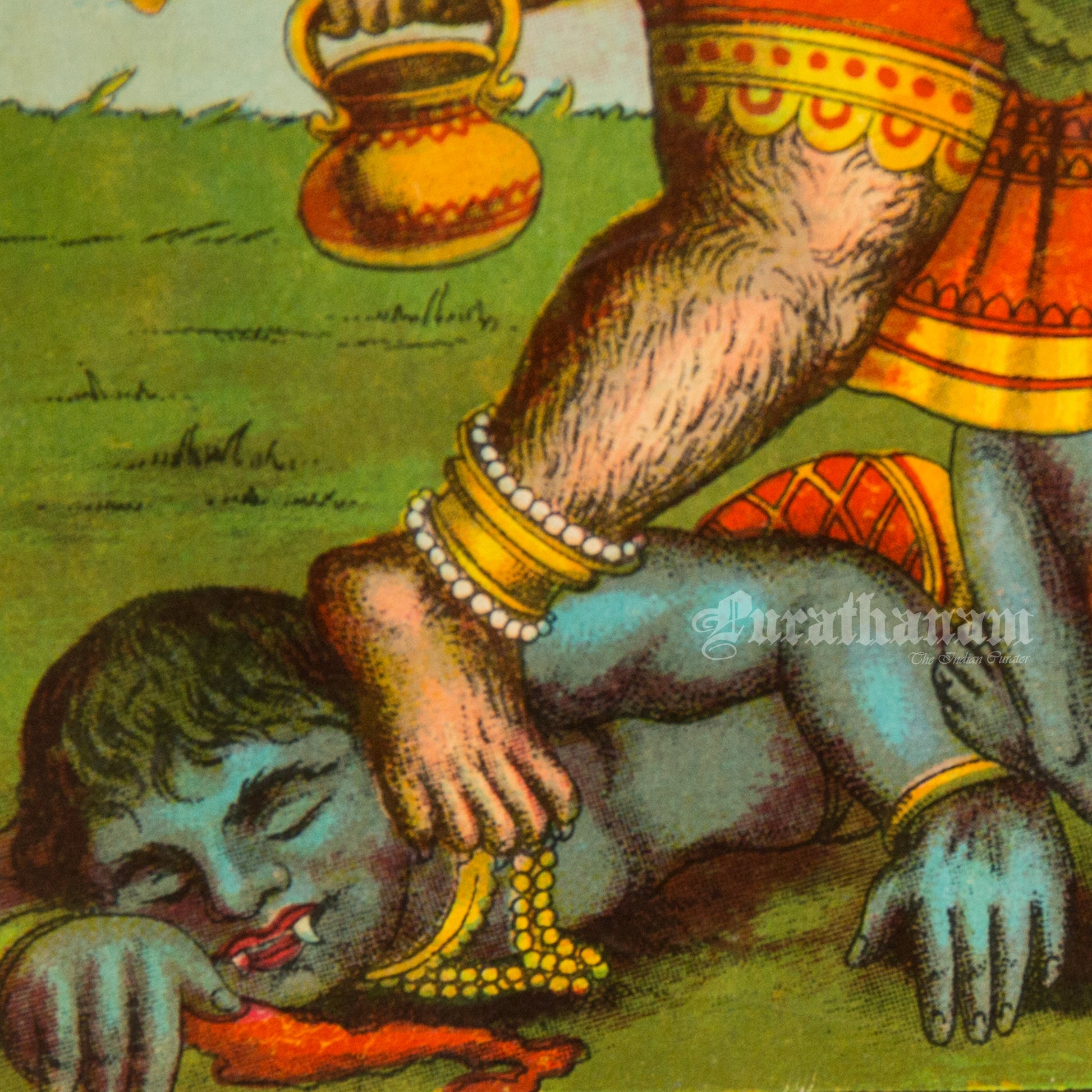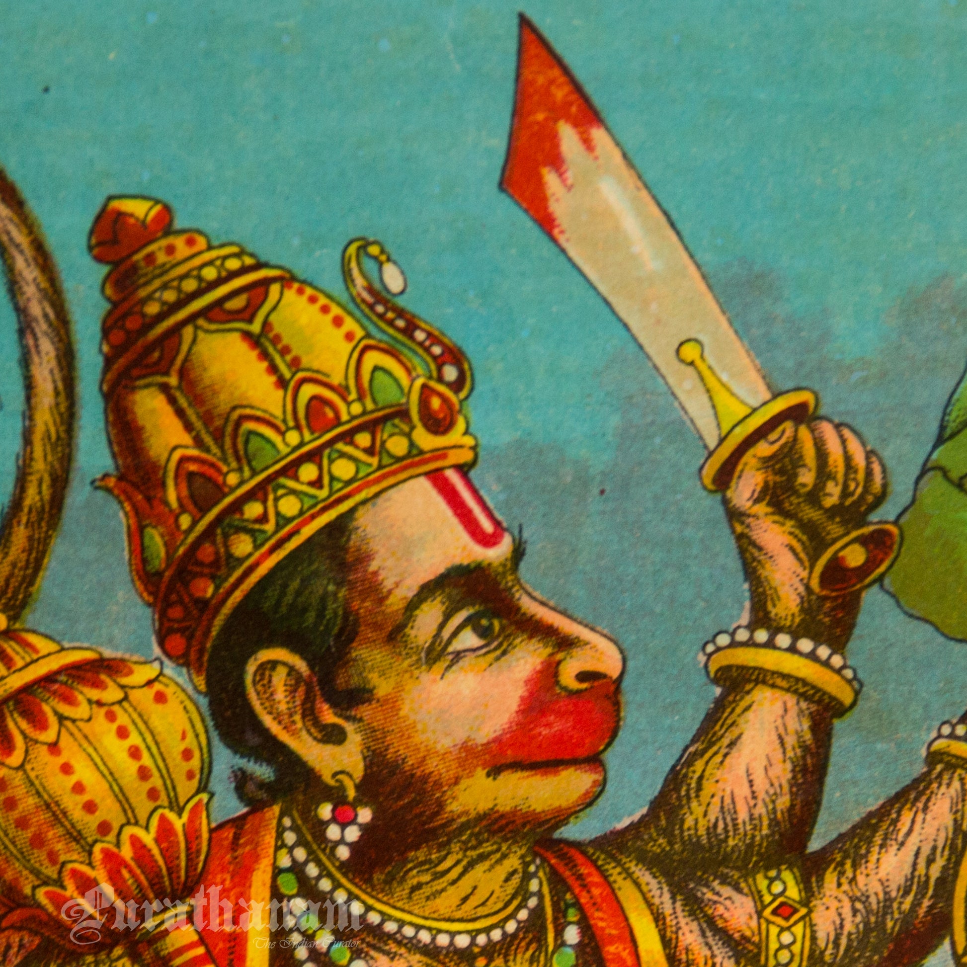 Introducing mini lithograph prints of size 10”x7” from 1920s - 1930s of Ahi Mahi Vadh by Ravi Varma an Indian who achieved recognition for his depiction of scenes from the epics of the Mahabharata and Ramayana.