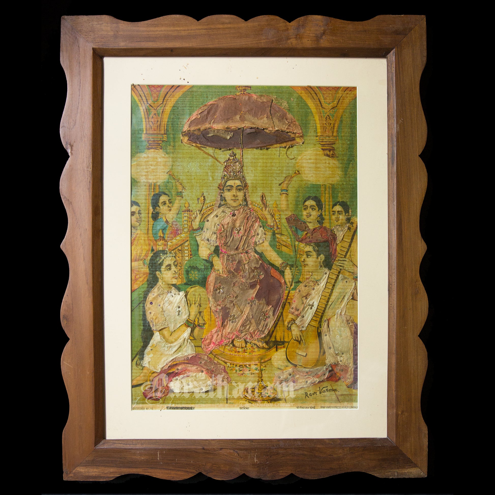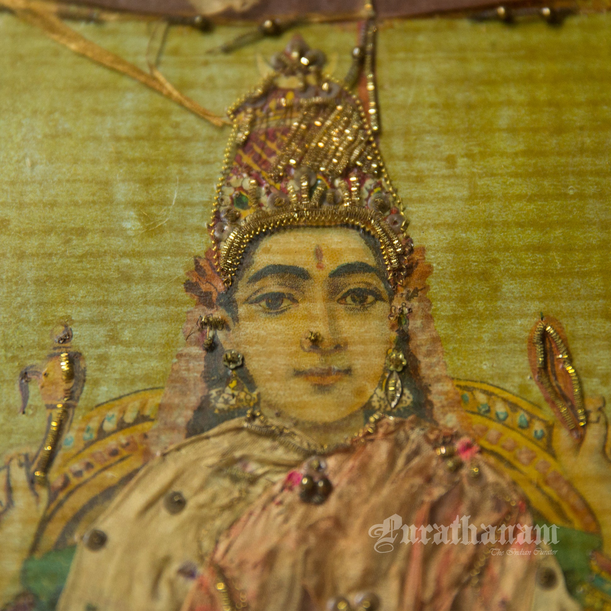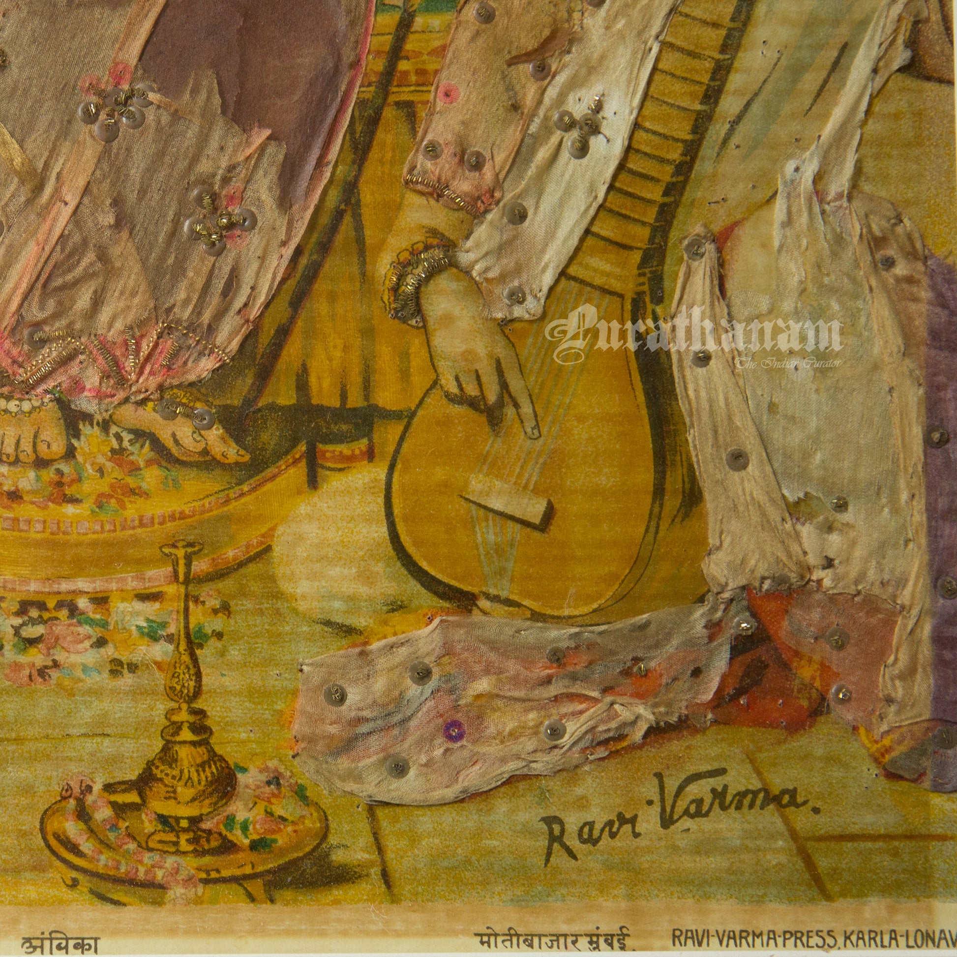 This is an embellished lithograph print of Ambika from the late 1800s from the Ravi Varma press. Ravi Varma, an Indian artist renowned for his depictions in the Mahabharata and Ramayana, painted this beautiful piece.