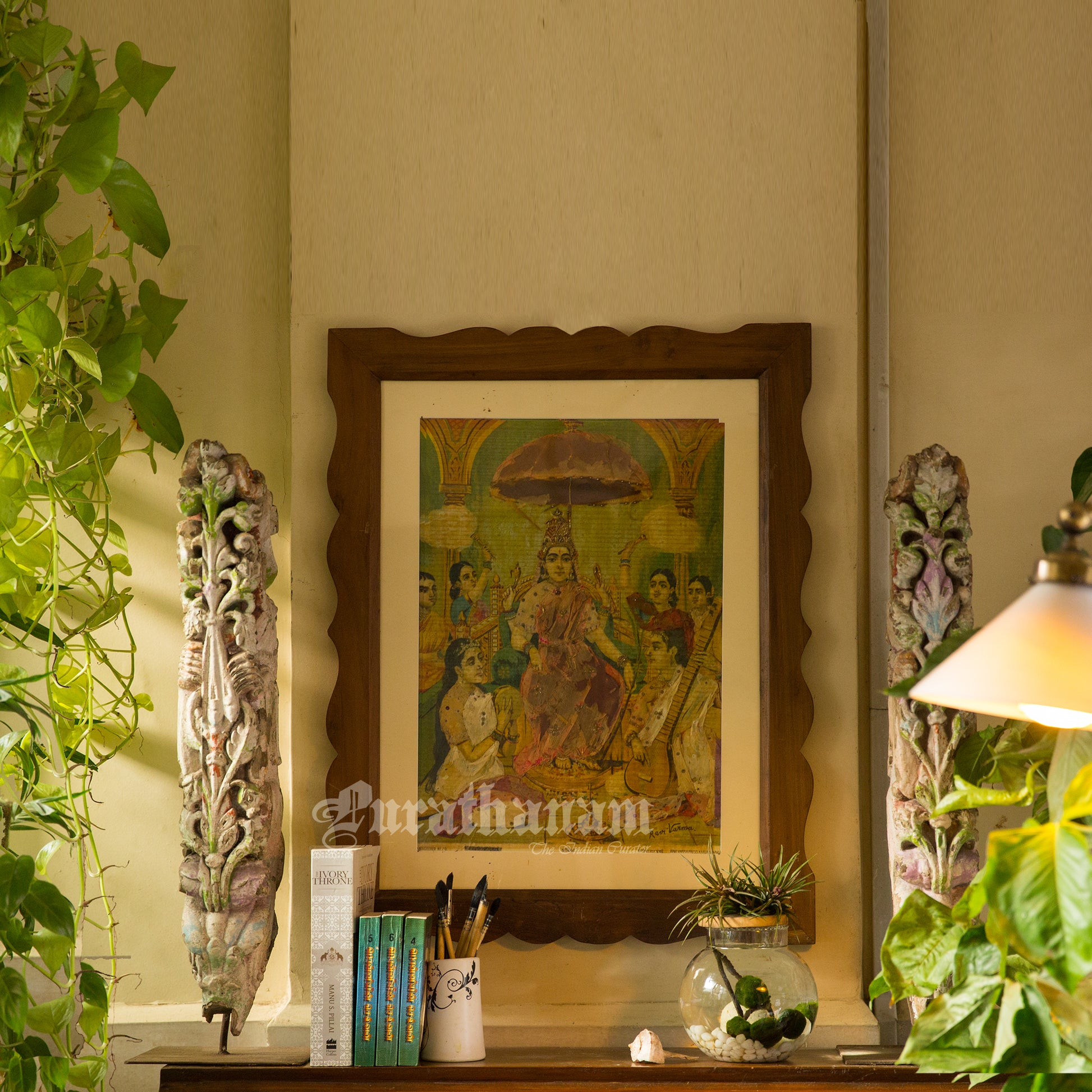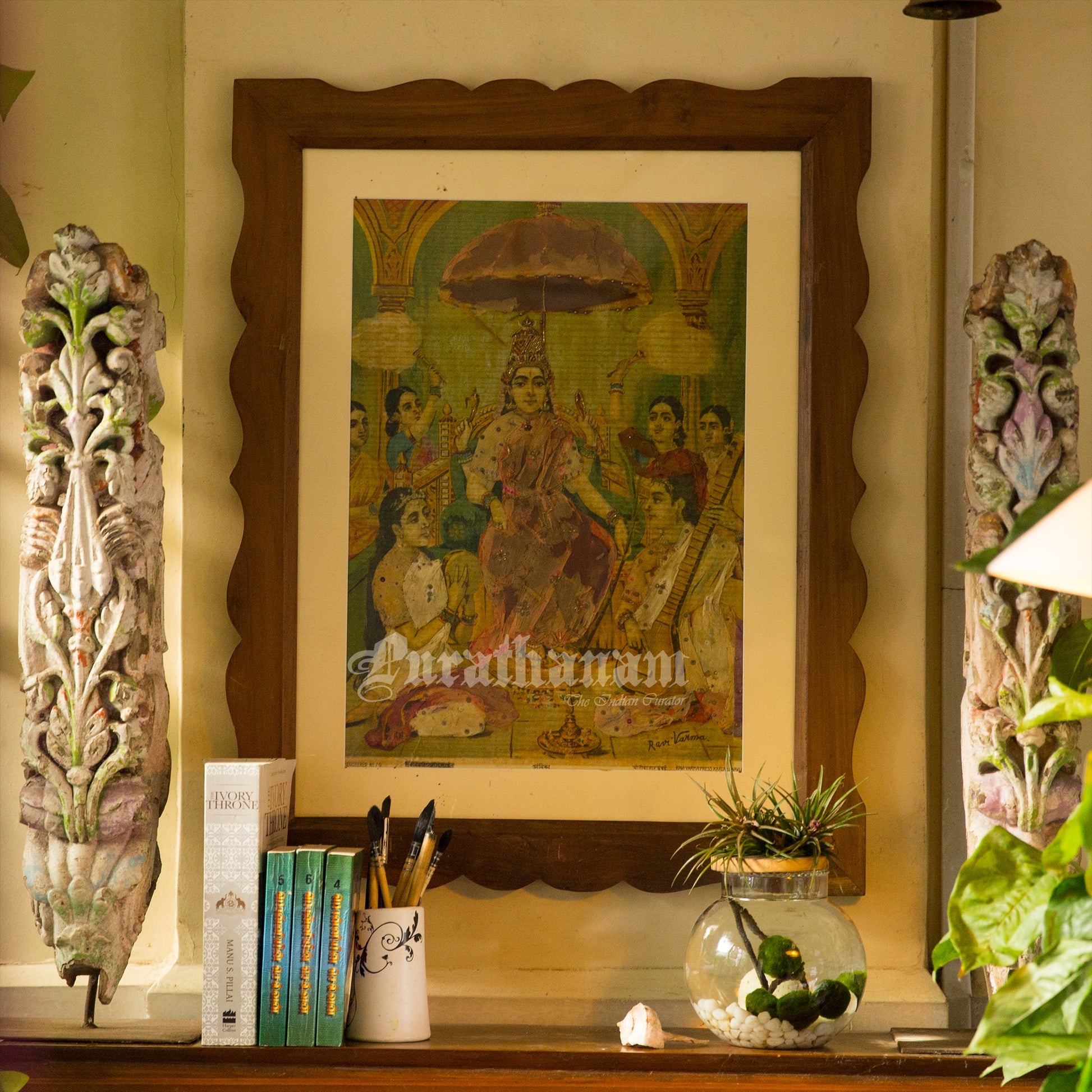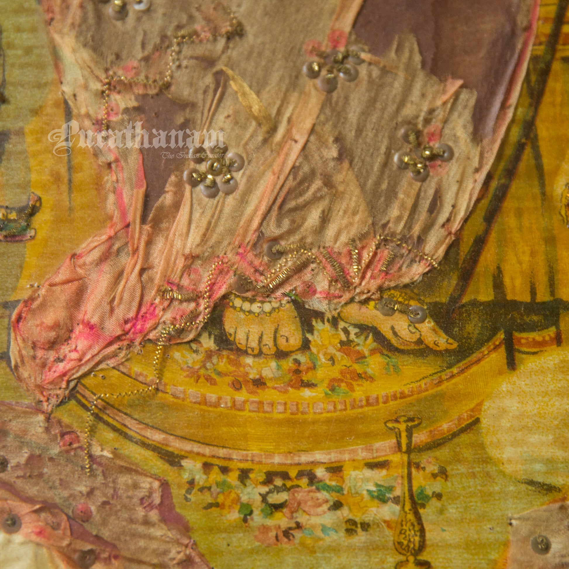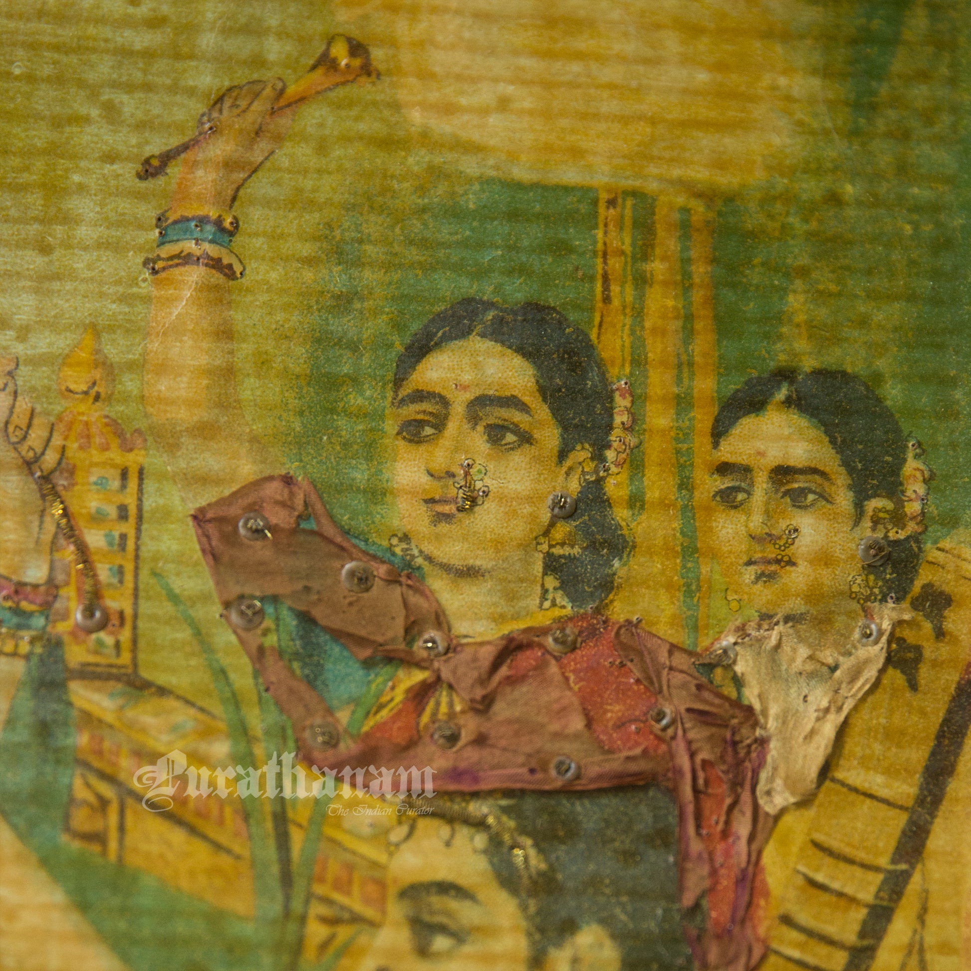 This is an embellished lithograph print of Ambika from the late 1800s from the Ravi Varma press. Ravi Varma, an Indian artist renowned for his depictions in the Mahabharata and Ramayana, painted this beautiful piece.