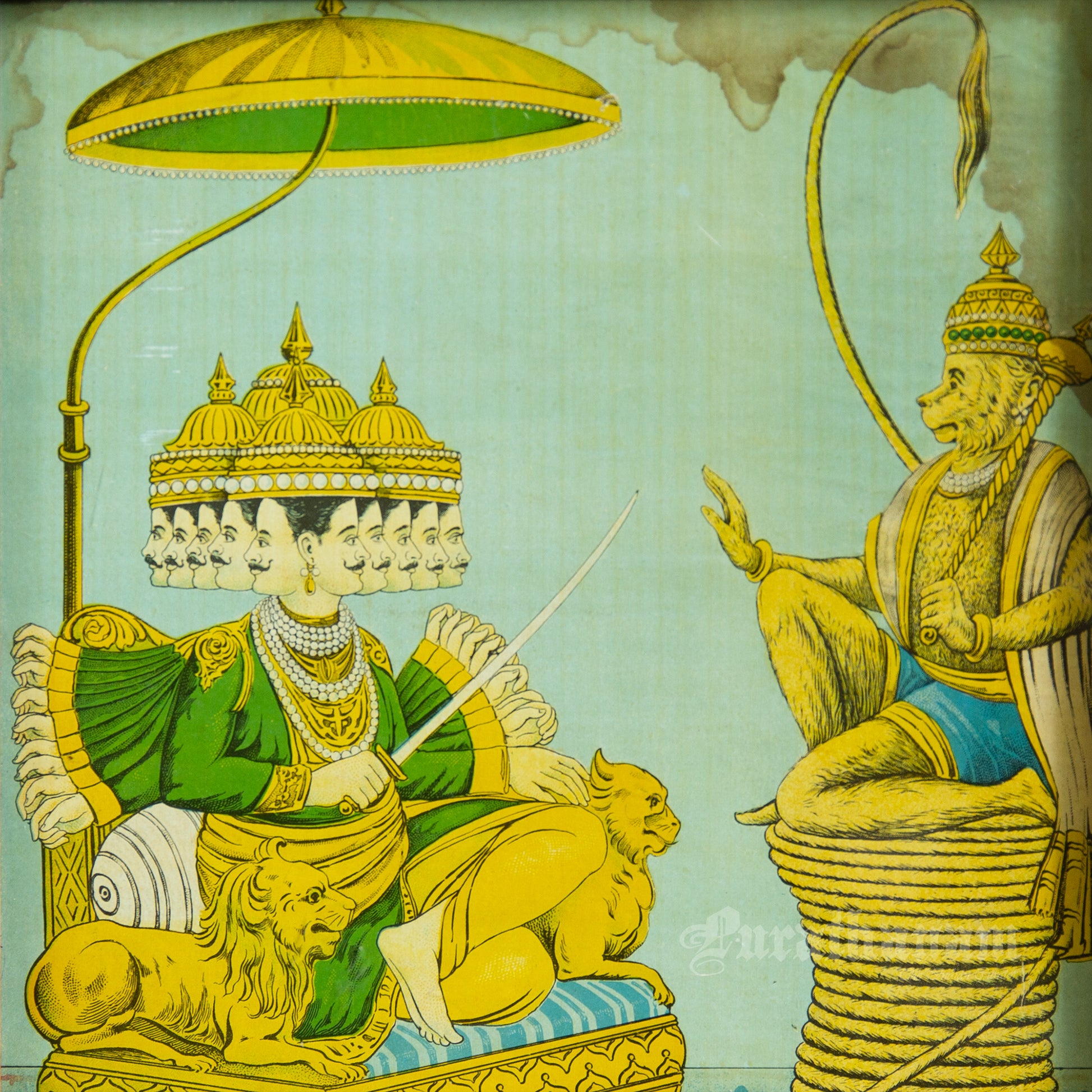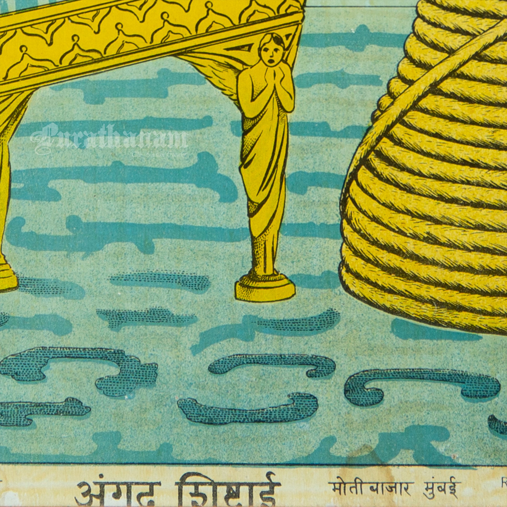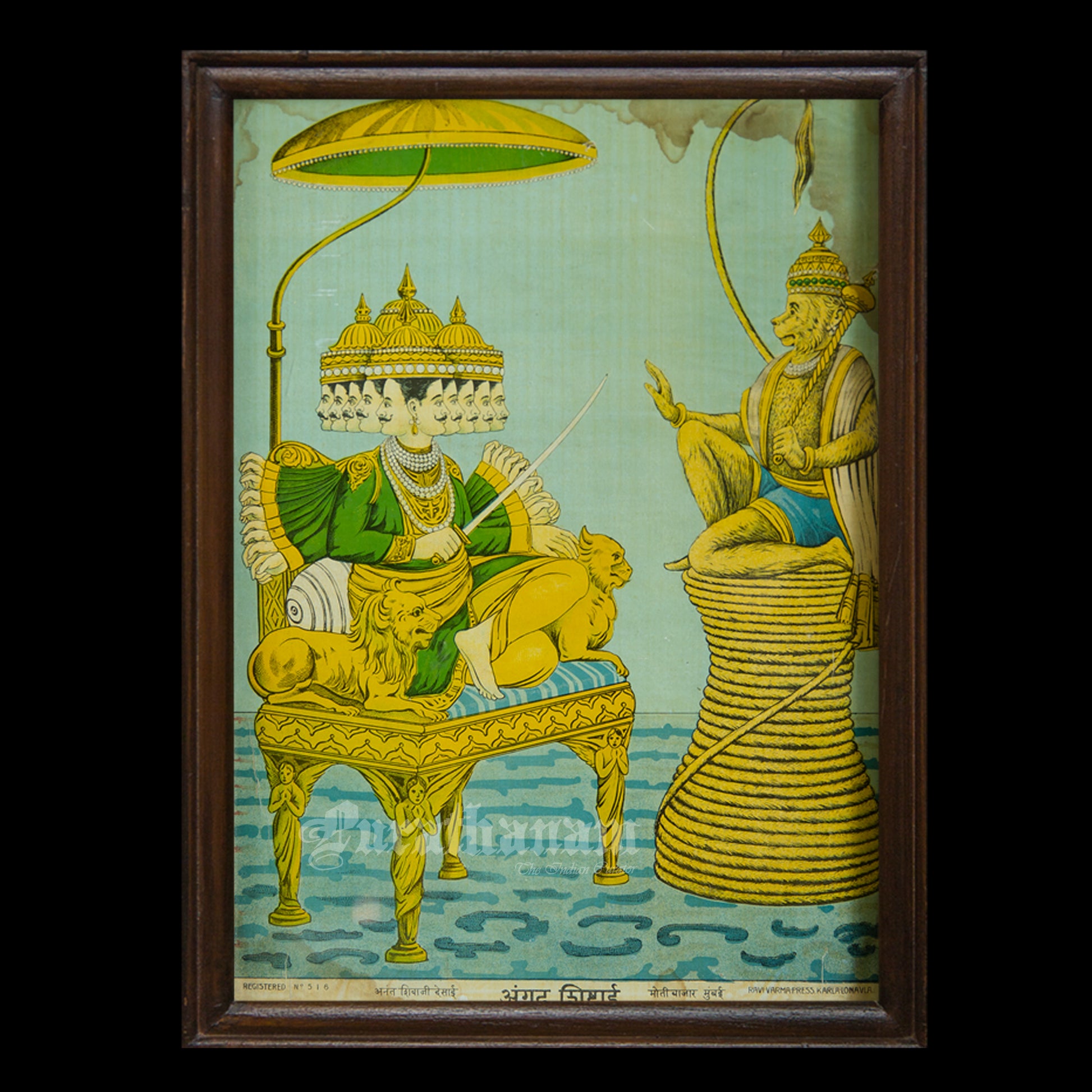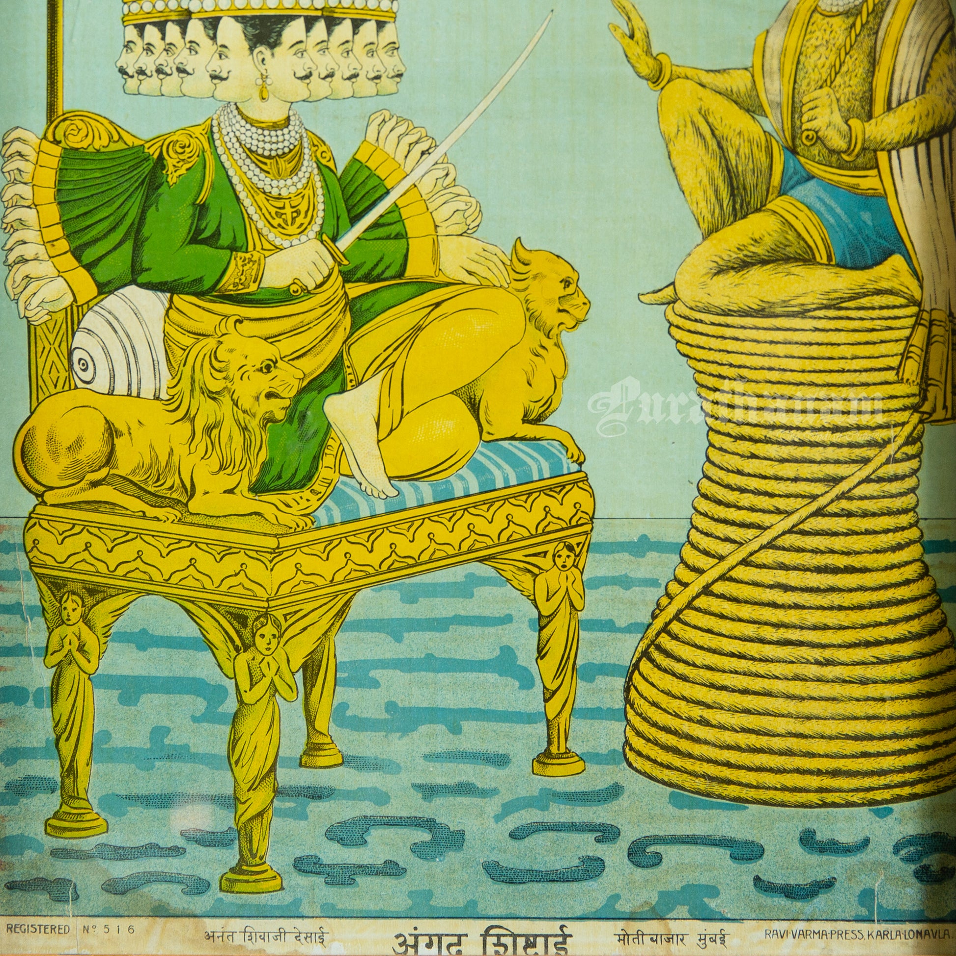This is an oleograph print from 1920s of Angad Shishtai by Ravi Varma an Indian who achieved recognition for his depiction of scenes from the epics of the Mahabharata and Ramayana.
