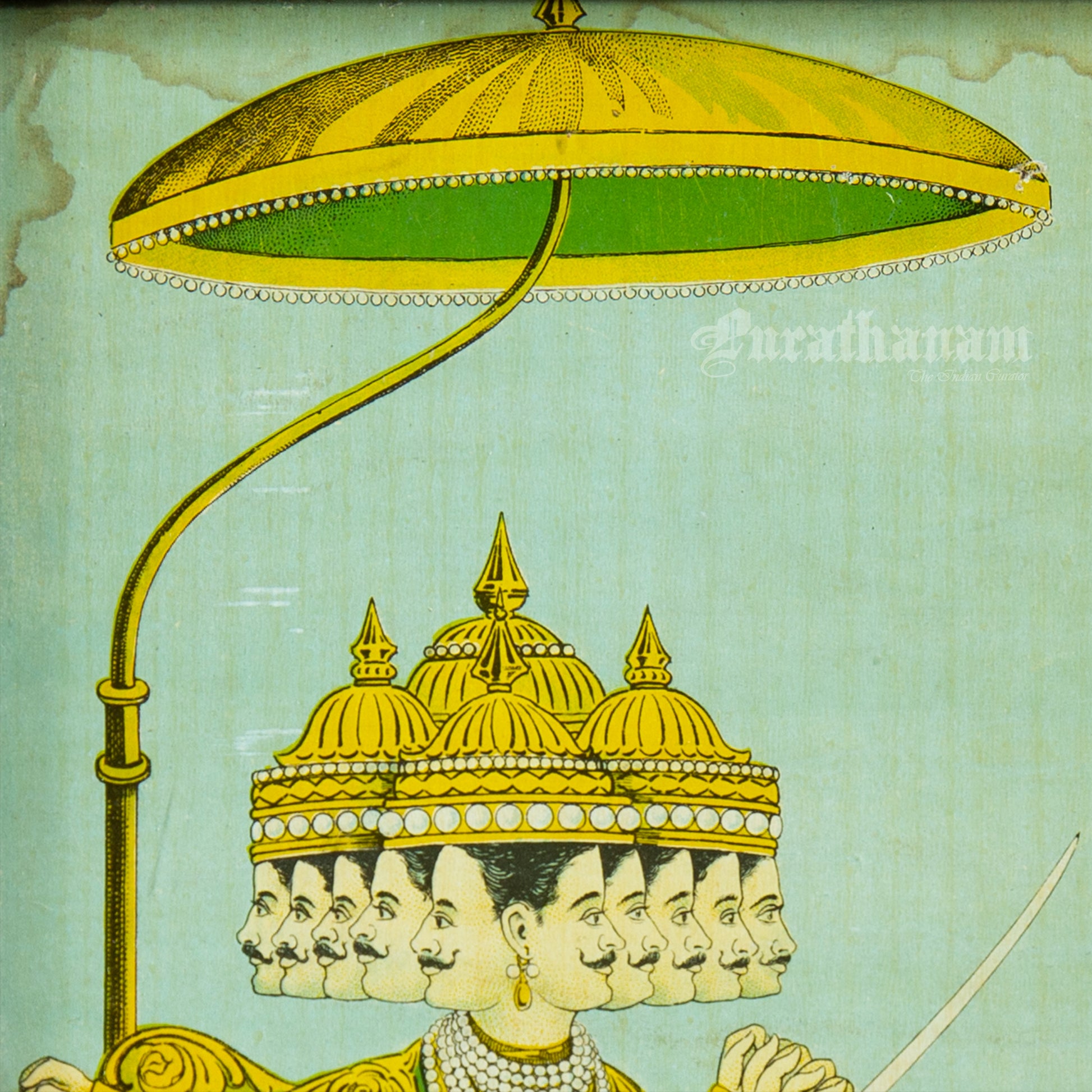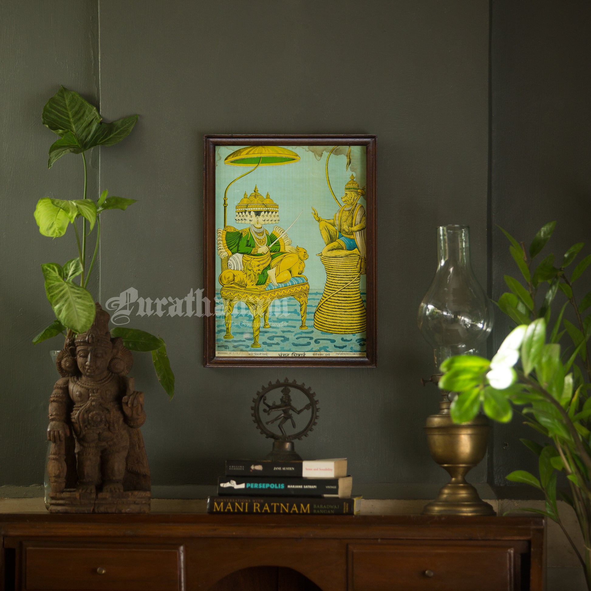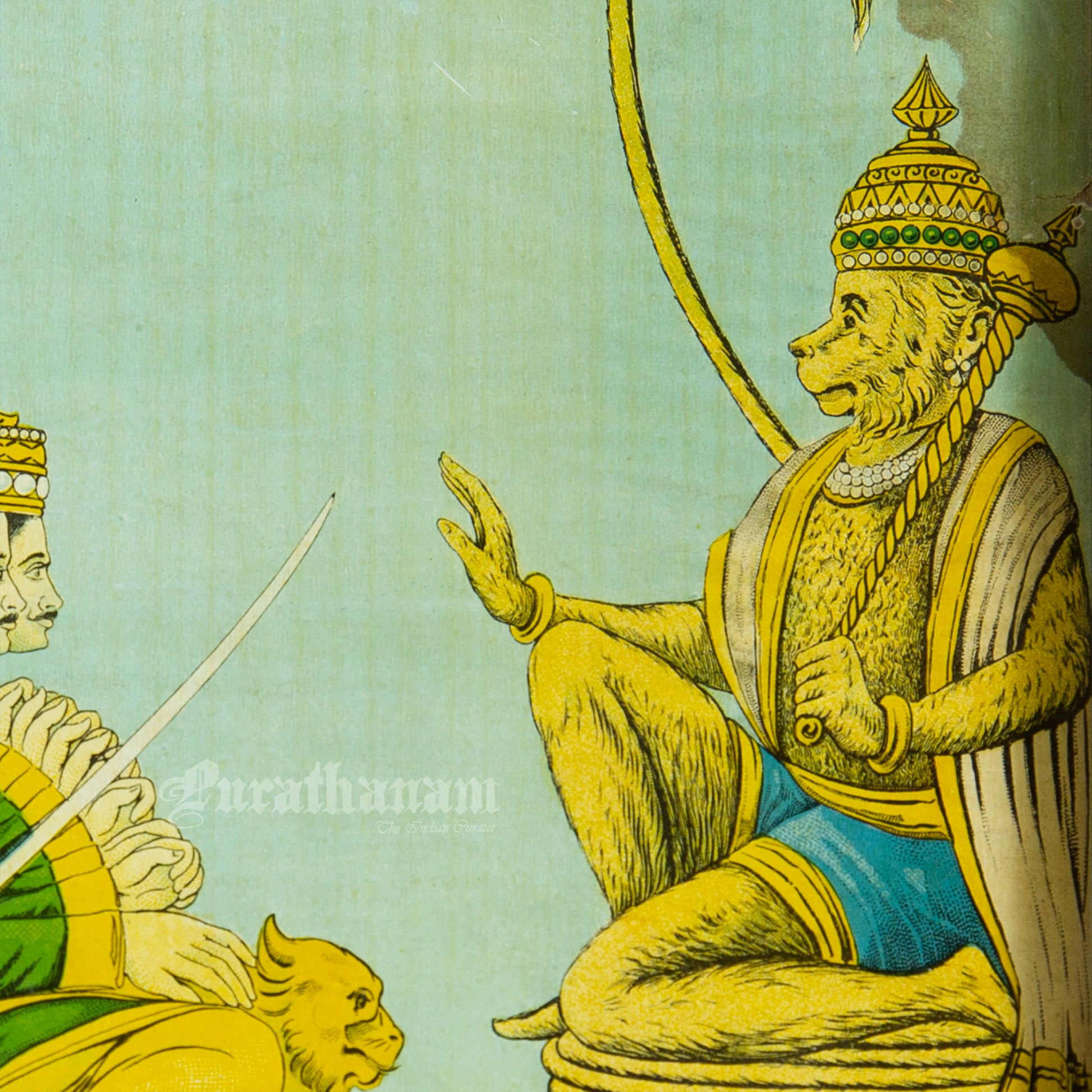 This is an oleograph print from 1920s of Angad Shishtai by Ravi Varma an Indian who achieved recognition for his depiction of scenes from the epics of the Mahabharata and Ramayana.