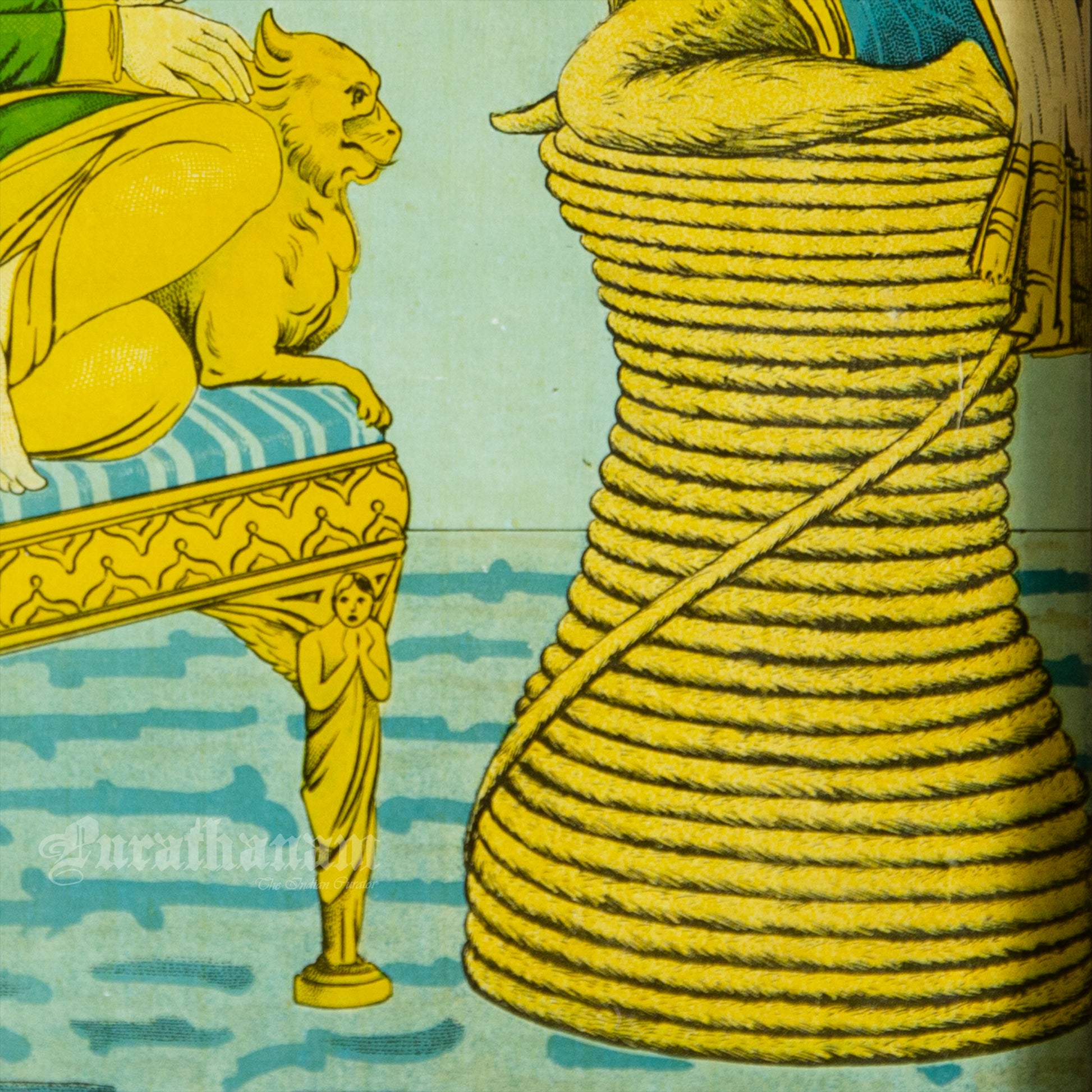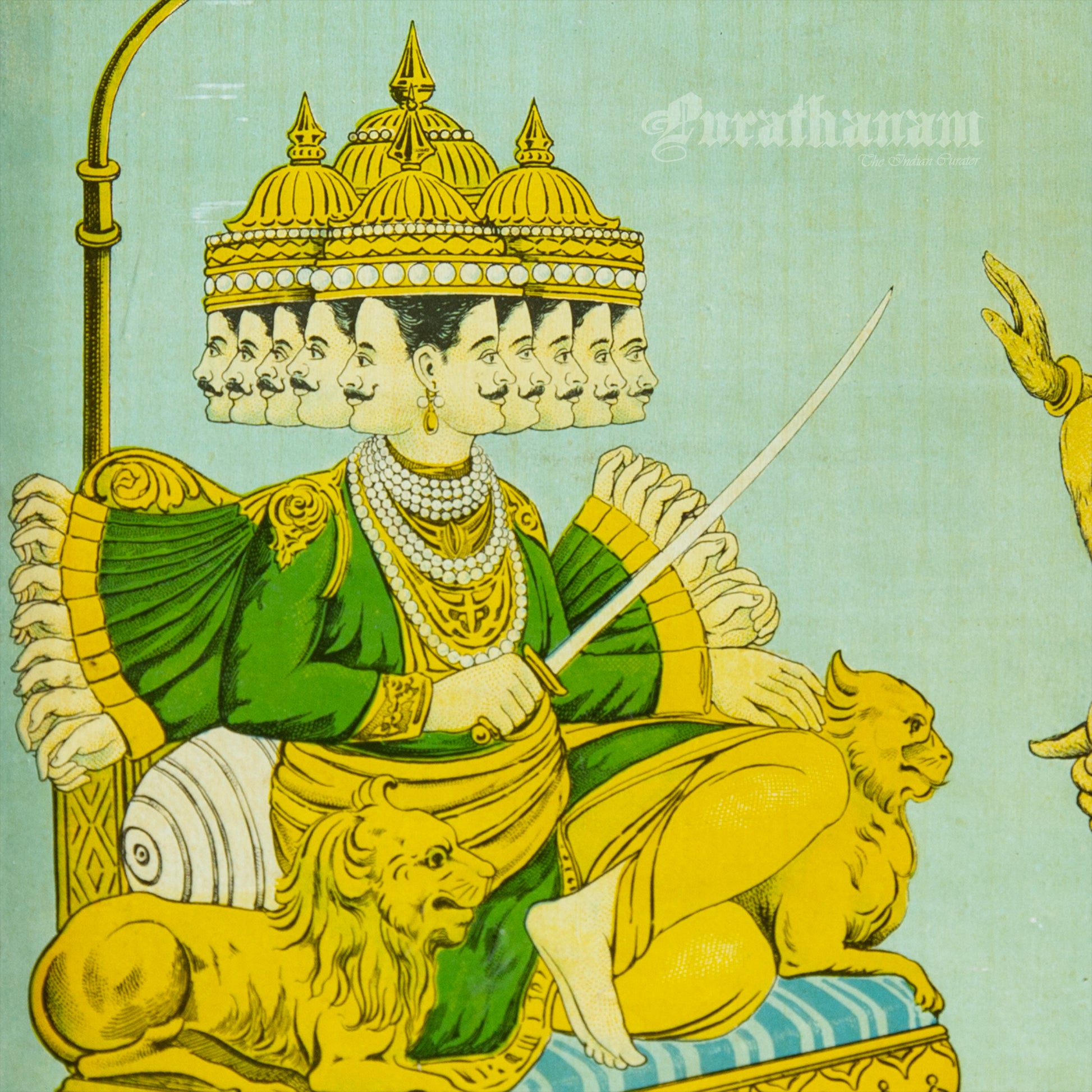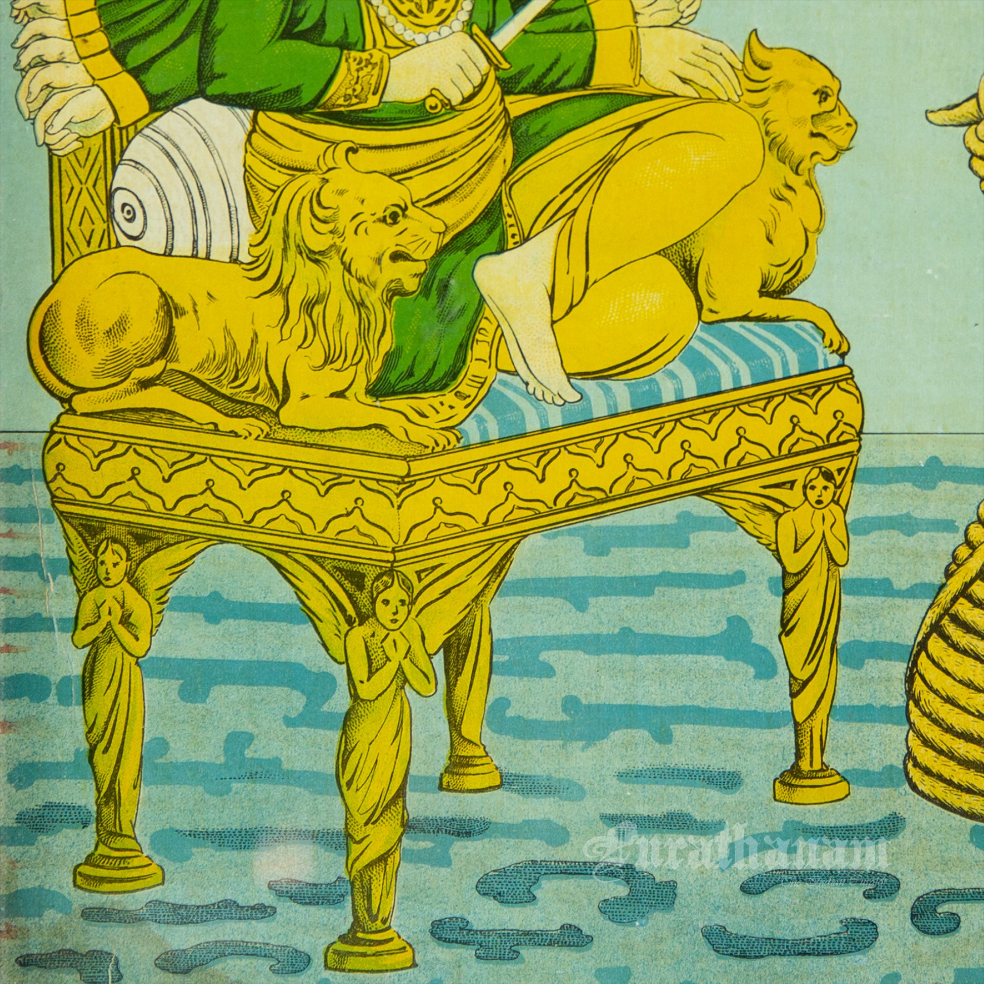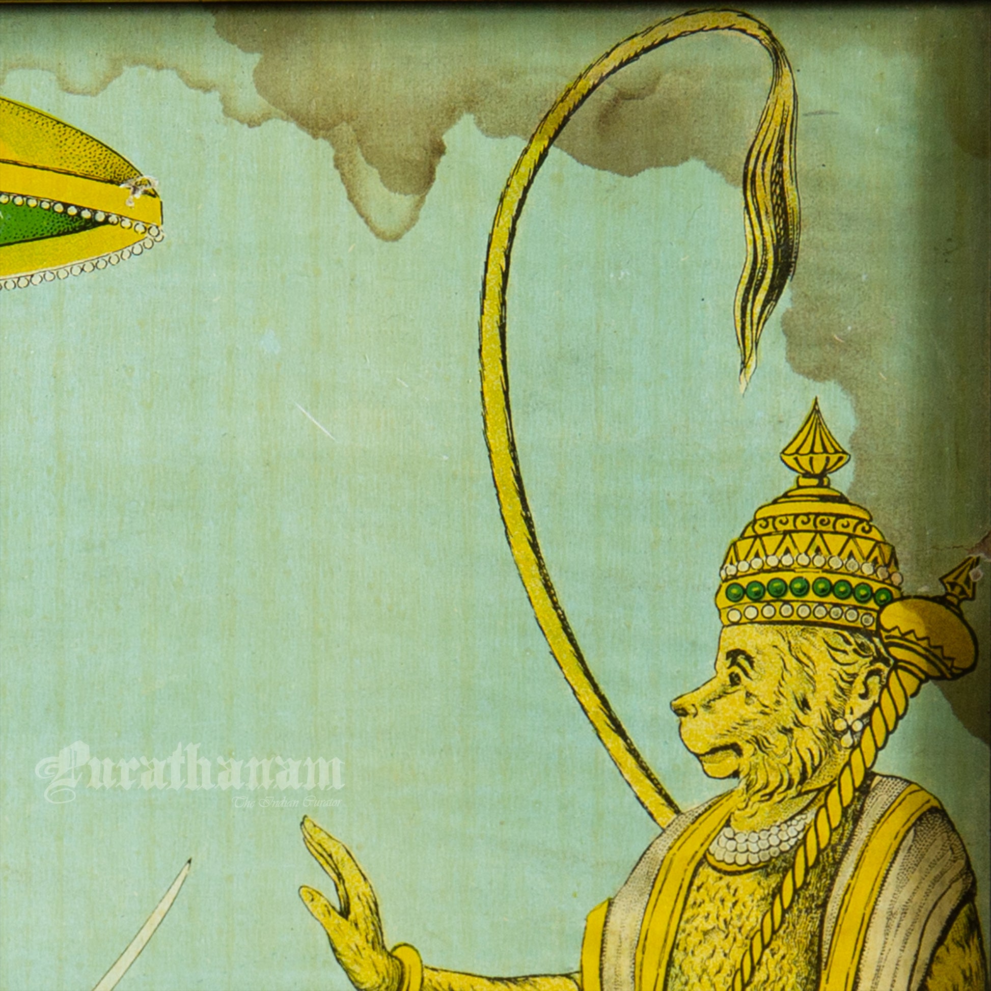 This is an oleograph print from 1920s of Angad Shishtai by Ravi Varma an Indian who achieved recognition for his depiction of scenes from the epics of the Mahabharata and Ramayana.