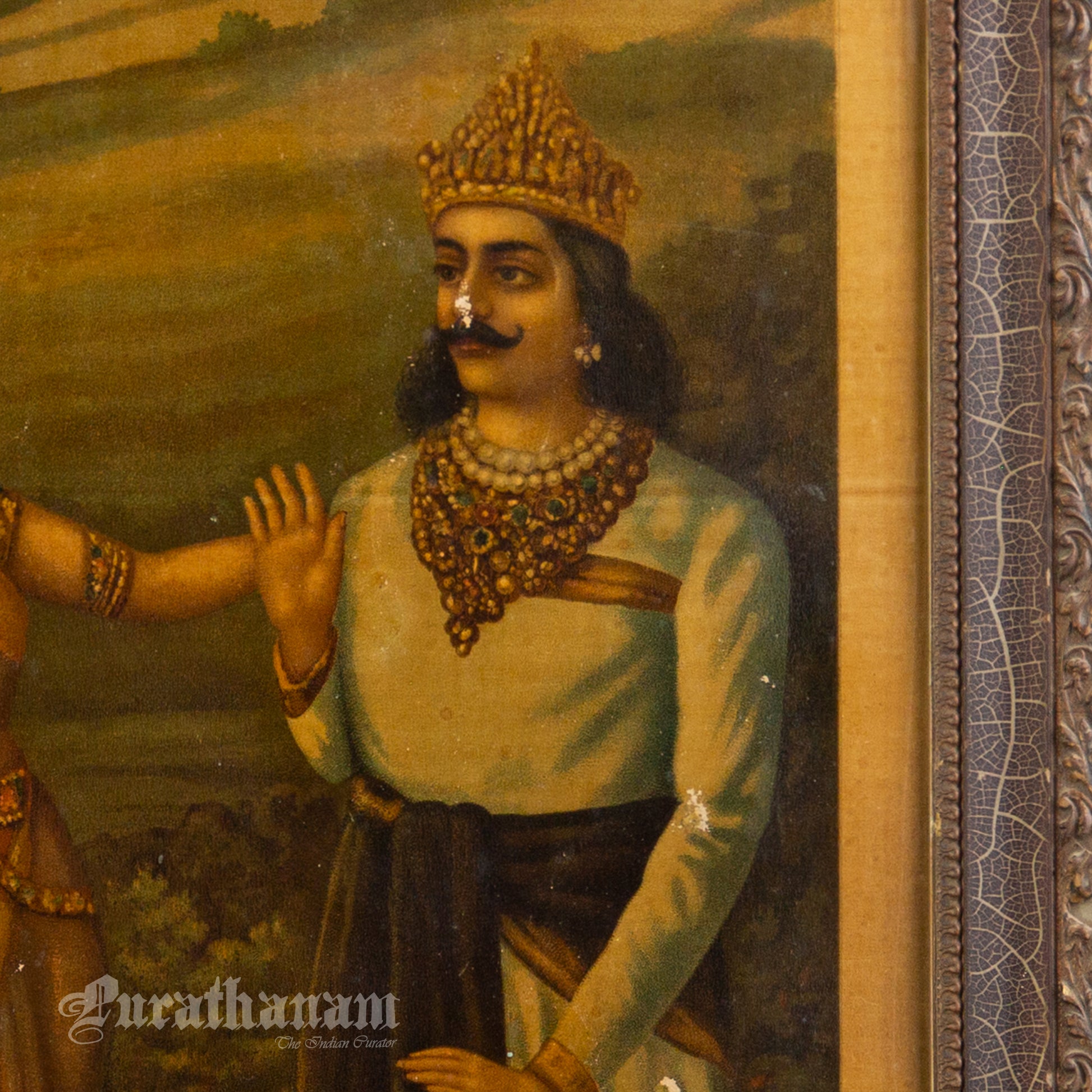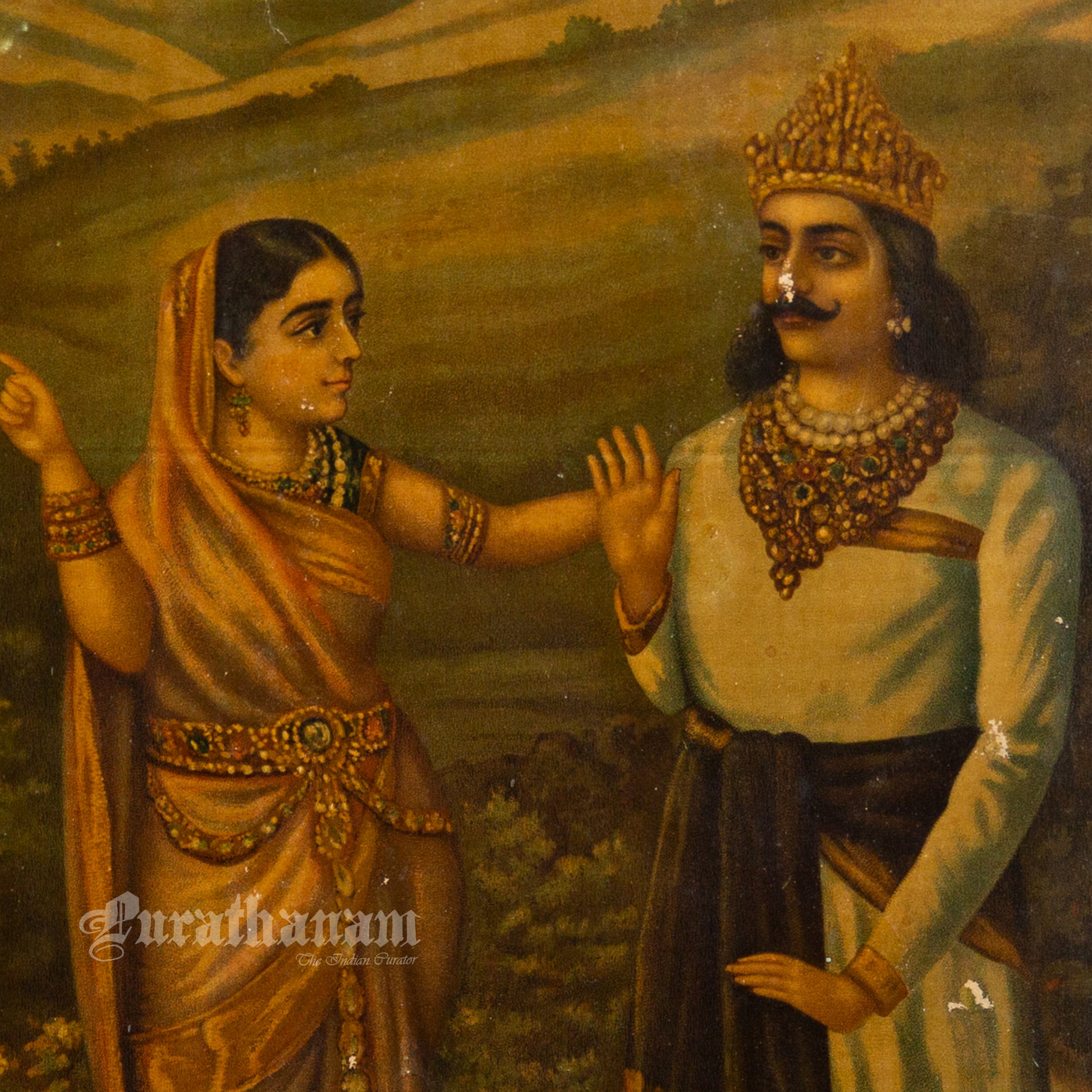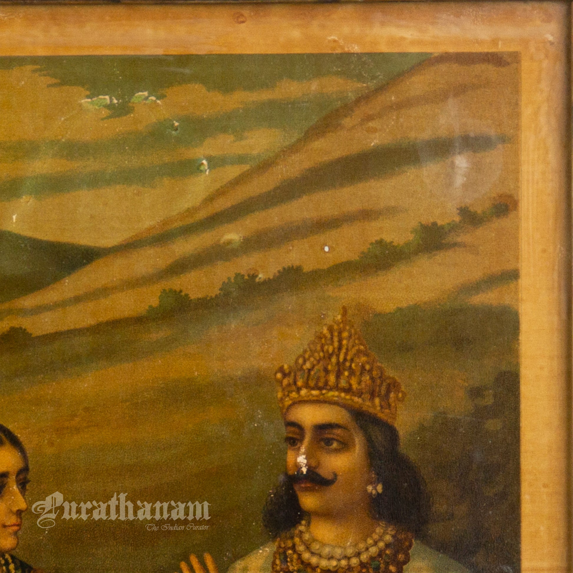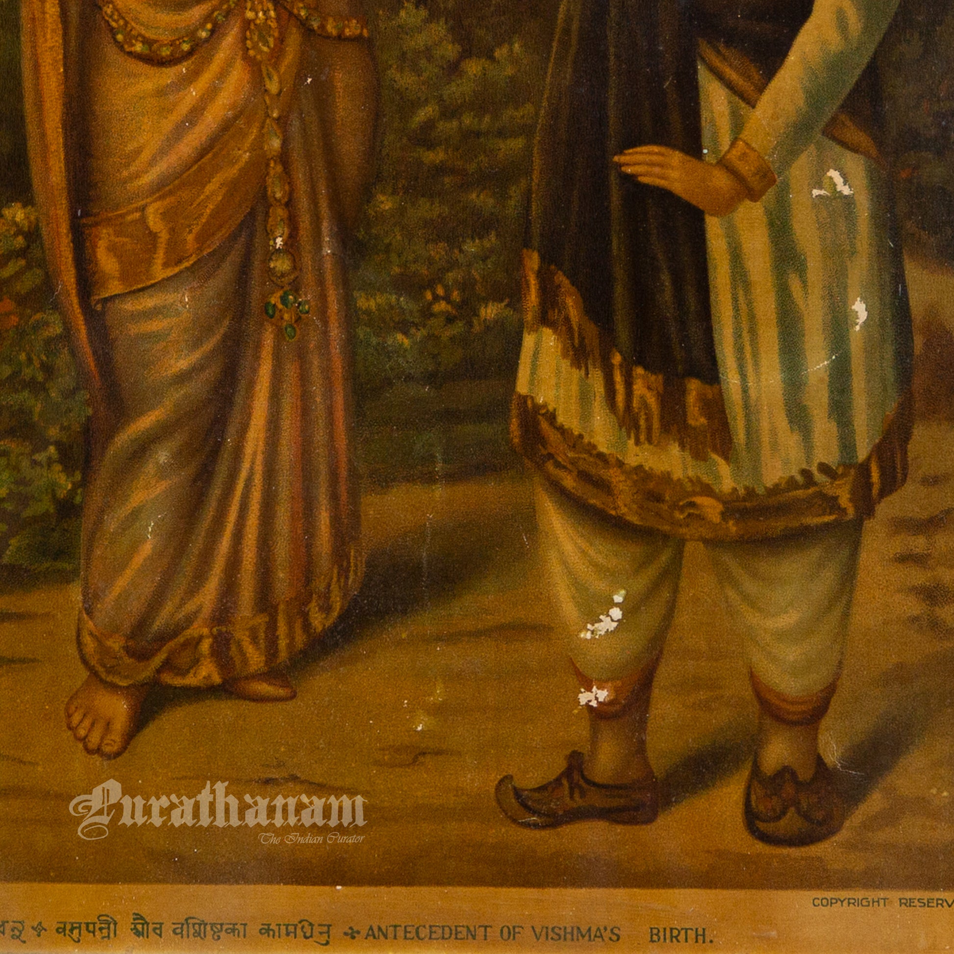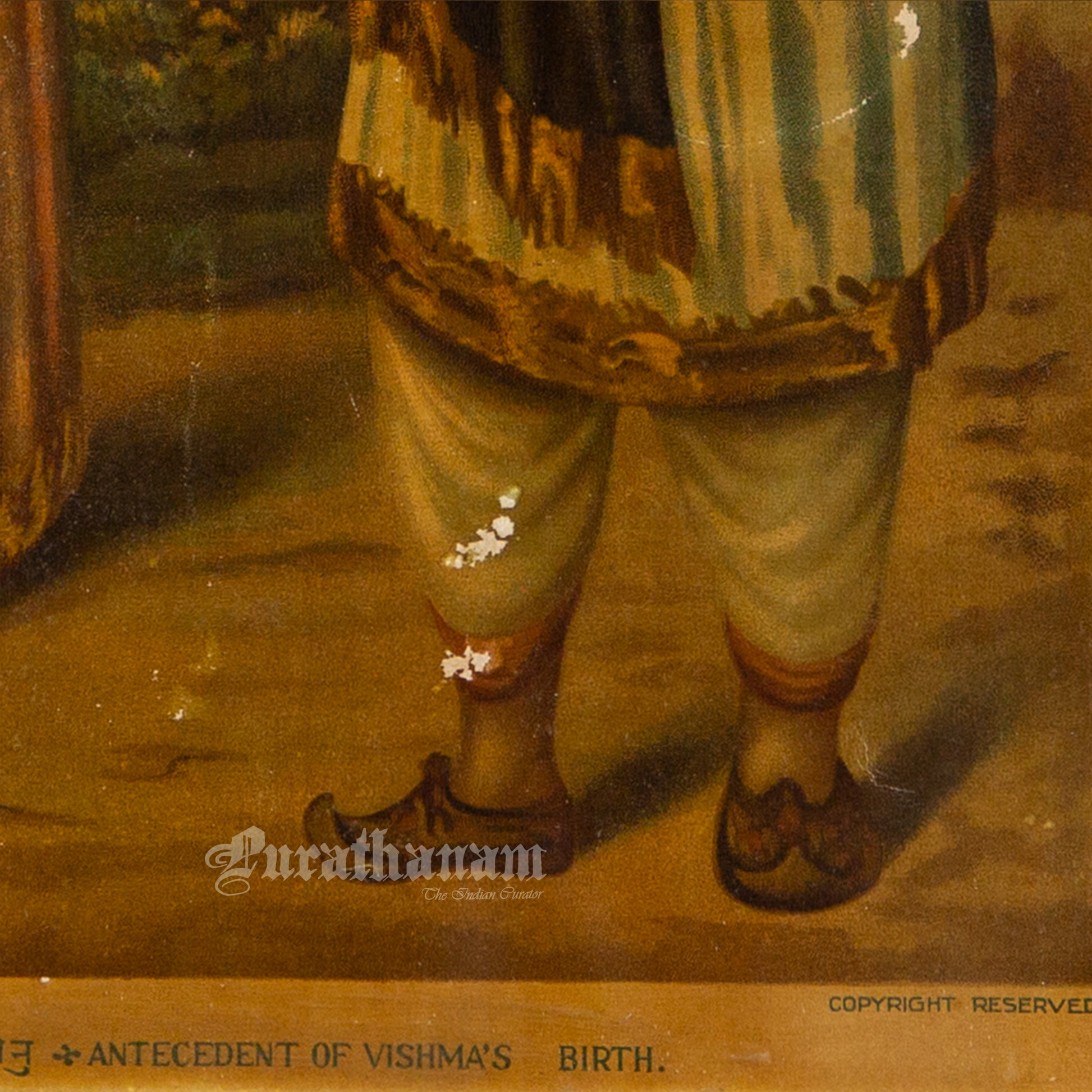In 1879, Banerjee’s work was recognized at an exhibition organized by the Society for the Promotion of Industrial Art, where he won a prize. This recognition marked an important milestone in his career and helped establish his reputation as a talented artist. Banerjee developed a unique artistic style that became highly influential. His works were widely reproduced, with most of these prints produced in Germany, further increasing his popularity. This oleograph print of “Antecedent of Bishma’s Birth“ was also printed in Germany in early 1900s.