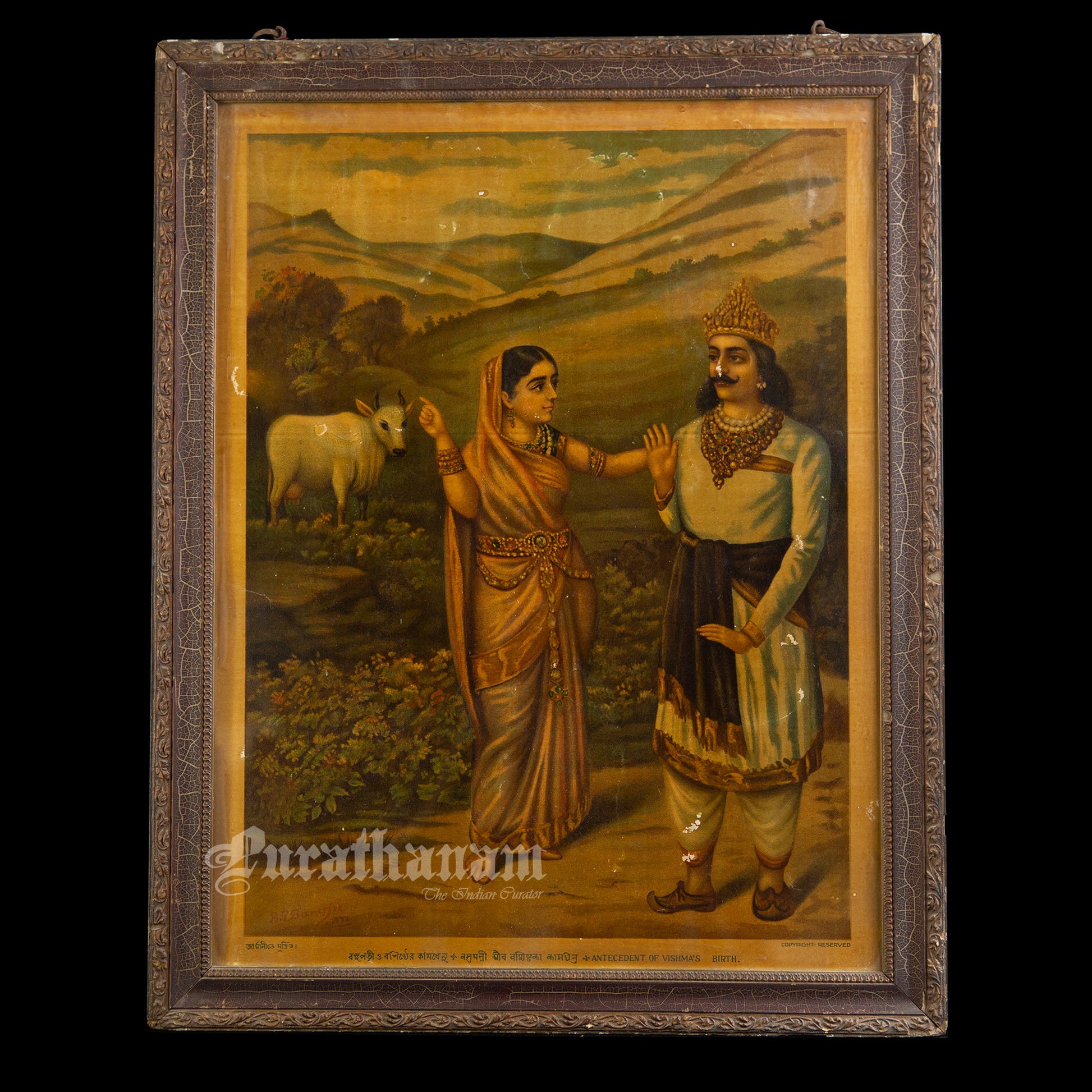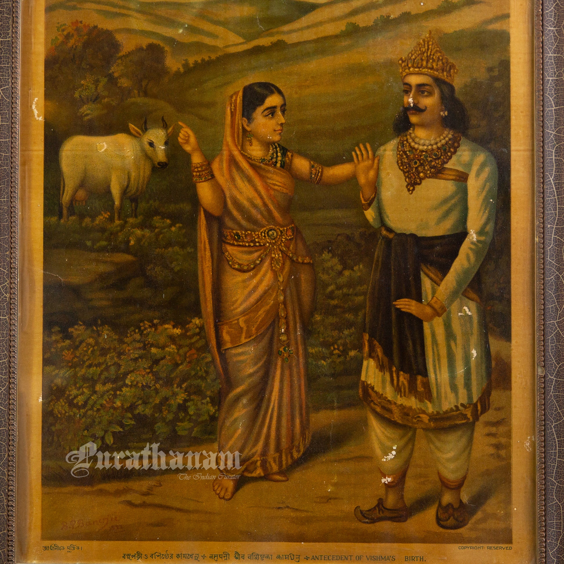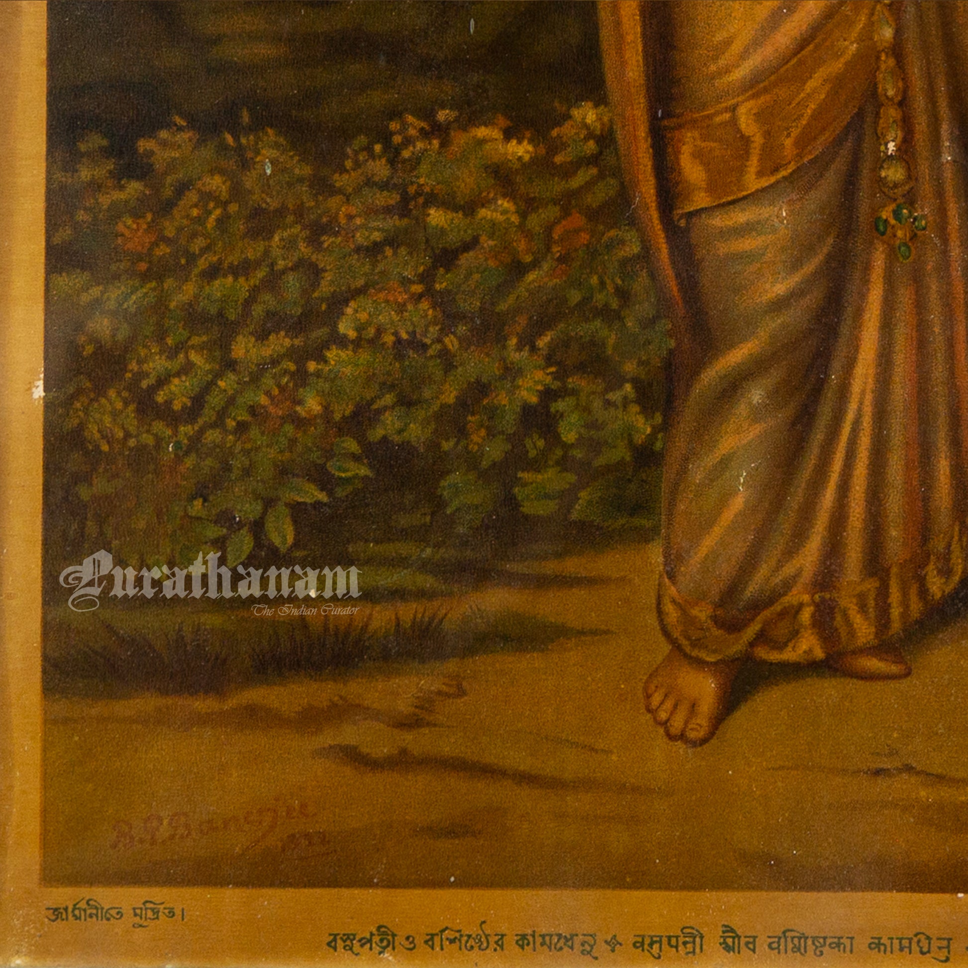 This is an oleograph print of “Basupatni and Vashista's kamdhenu” by B.P. Banerjee from early 1900s.