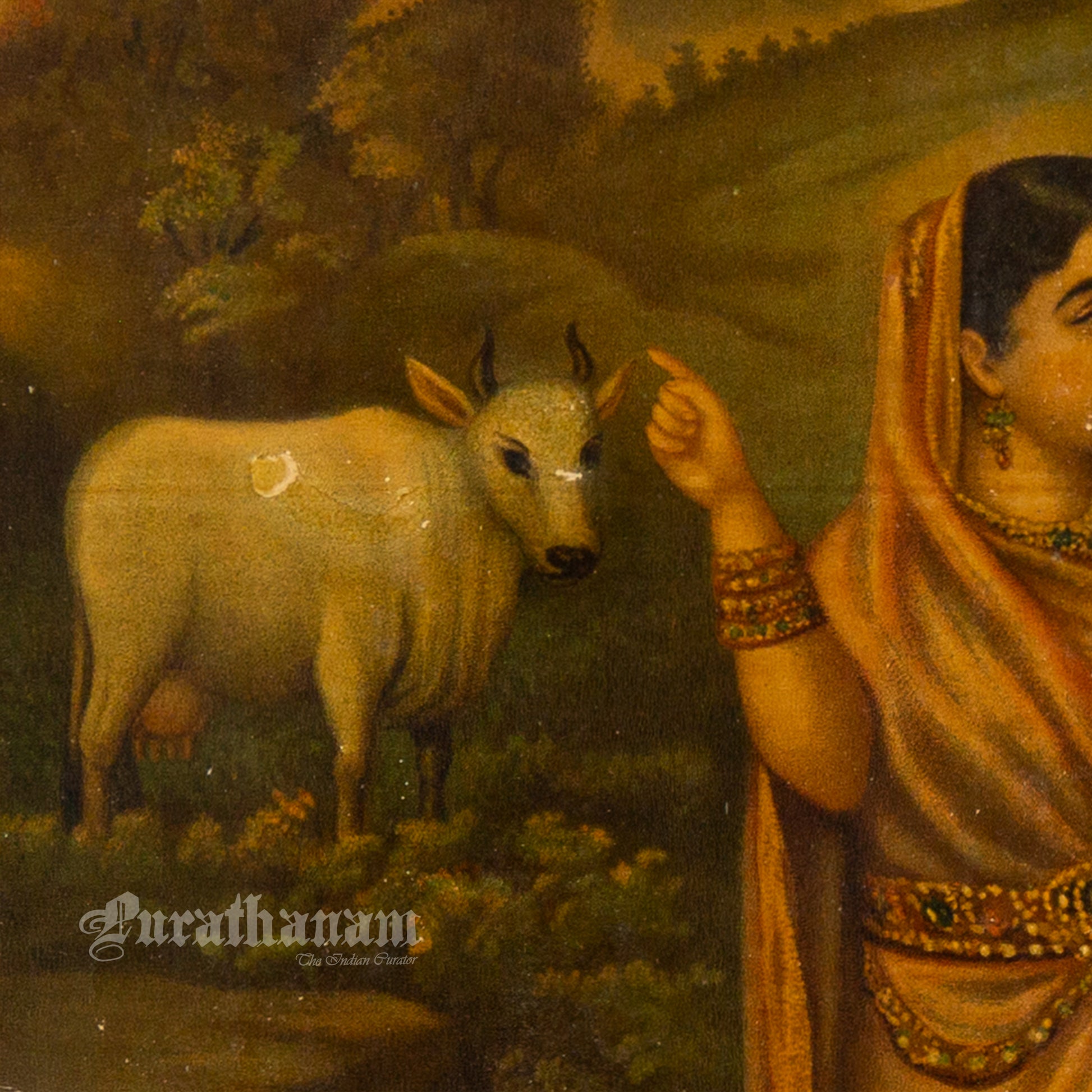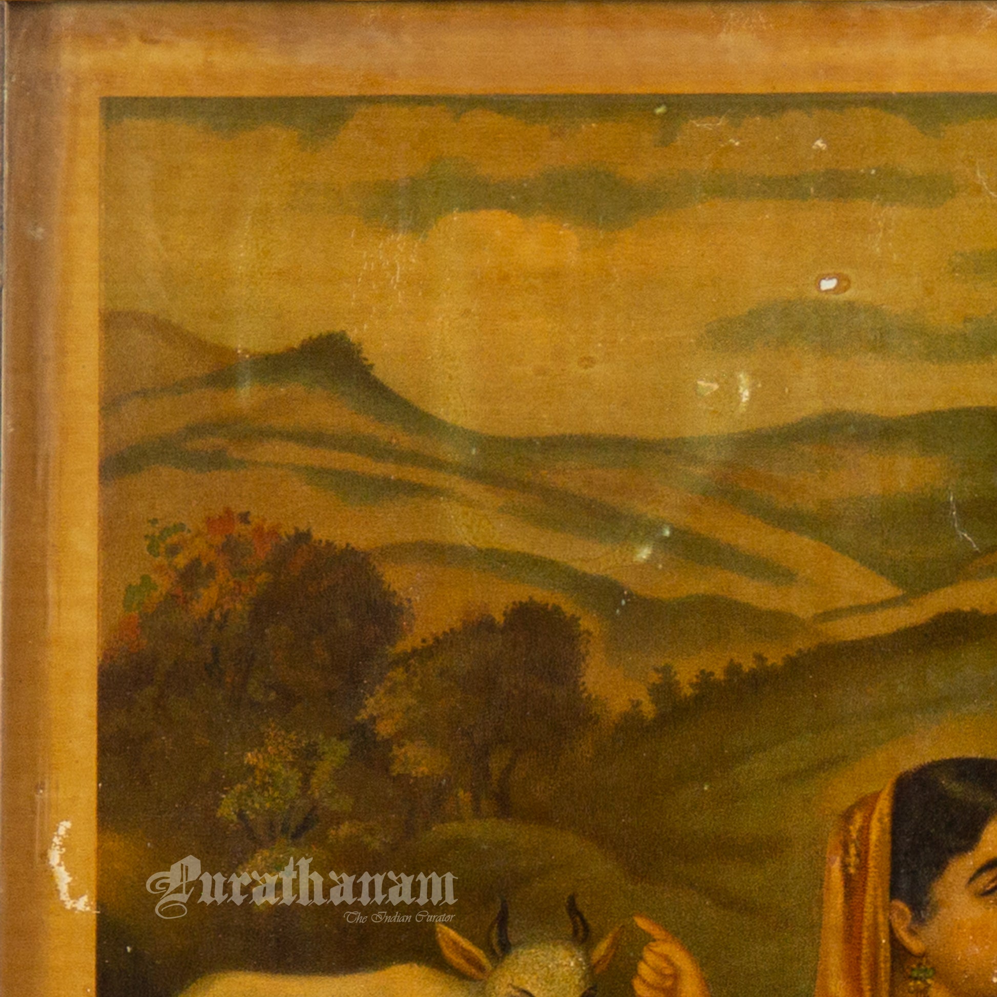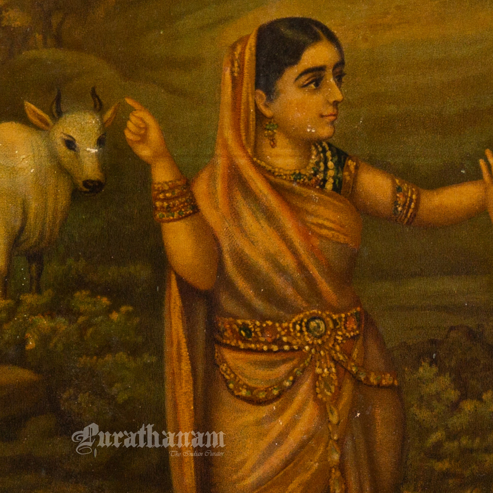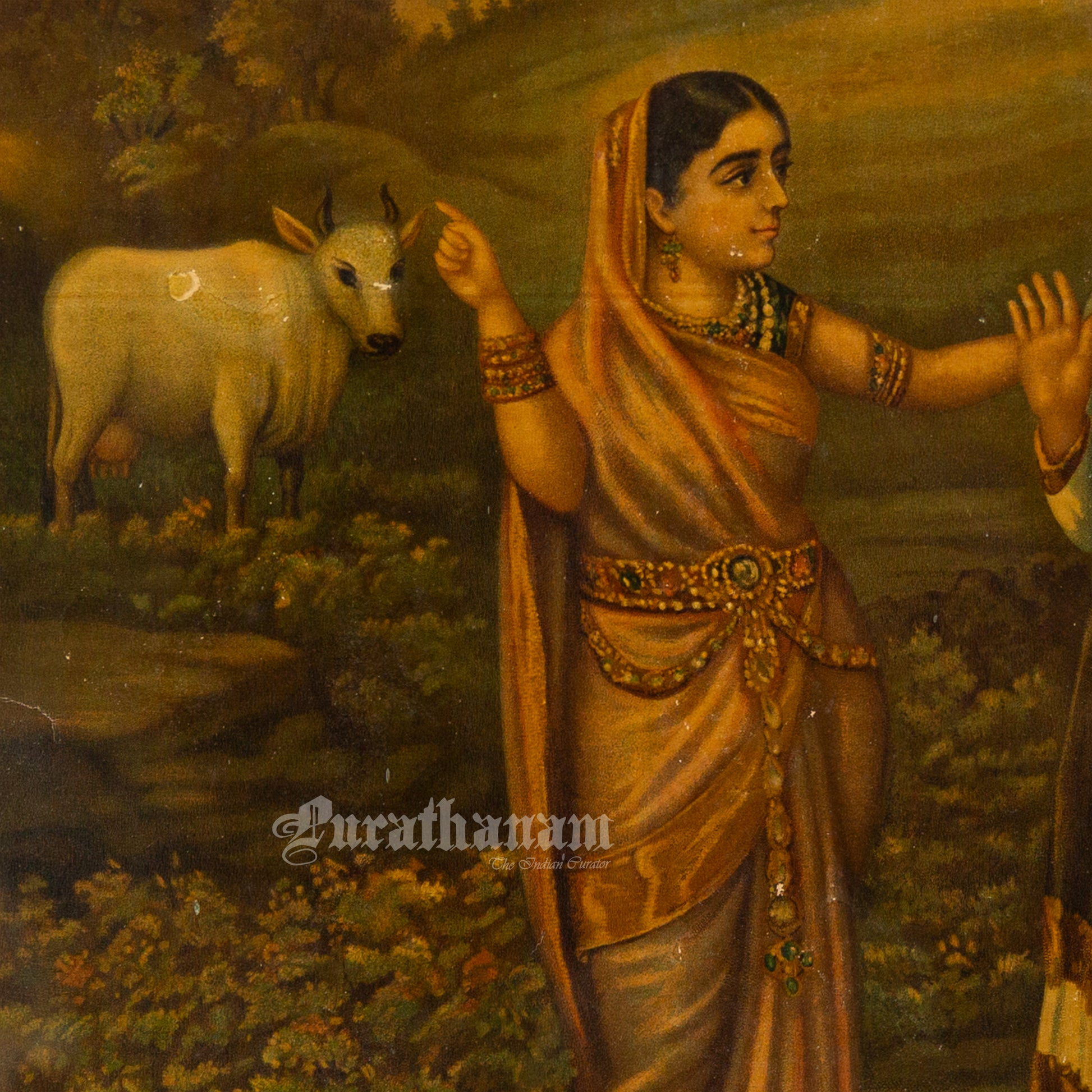 This is an oleograph print of “Basupatni and Vashista's kamdhenu” by B.P. Banerjee from early 1900s.