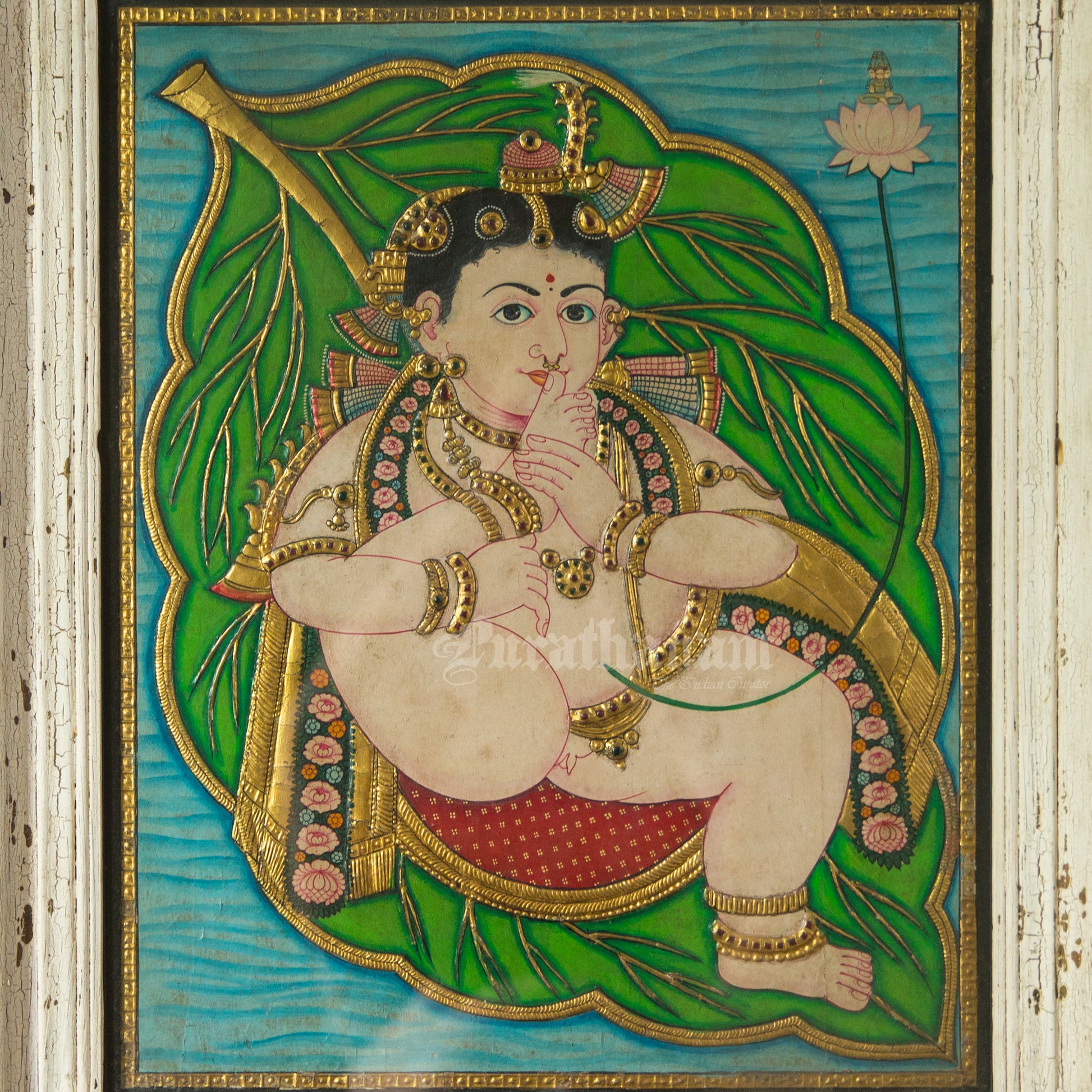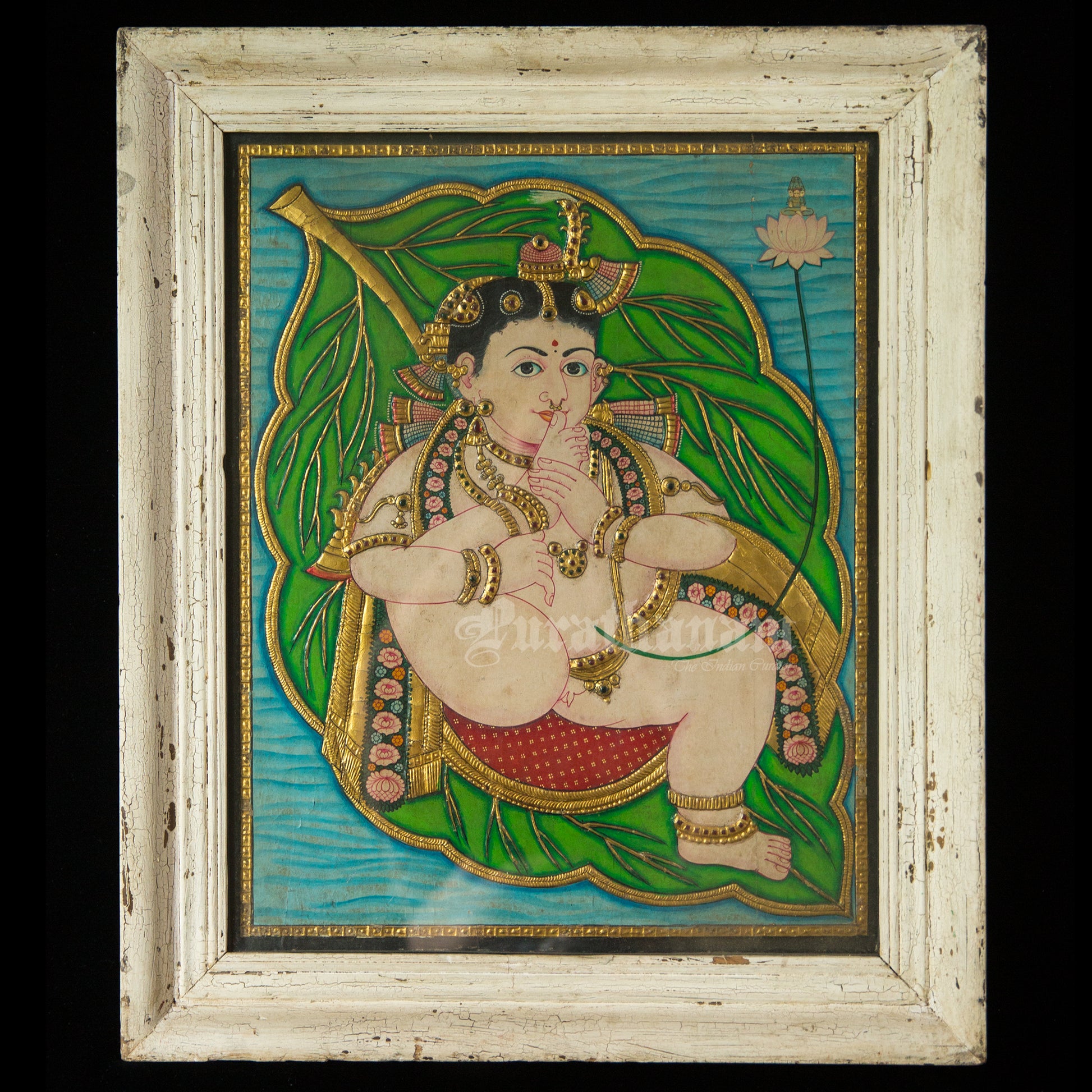 Here is an amazing Tanjore painting of Baby Krishna floating on the banyan leaf sucking his lotus like feet in the reclining position. Here in the painting, baby Krishna is represented naked except for his jewels. It is said that only the sage Markandeya has witnessed Lord Krishna as a toe-sucking infant lying on a banyan leaf, floating in the vastness of the primordial cosmic ocean. The white frame here enhances the beauty of the Tanjore painting.