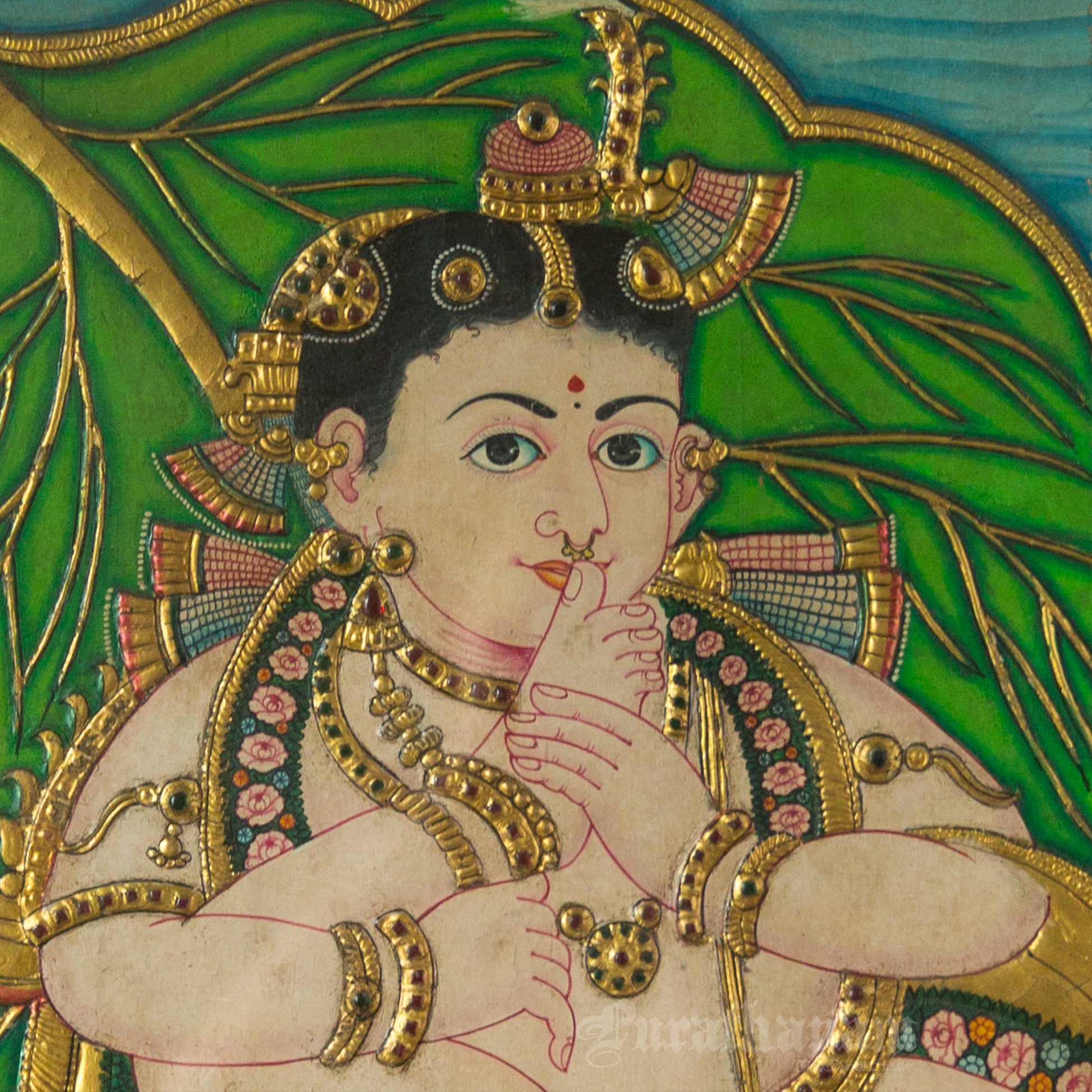 - Nose Rings Came Later: The nose rings on deities seen in Tanjore paintings are relatively new. Tanjore painting artisans say the earliest paintings had no nose rings on deities, and this is one way to judge the age of a painting. Nose rings are not seen in Chola bronzes or in early Pandya stone idols. It’s understood that there were no nose rings on Devis until the Chozha period. Later, we can see the influence of the Mughal period in Tanjore paintings.
