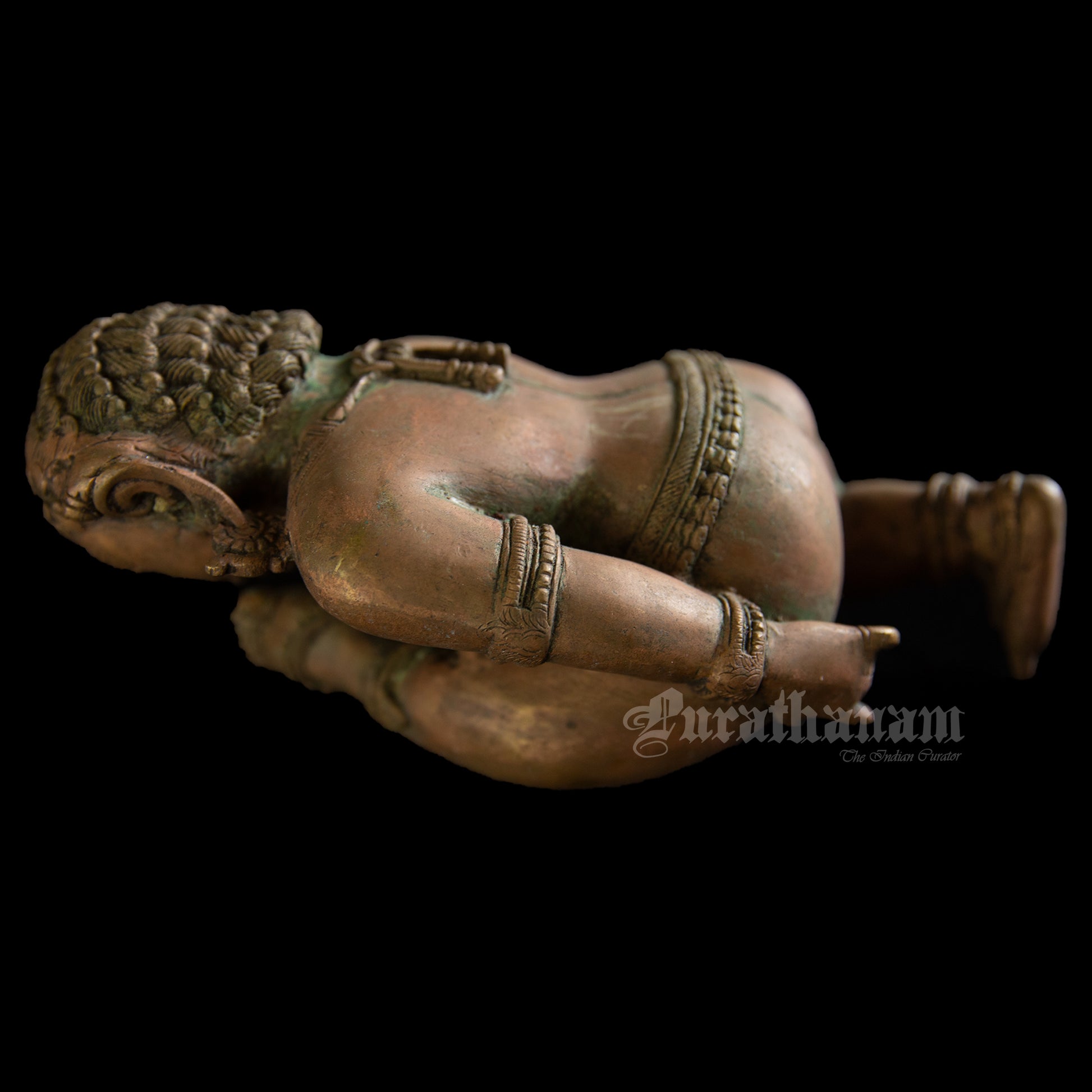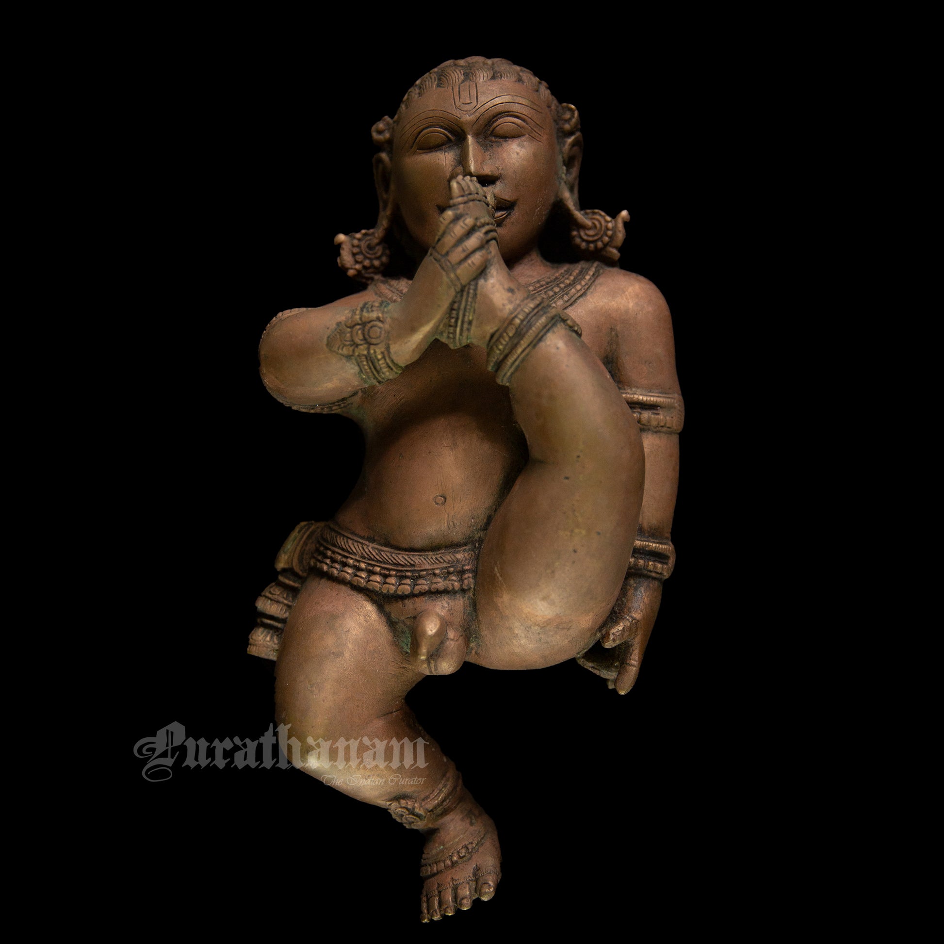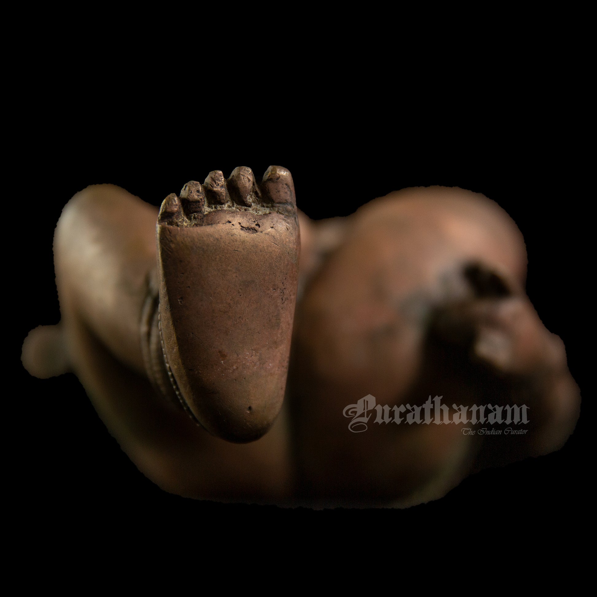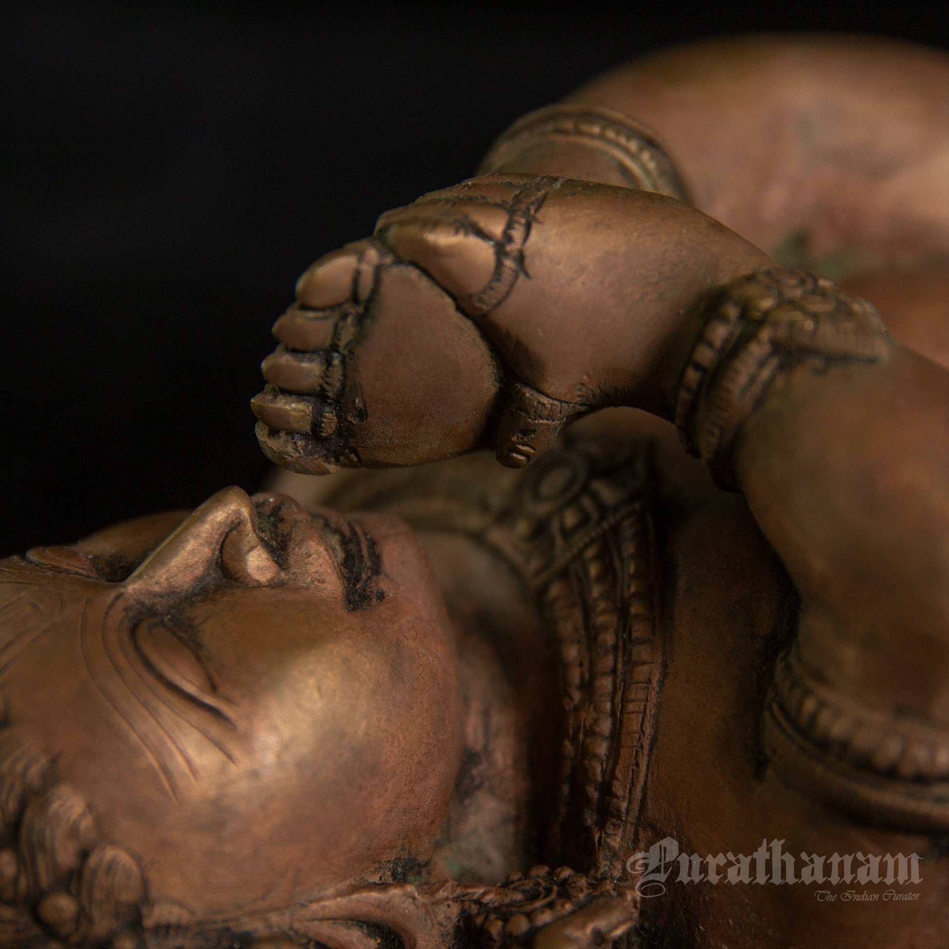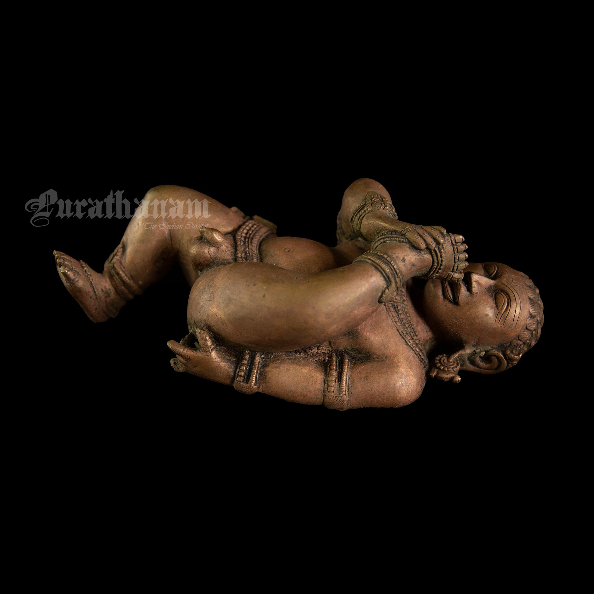 Here we have a unique vintage sculpture of Baby Krishna who is lying on his back, biting his toe just like bal Krishna on the banyan leaf. It is made of brass and perfect to decorate your beautiful space.