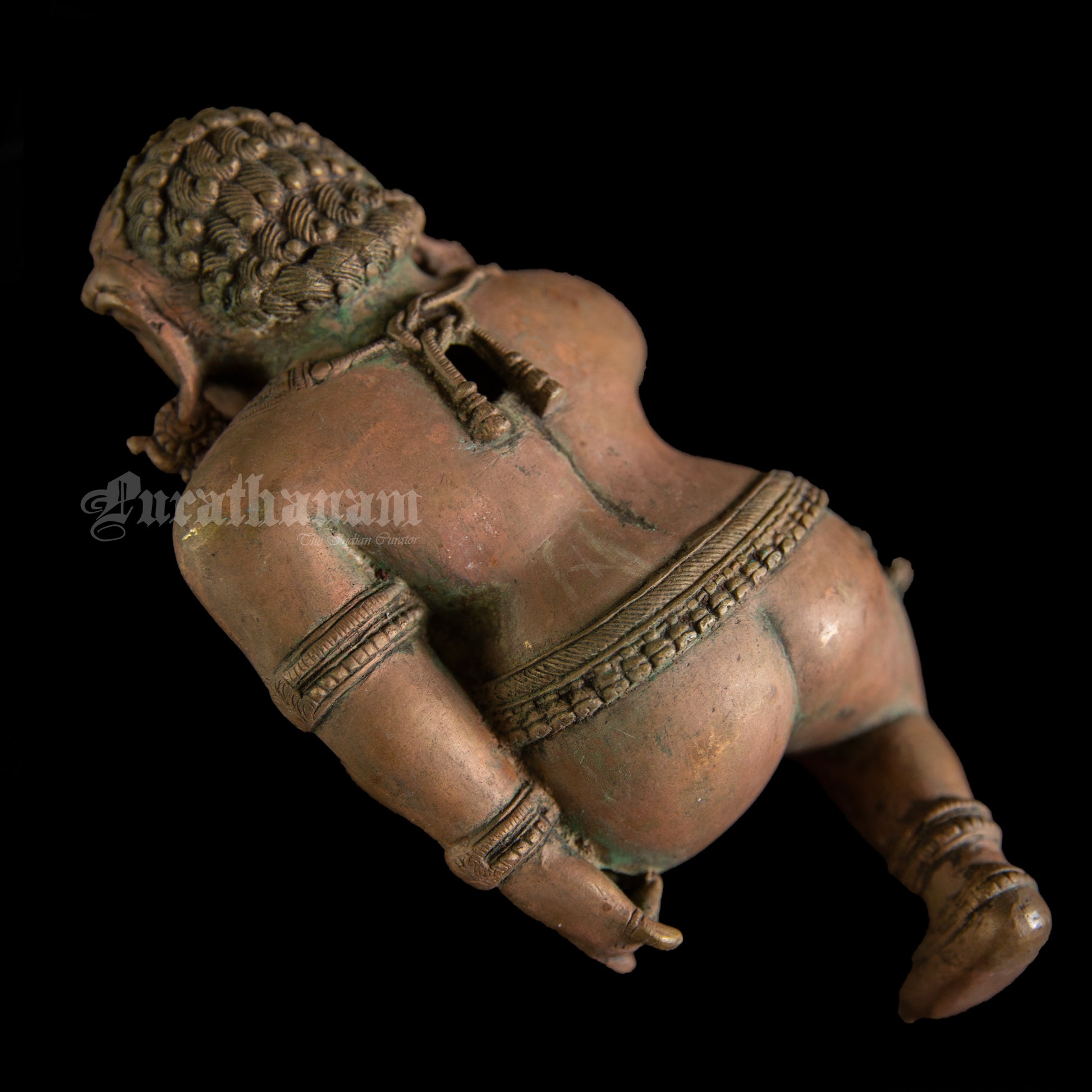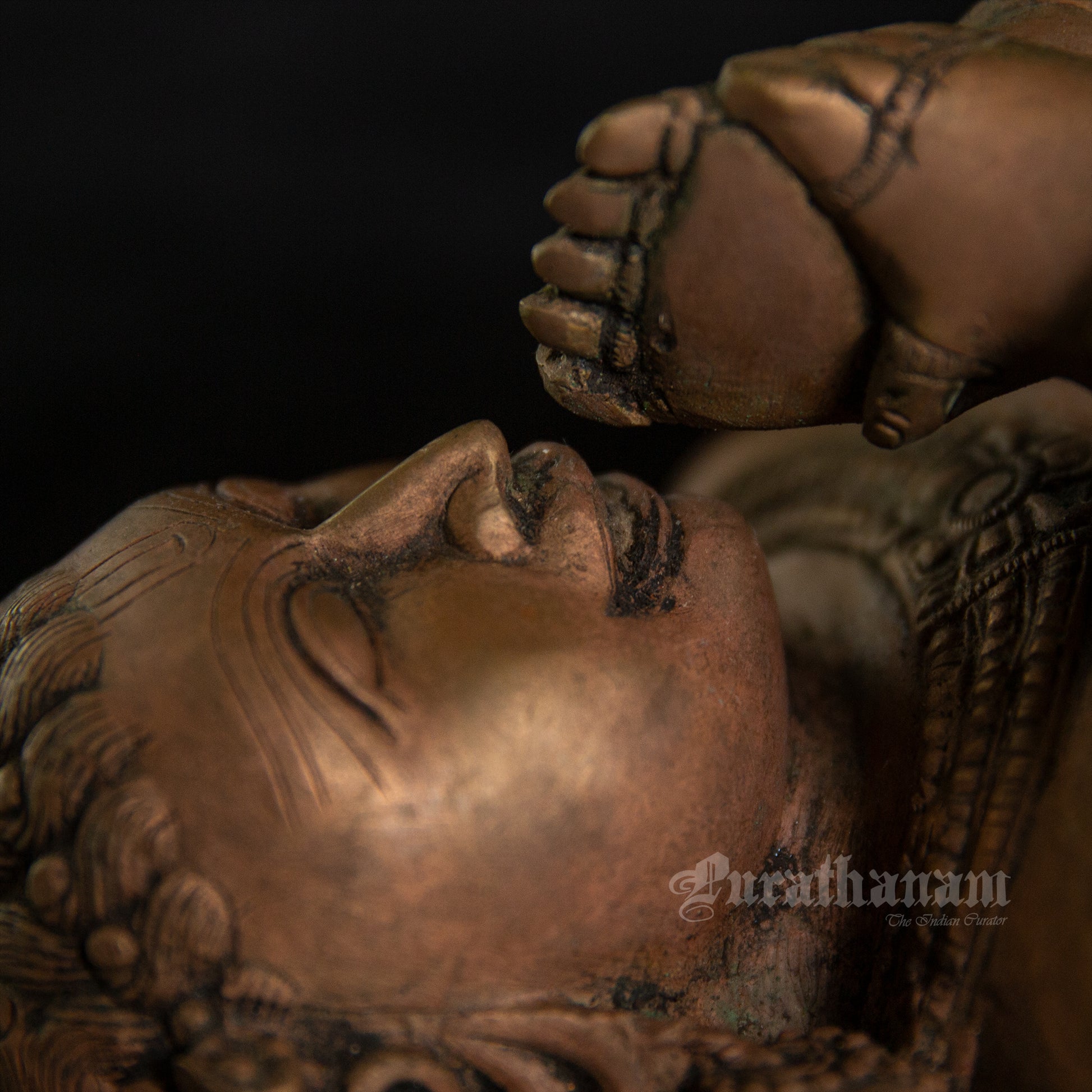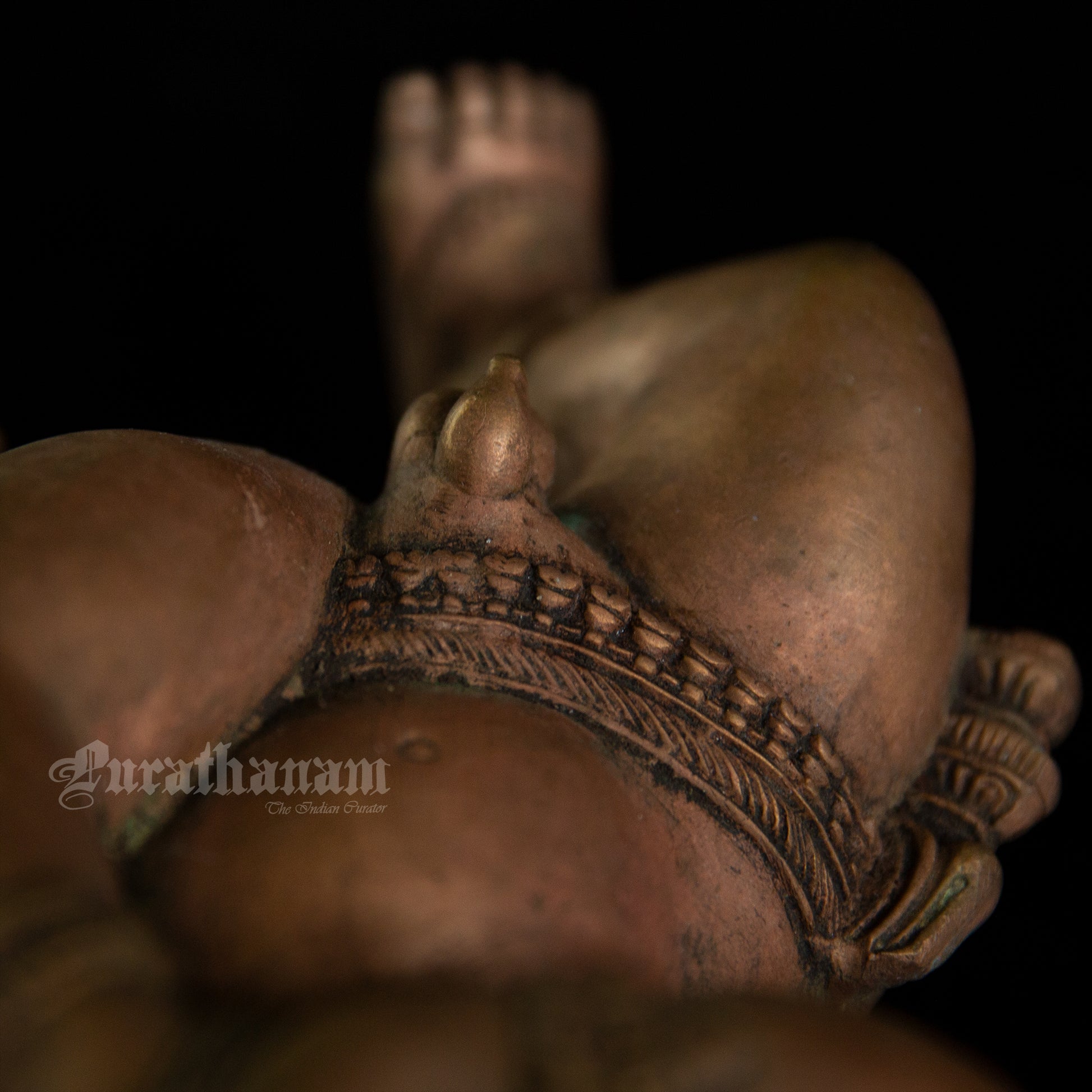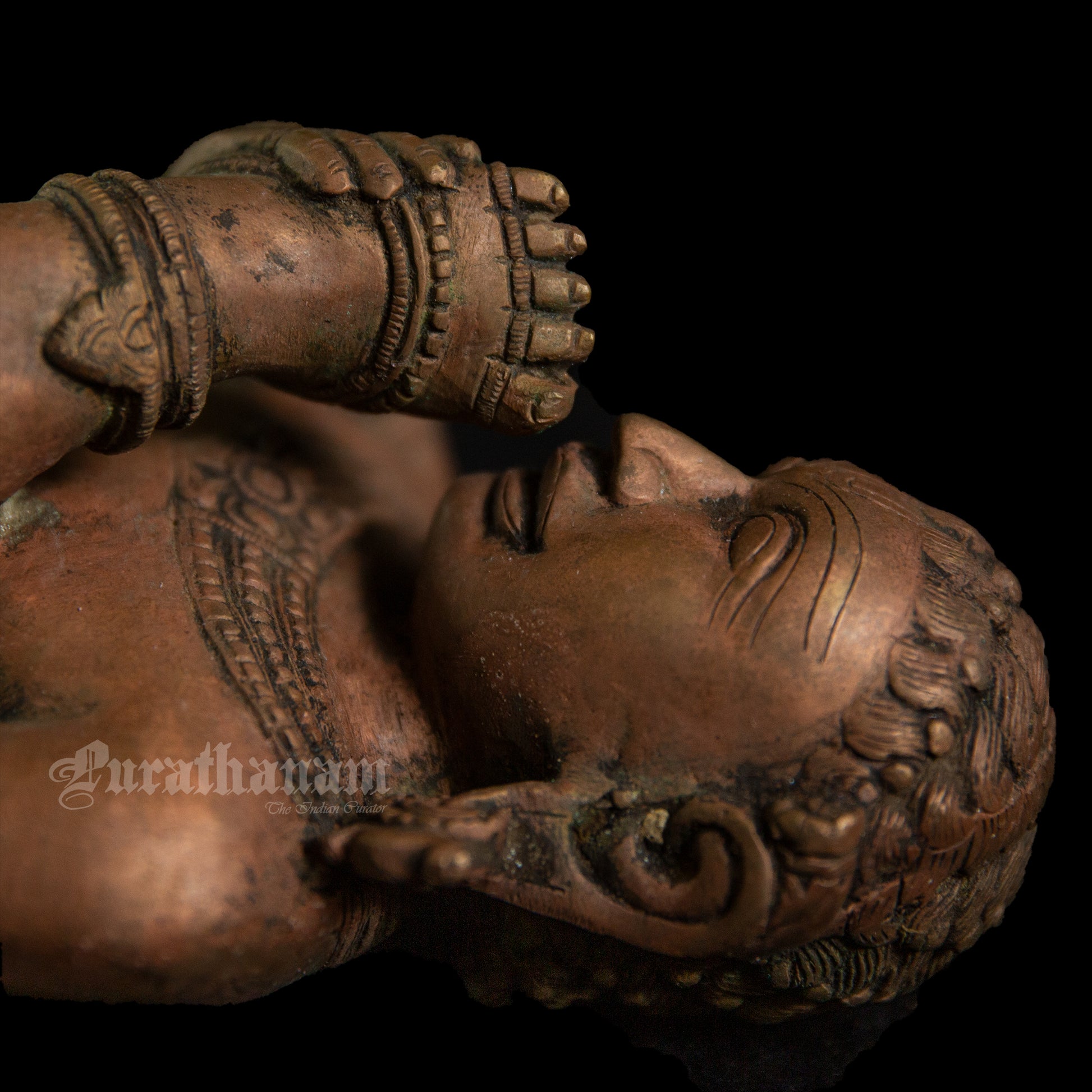 Here we have a unique vintage sculpture of Baby Krishna who is lying on his back, biting his toe just like bal Krishna on the banyan leaf. It is made of brass and perfect to decorate your beautiful space.