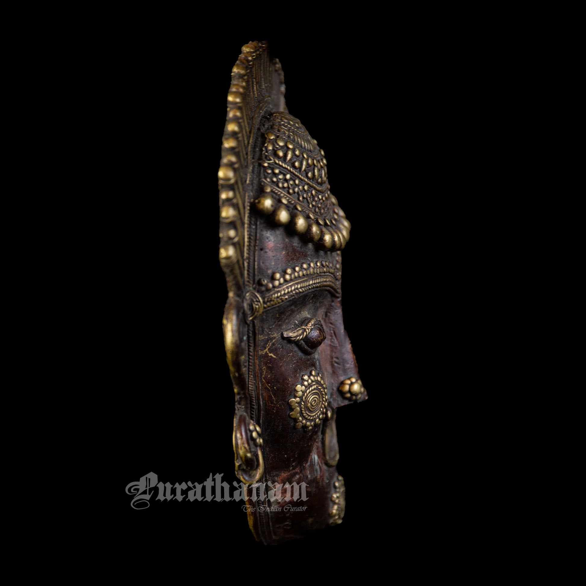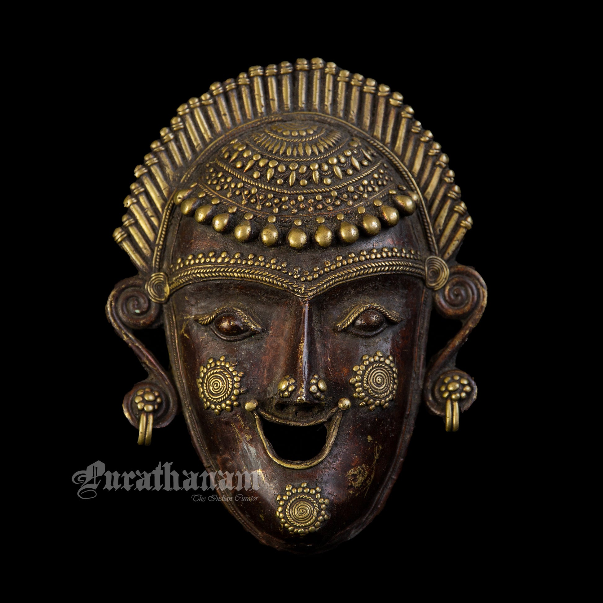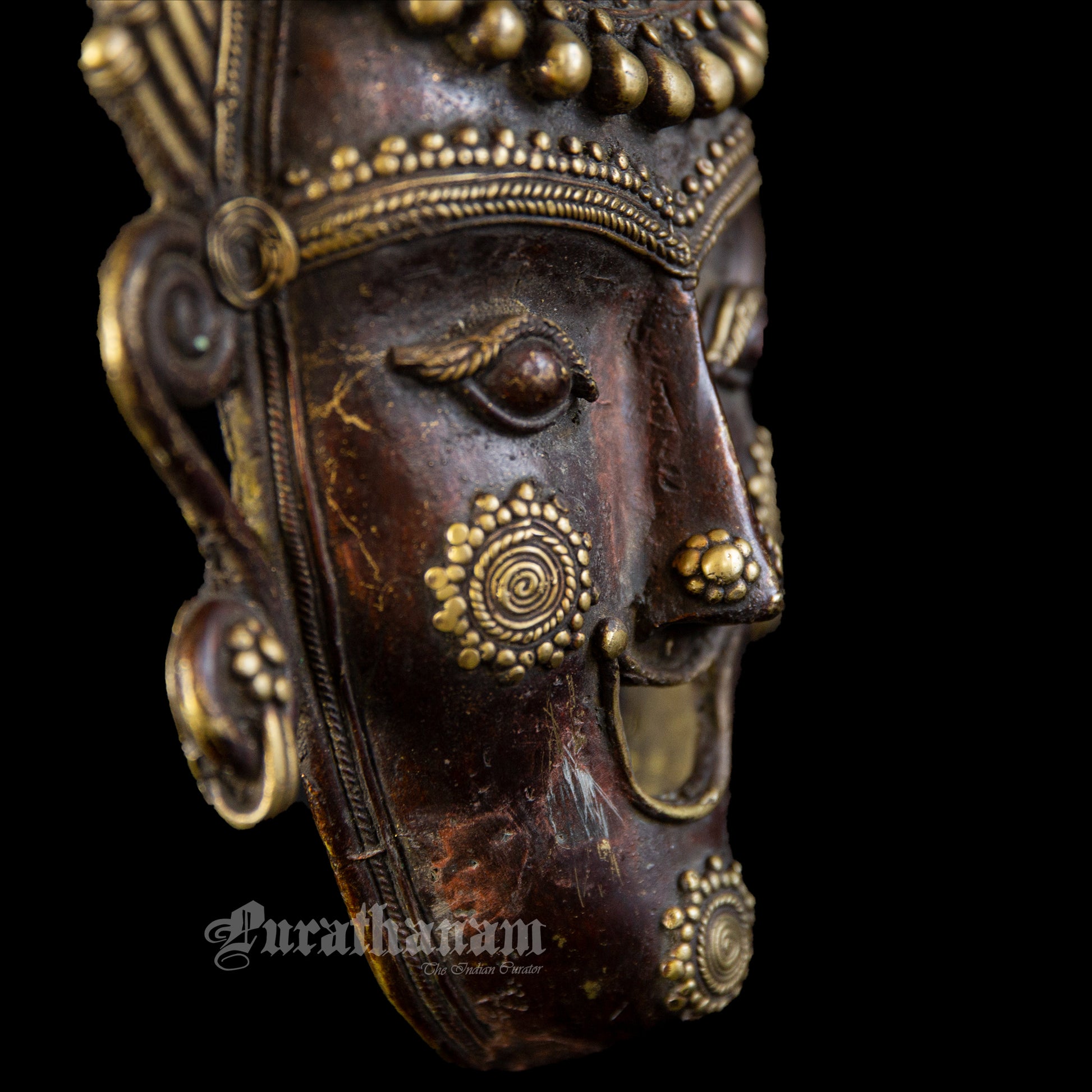 Presenting a Bastar Dhokra Tribal face Mask made of brass. This Dhokra Tribal Mask is approximately 40 years old. The creations of Dhokra artisans are in great demand both in local and international markets due to their rustic simplicity, captivating folk designs, and powerful forms.