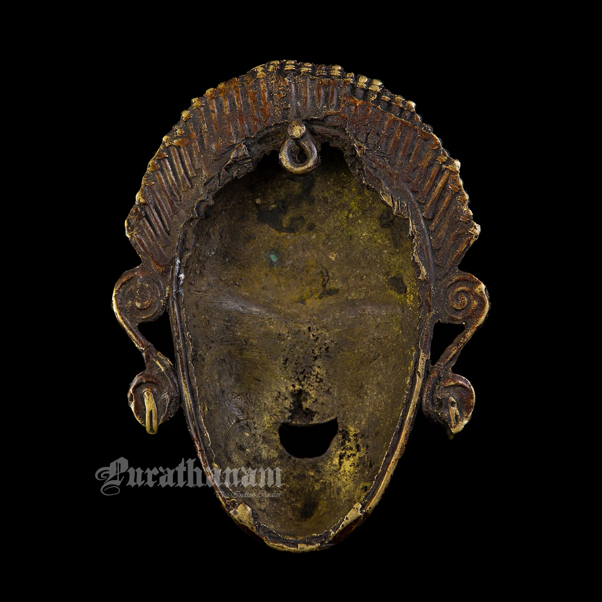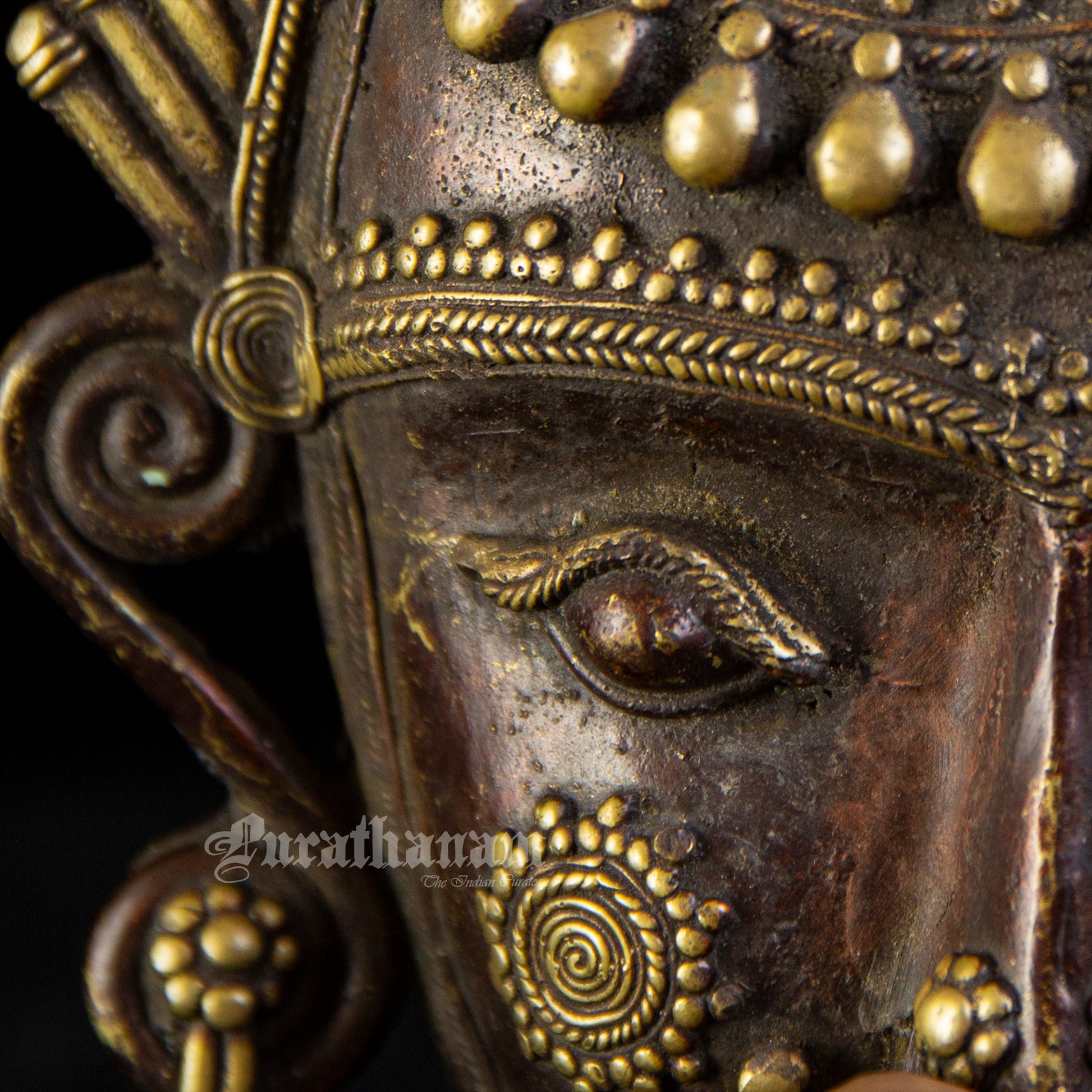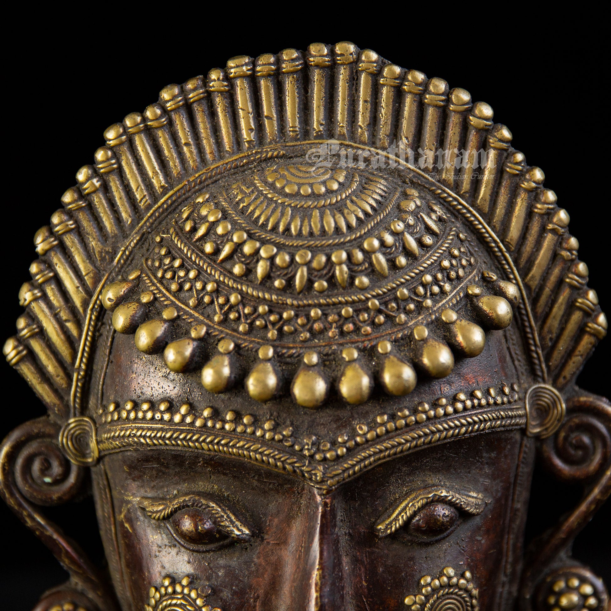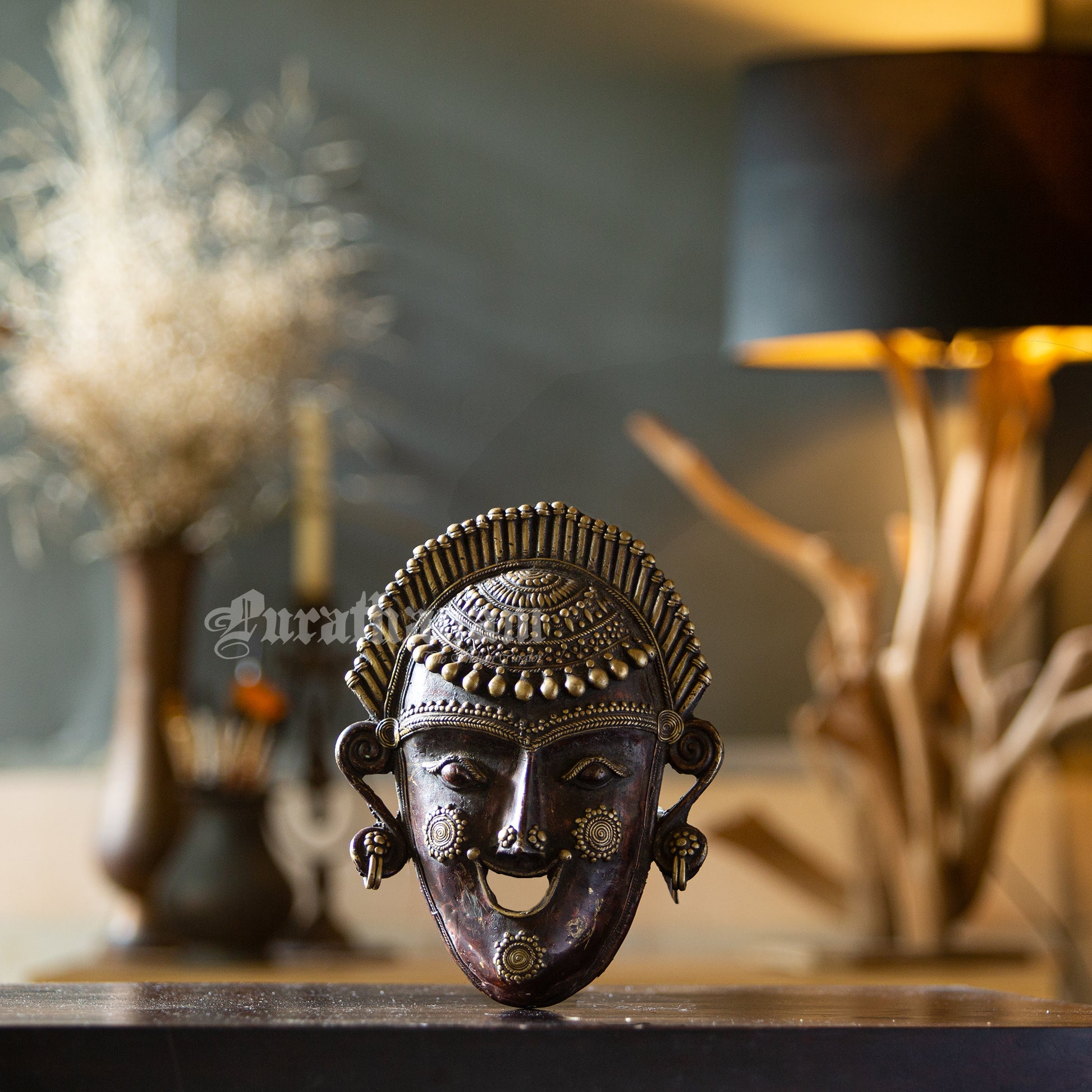 Presenting a Bastar Dhokra Tribal face Mask made of brass. This Dhokra Tribal Mask is approximately 40 years old. The creations of Dhokra artisans are in great demand both in local and international markets due to their rustic simplicity, captivating folk designs, and powerful forms.