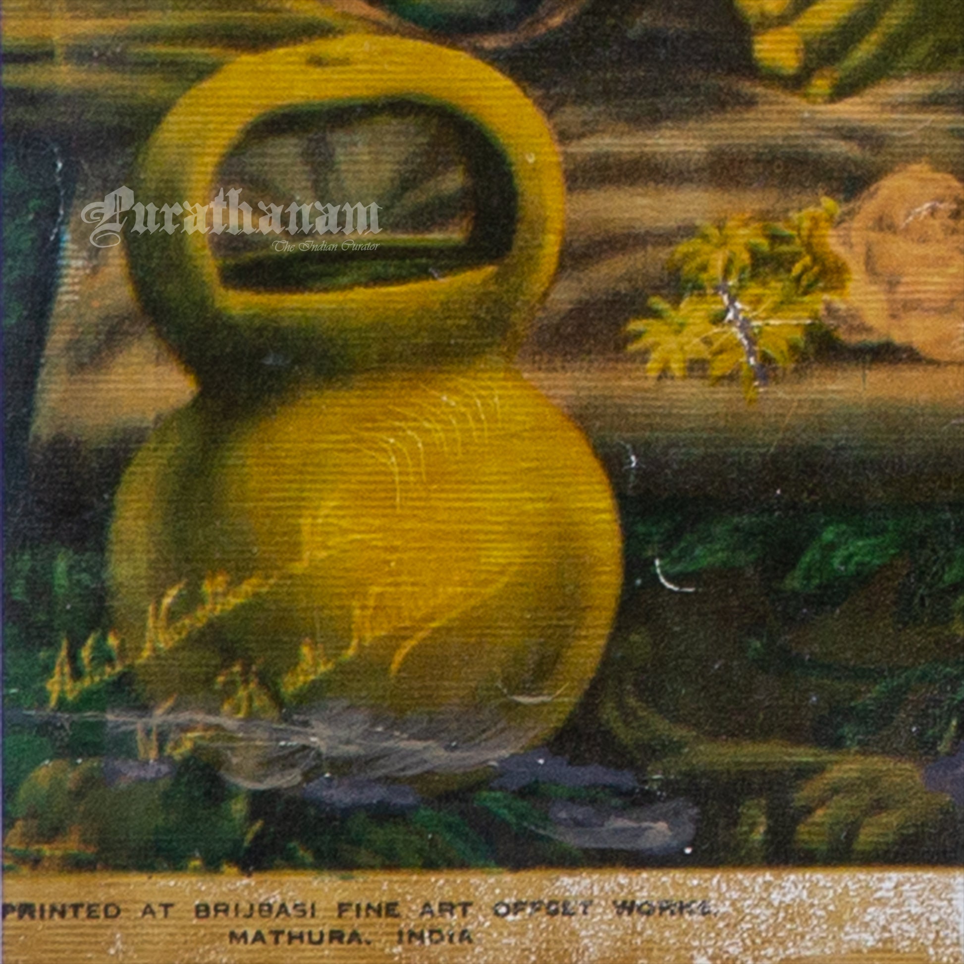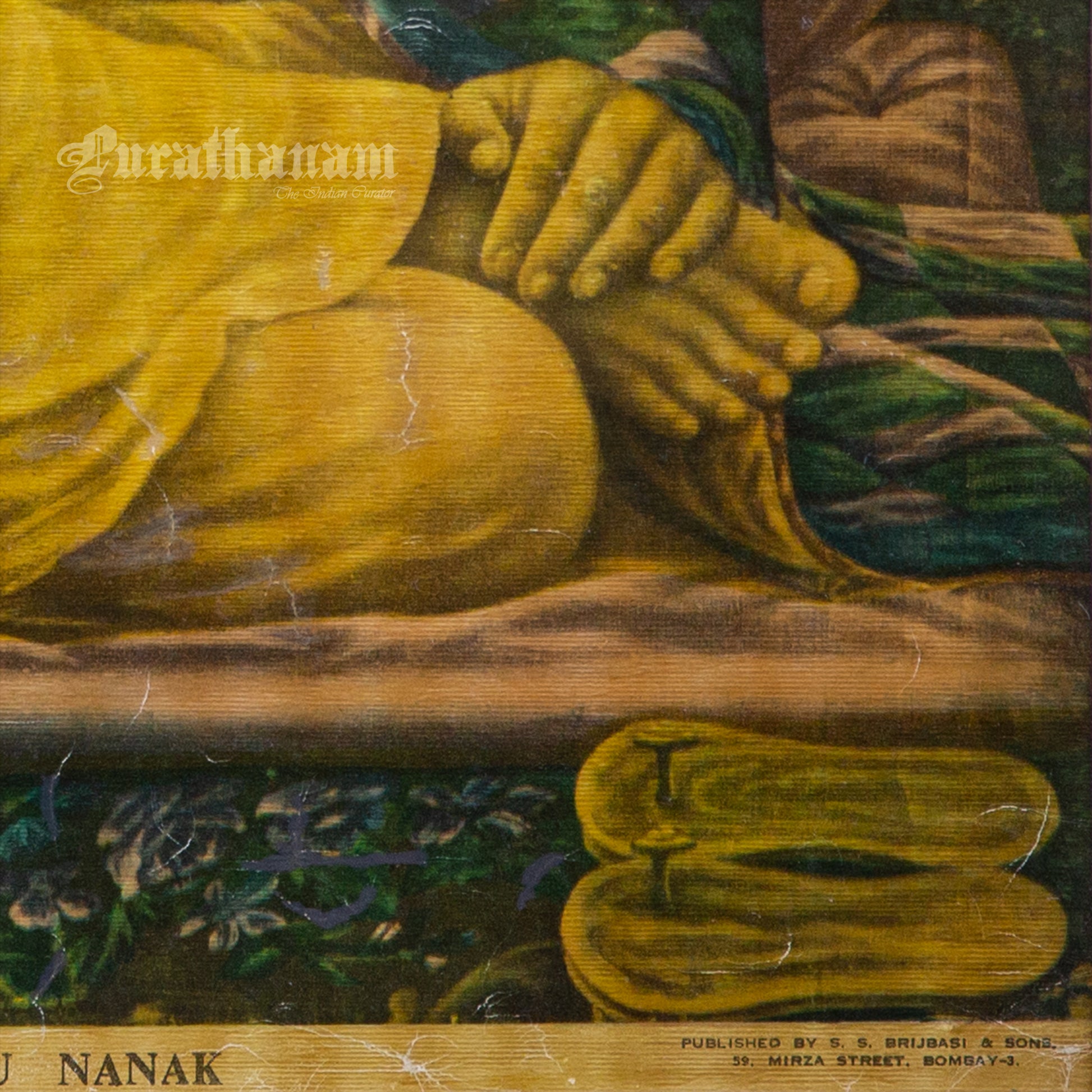 Several of his paintings of Krishna, Lakshmi, Saraswati, Ganesha, Shiva were published as posters by S. S. Brijbasi, a firm based in Karachi in pre-independence India (from 1918 until Partition), using Chromolithography and printed in Germany. This particular print of Bawa Guru Nanak was printed in Brijbasi fine art offset works Mathura, India, post independence.