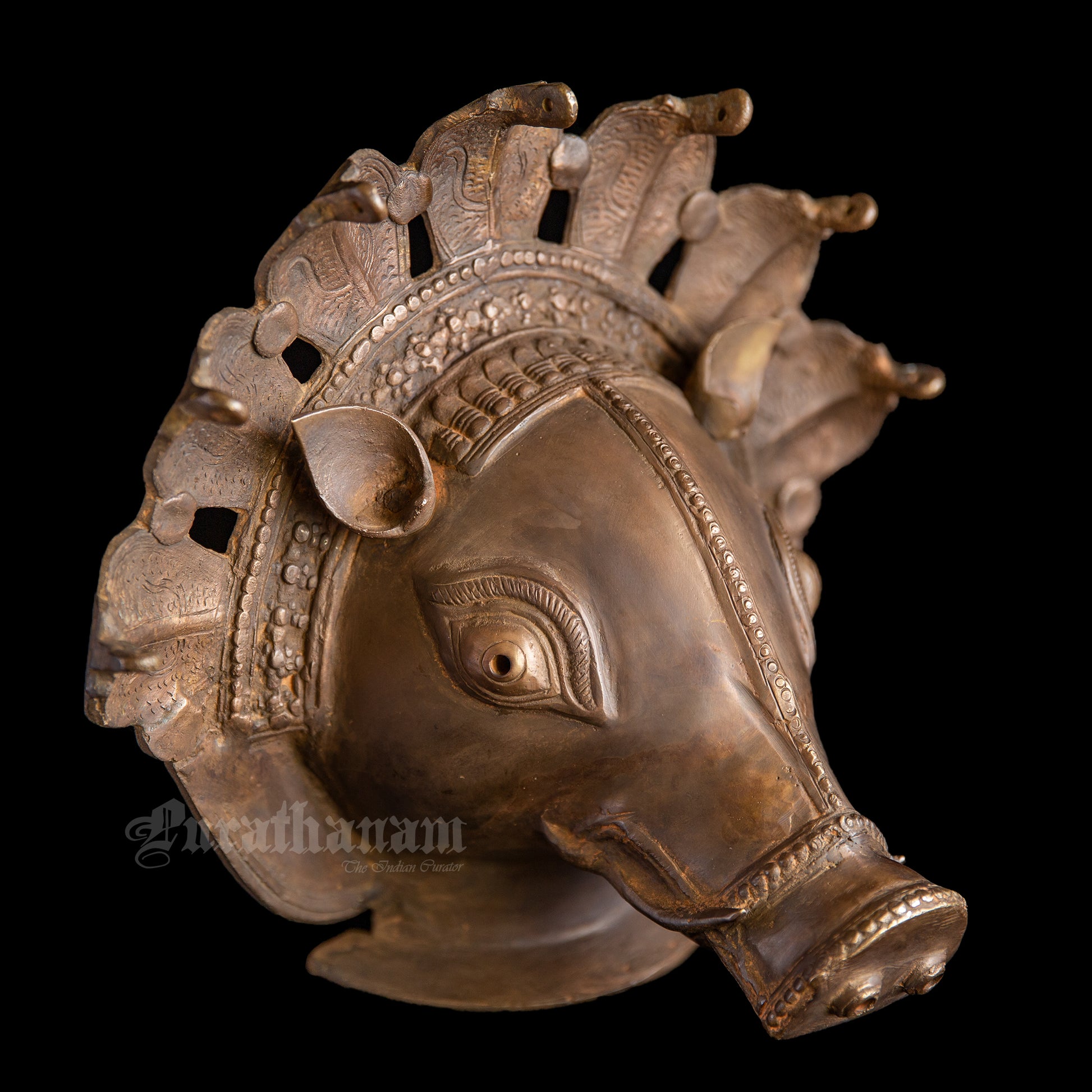 Here we have a beautiful antique Bhuta kola mask, the divine boar, made of Brass from Karnataka. Bhuta in Sanskrit/ Kannada means spirit or ghost and Kola in Tulu means play/ ceremony. Bhuta Kola Mask, also known as Panjuruli, is a traditional mask used in the coastal regions of Karnataka, India.