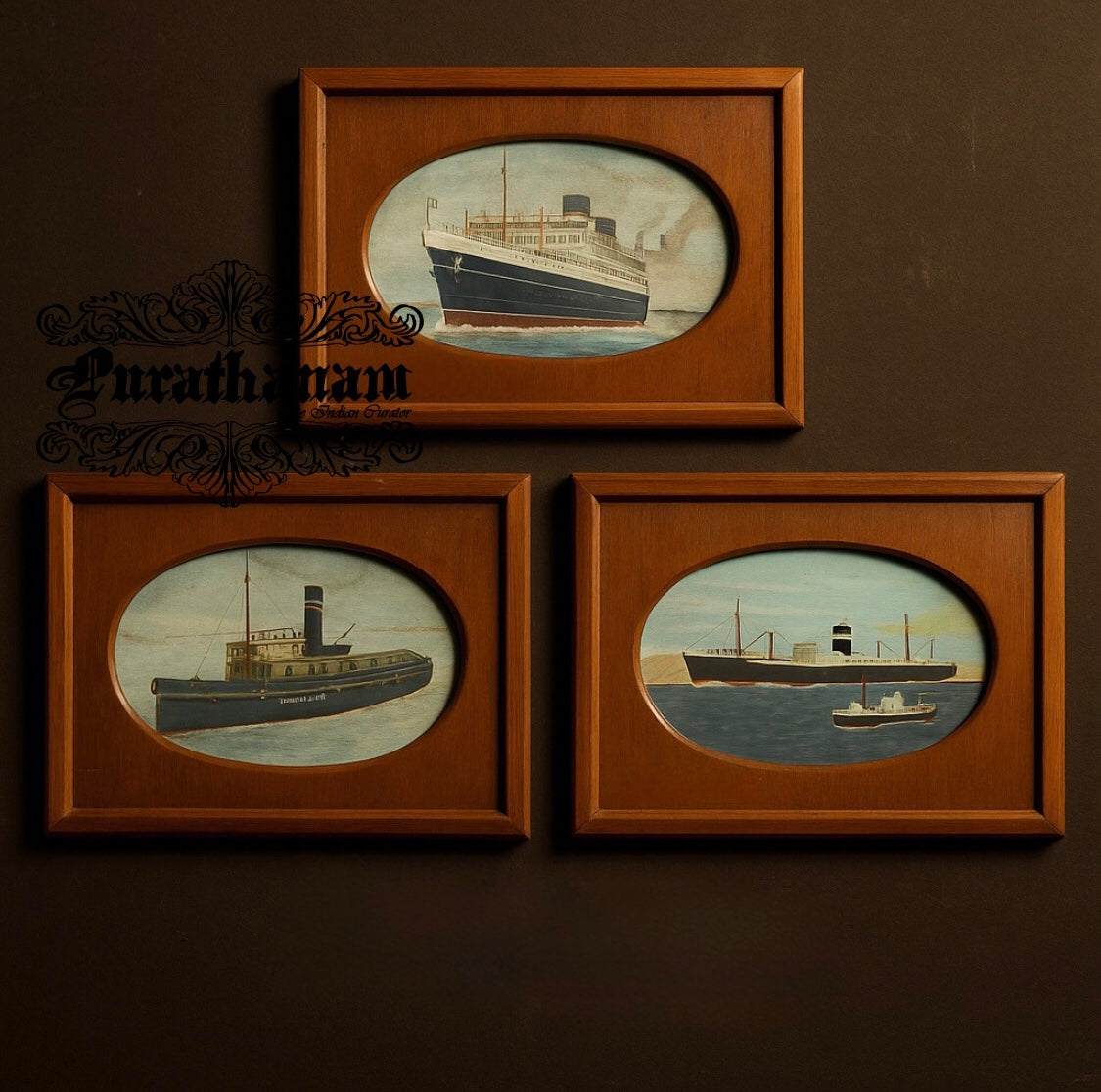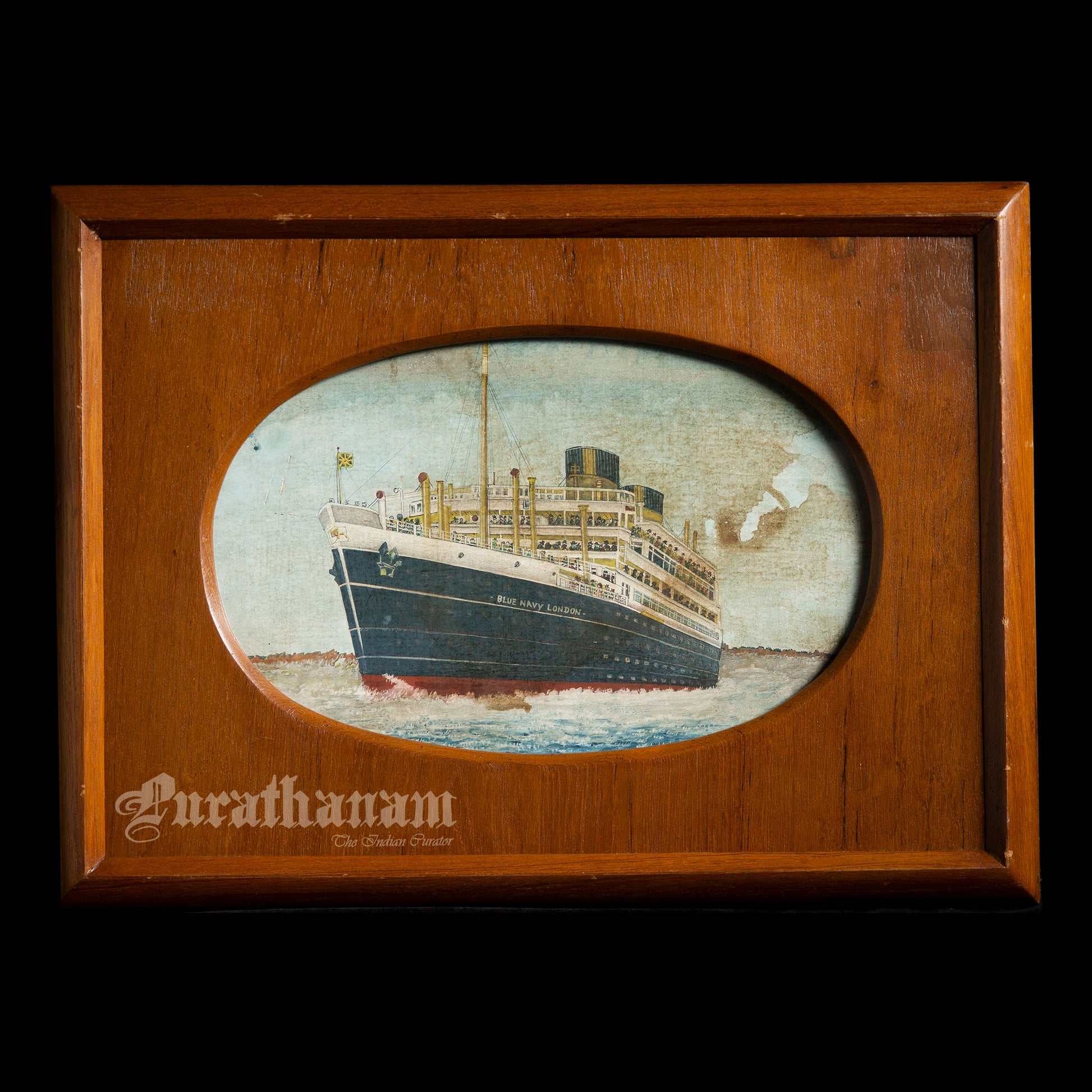 The wooden frame, with its oval cutout, is a deliberate aesthetic choice historically used for portraits, implying the ship is being honored like a person, perhaps as a beloved vessel or a symbol of national identity. This framing style was popular in mid-20th-century British homes, especially for commemorative prints, military portraits, and maritime scenes. Such frames complemented traditional interiors and were often displayed in studies, parlors, or hallways as part of a family’s heritage collection.