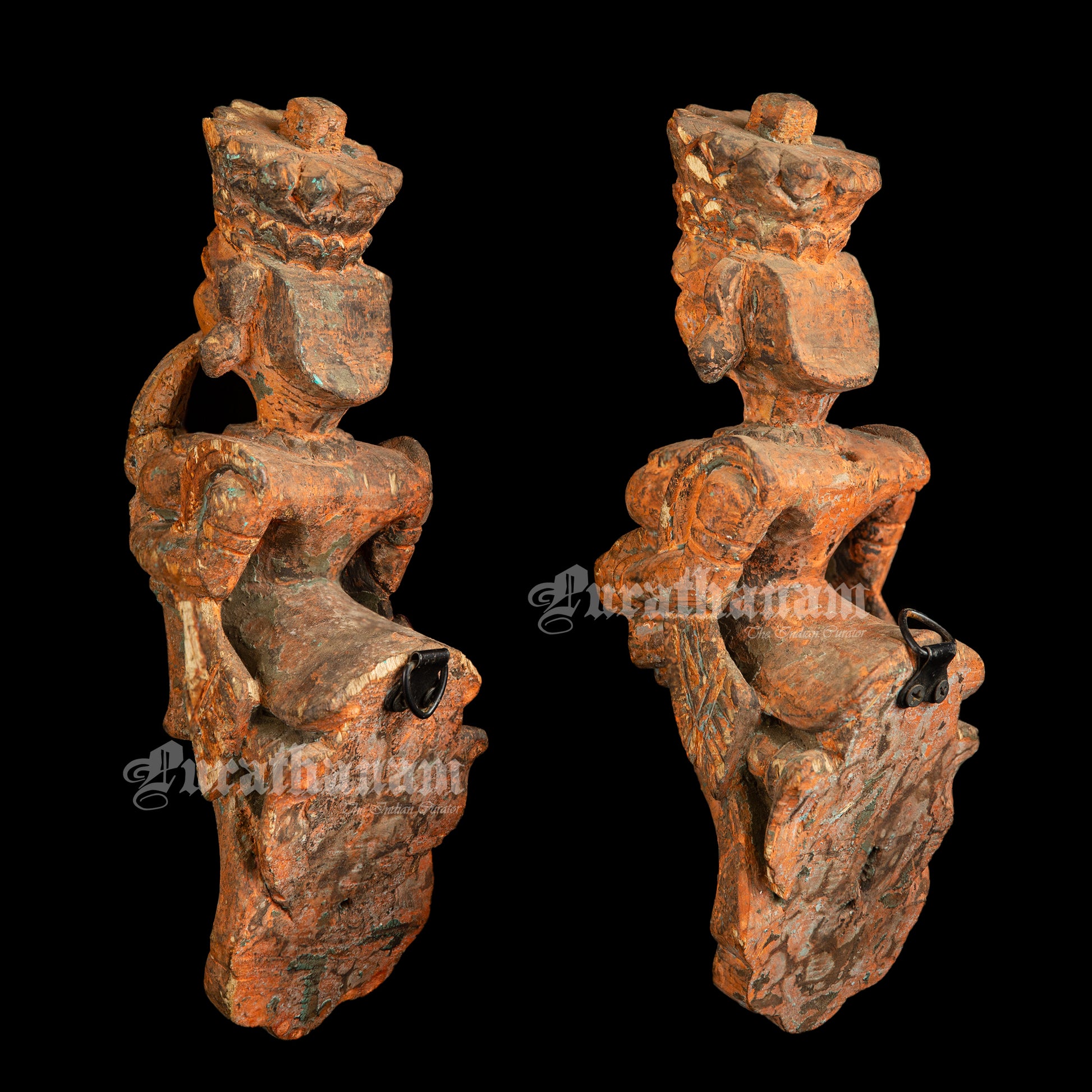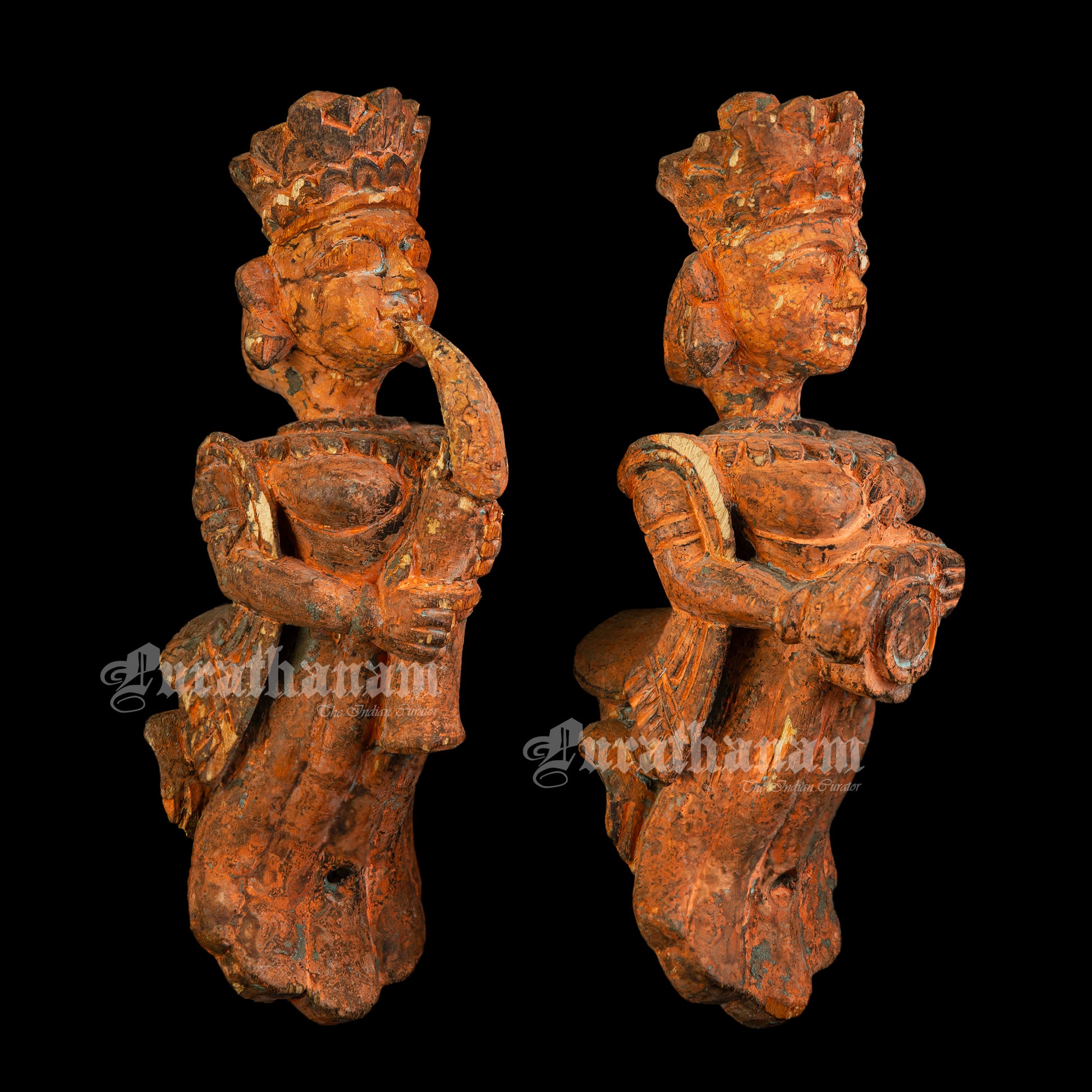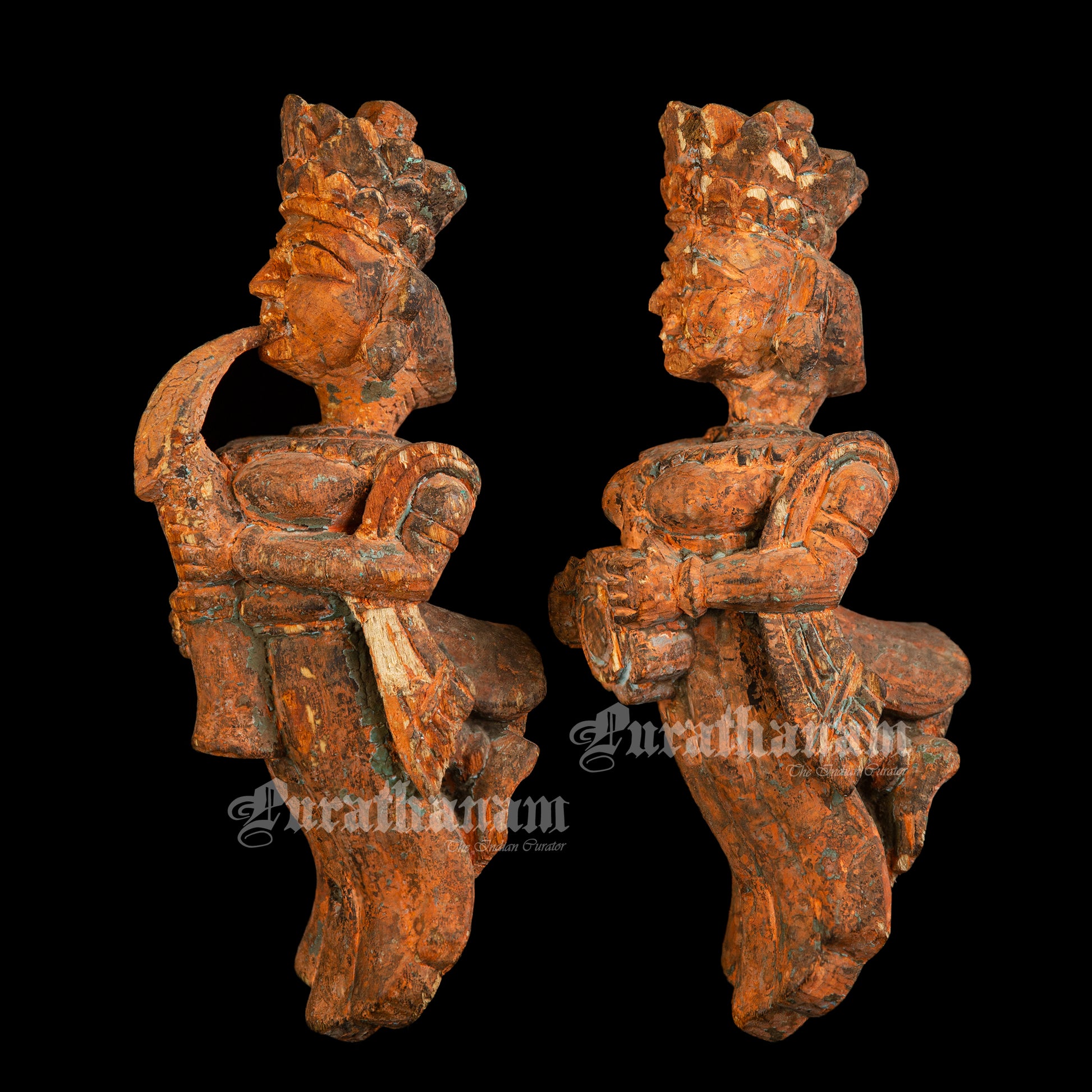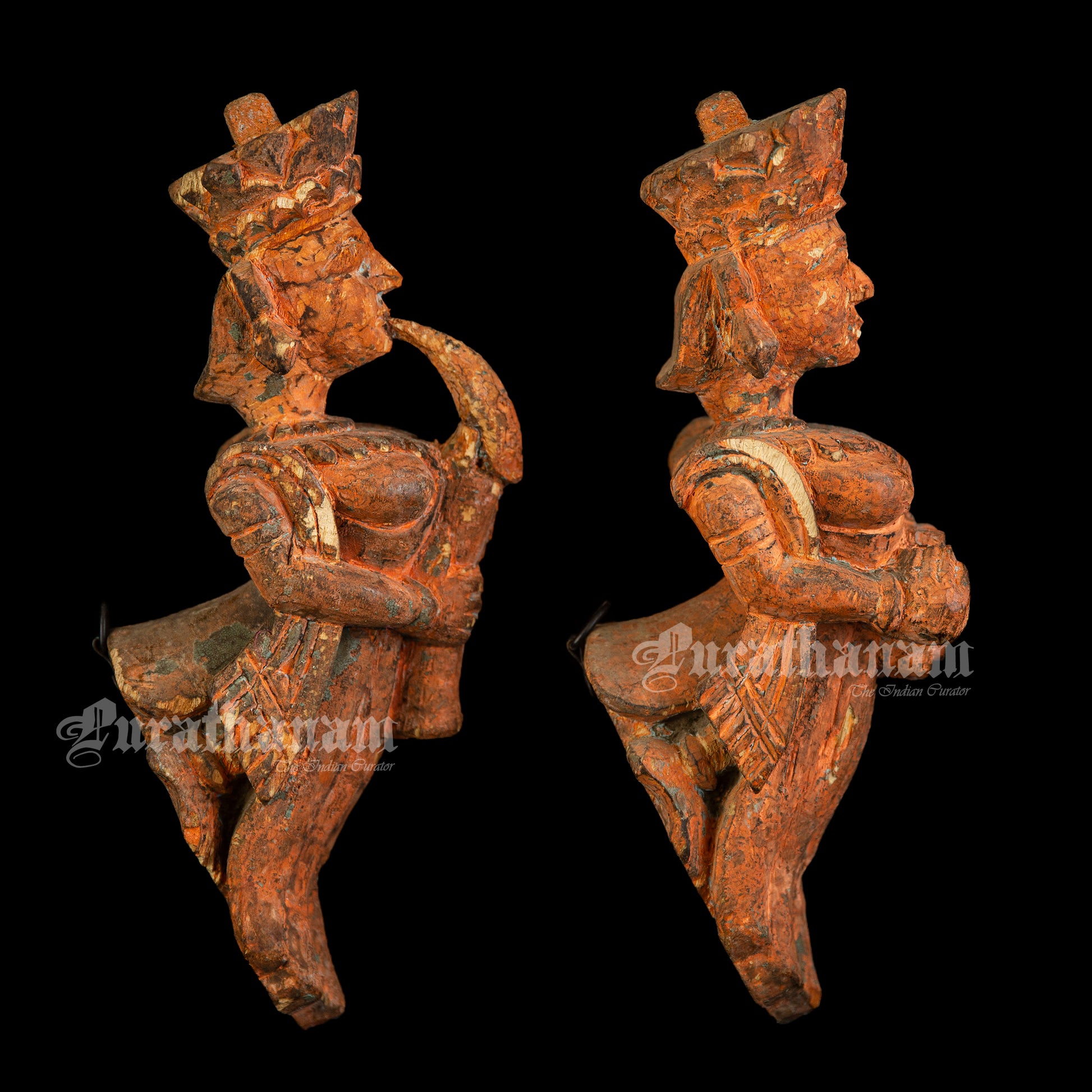 Presented here are intricate architectural wooden brackets featuring Pathan celestial musicians called Vidyadharas, grasping musical instruments while adorned with crowns atop their heads.