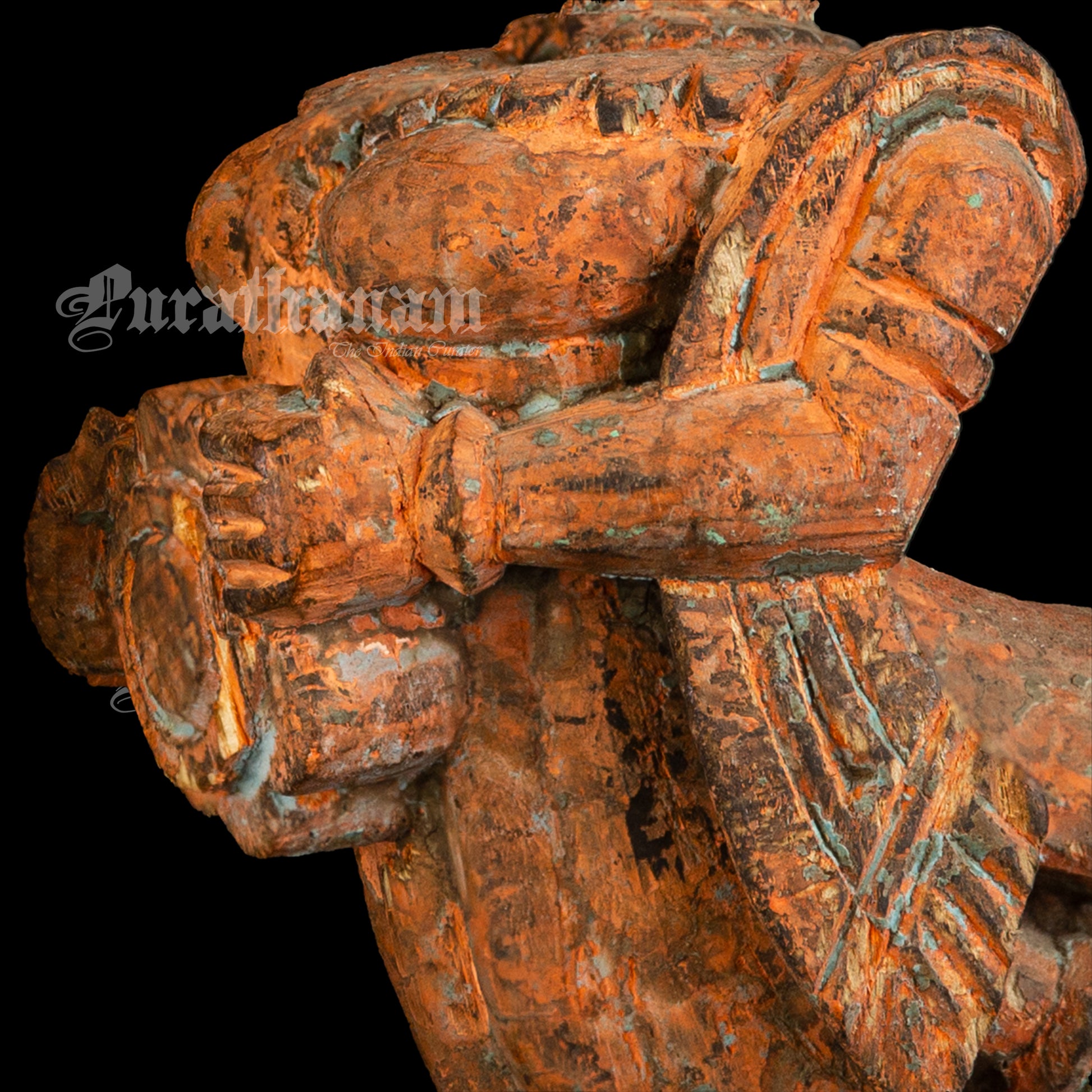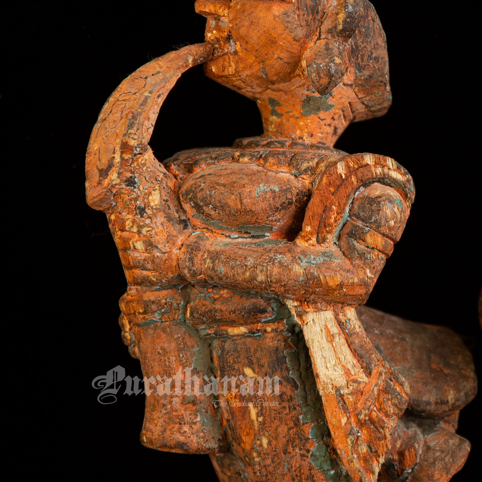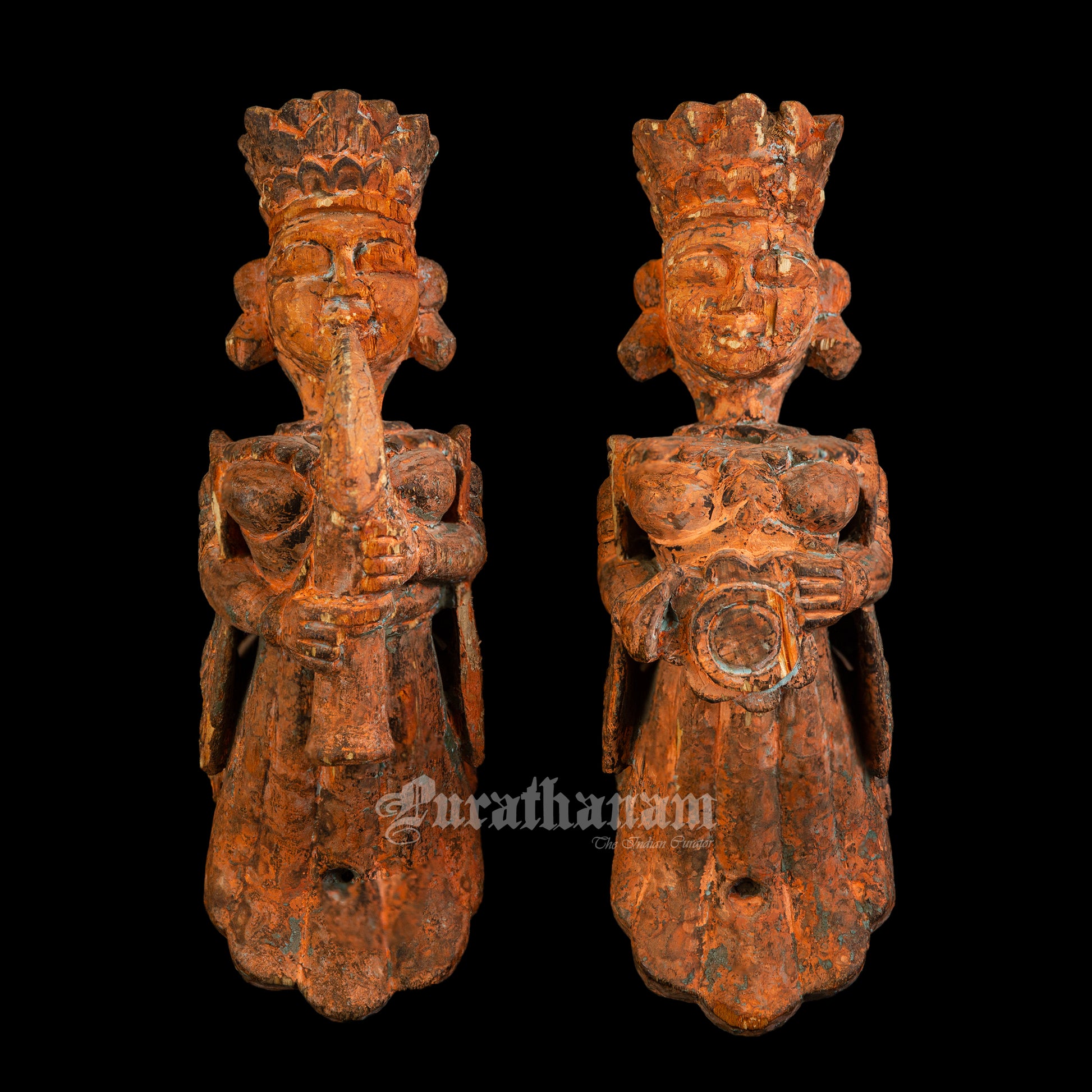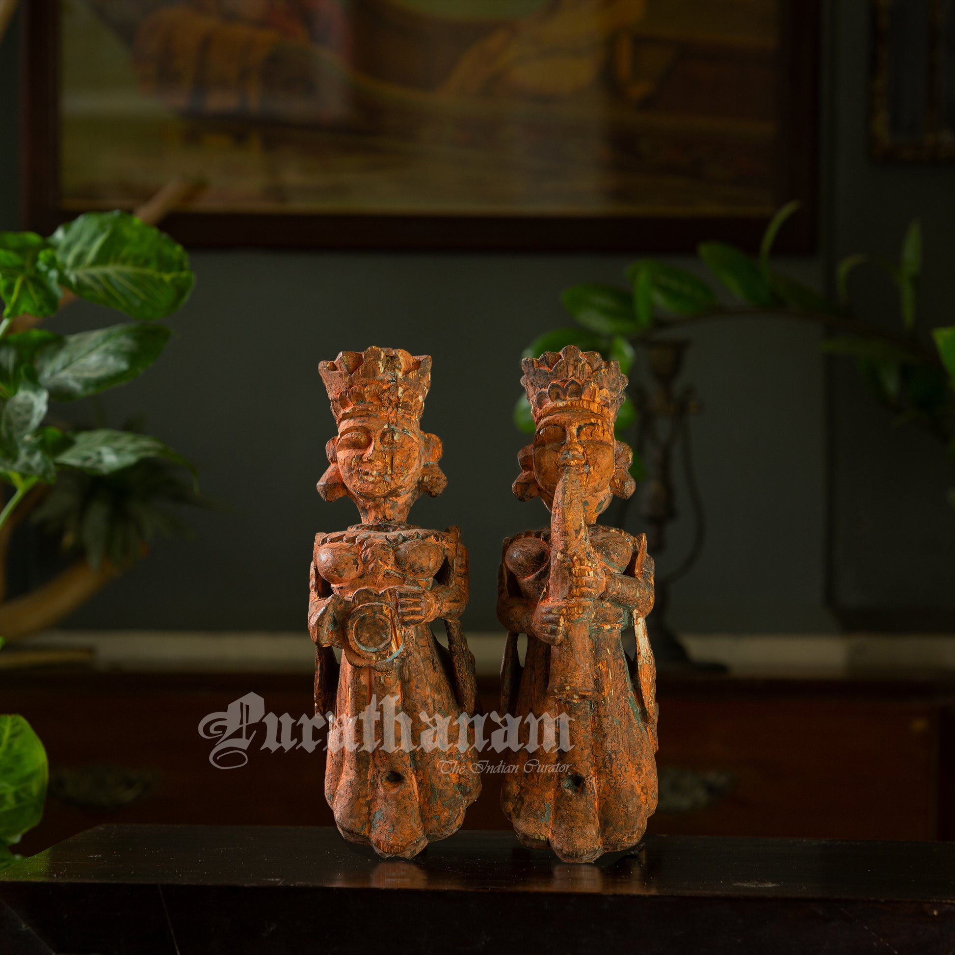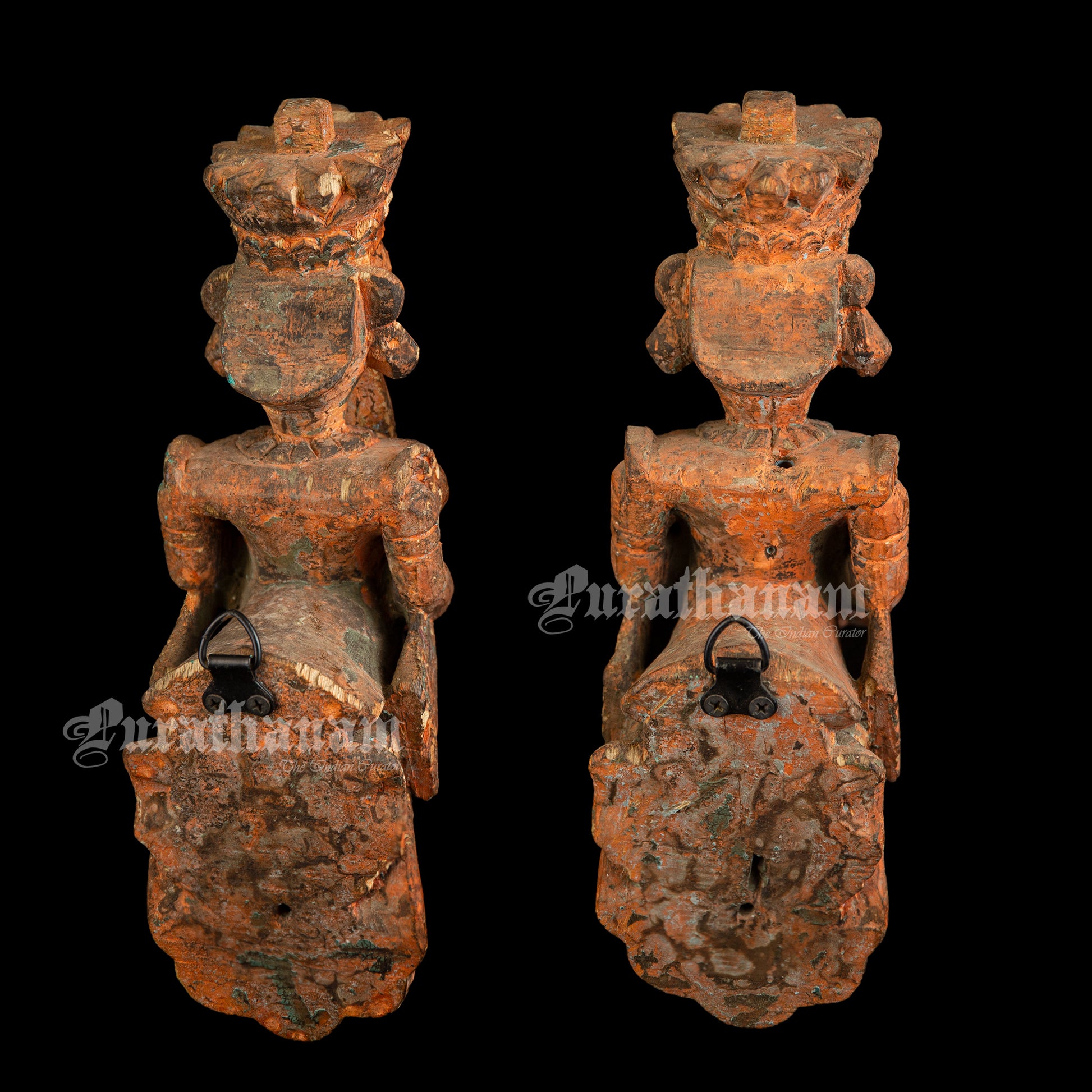 Presented here are intricate architectural wooden brackets featuring Pathan celestial musicians called Vidyadharas, grasping musical instruments while adorned with crowns atop their heads.