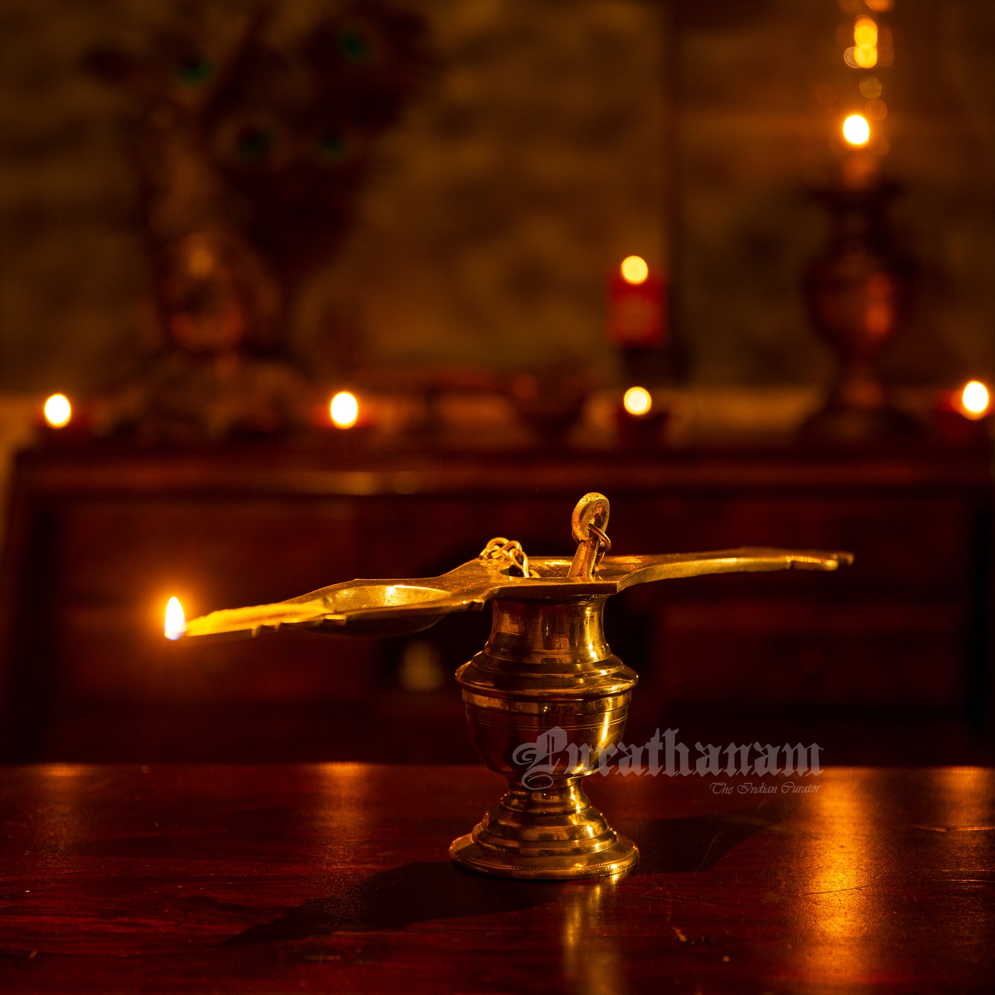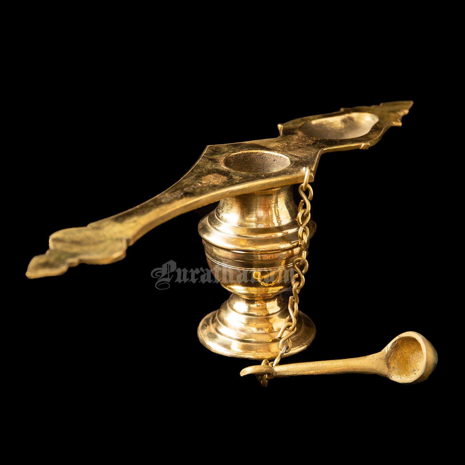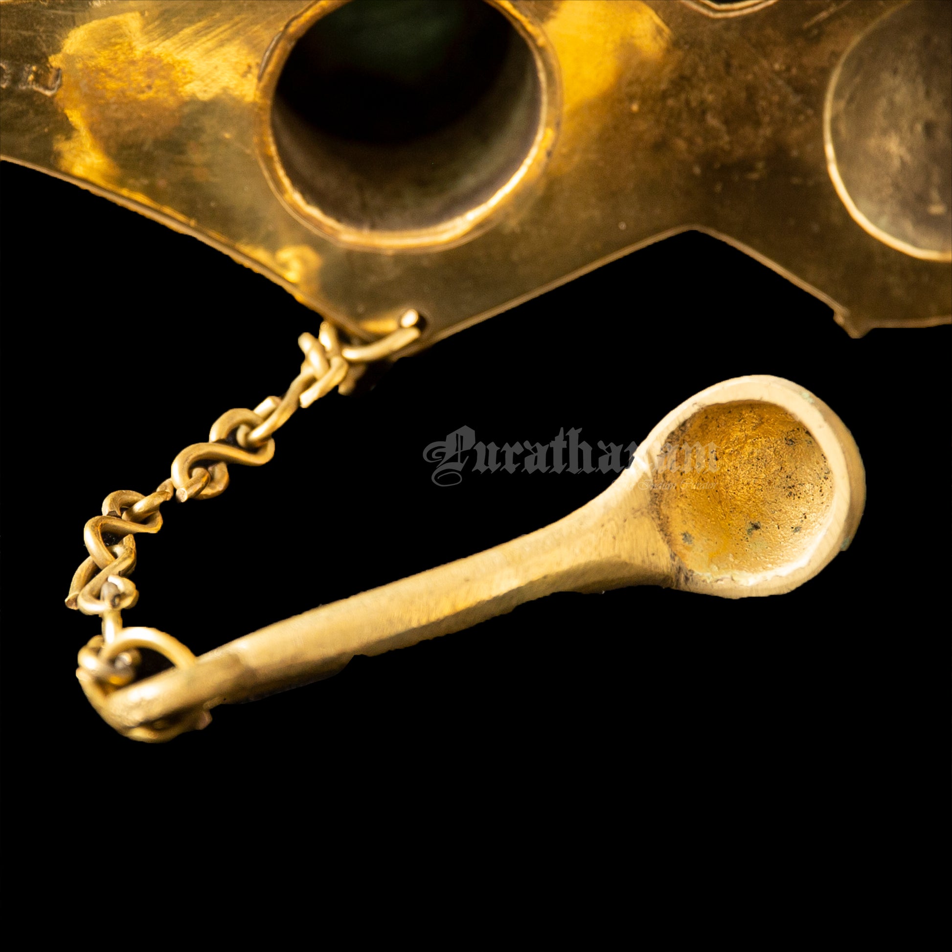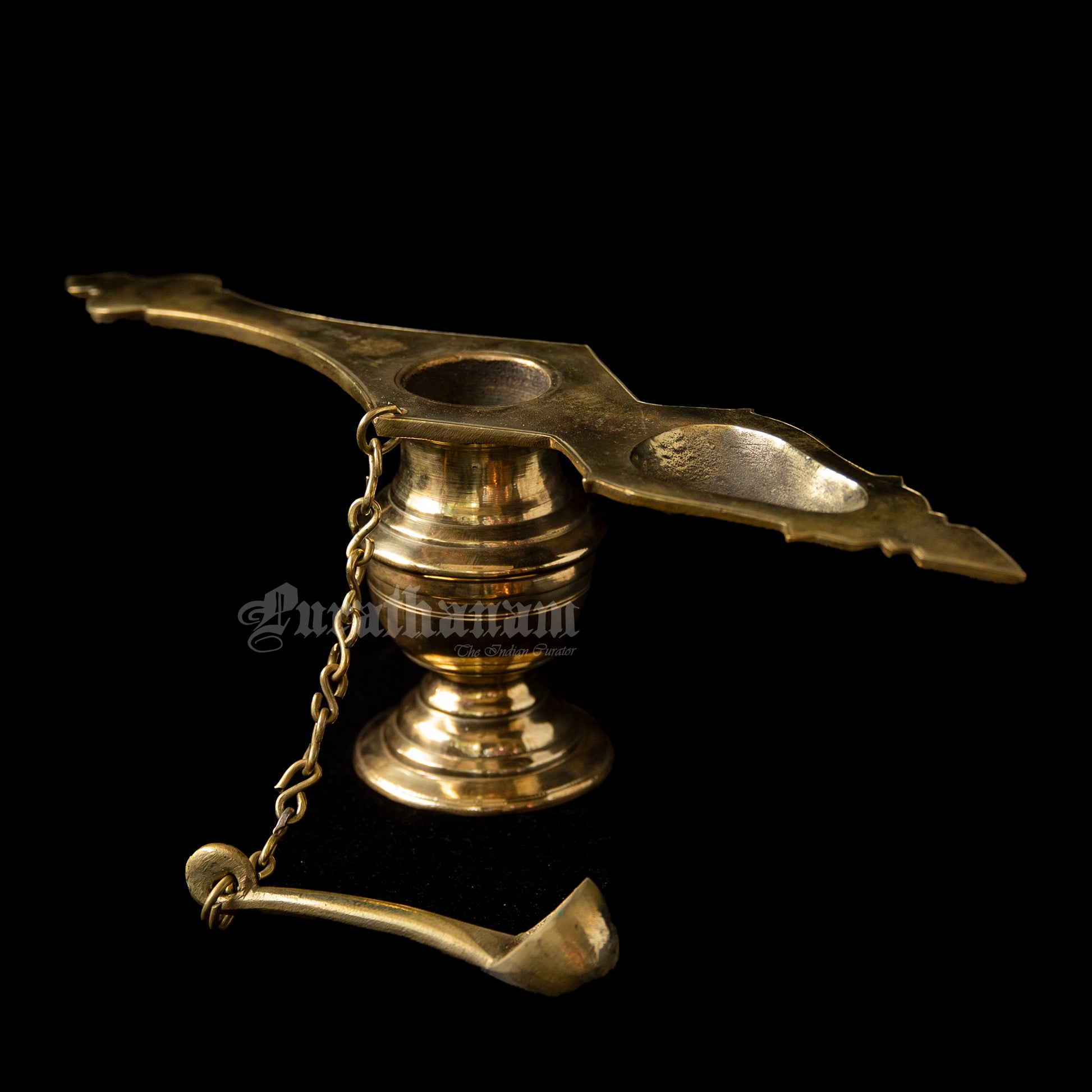 This is an oil lamp called Changalavattam made of brass commonly found in Kerala temples. It is widely utilized during auspicious Hindu religious occasions. It features a lengthy handle at the rear and a small depression in the center for holding oil. Adjacent to the depression is a smaller indentation for lighting the lamp or diya. Additionally, a small spoon bound by a chain is attached to the Changalavattam.