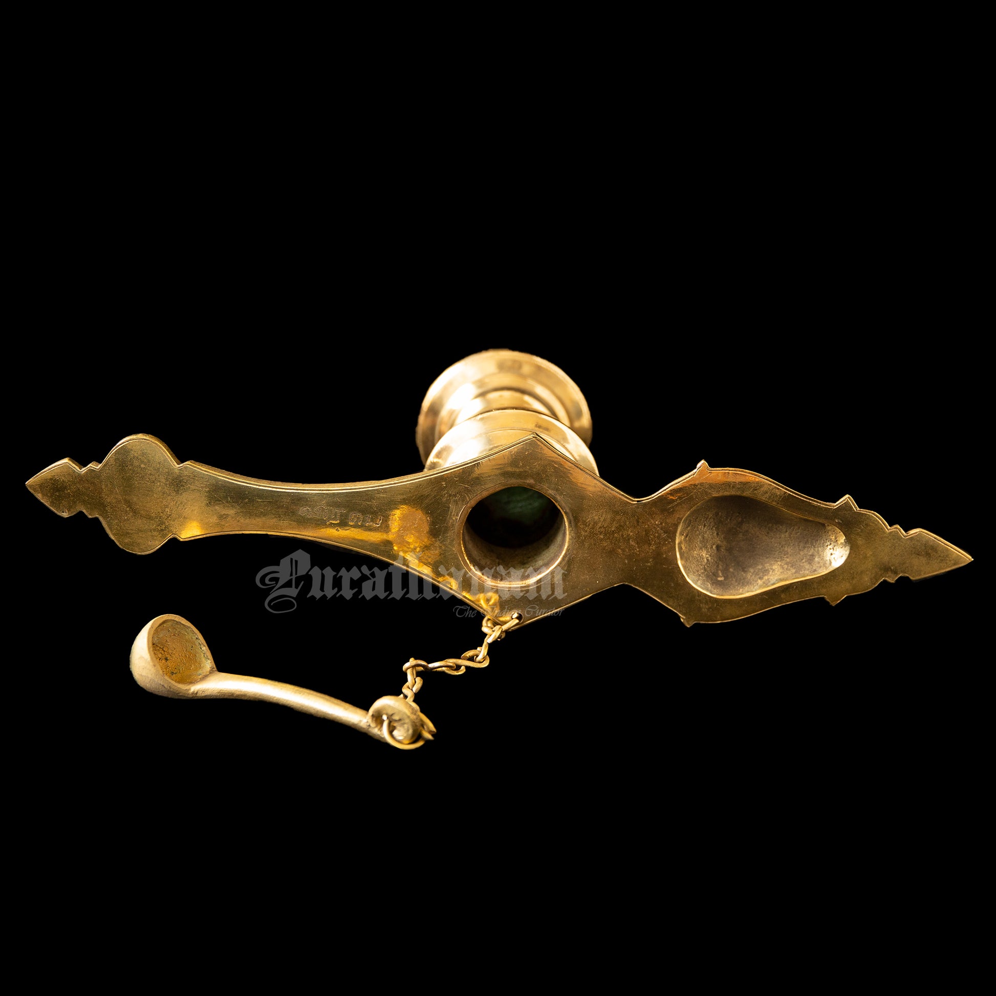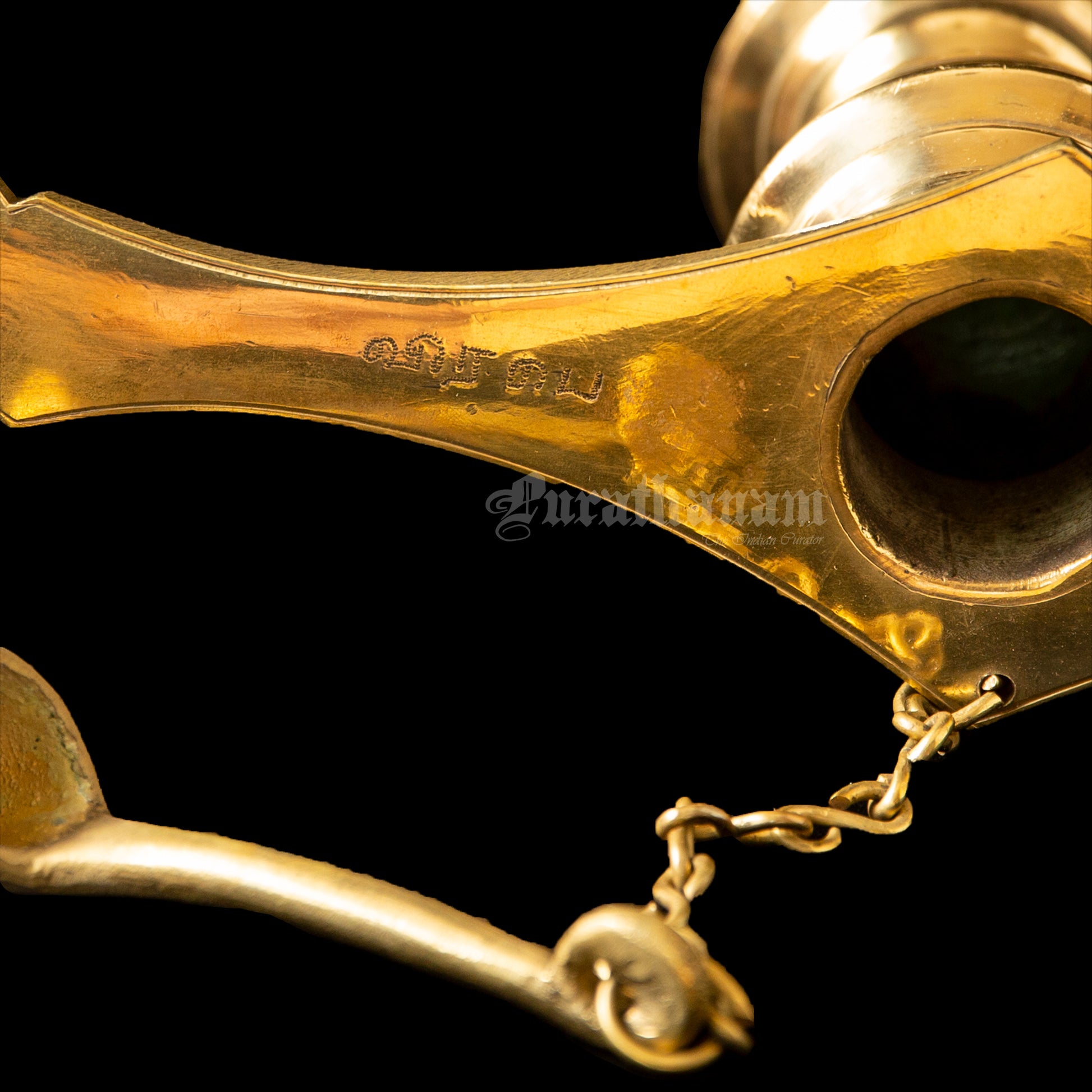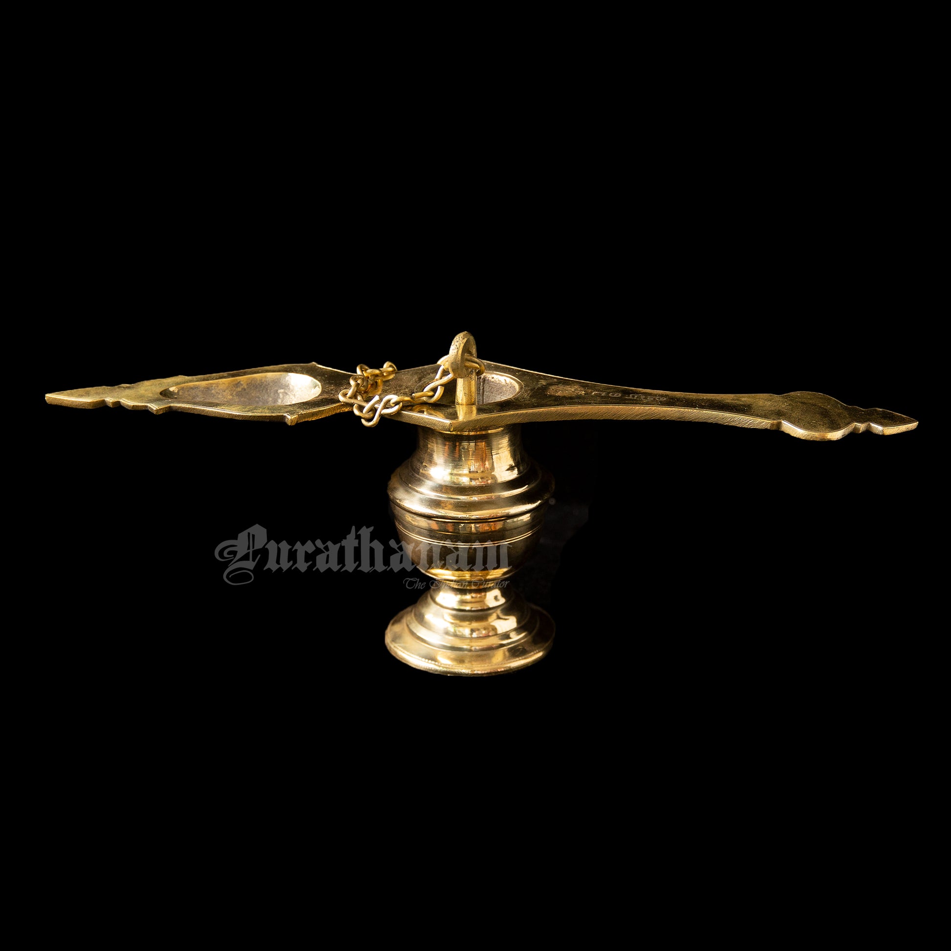 This is an oil lamp called Changalavattam made of brass commonly found in Kerala temples. It is widely utilized during auspicious Hindu religious occasions. It features a lengthy handle at the rear and a small depression in the center for holding oil. Adjacent to the depression is a smaller indentation for lighting the lamp or diya. Additionally, a small spoon bound by a chain is attached to the Changalavattam.