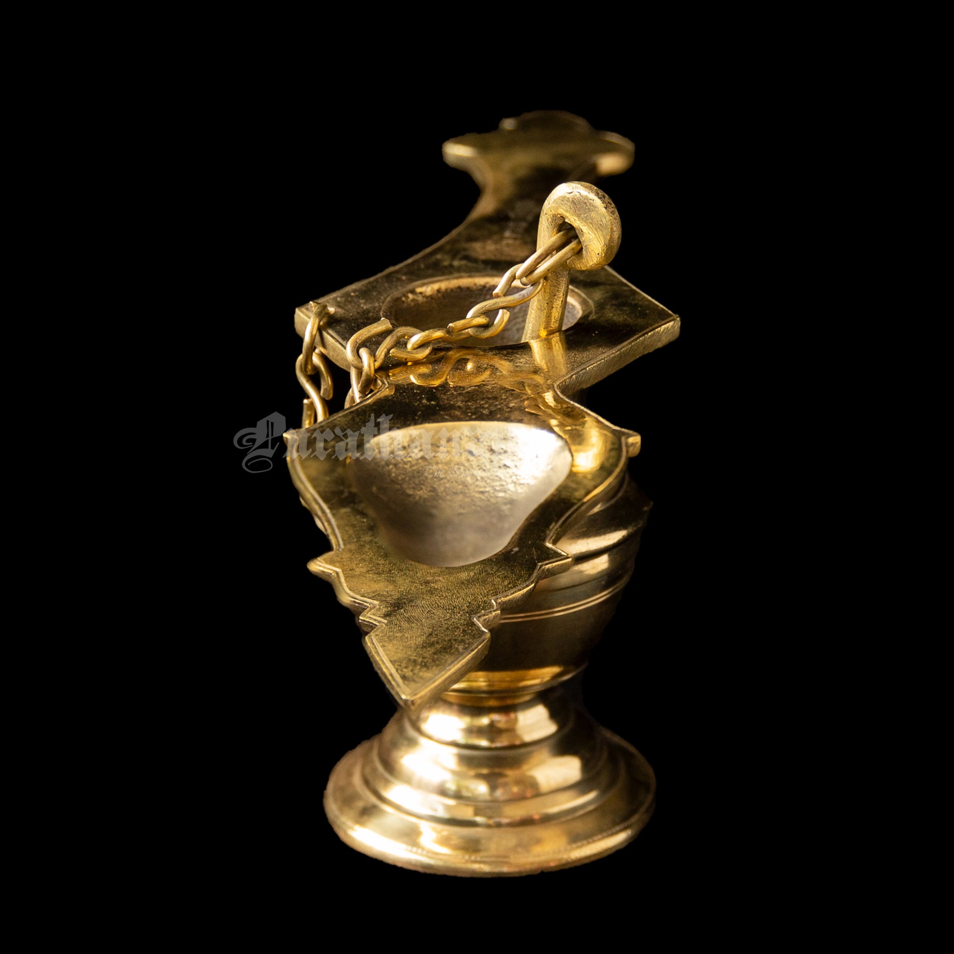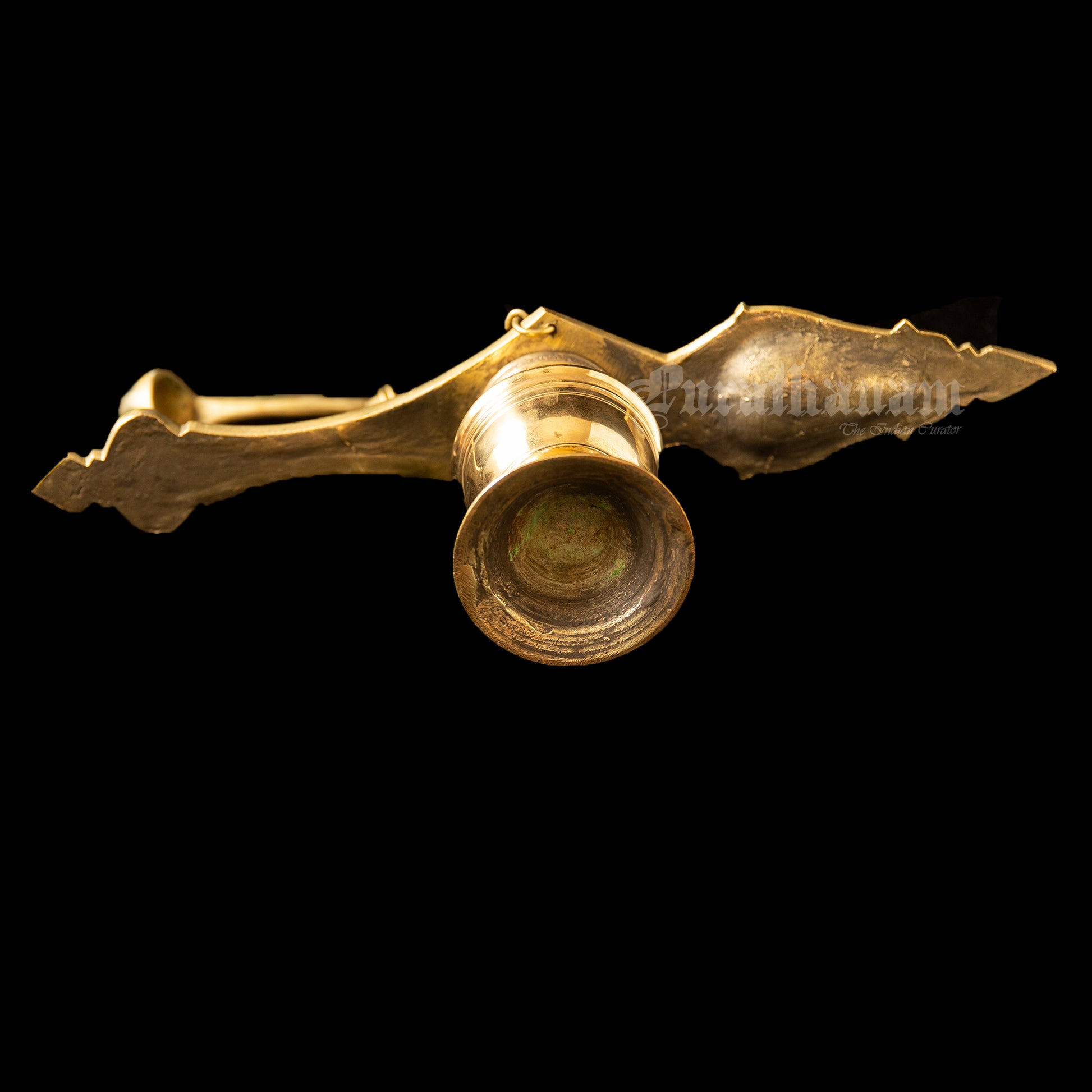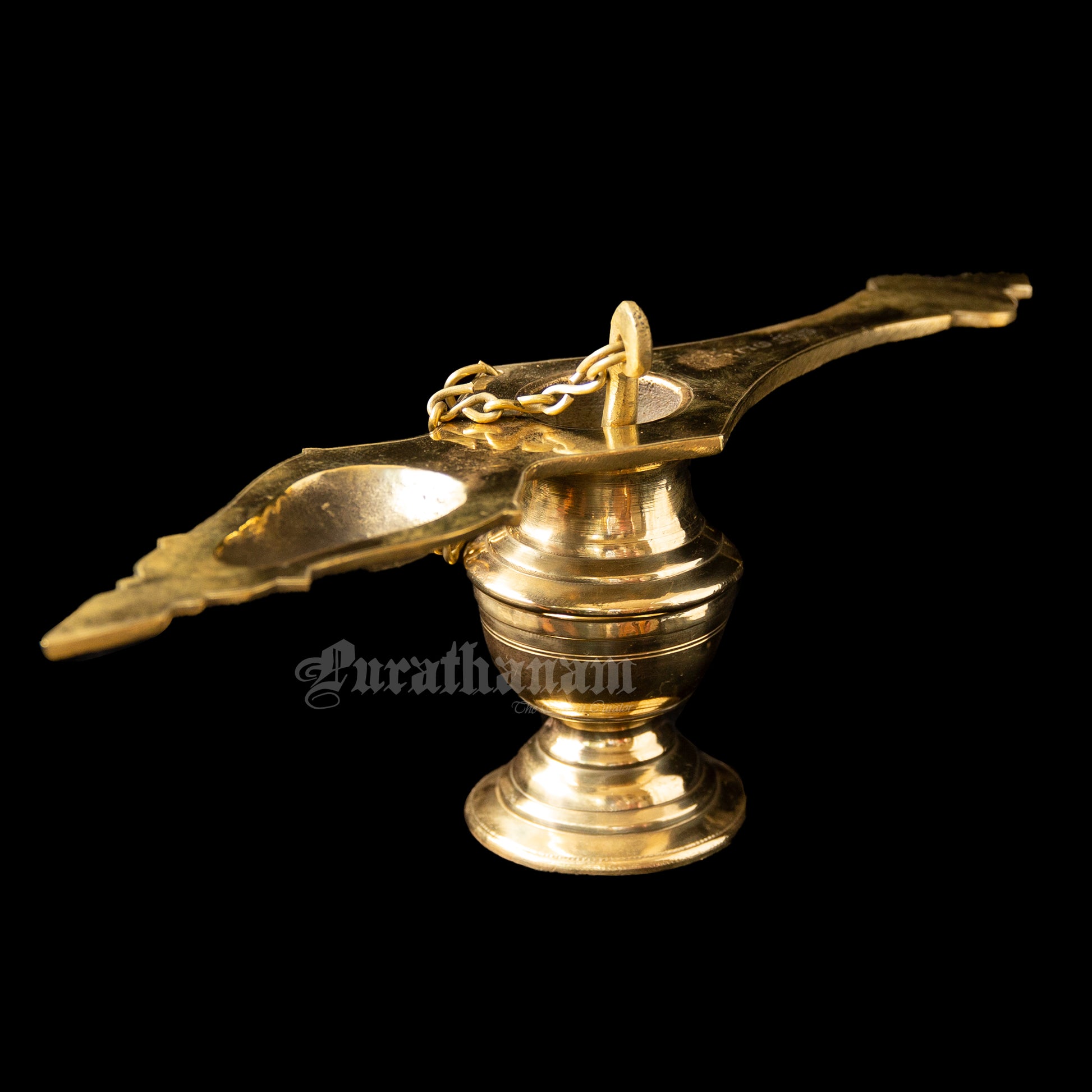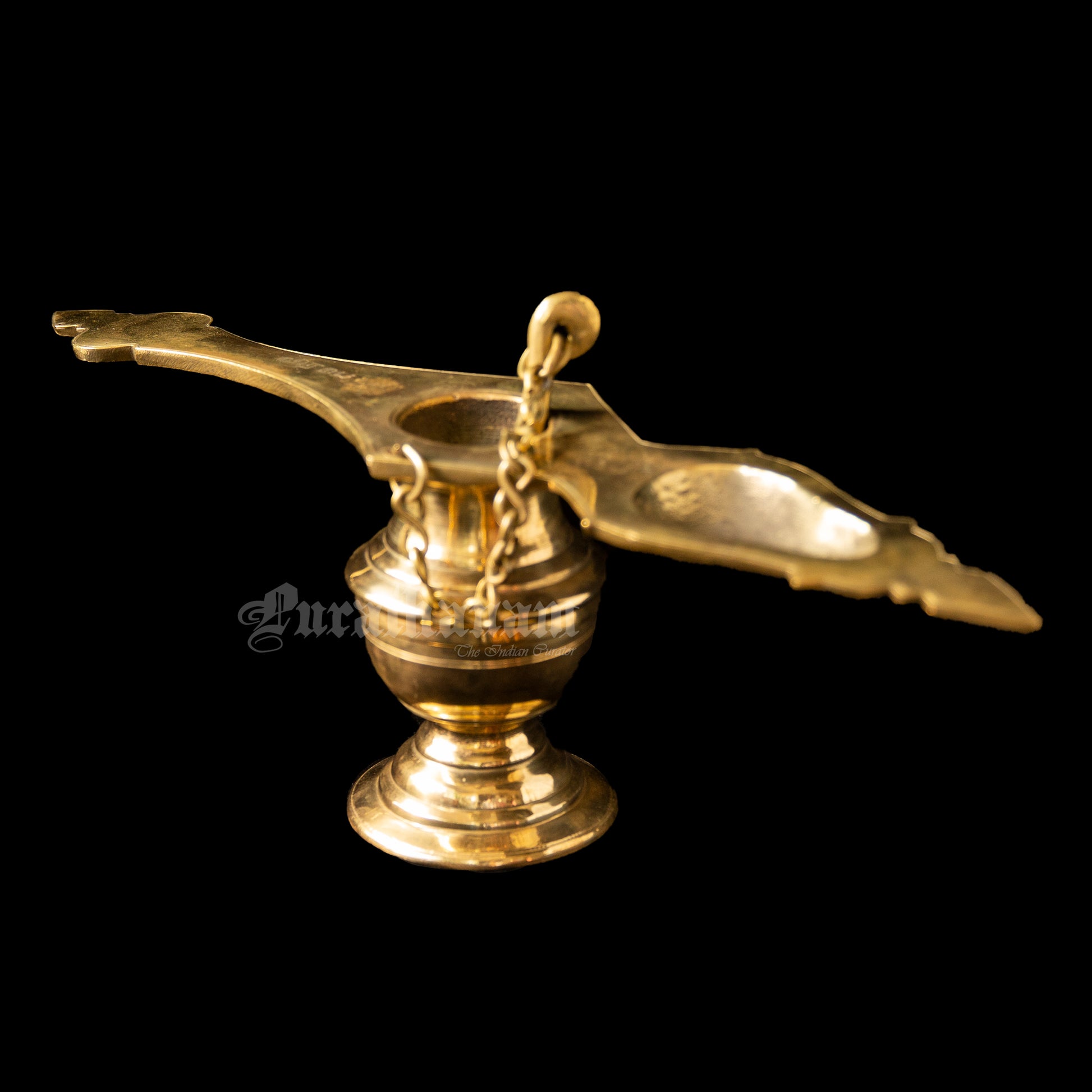 This is an oil lamp called Changalavattam made of brass commonly found in Kerala temples. It is widely utilized during auspicious Hindu religious occasions. It features a lengthy handle at the rear and a small depression in the center for holding oil. Adjacent to the depression is a smaller indentation for lighting the lamp or diya. Additionally, a small spoon bound by a chain is attached to the Changalavattam.
