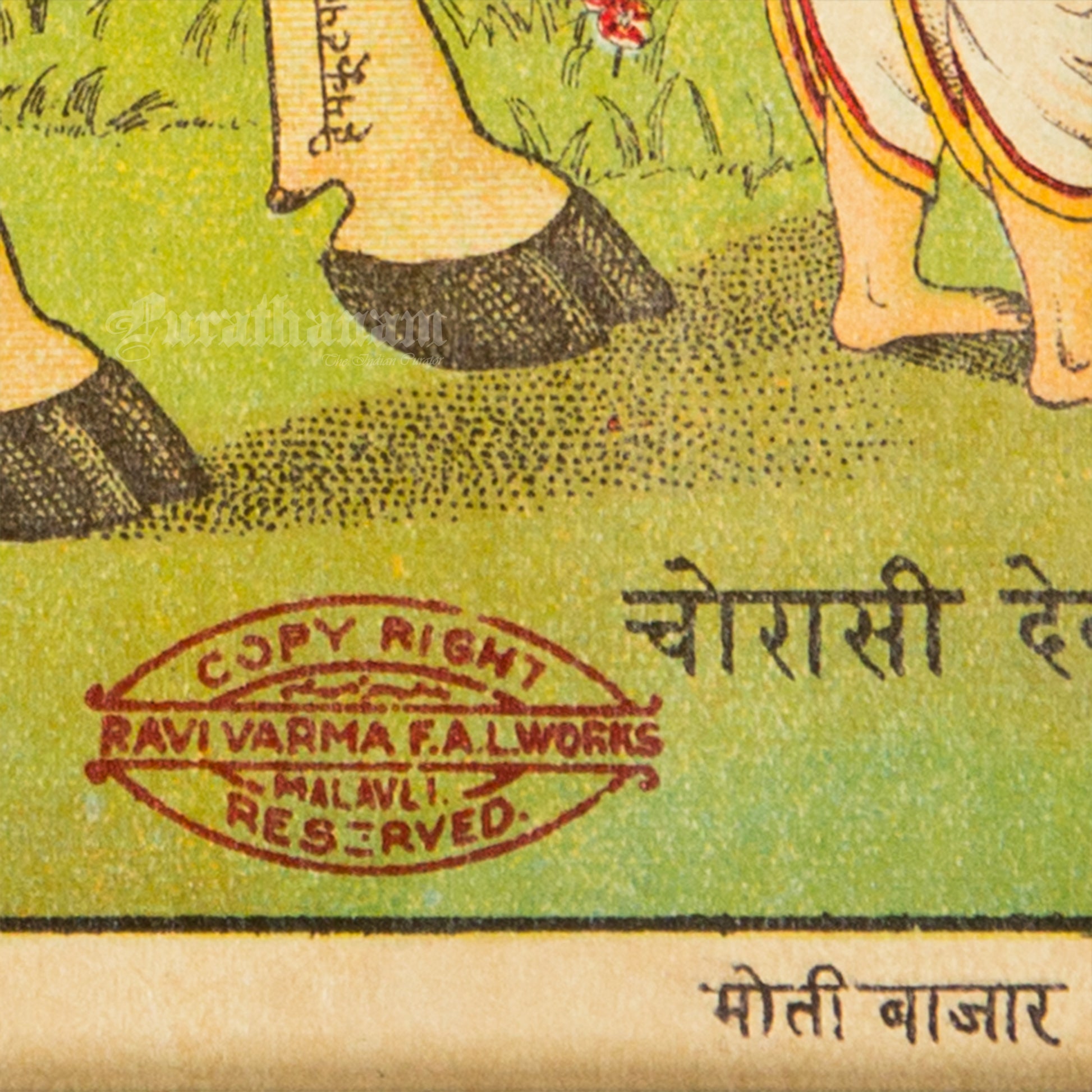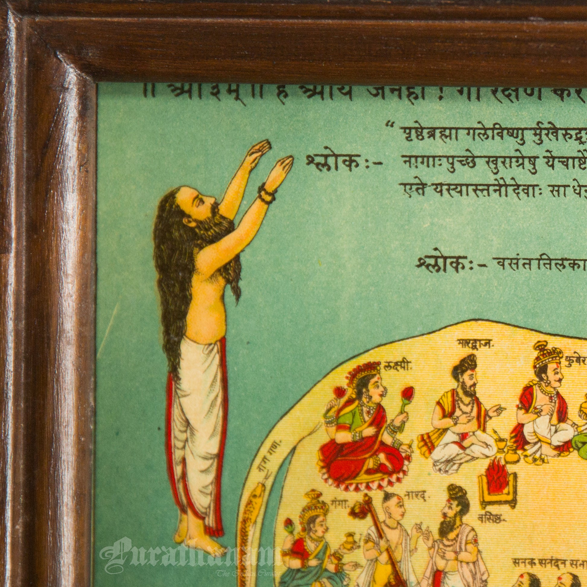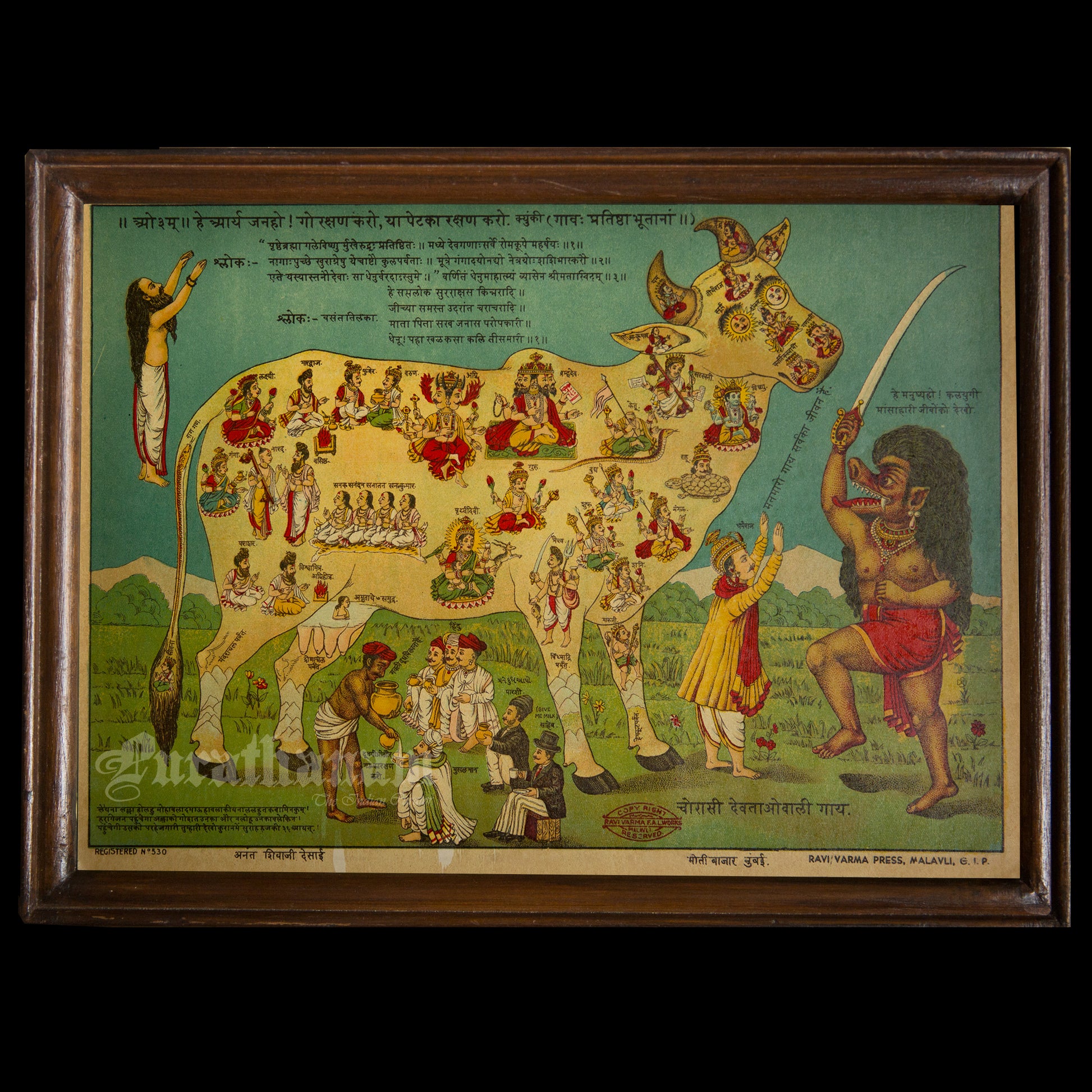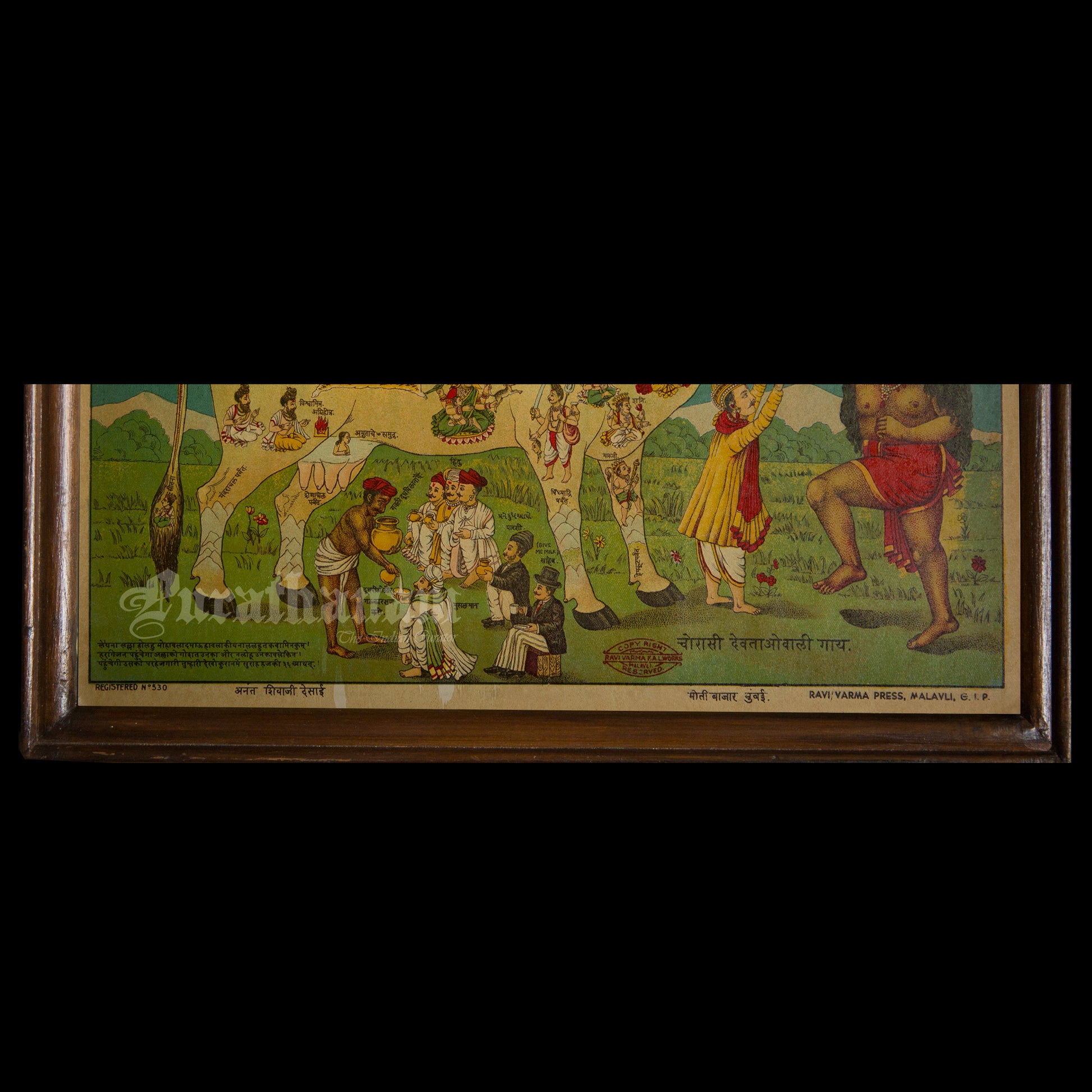 This is an oleograph print from 1920s- 1930s of Chaurasi Devataon-wali Gai or The Cow with 84 deities by Raja Ravi Varma an Indian painter who achieved recognition for his depiction of scenes from the epics of the Mahabharata and Ramayana.