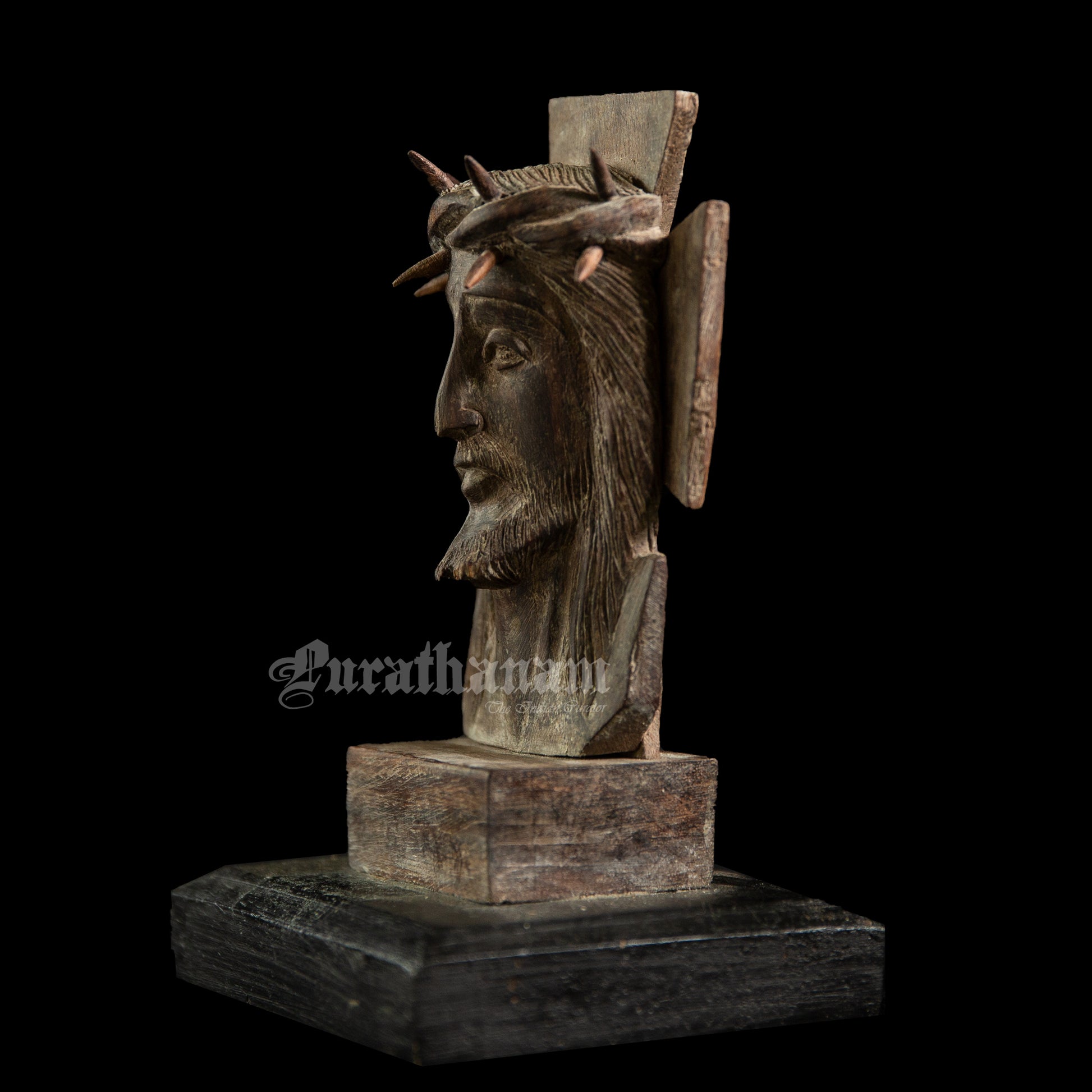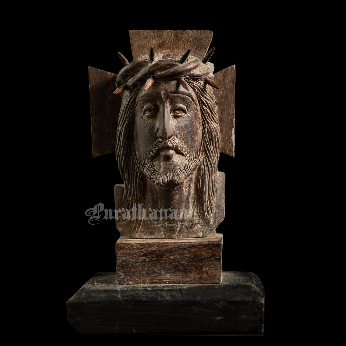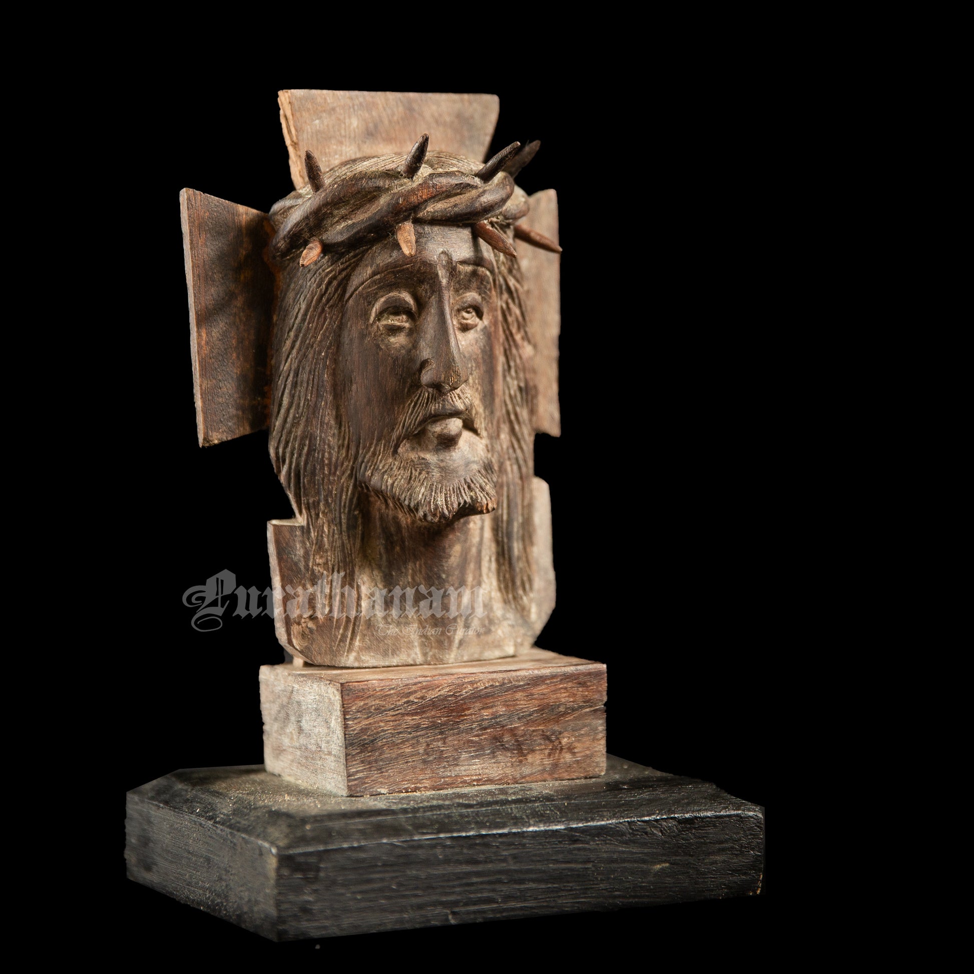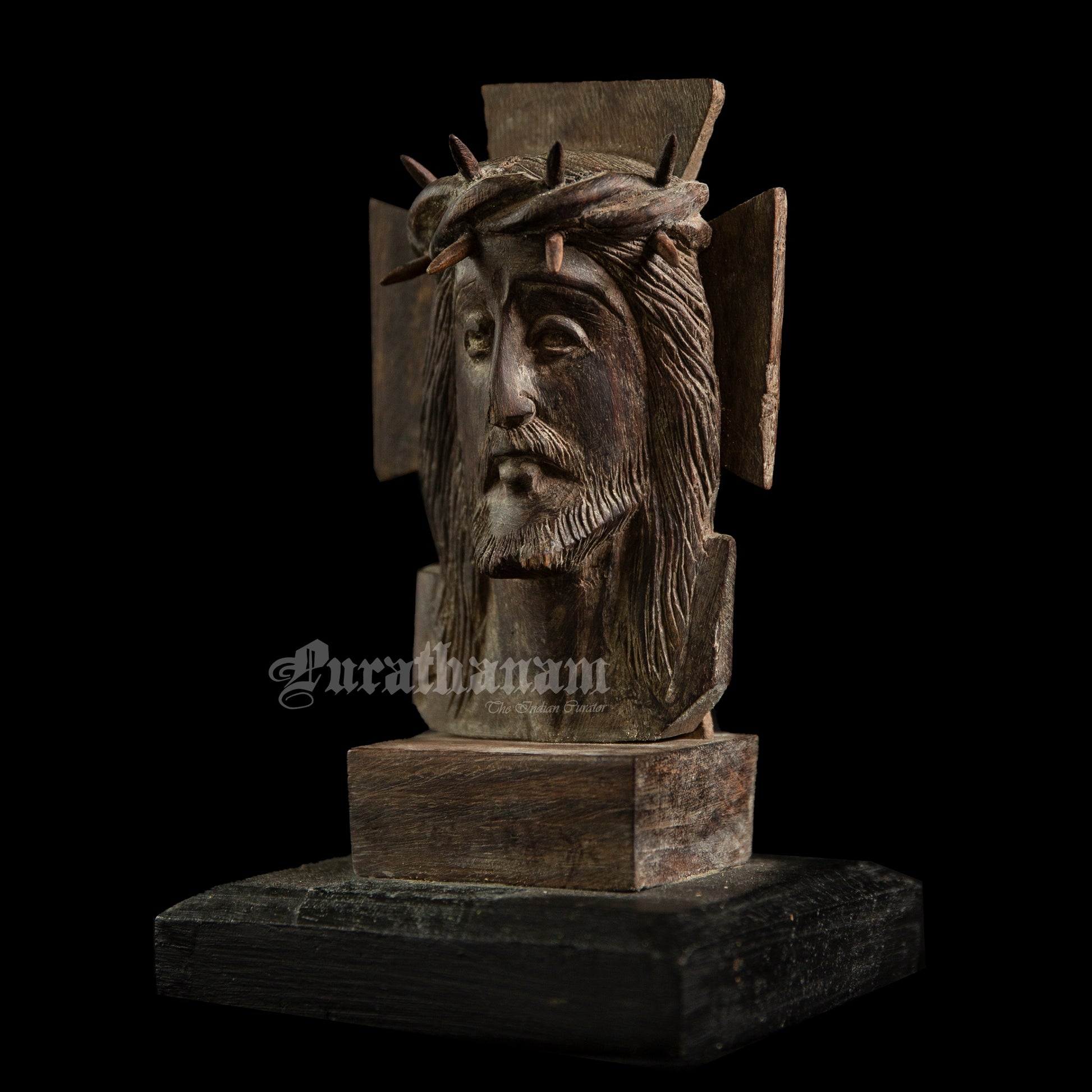 Here is a beautiful wooden sculpture of Jesus Christ head on the cross made of Rosewood by an artisan from South of India. It is about 30 years old.