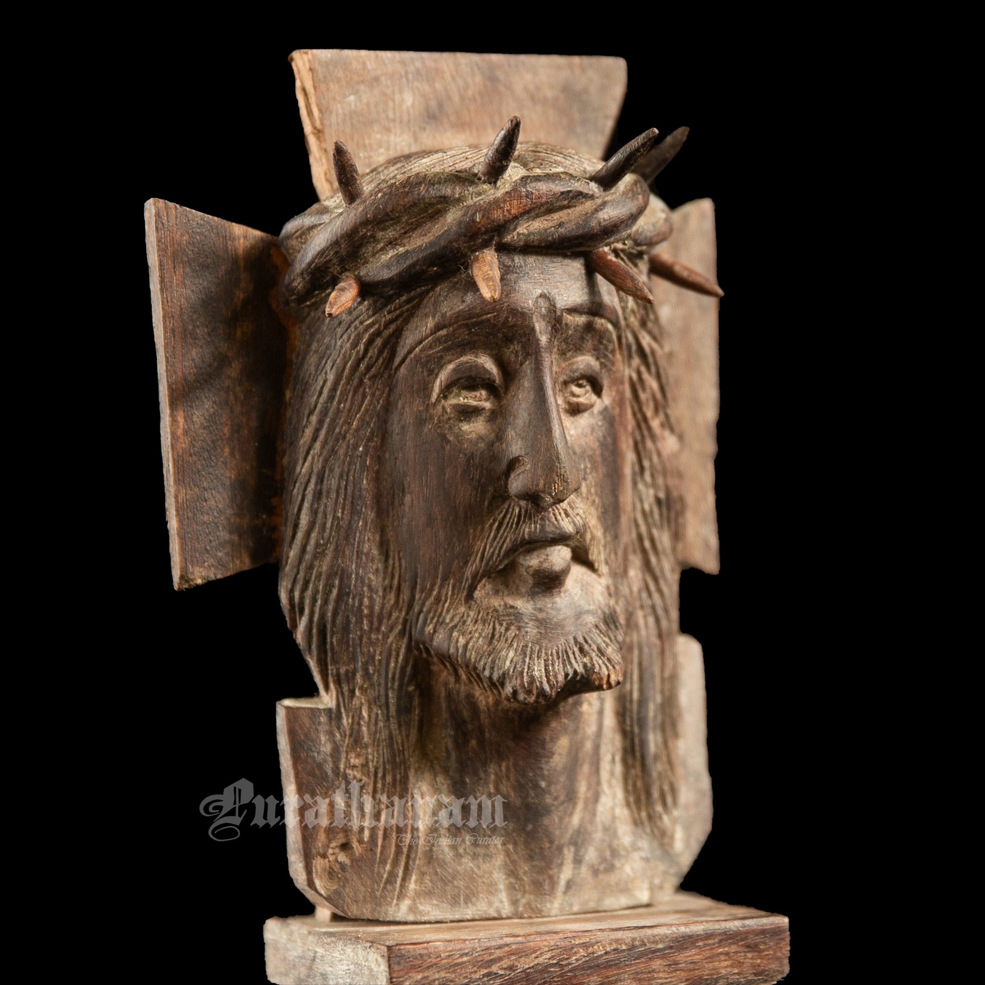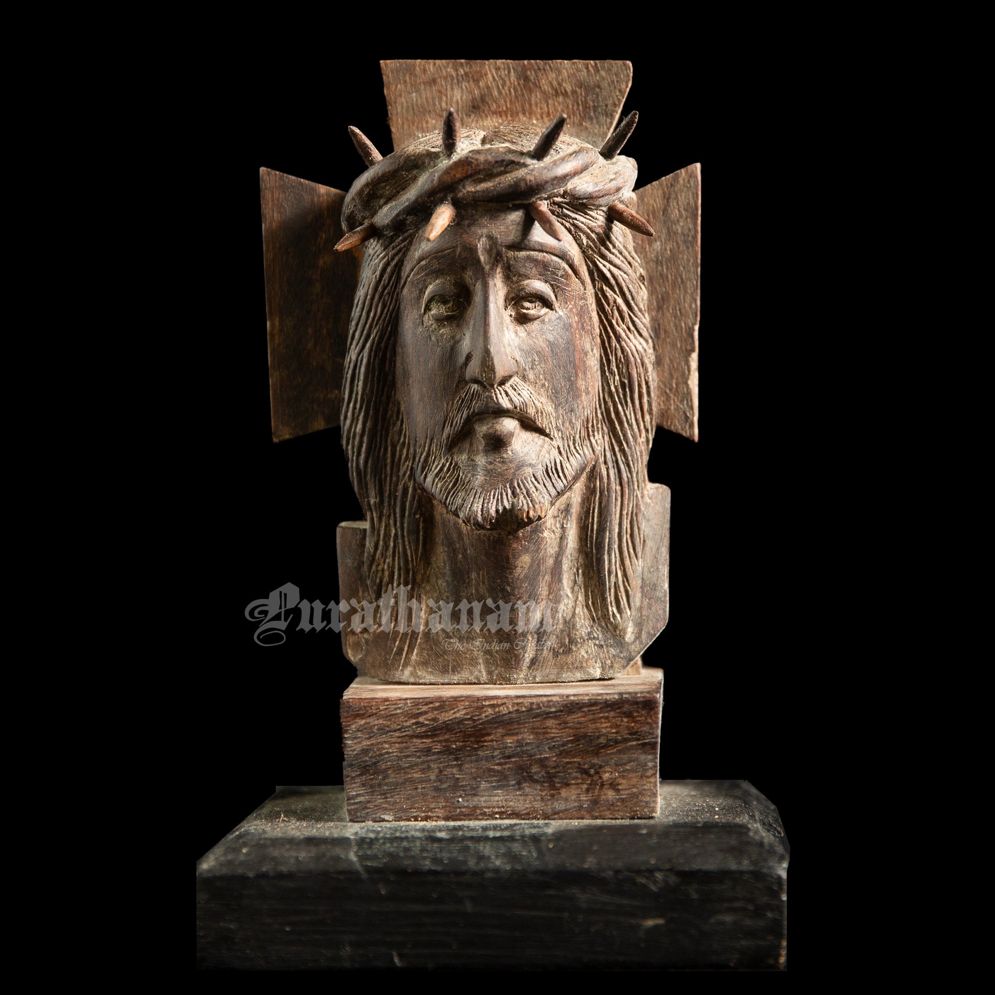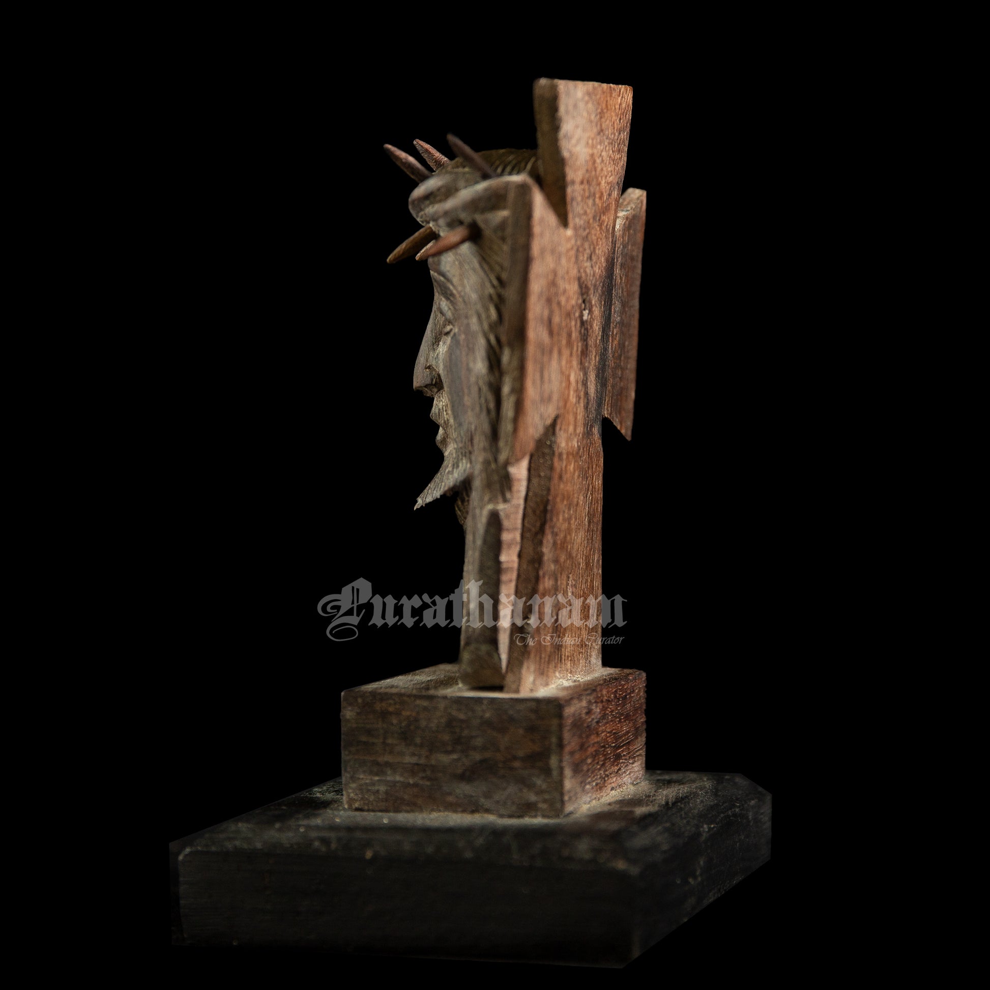 Here is a beautiful wooden sculpture of Jesus Christ head on the cross made of Rosewood by an artisan from South of India. It is about 30 years old.