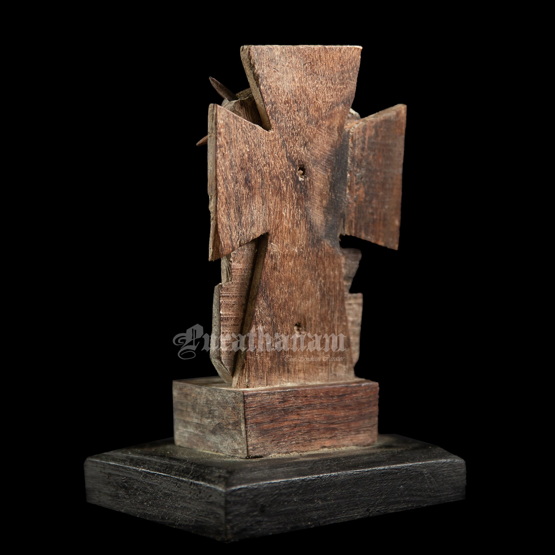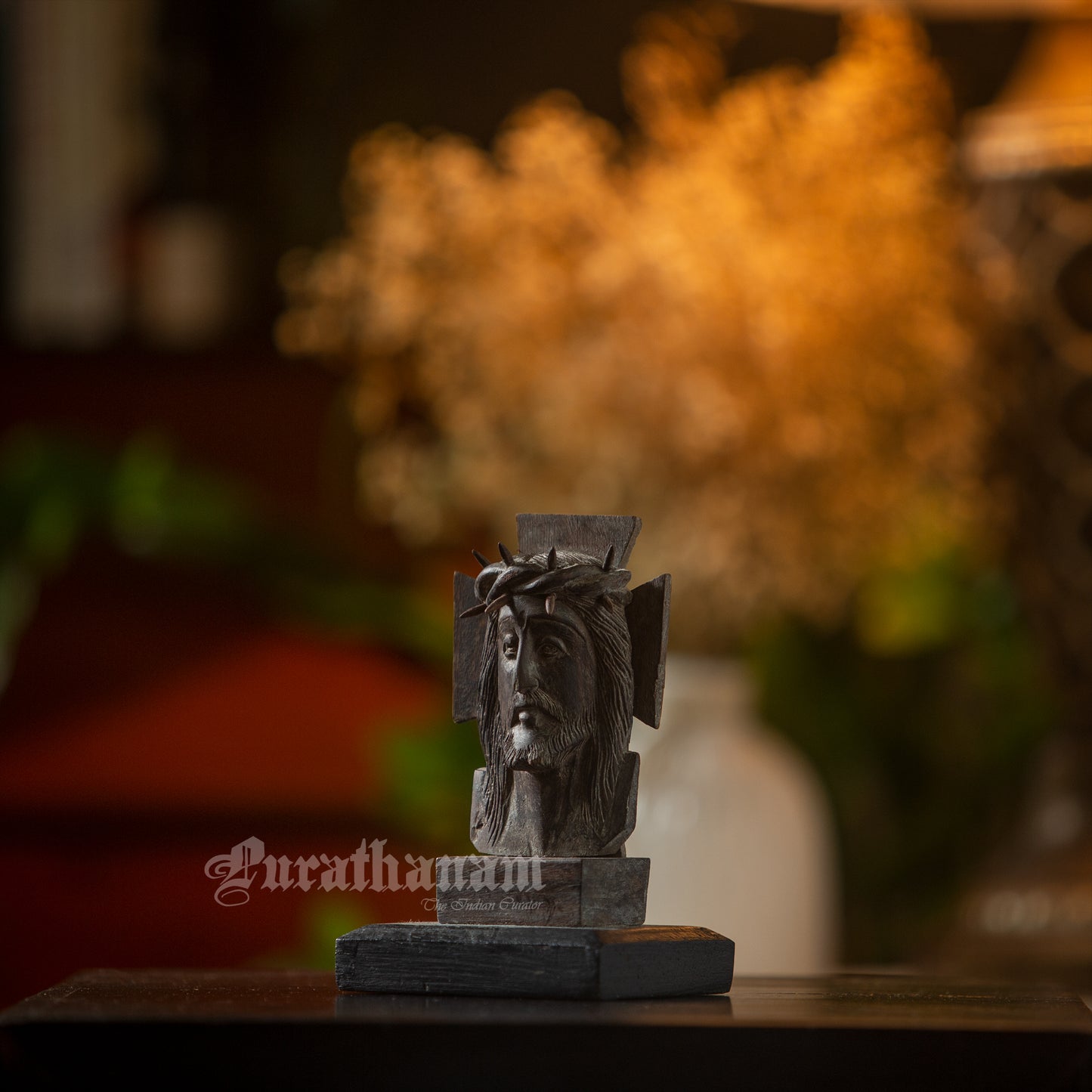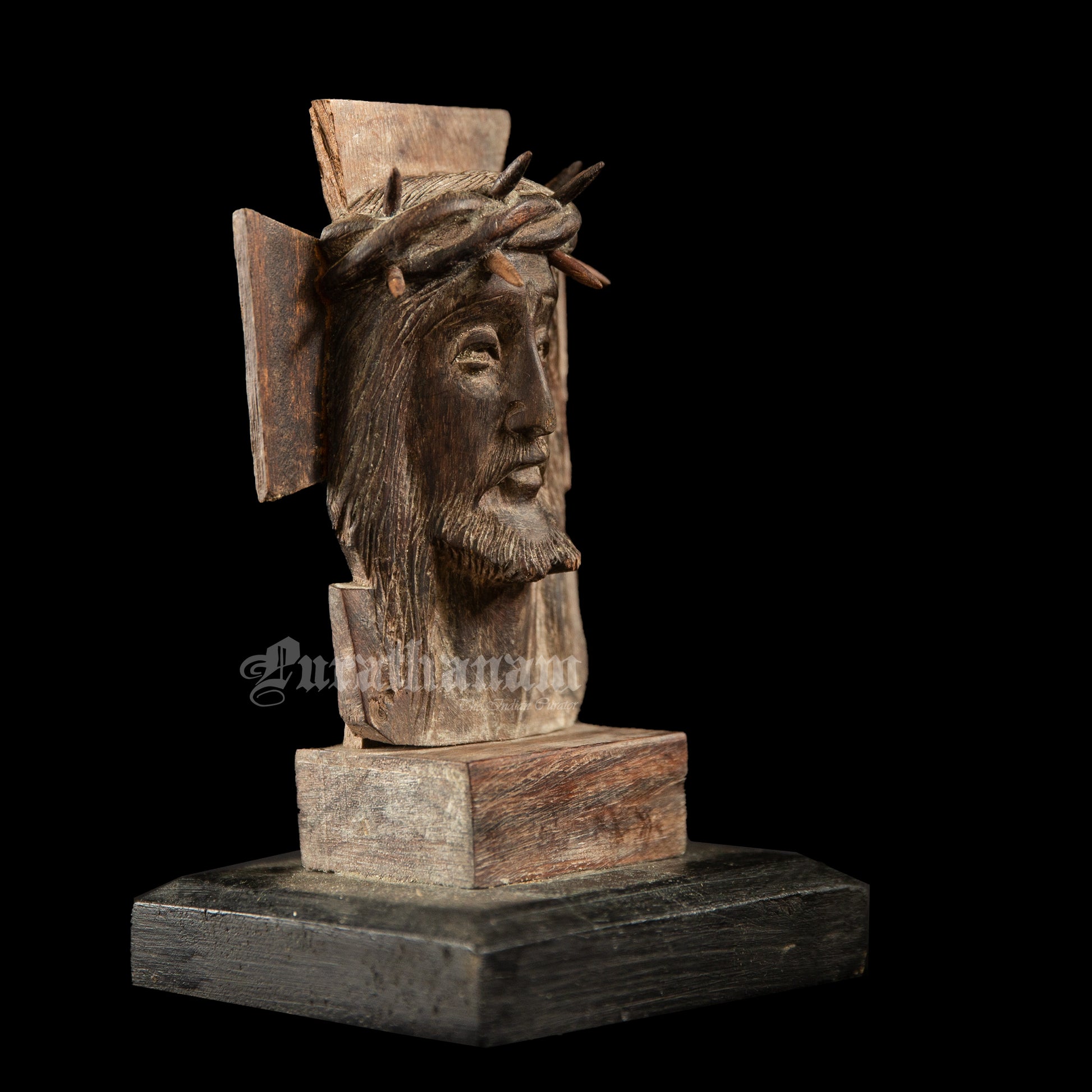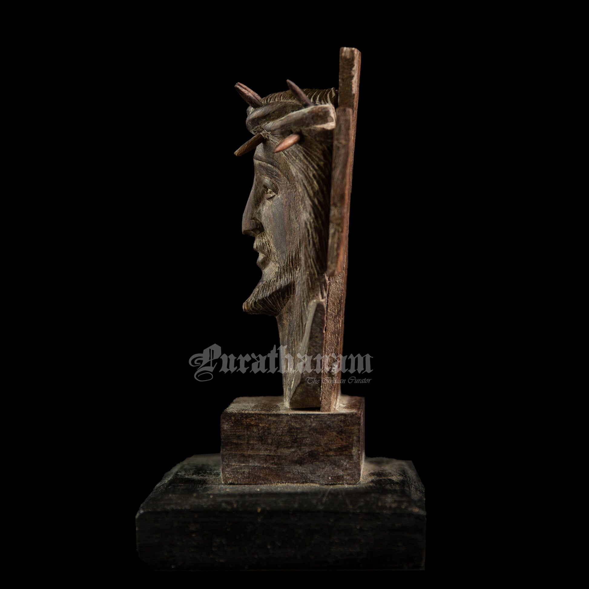 Here is a beautiful wooden sculpture of Jesus Christ head on the cross made of Rosewood by an artisan from South of India. It is about 30 years old.