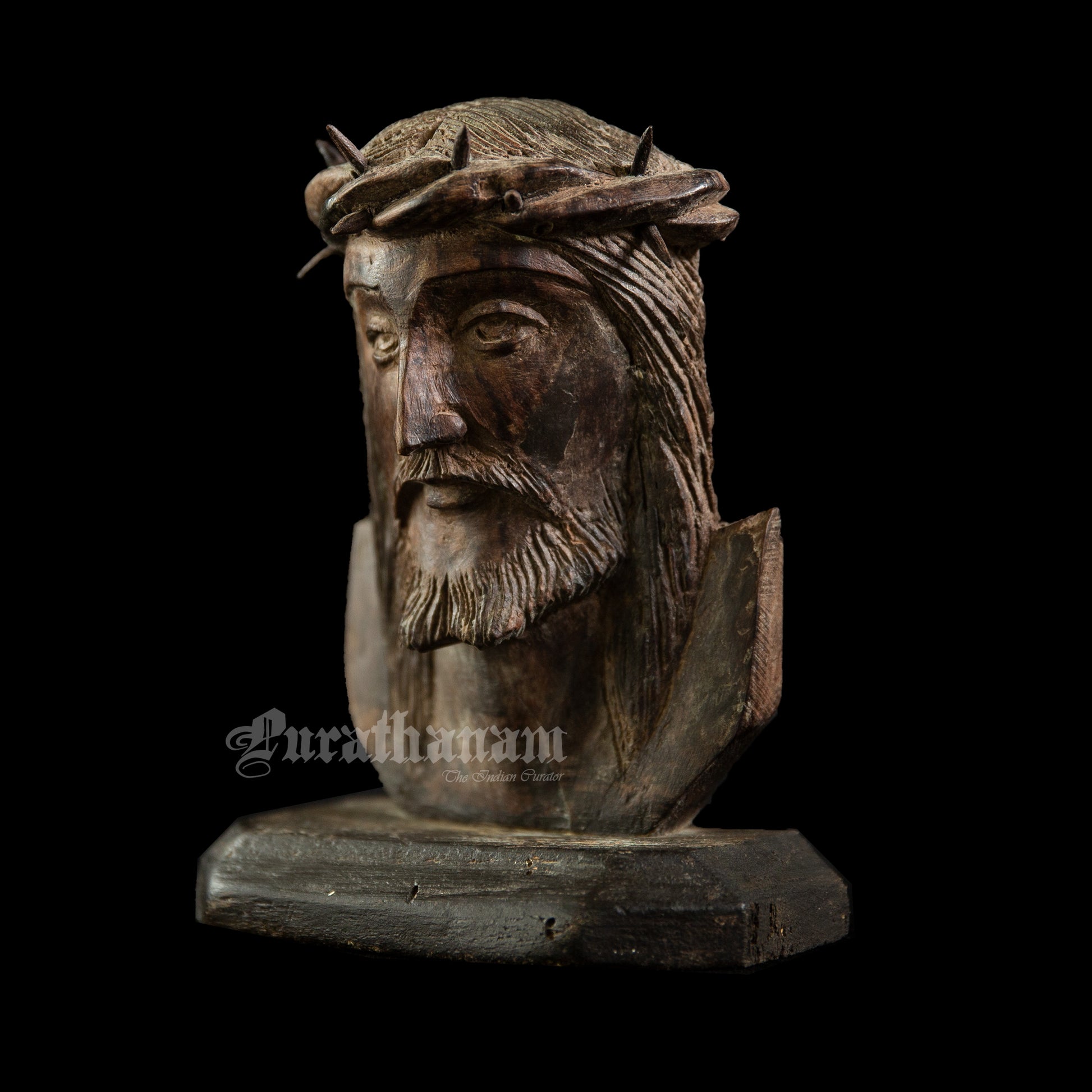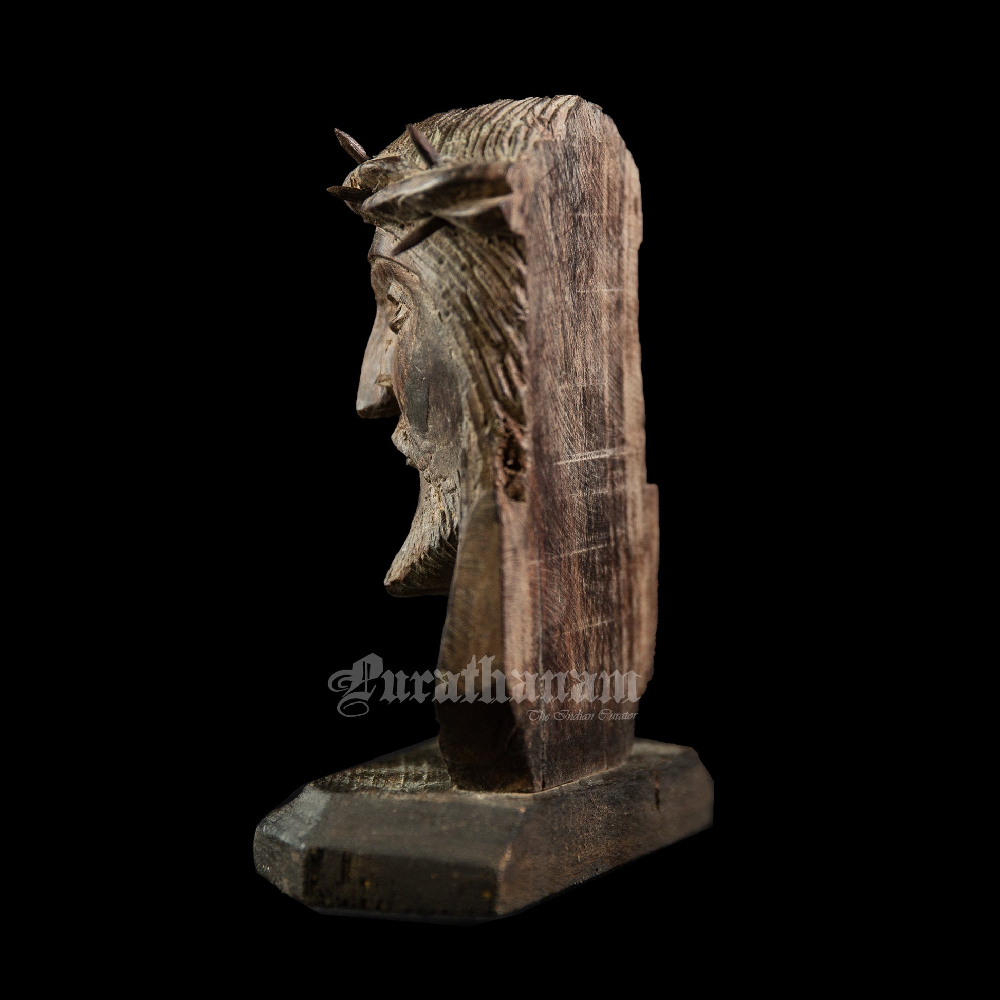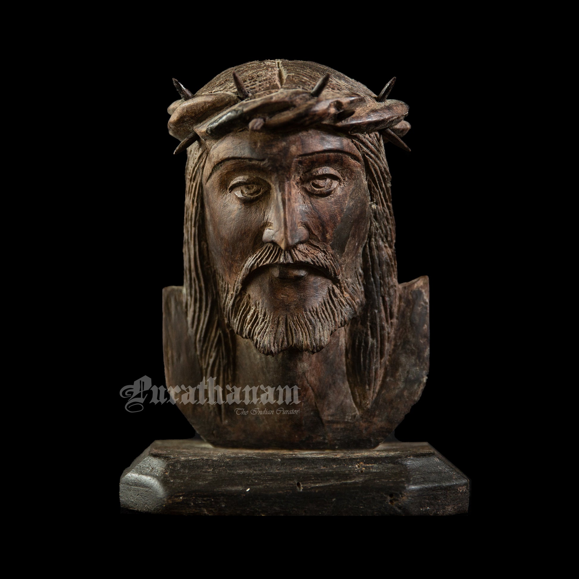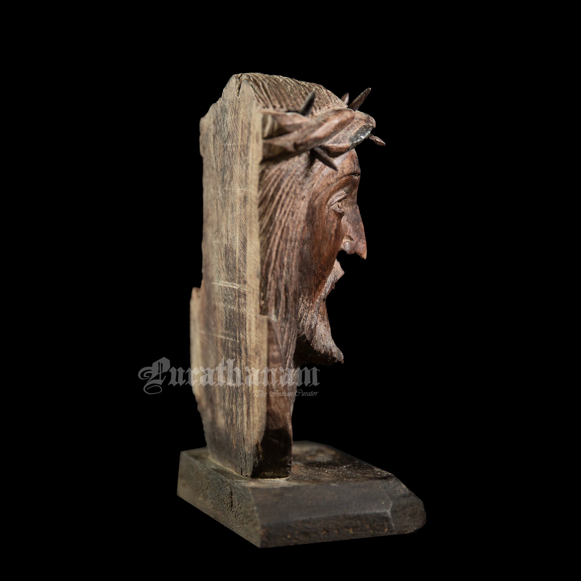 Here is a beautiful wooden sculpture of Jesus Christ head on the cross made of Rosewood by an artisan from South of India. It is about 30 years old.