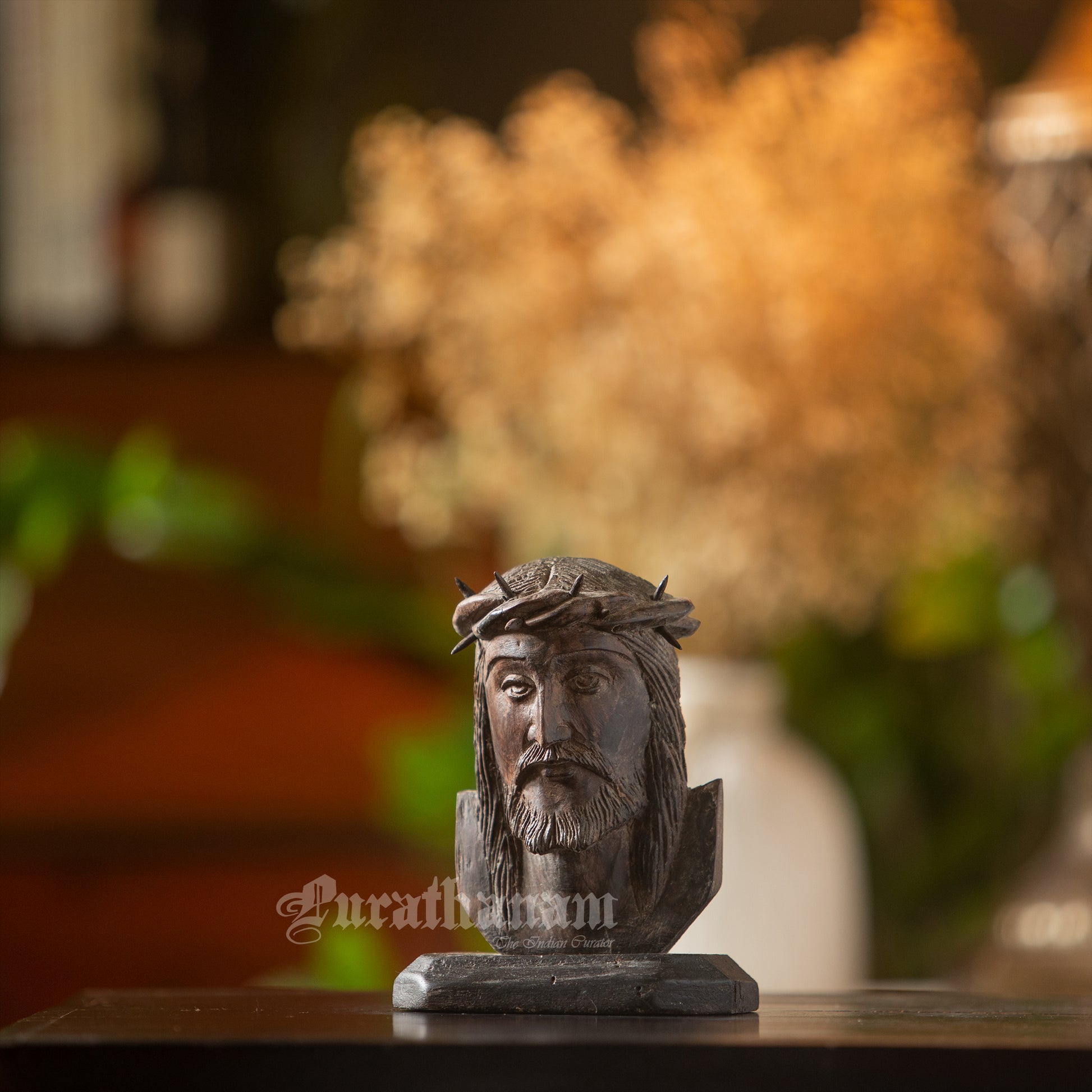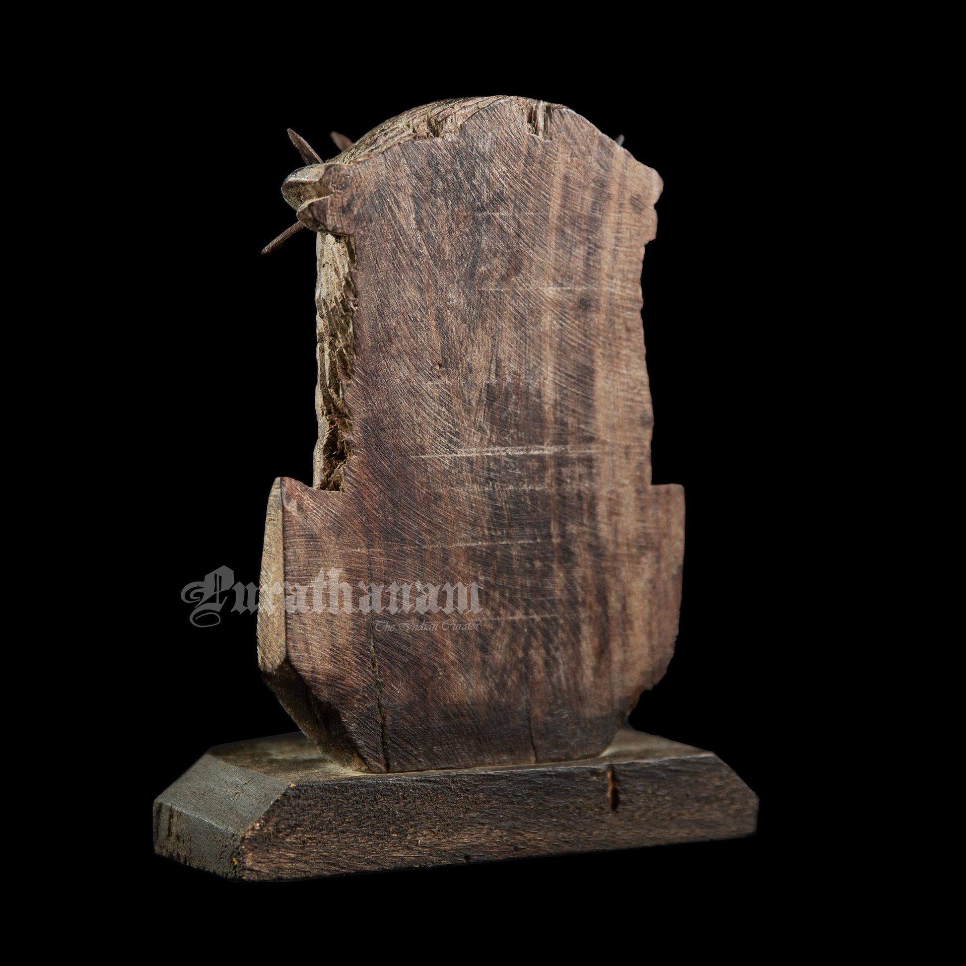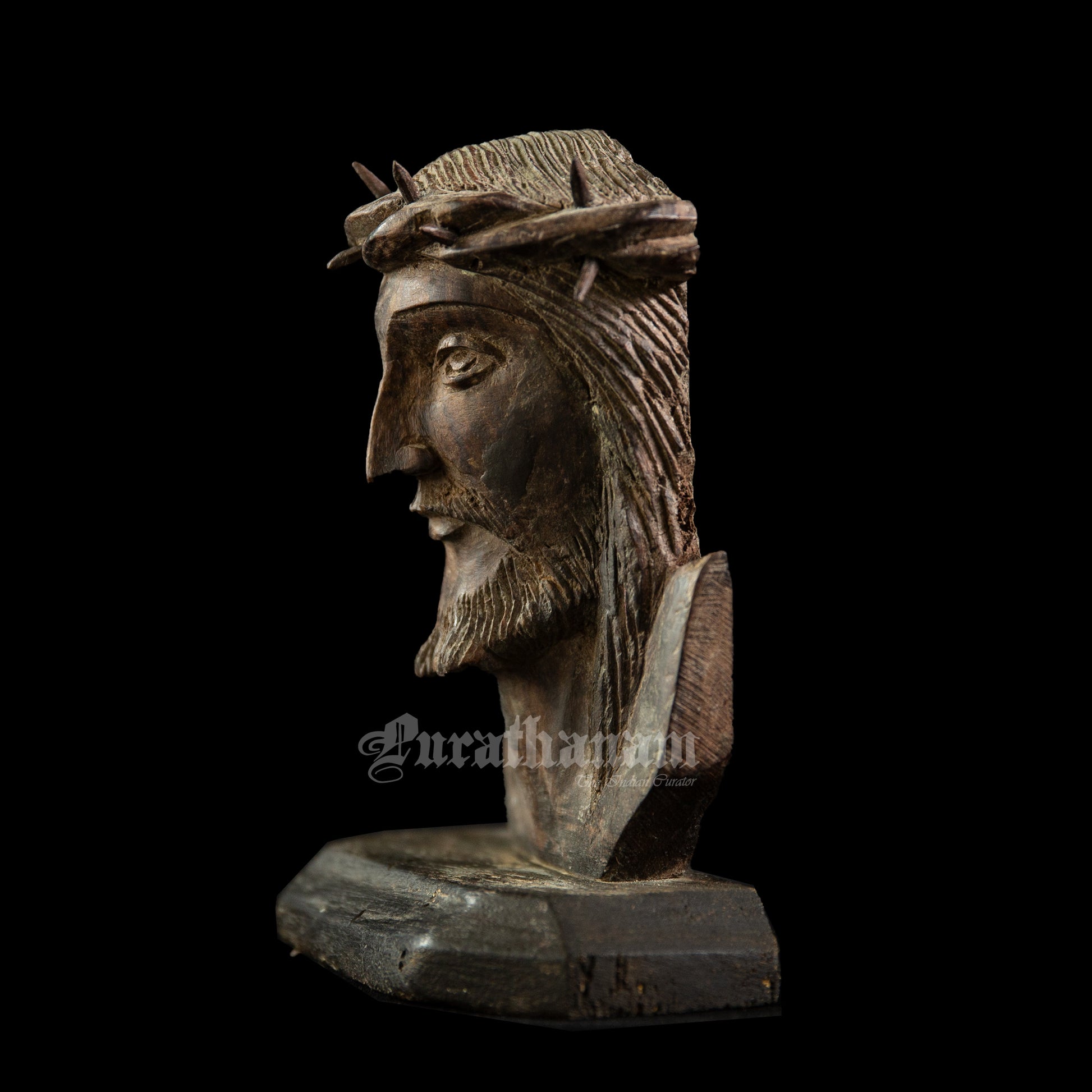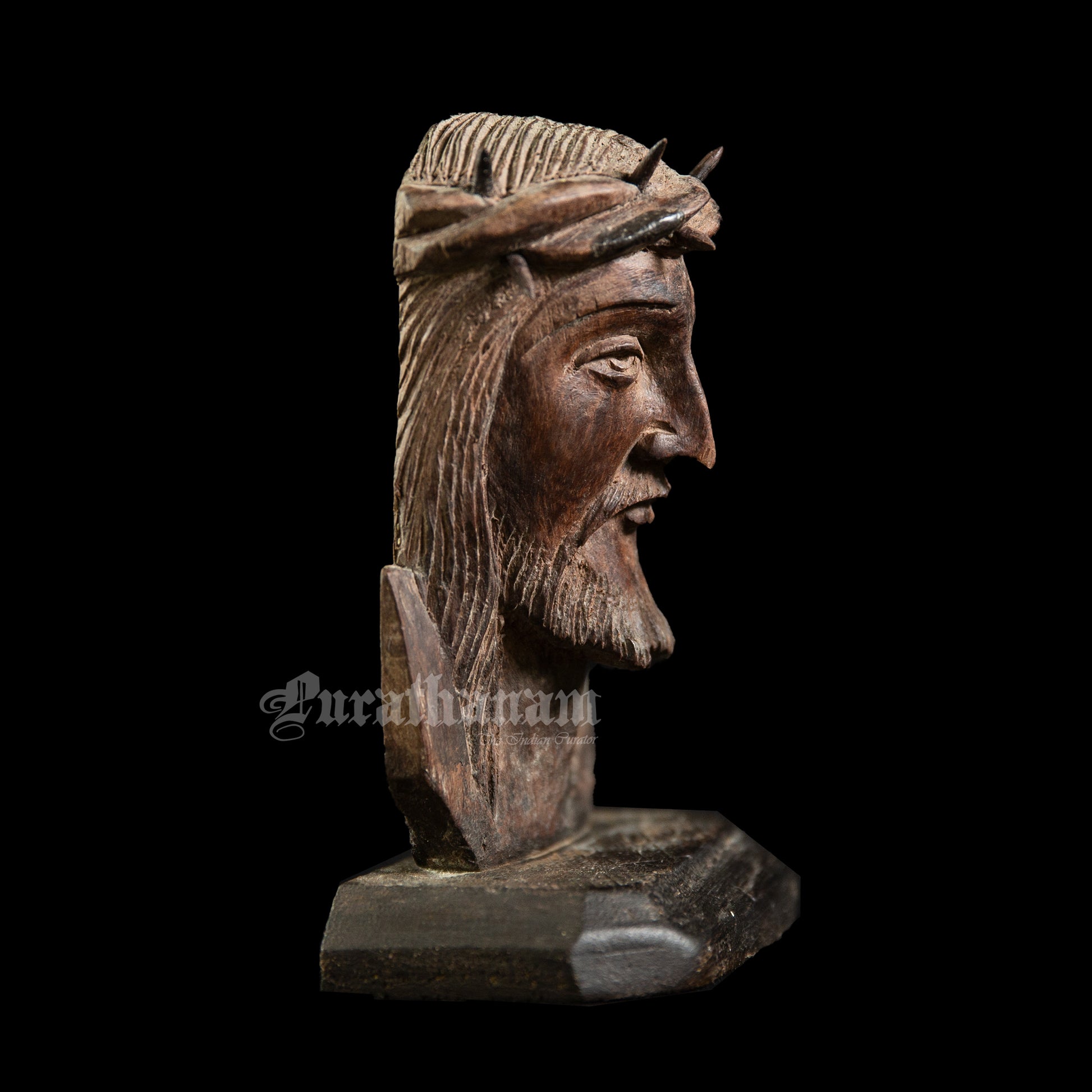 Here is a beautiful wooden sculpture of Jesus Christ head on the cross made of Rosewood by an artisan from South of India. It is about 30 years old.