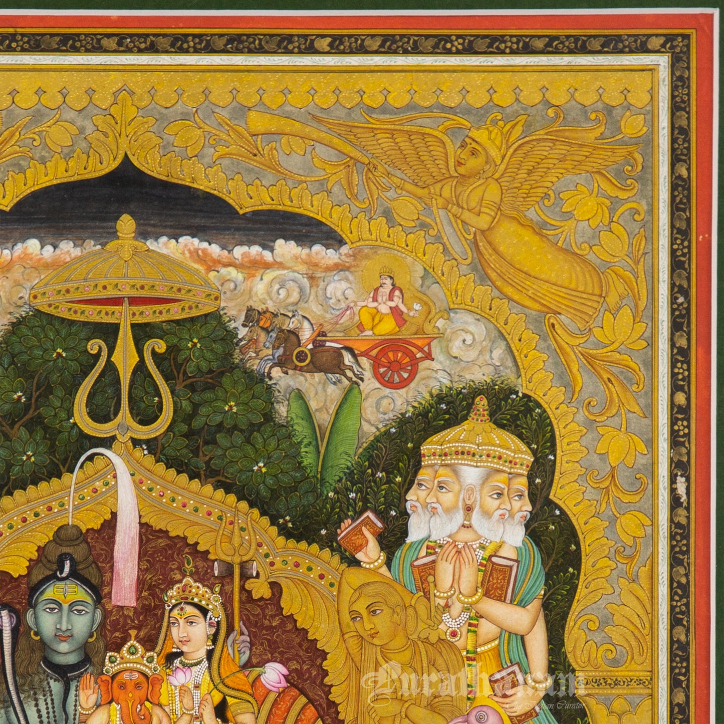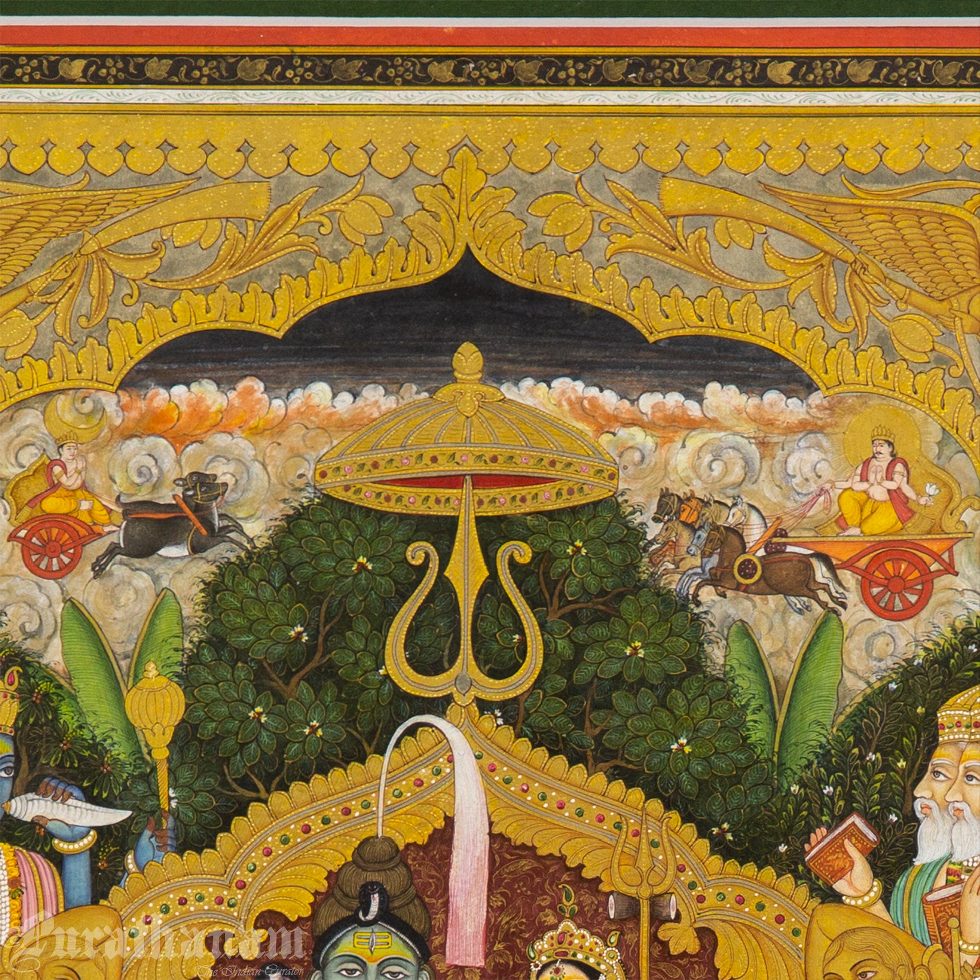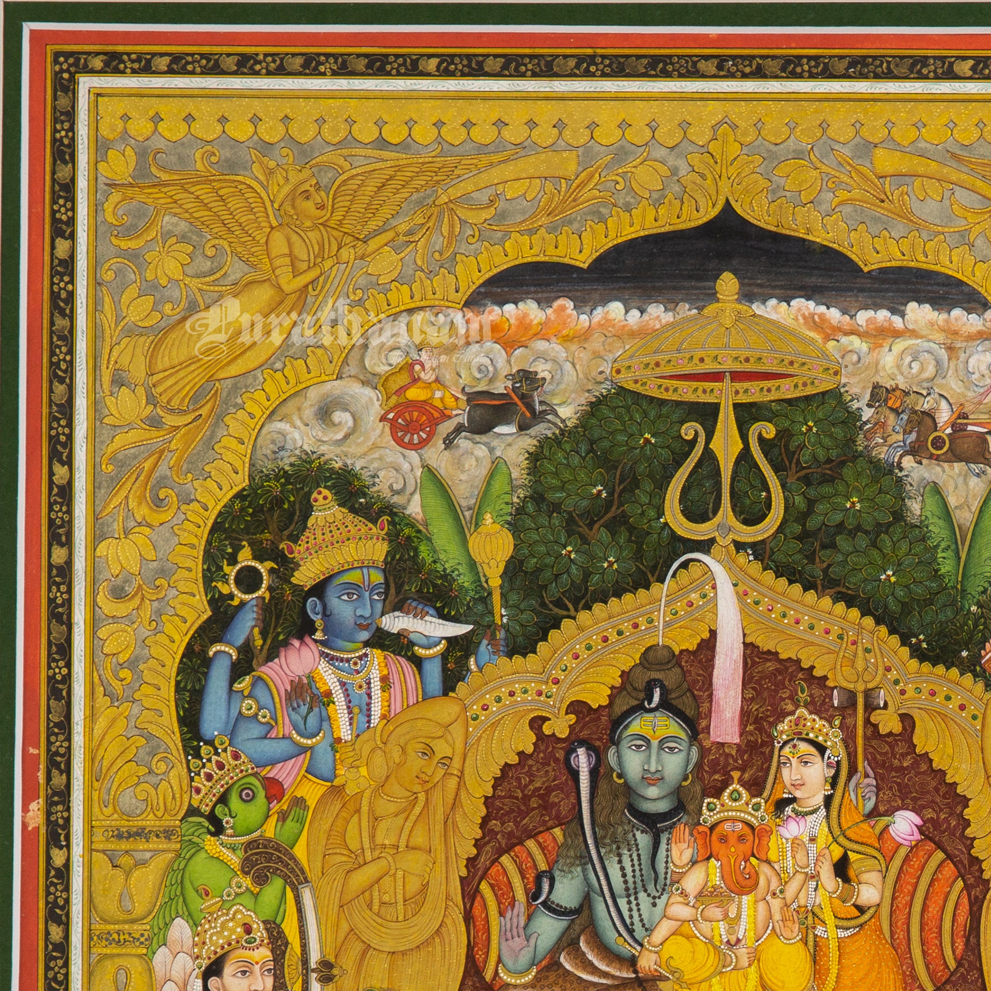 This is a beautiful Rajasthani miniature painting, created around 50 years ago in Jaipur. It depicts a cosmic darbar—a divine court where gods and goddesses gather together in harmony.