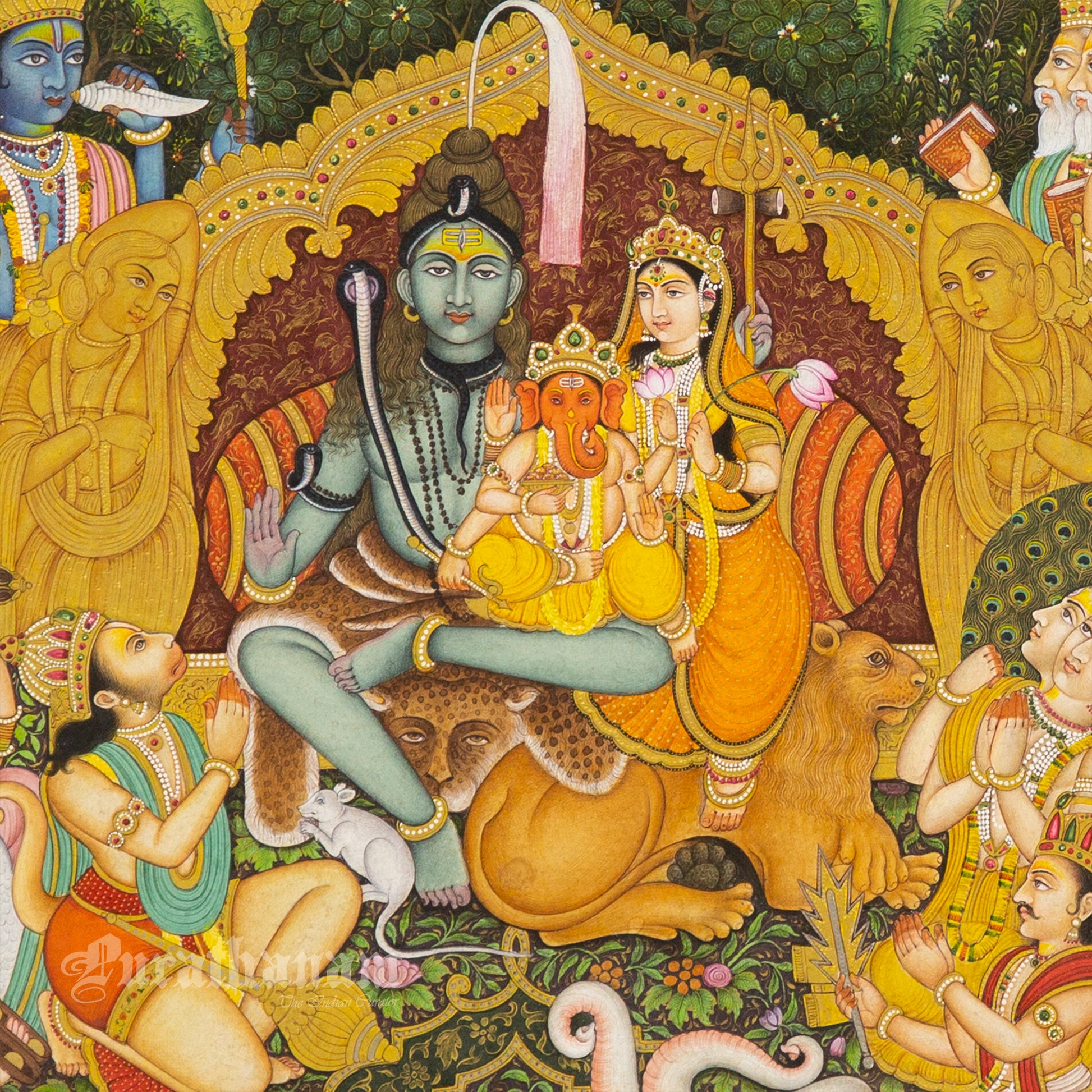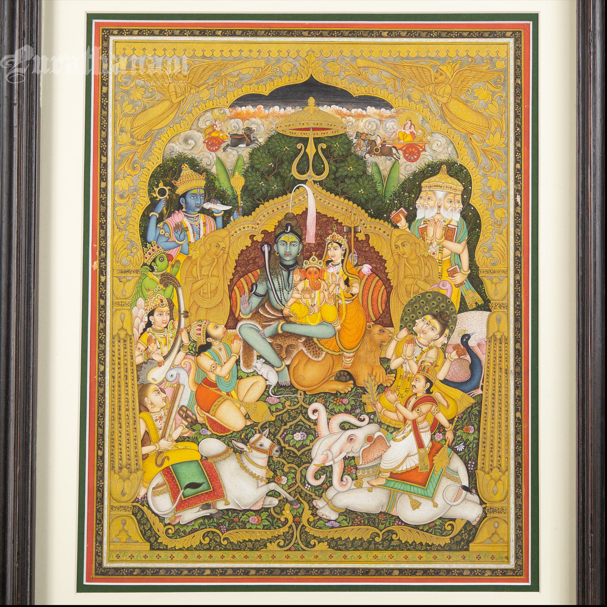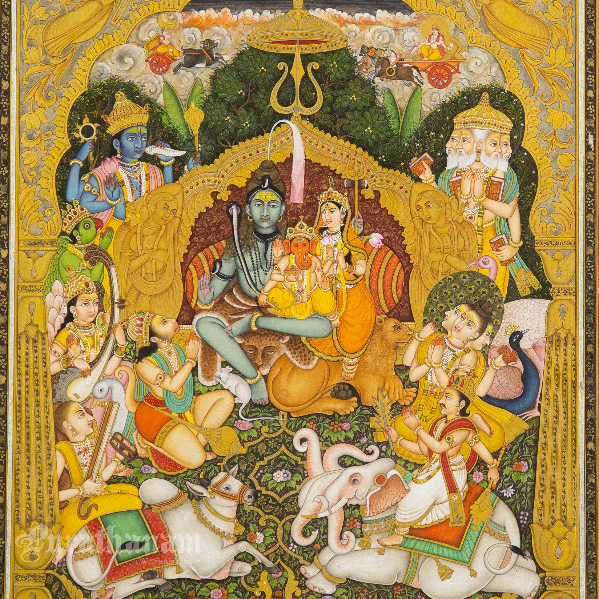 This is a beautiful Rajasthani miniature painting, created around 50 years ago in Jaipur. It depicts a cosmic darbar—a divine court where gods and goddesses gather together in harmony.