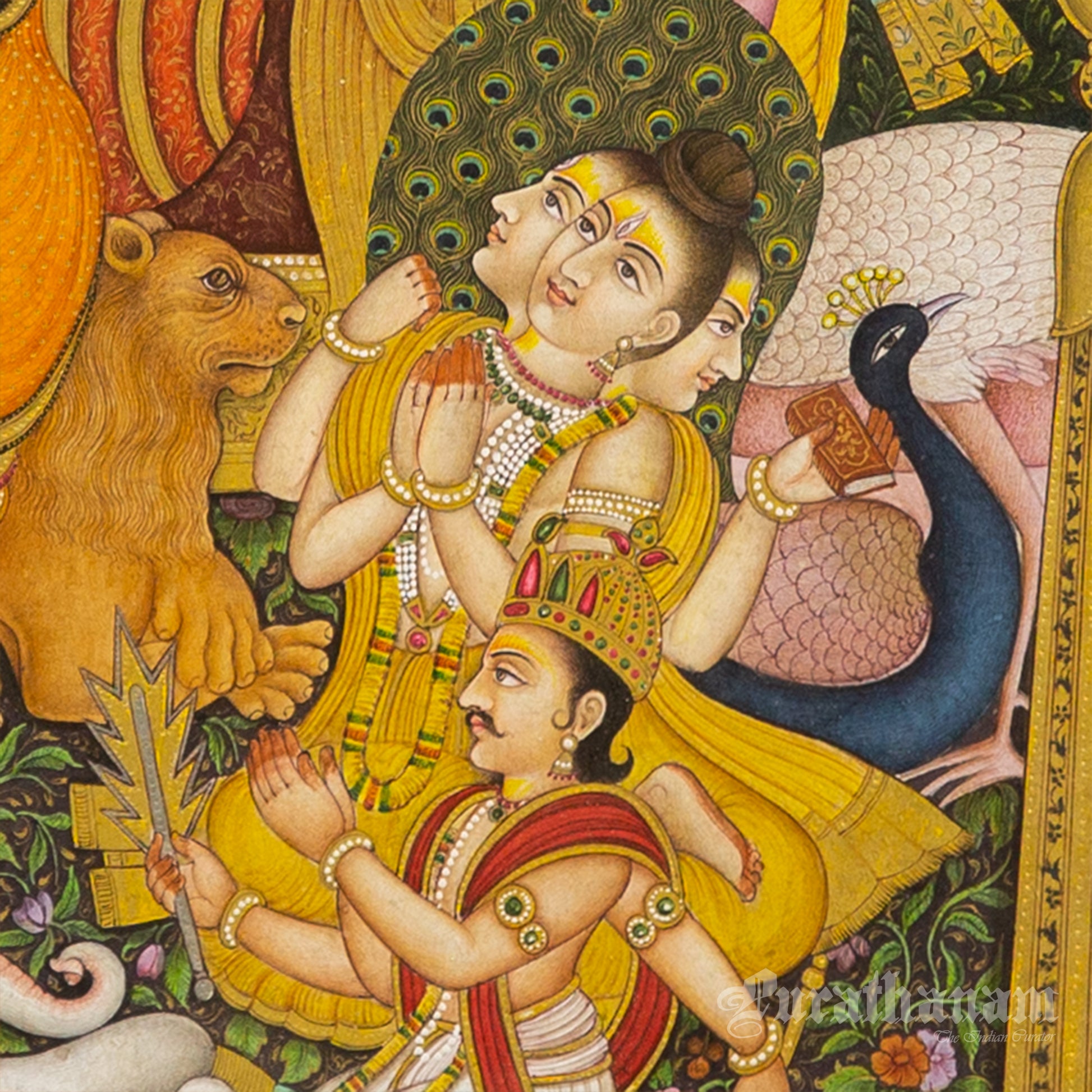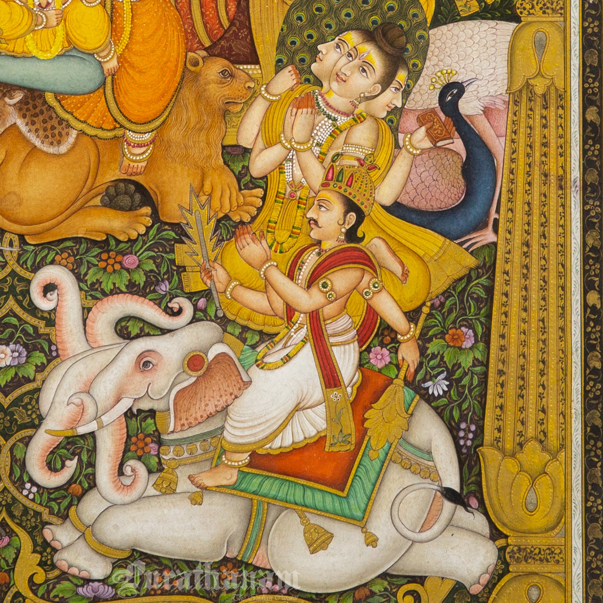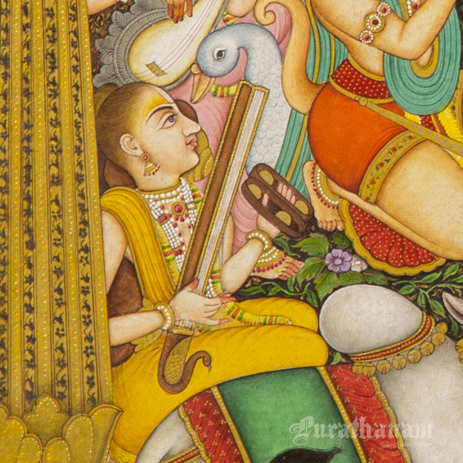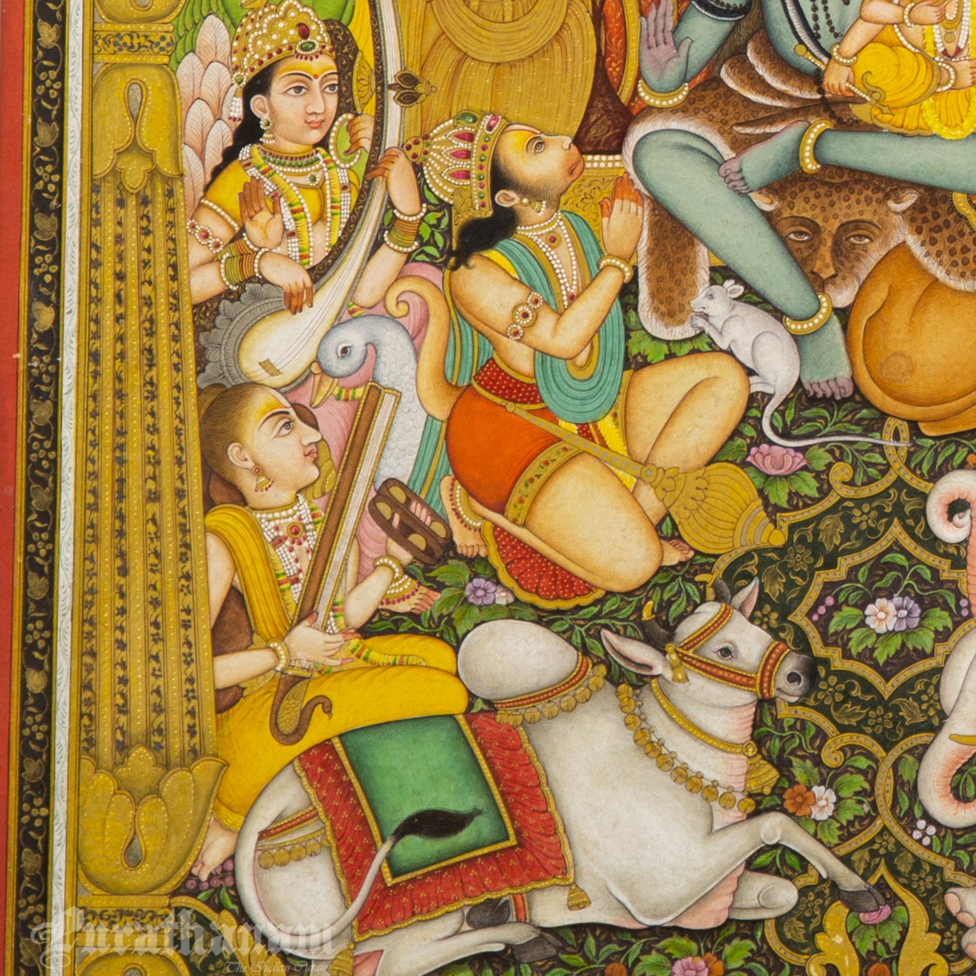 At the center of the darbar, Lord Shiva is seated with Parvati, holding their eldest son Ganesha on his lap. Surrounding them are Vishnu, Saraswati, Garuda Hanuman, Narada, Indra, Karthik and Brahma, along with their respective vahanas (Vehicles); Swan (Annapakshi), rat, lioness, nandi (the sacred bull), peacock,, and a six-headed white elephant. The artist has imagined all of them together in one divine space, filled with grace and harmony. The gold detailing adds a divine glow, a technique often used to show the spiritual energy of gods. Every figure is carefully painted, showing movement, emotion, and devotion. This is more than just a painting. It’s a sacred scene, captured within a small frame. A true tribute to the artist’s skill.