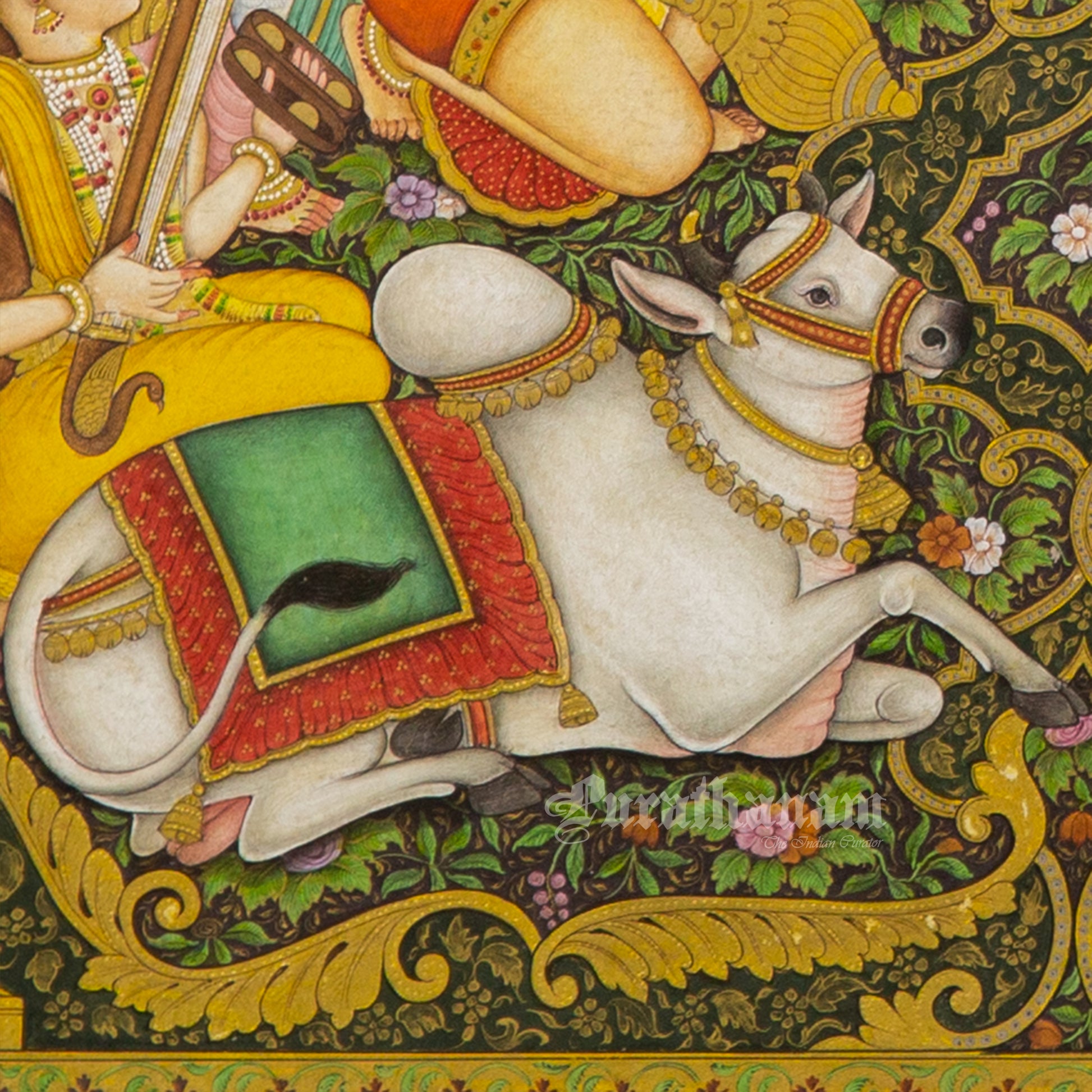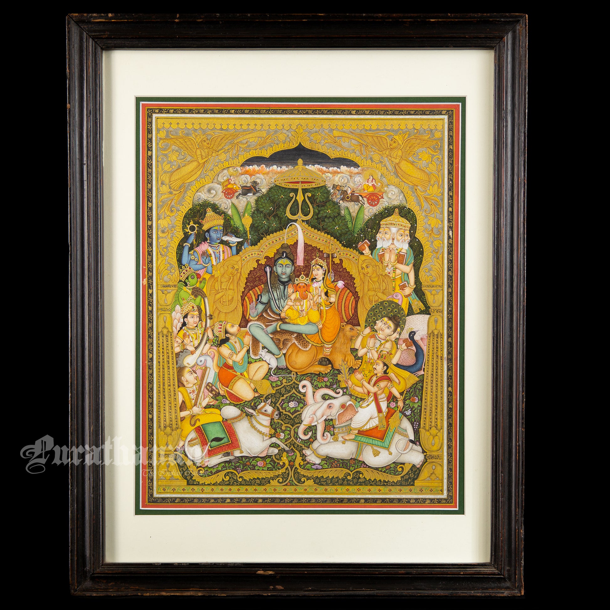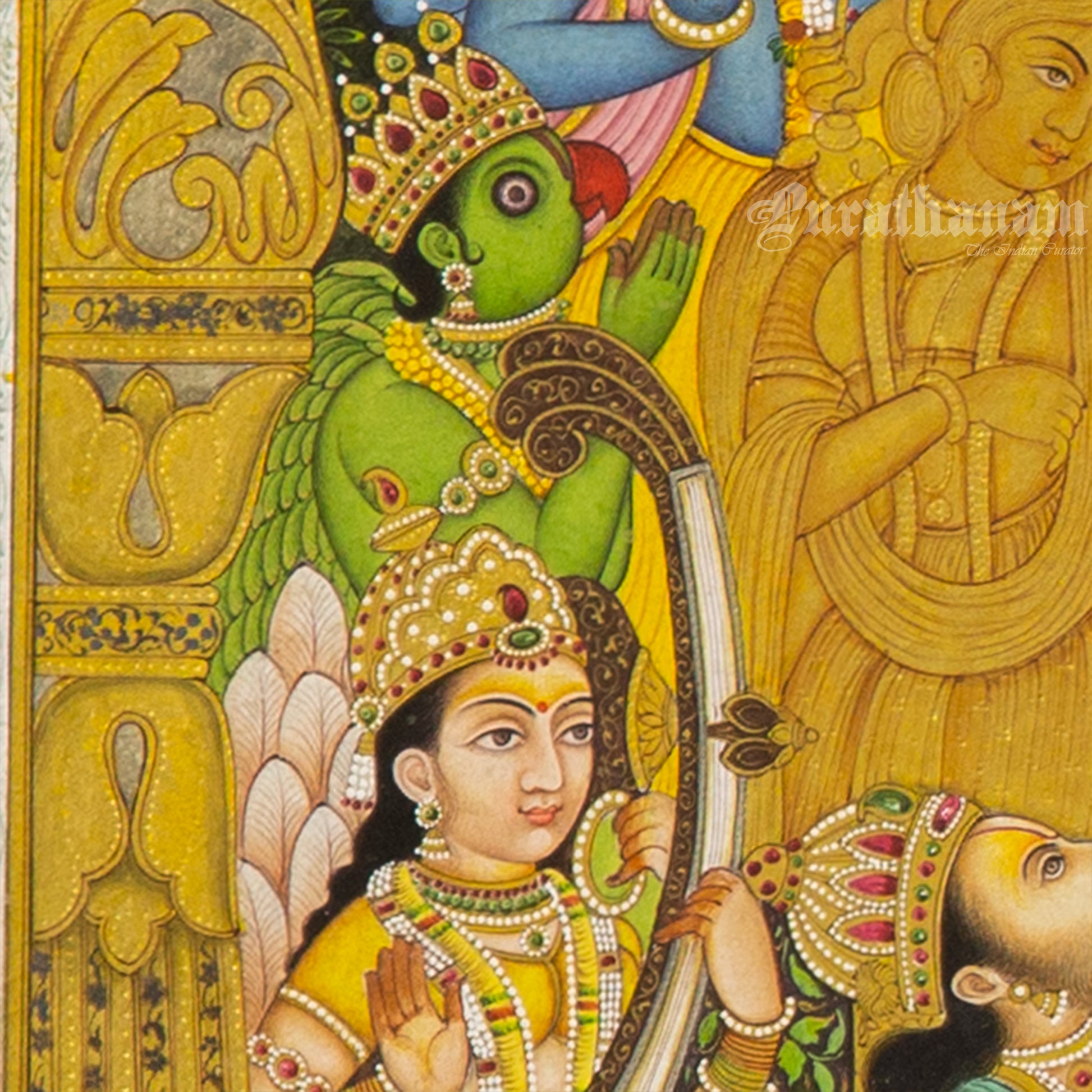 At the center of the darbar, Lord Shiva is seated with Parvati, holding their eldest son Ganesha on his lap. Surrounding them are Vishnu, Saraswati, Garuda Hanuman, Narada, Indra, Karthik and Brahma, along with their respective vahanas (Vehicles); Swan (Annapakshi), rat, lioness, nandi (the sacred bull), peacock,, and a six-headed white elephant. The artist has imagined all of them together in one divine space, filled with grace and harmony. The gold detailing adds a divine glow, a technique often used to show the spiritual energy of gods. Every figure is carefully painted, showing movement, emotion, and devotion. This is more than just a painting. It’s a sacred scene, captured within a small frame. A true tribute to the artist’s skill.