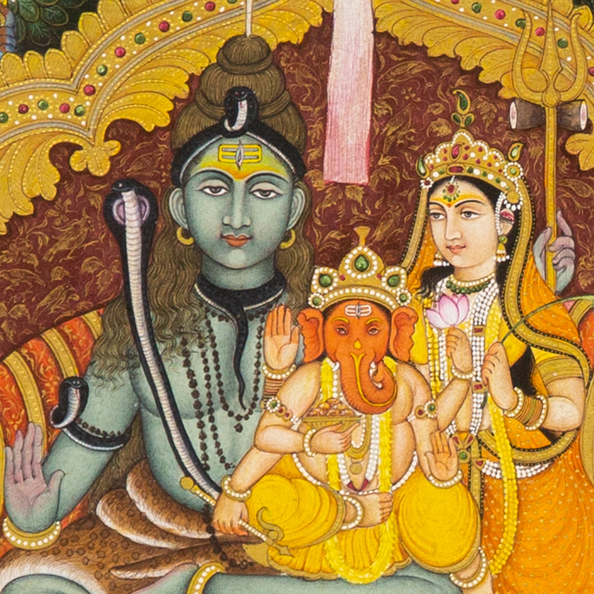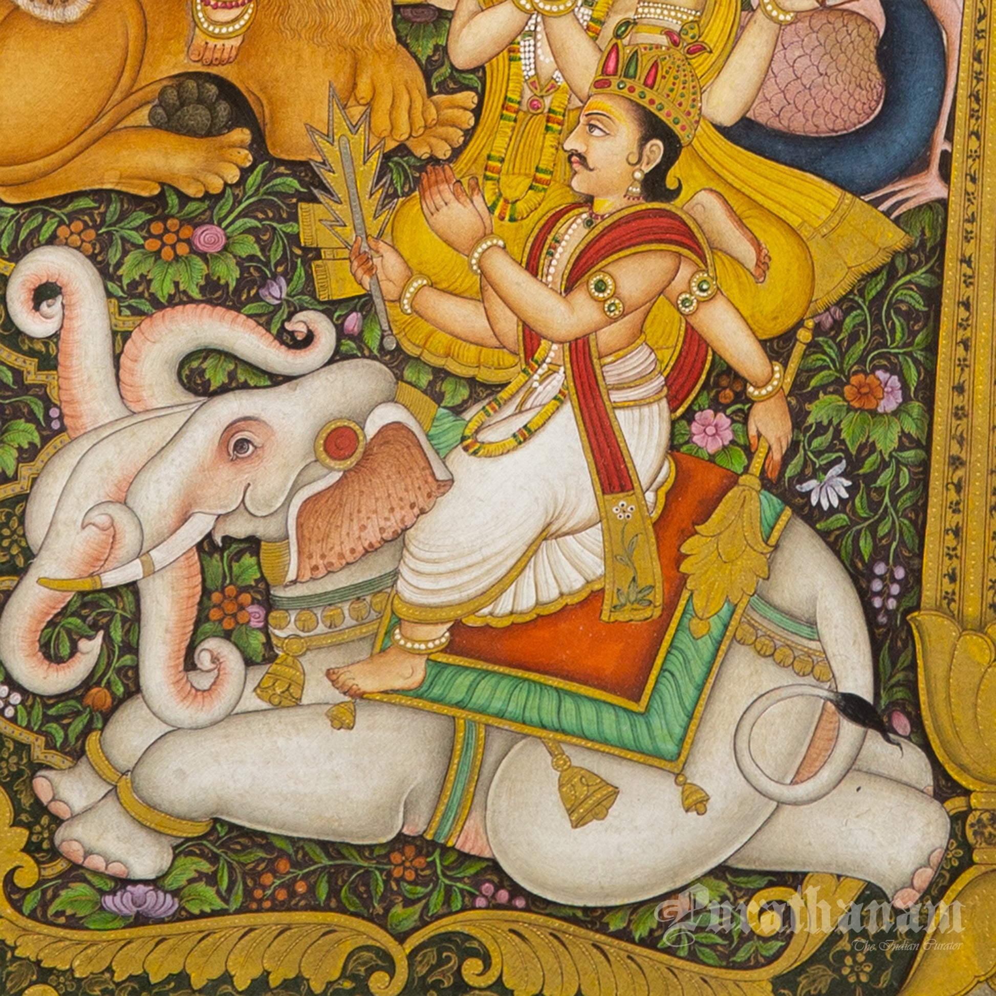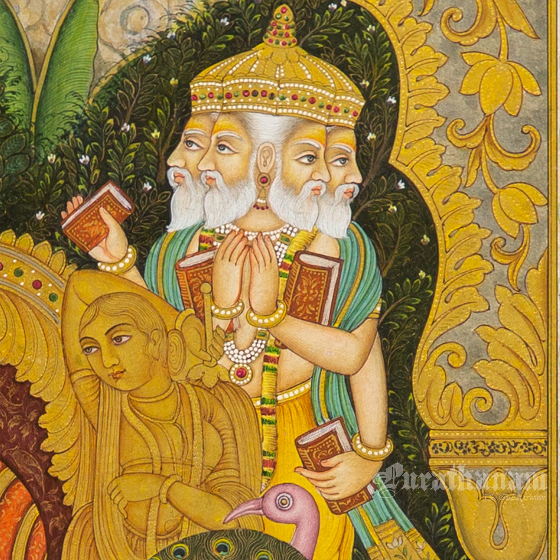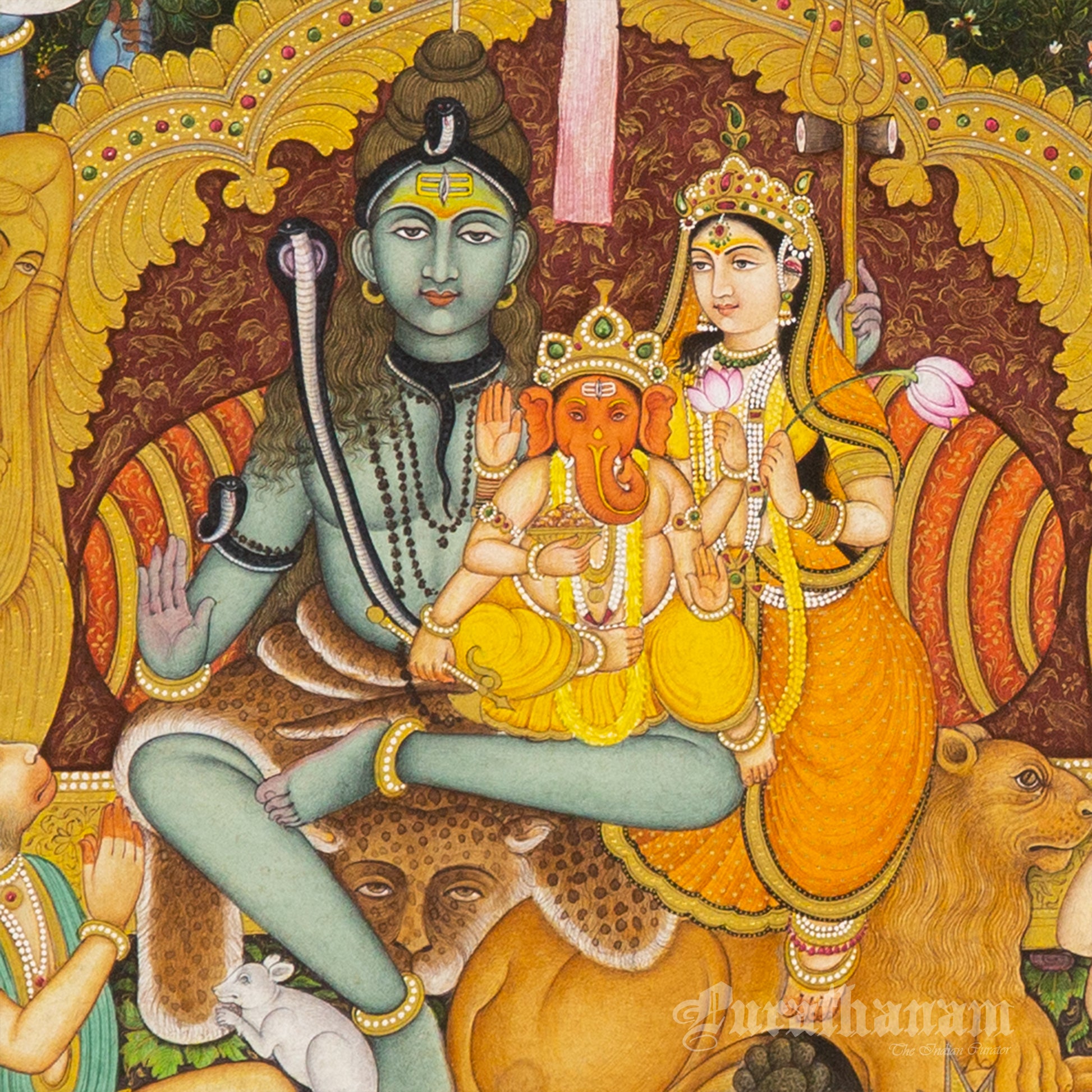 At the center of the darbar, Lord Shiva is seated with Parvati, holding their eldest son Ganesha on his lap. Surrounding them are Vishnu, Saraswati, Garuda Hanuman, Narada, Indra, Karthik and Brahma, along with their respective vahanas (Vehicles); Swan (Annapakshi), rat, lioness, nandi (the sacred bull), peacock,, and a six-headed white elephant. The artist has imagined all of them together in one divine space, filled with grace and harmony. The gold detailing adds a divine glow, a technique often used to show the spiritual energy of gods. Every figure is carefully painted, showing movement, emotion, and devotion. This is more than just a painting. It’s a sacred scene, captured within a small frame. A true tribute to the artist’s skill.