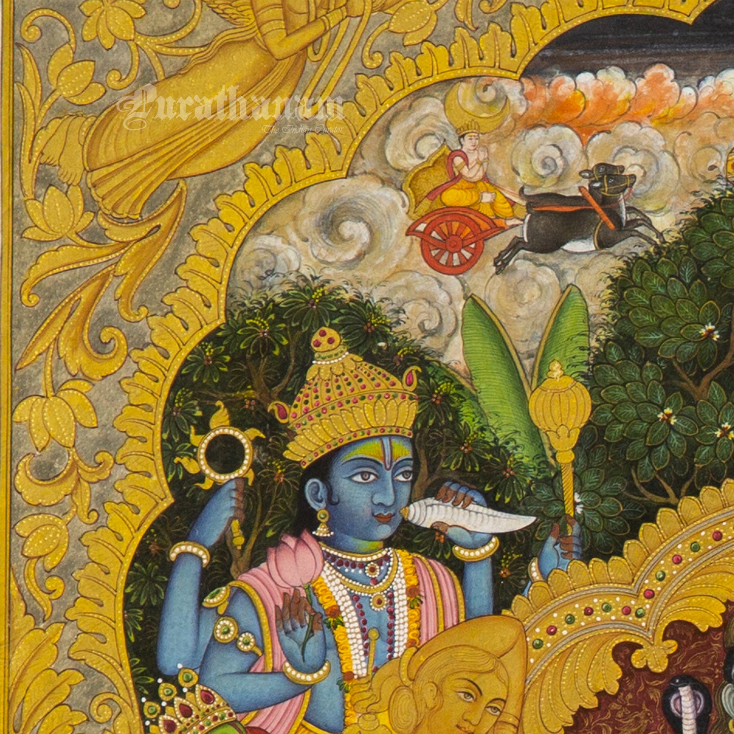 Miniature paintings have a long history in India. They grew under the Mughal, Rajput, Pahari, and Deccan courts, from the 16th to 19th centuries. Artists used natural pigments and brushes made from squirrel hair to paint on paper, palm leaves, or ivory. Miniature paintings are usually small, but they hold big stories about gods, kings, daily life, and devotion. This painting is created in watercolor medium using real gold leaf on paper, and it follows the miniature painting tradition known for its tiny details, fine lines, and delicate features.