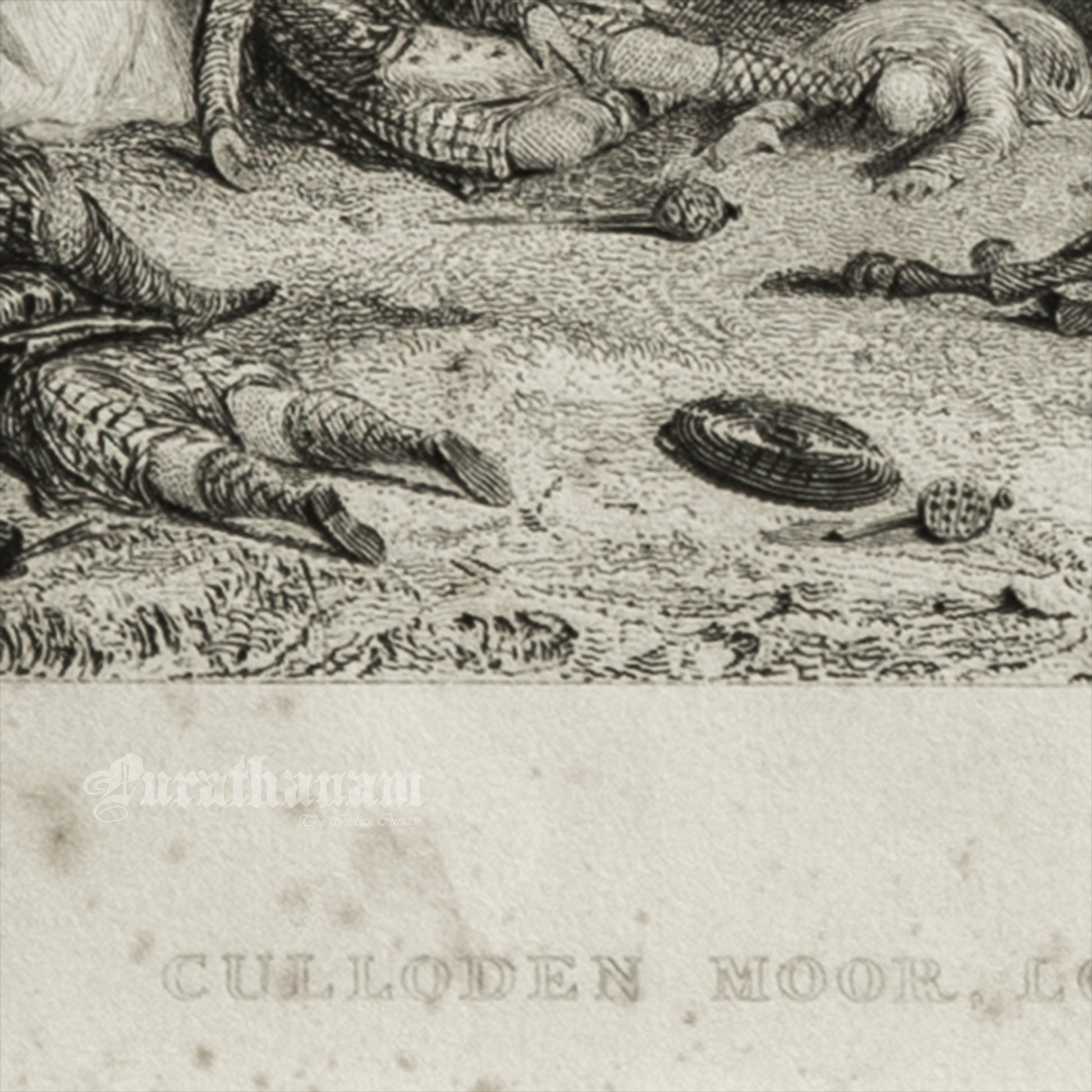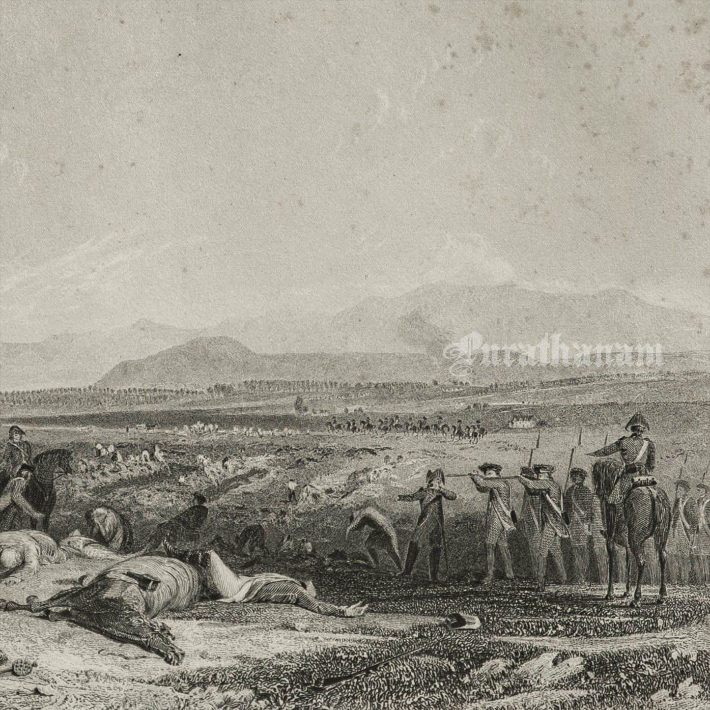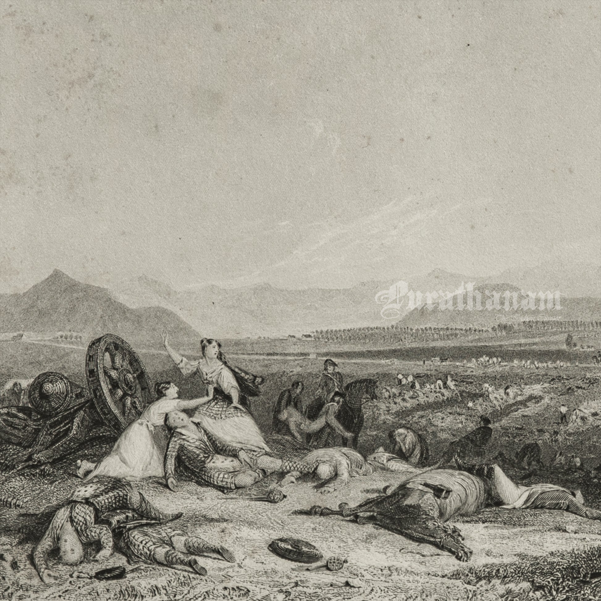 The illustration depicts the Battle of Culloden, which took place near Inverness in Scotland. It portrays the shooting of injured Scots by troops from the army of the Duke of Cumberland, effectively ending the Jacobite rebellion on April 16, 1746, during the Jacobite Rising. This battle marked a significant turning point in Scottish Highland culture and history.