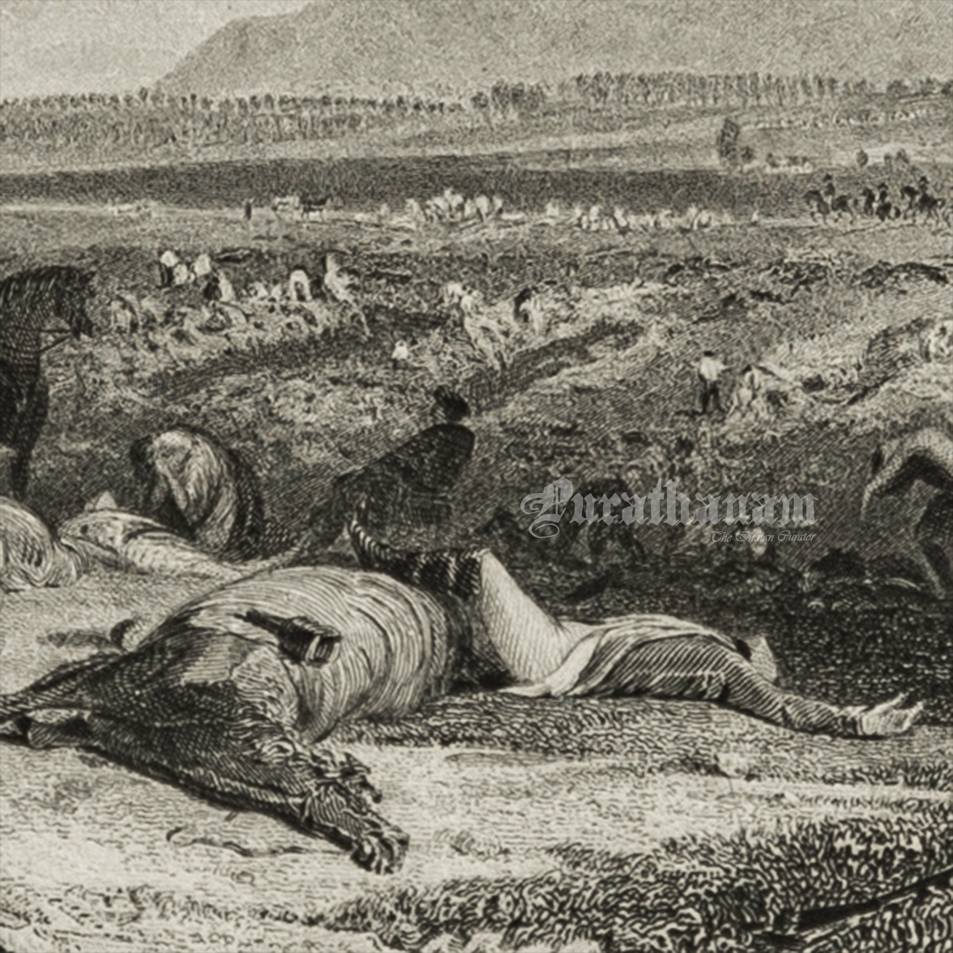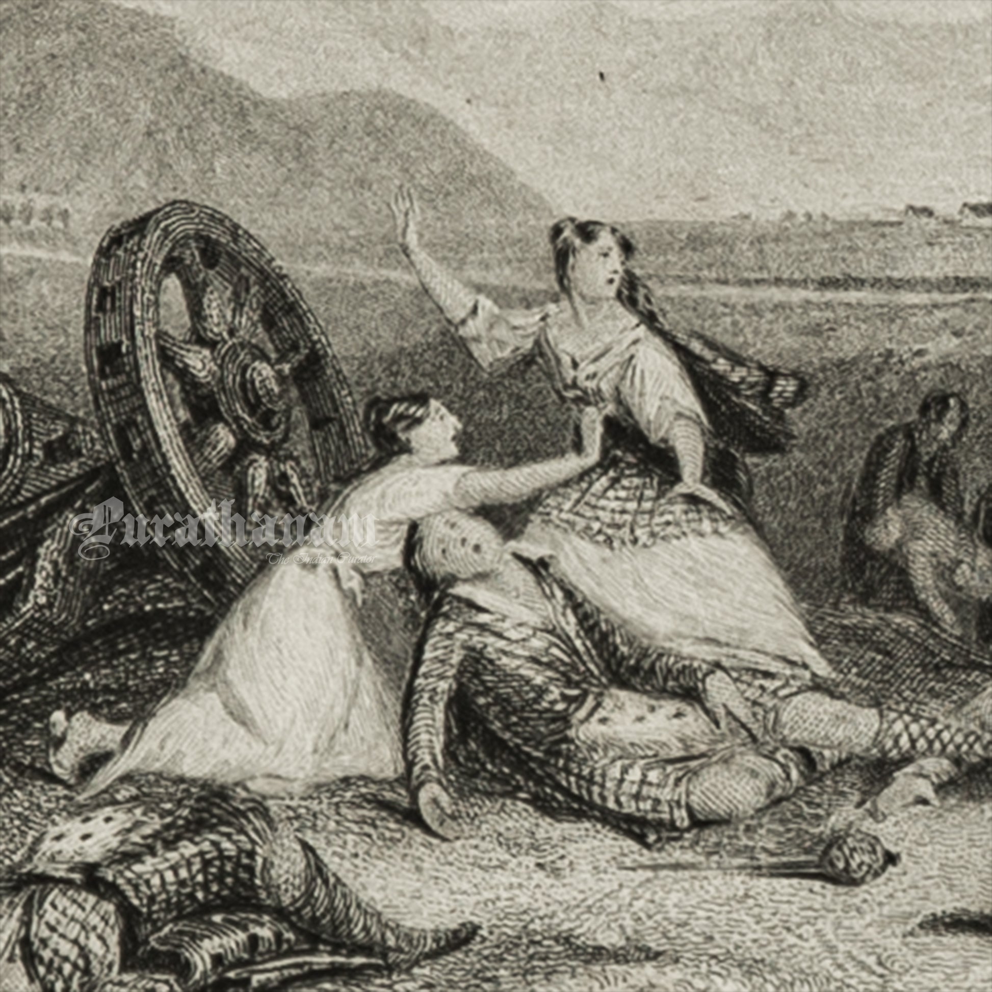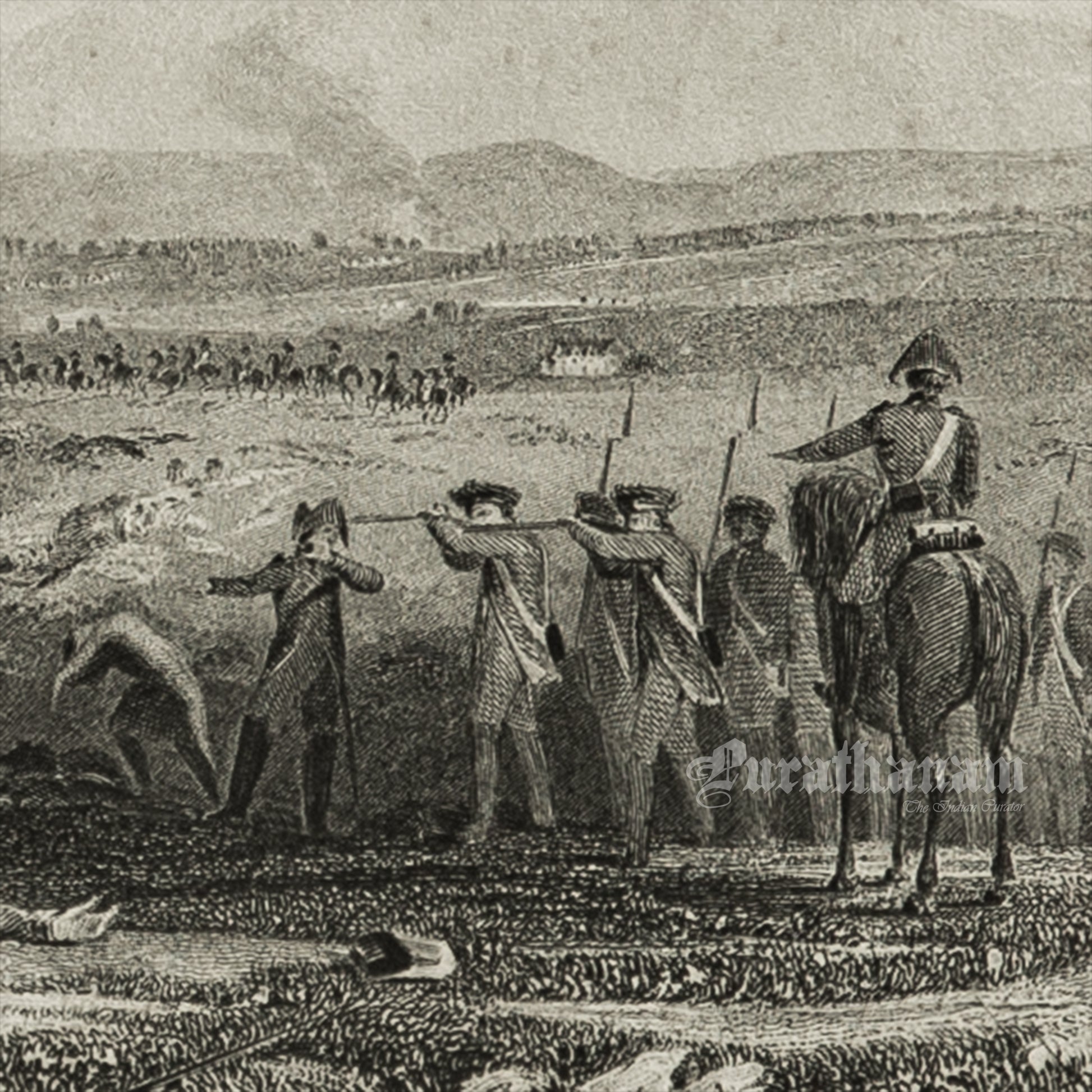 The illustration depicts the Battle of Culloden, which took place near Inverness in Scotland. It portrays the shooting of injured Scots by troops from the army of the Duke of Cumberland, effectively ending the Jacobite rebellion on April 16, 1746, during the Jacobite Rising. This battle marked a significant turning point in Scottish Highland culture and history.