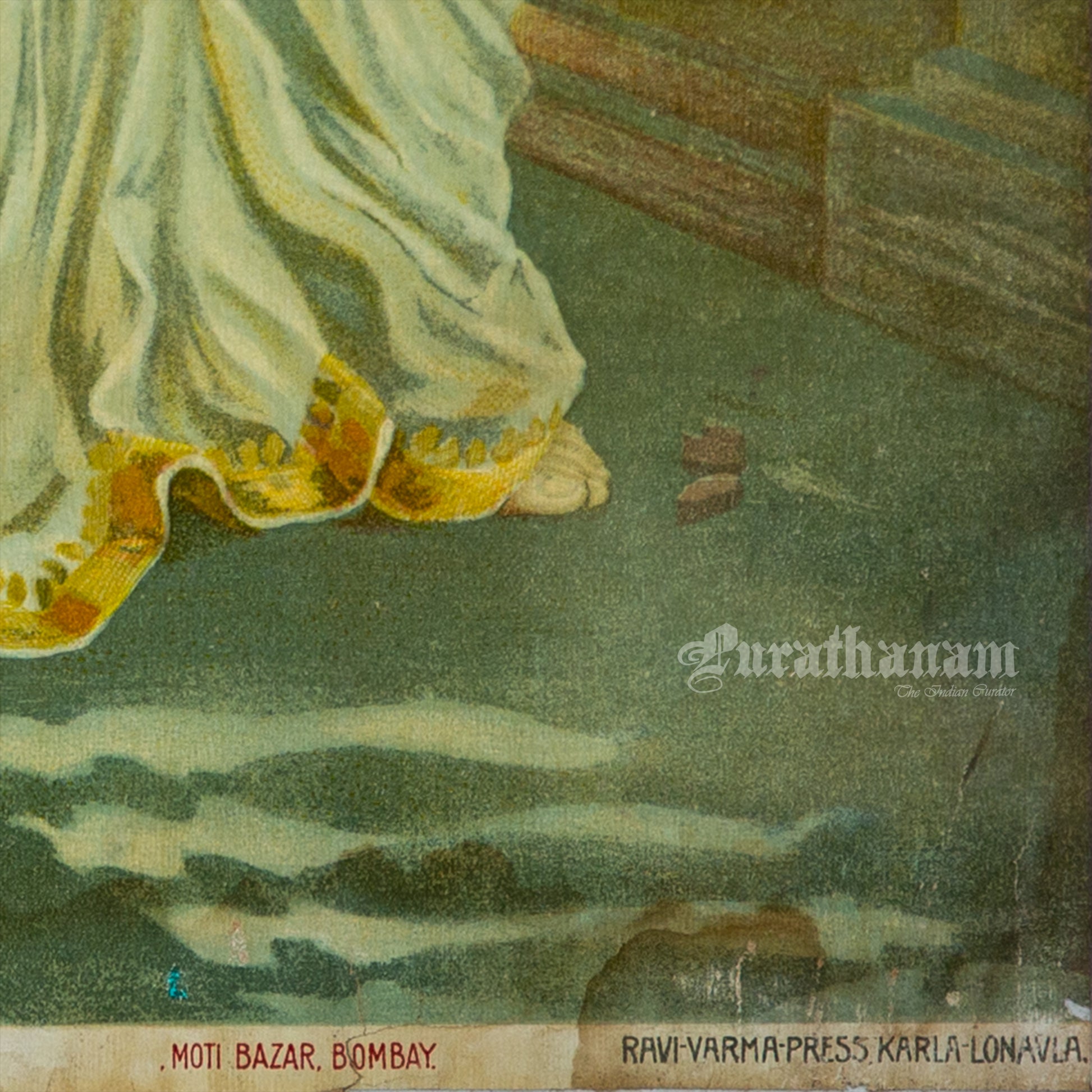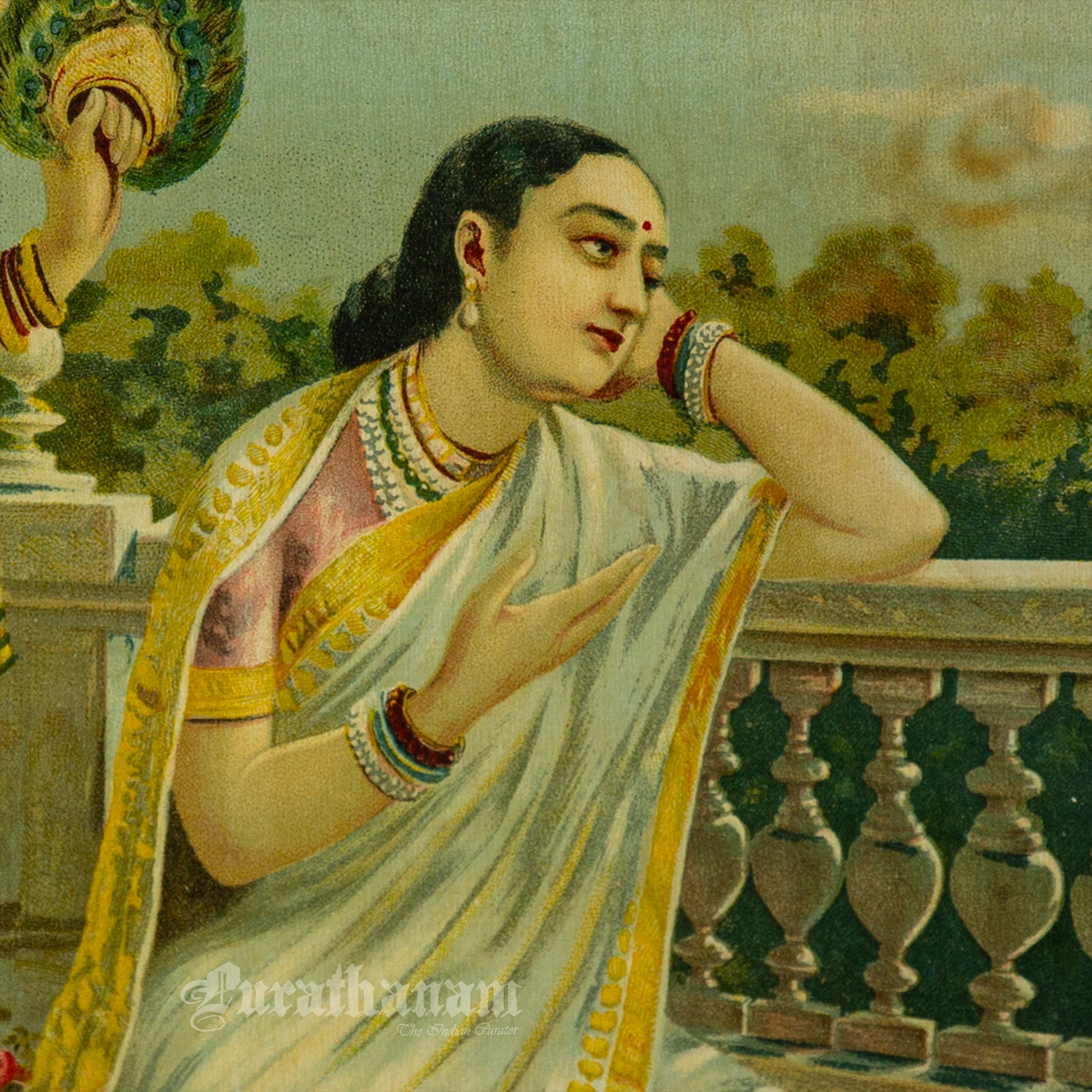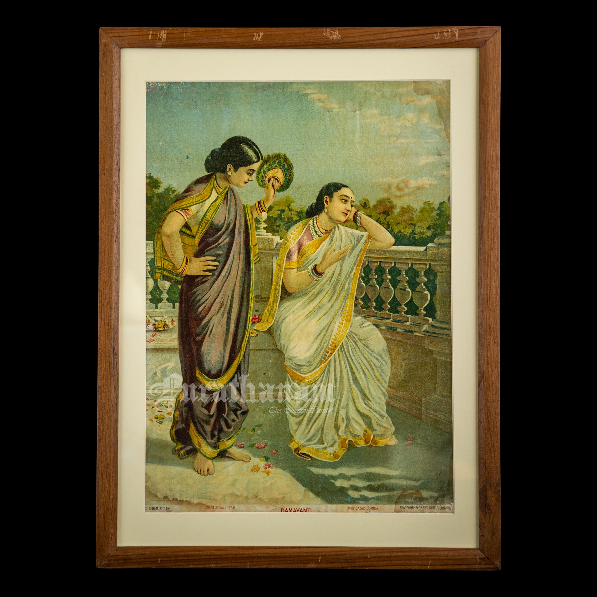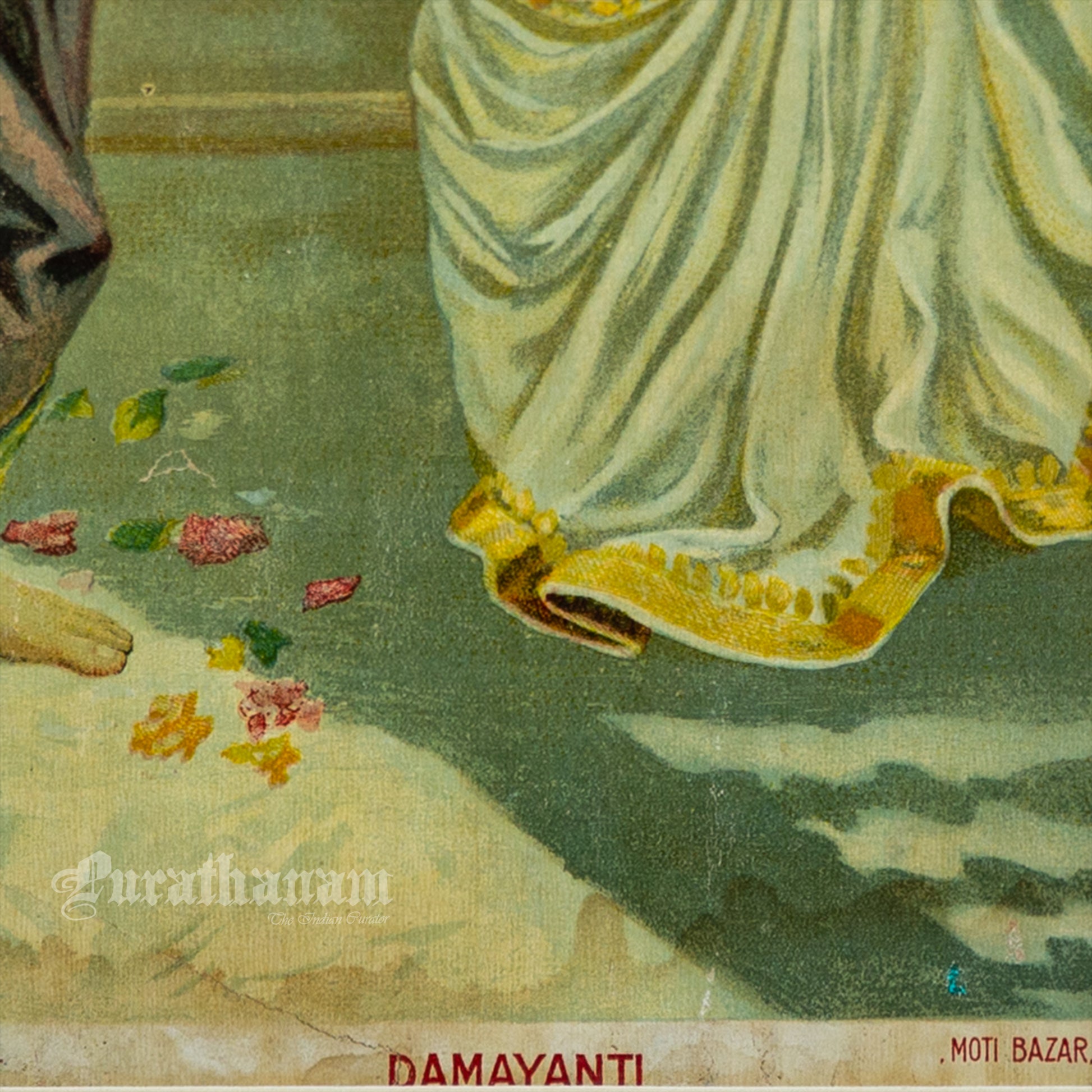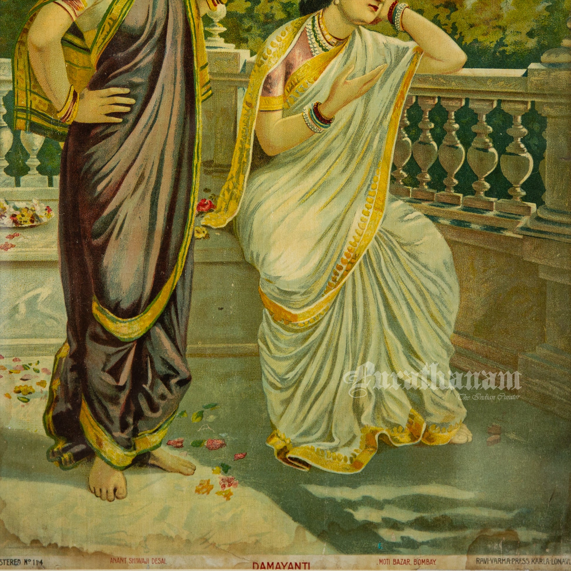 This is an oleograph print from 1920s of Damayanti by Ravi Varma an Indian who achieved recognition for his depiction of scenes from the epics of the Mahabharata and Ramayana.