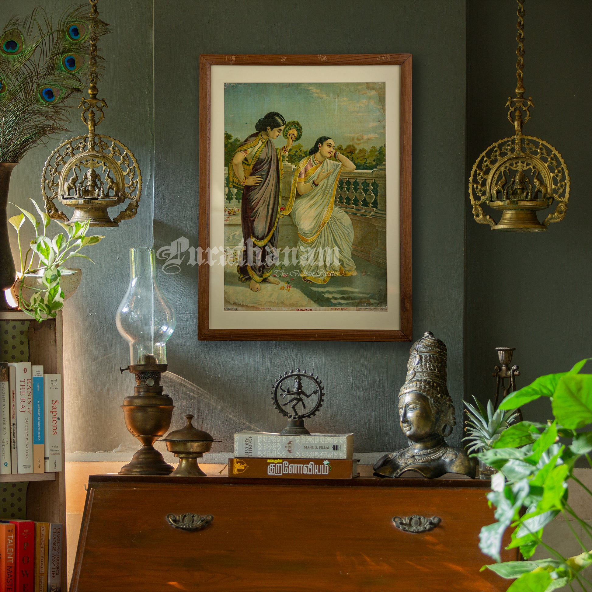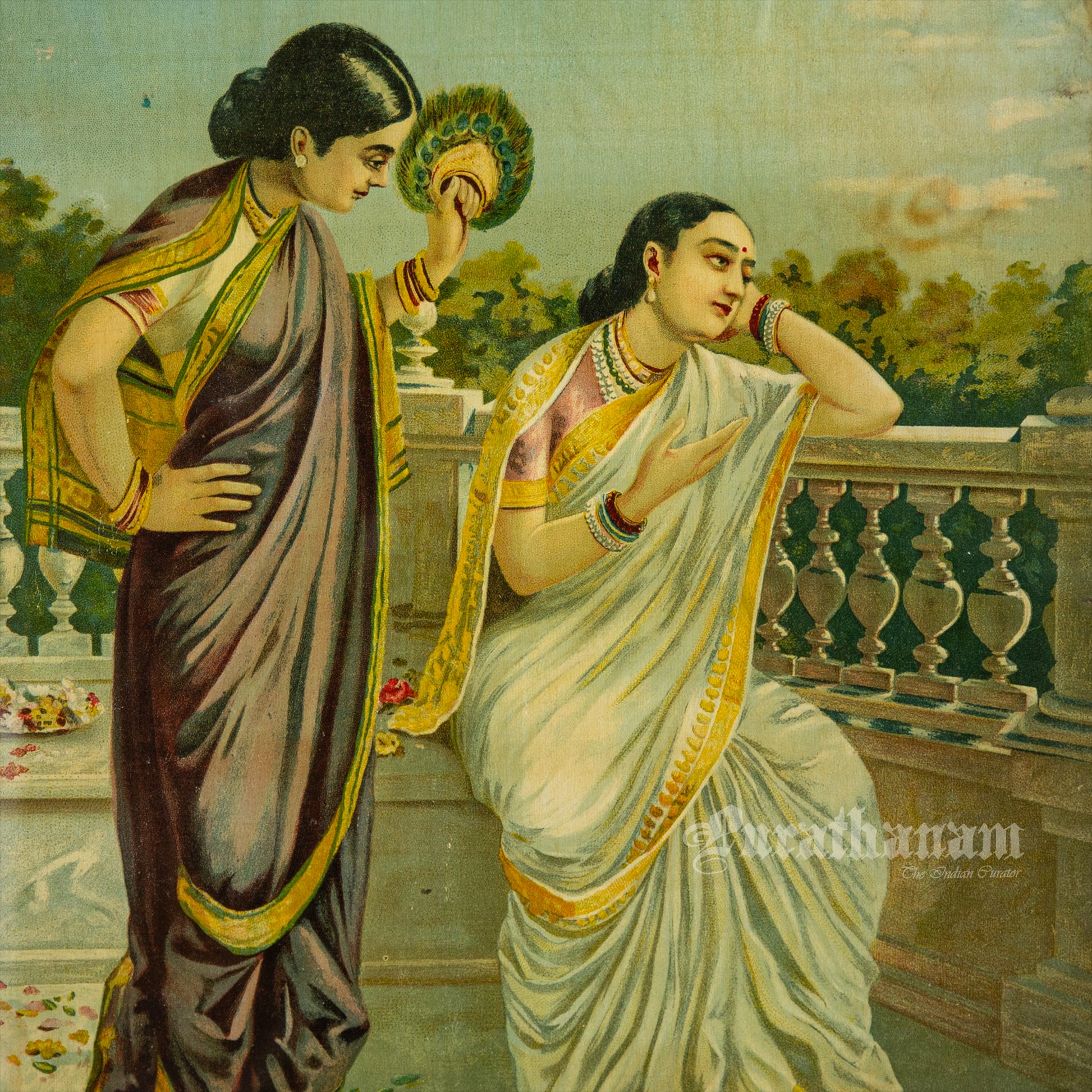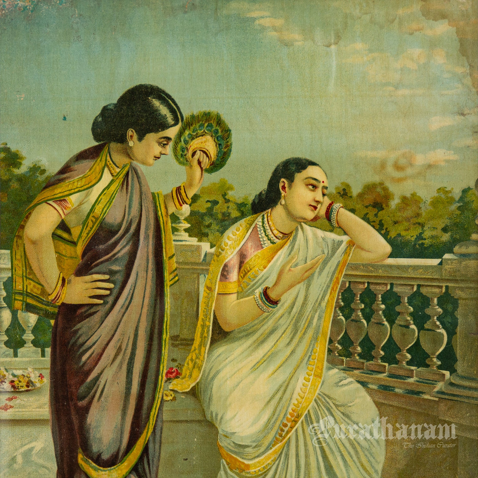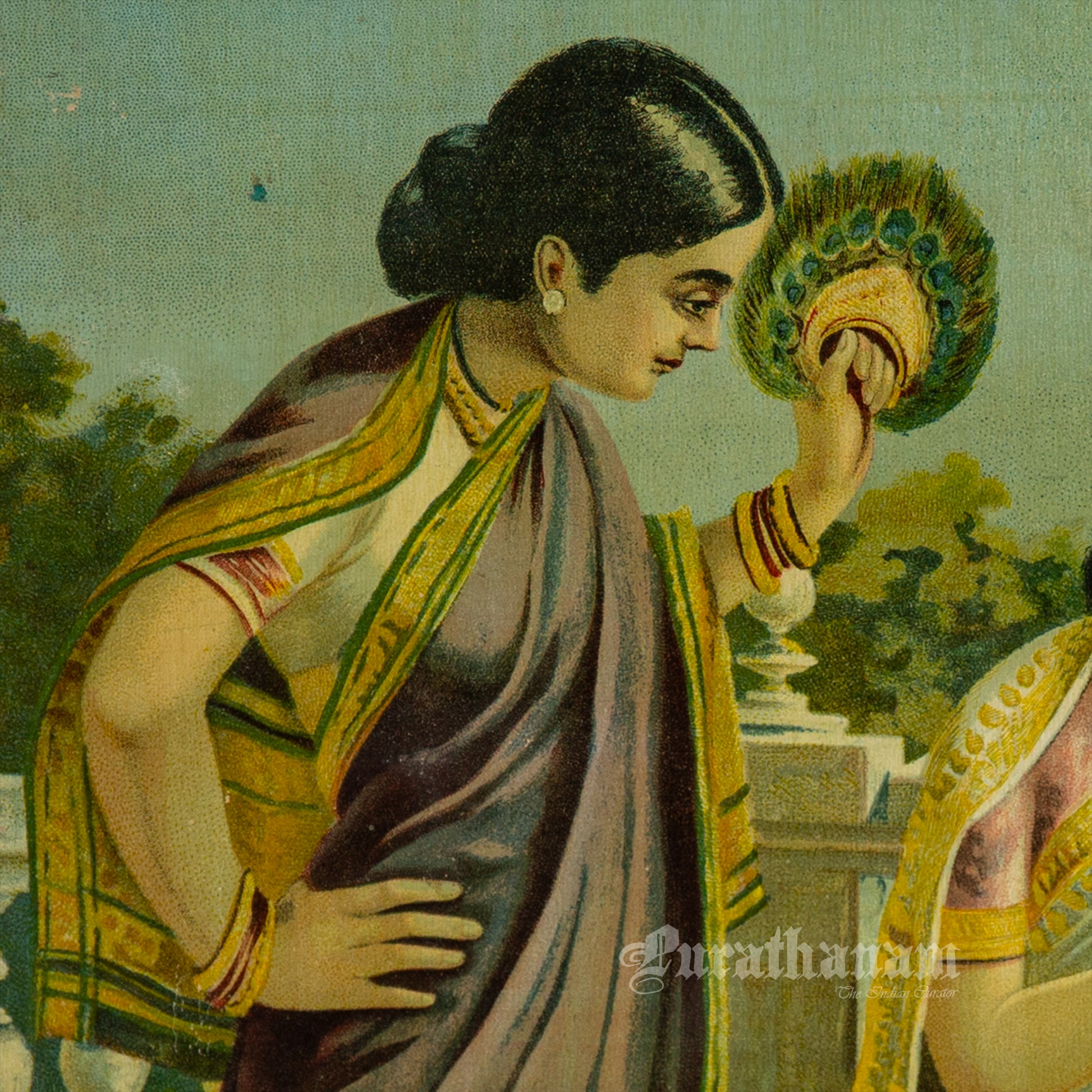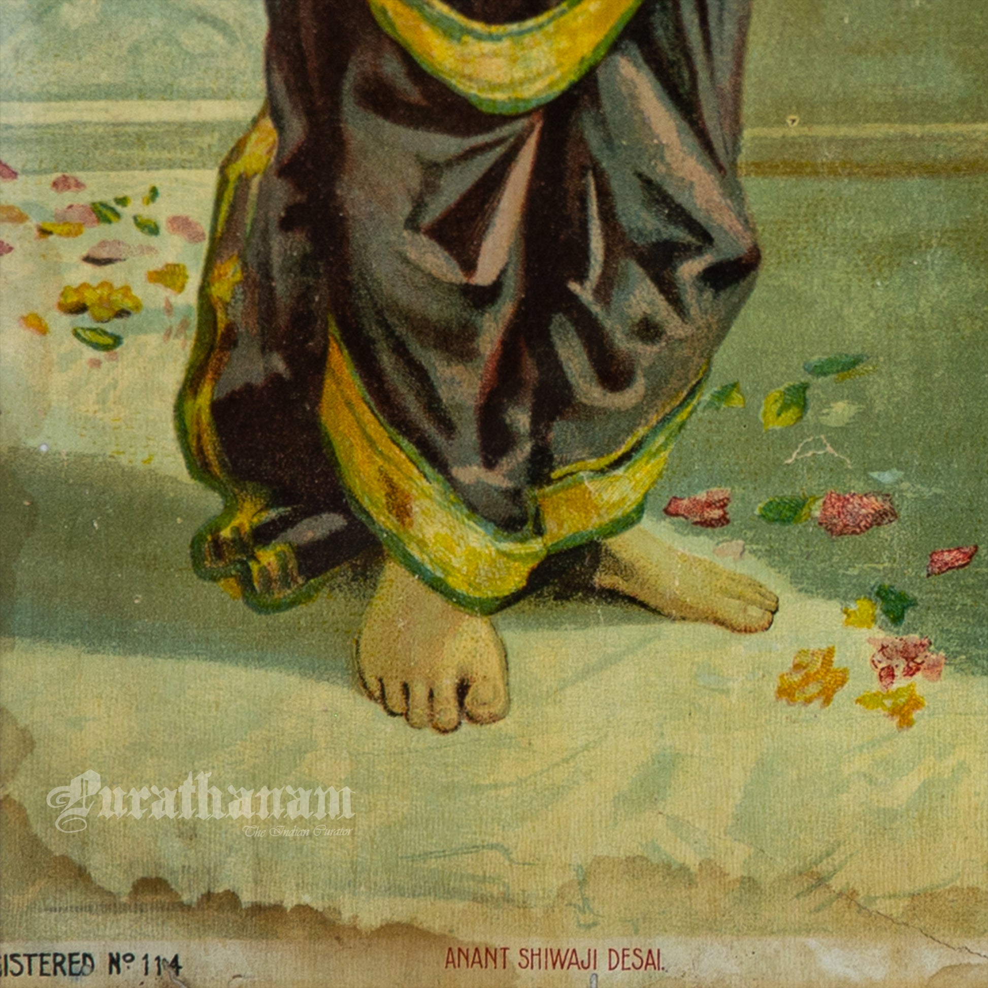 This is an oleograph print from 1920s of Damayanti by Ravi Varma an Indian who achieved recognition for his depiction of scenes from the epics of the Mahabharata and Ramayana.