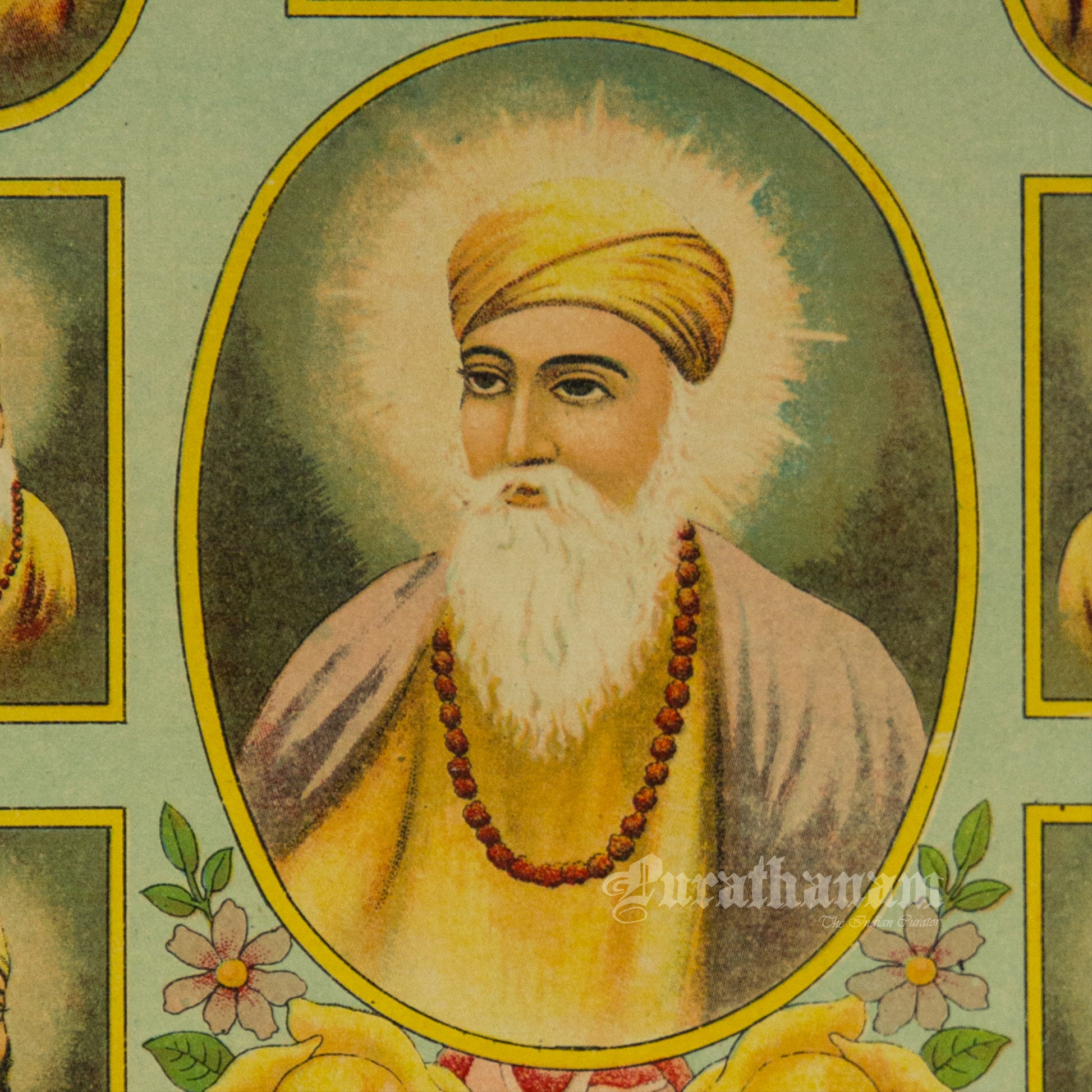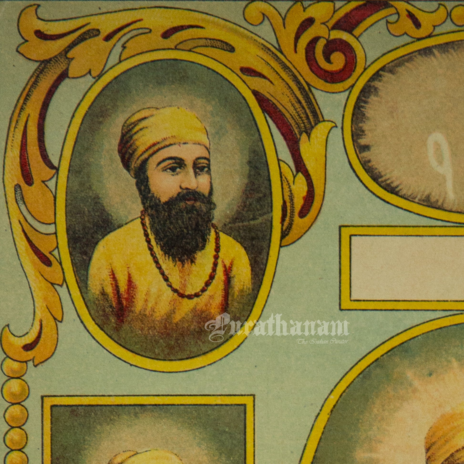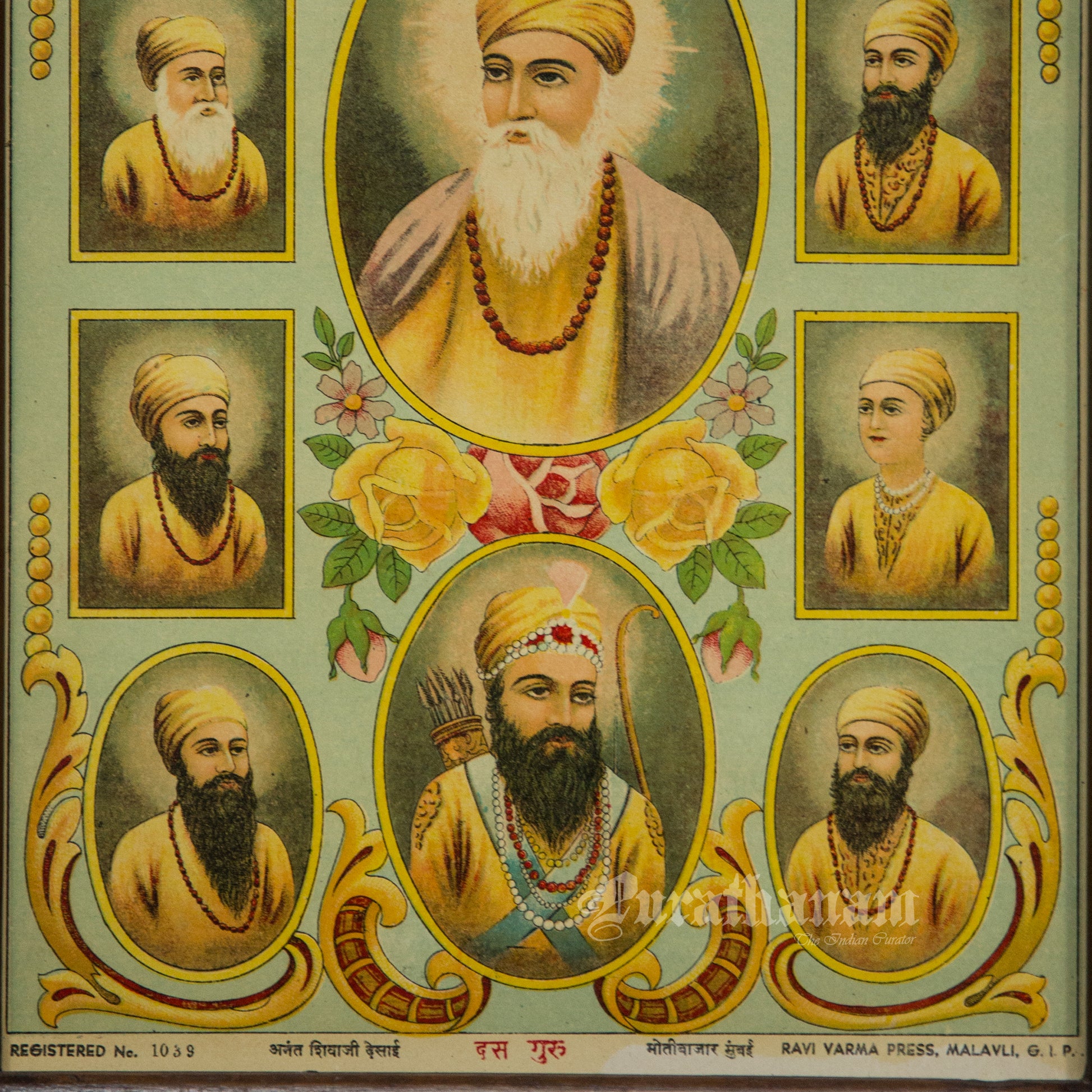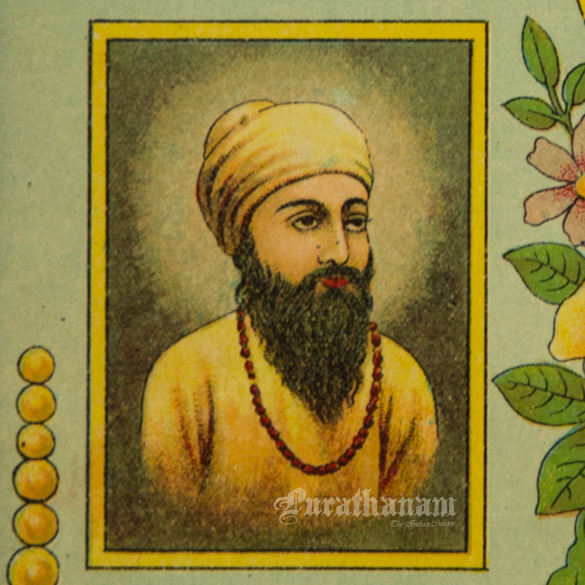 This is an oleograph print from 1920s - 1930s of Das Guru by Ravi Varma an Indian who achieved recognition for his depiction of scenes from the epics of the Mahabharata and Ramayana.