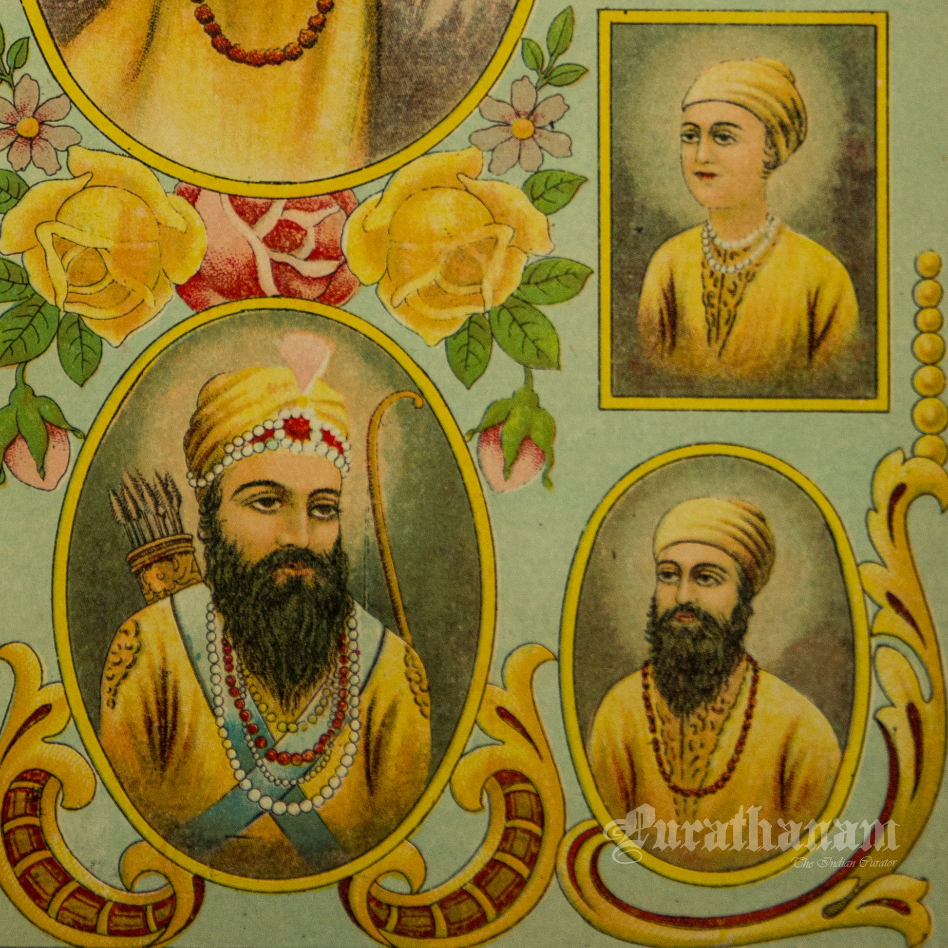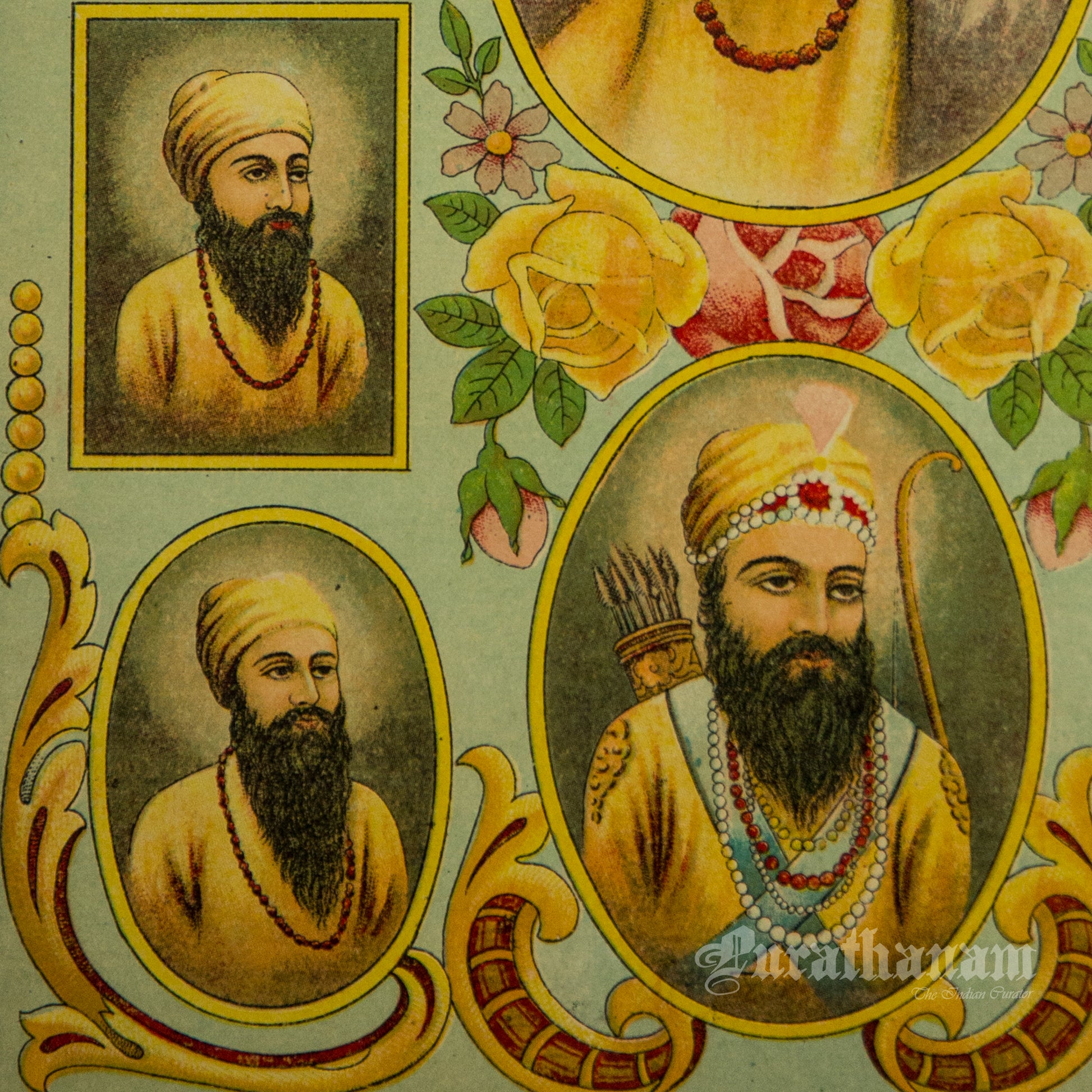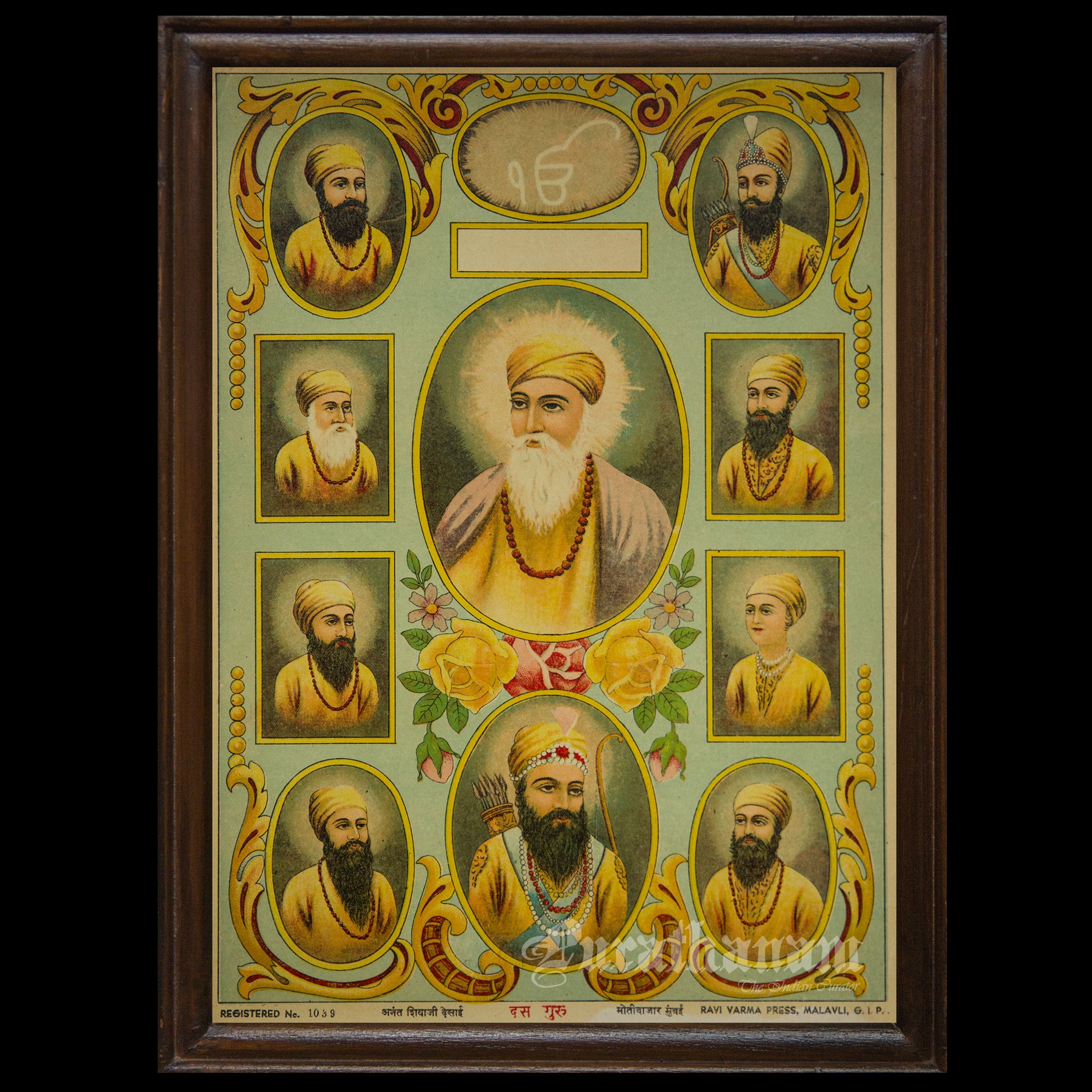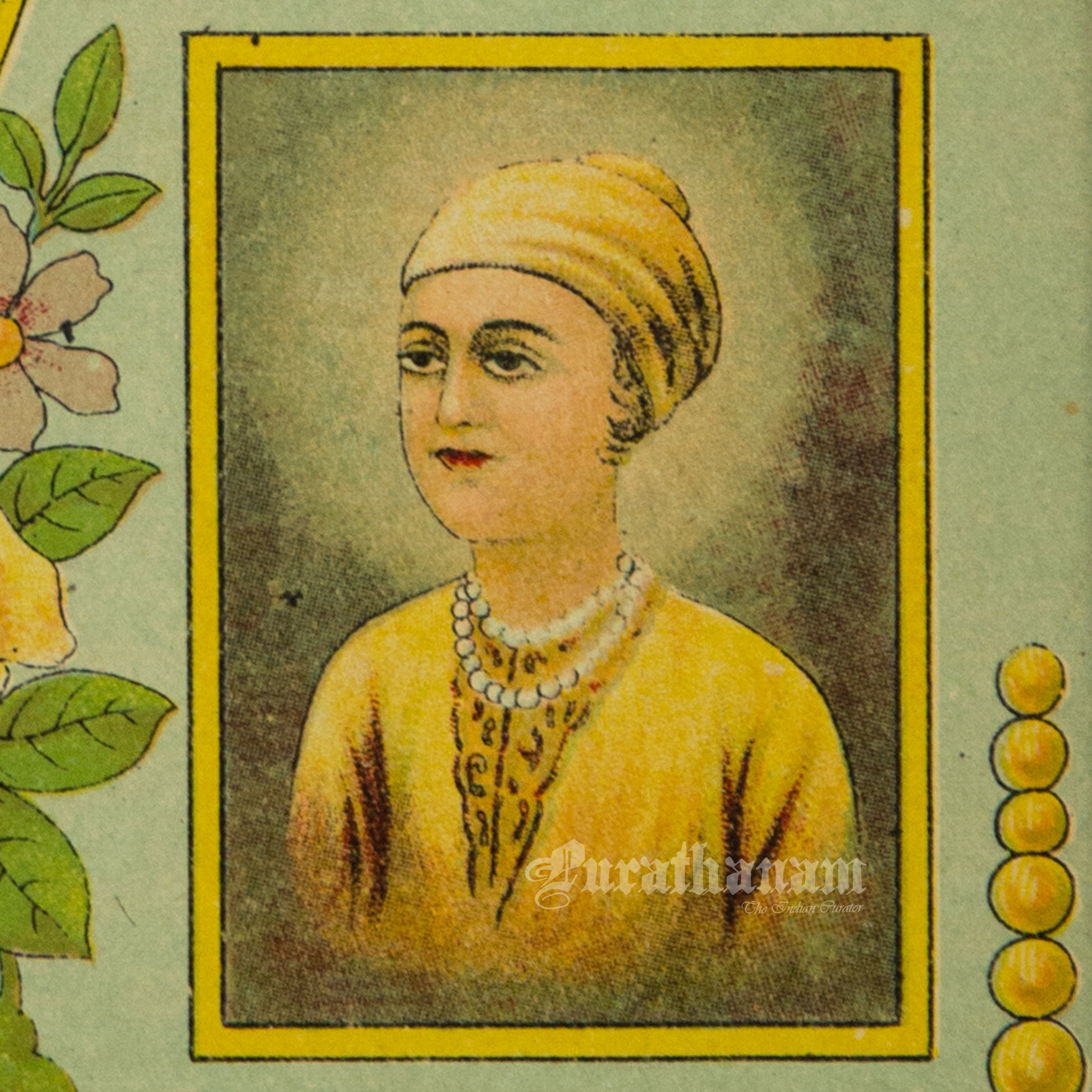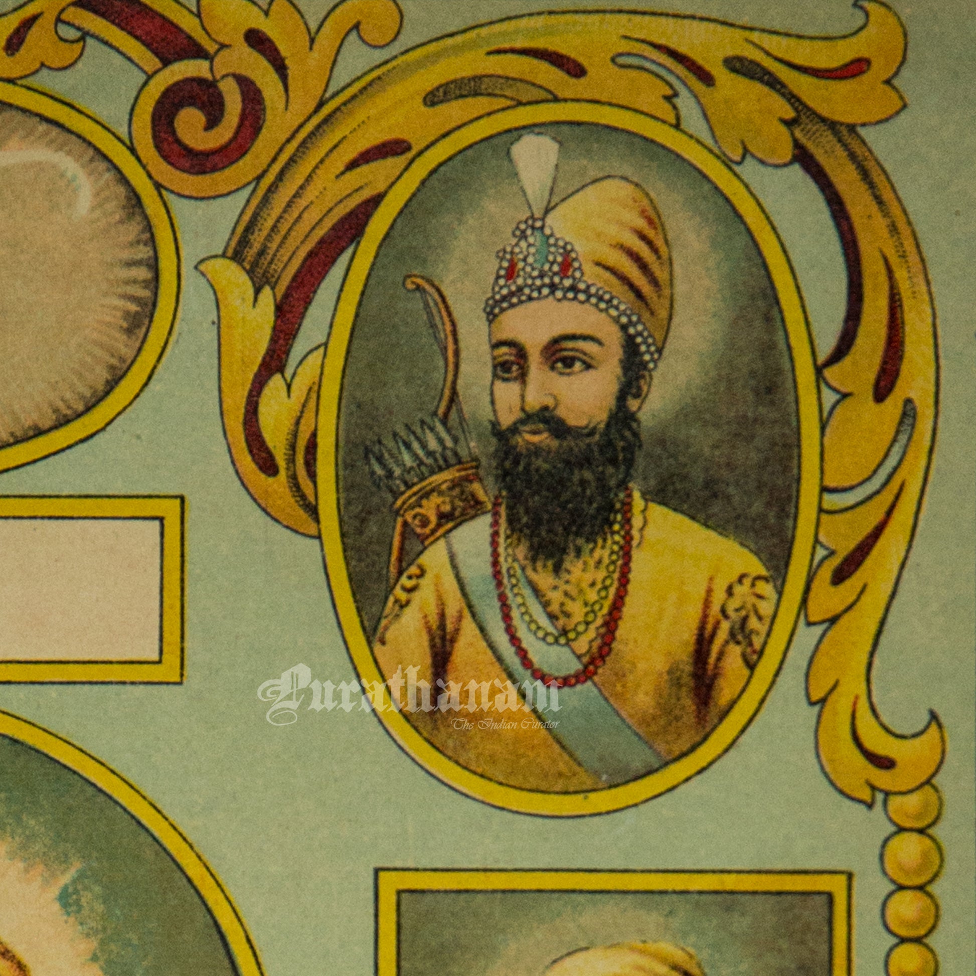 This is an oleograph print from 1920s - 1930s of Das Guru by Ravi Varma an Indian who achieved recognition for his depiction of scenes from the epics of the Mahabharata and Ramayana.