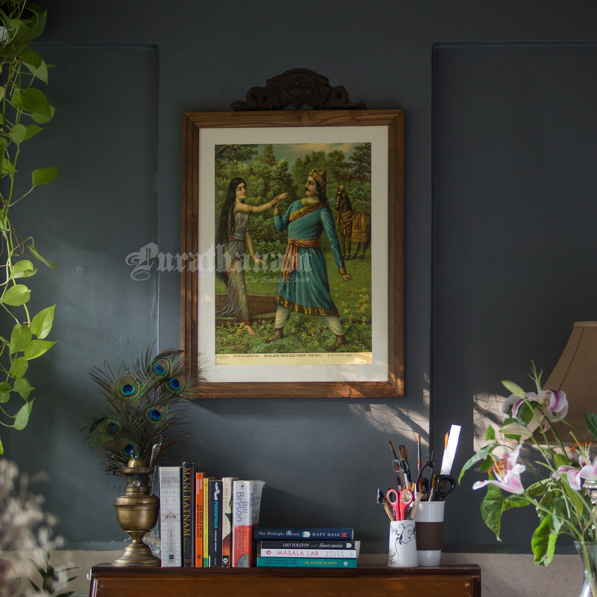 Here is is beautiful painting of Devajani Rescued from Well by B. P. Banerjee printed in Germany. The painting depicts the character of Devayani, daughter of Shukrachaya and wife of Yayati who saves her from well in Hindu Mythology. She gives birth to two sons Yadu and Turvasu. Yadugave rise to Yadu vamsha, and one of his descendants is Krishna.