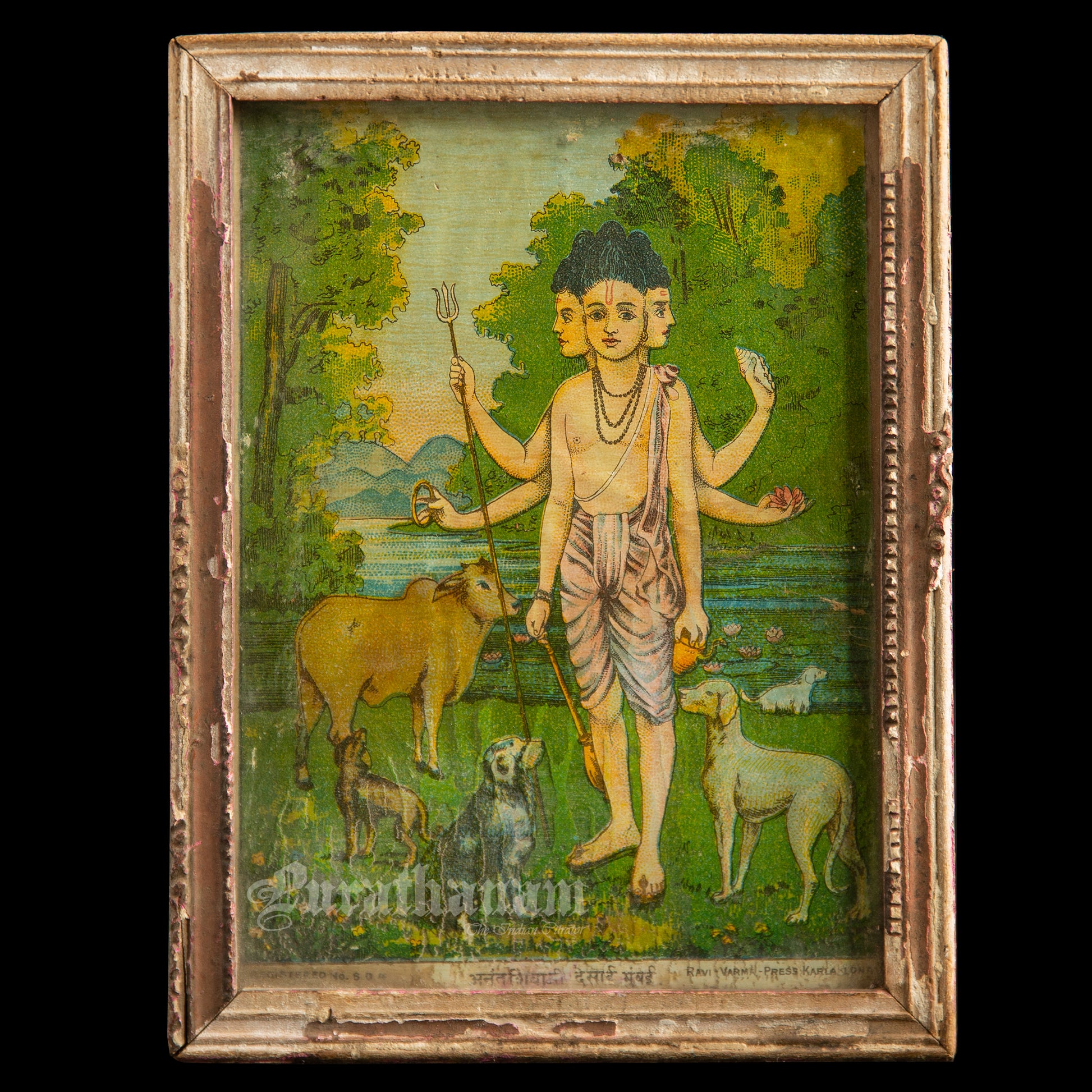 A mini lithograph print from 1920s of Dattatreya by Ravi Varma, an Indian who achieved recognition for his depiction of scenes from the epics of the Mahabharata and Ramayana.